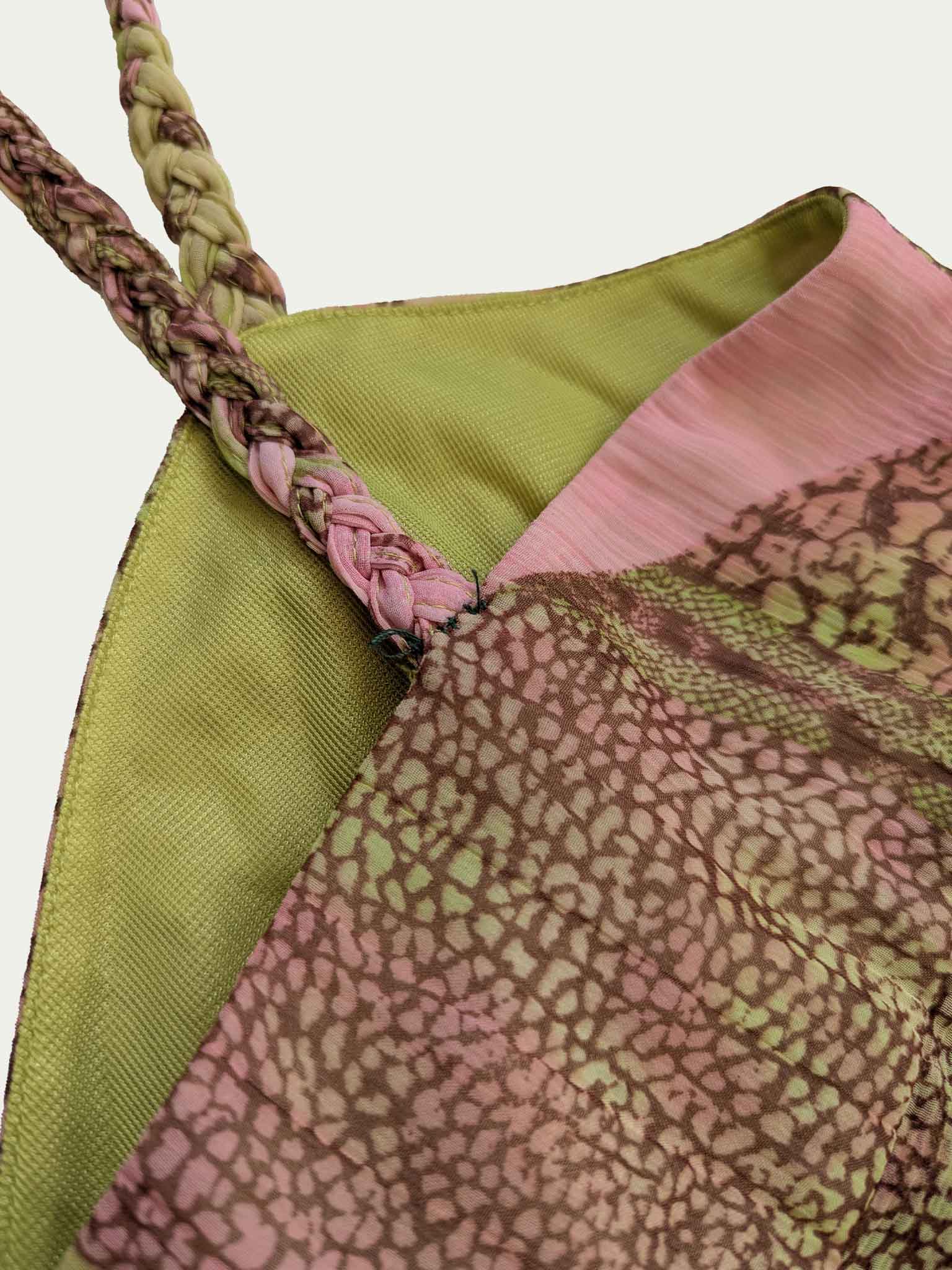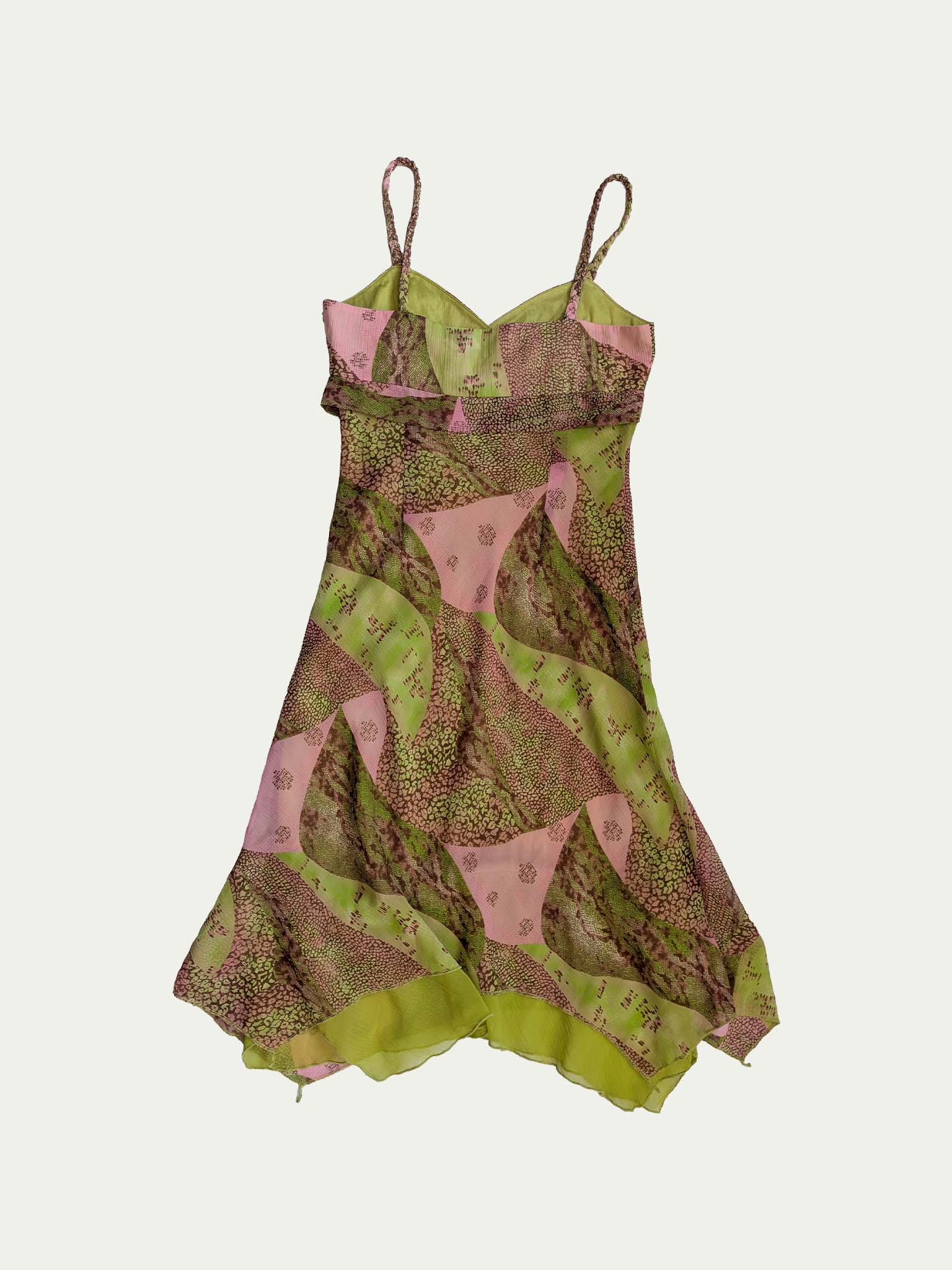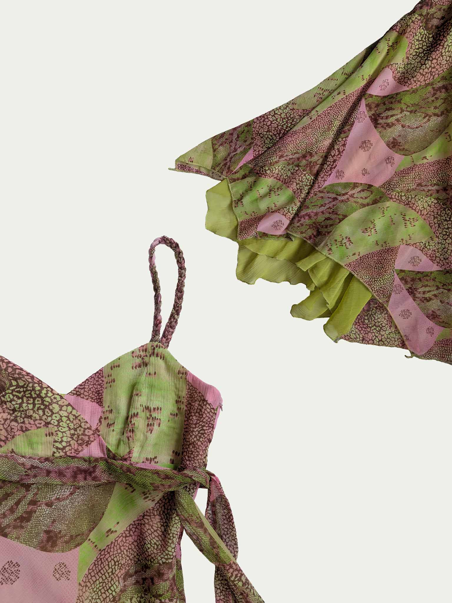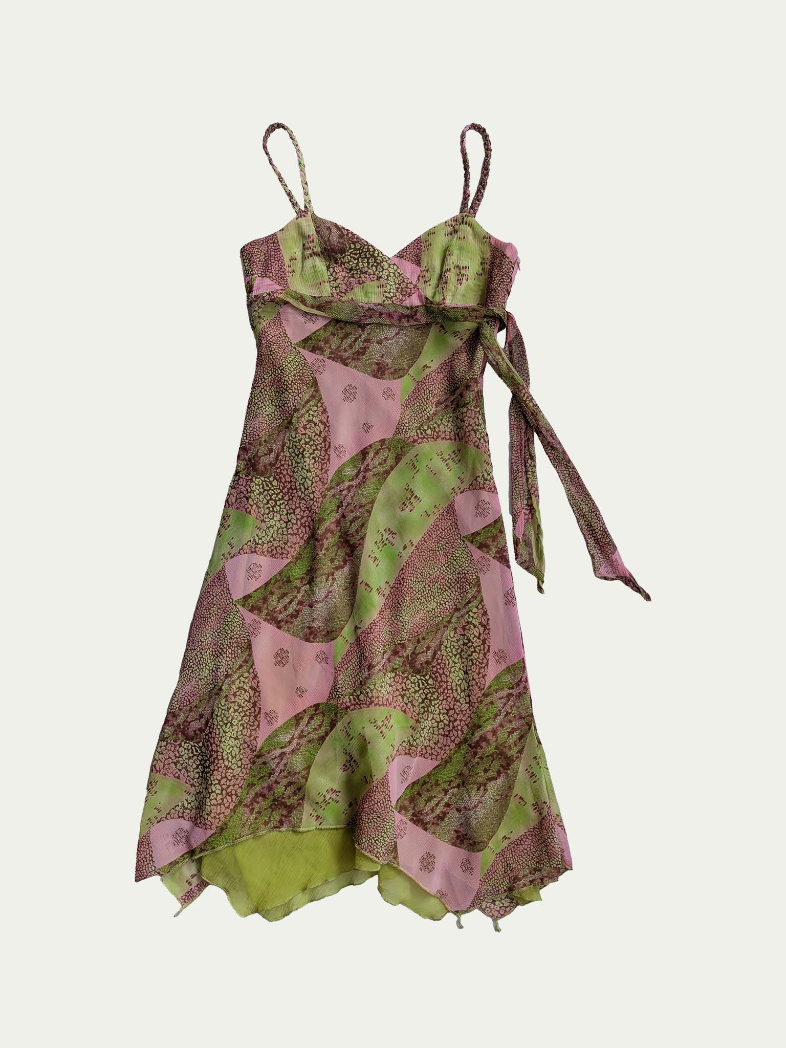 שמלה א-סימטרית בסגנון Y2K עם שתי שכבות, עשויה מבד שיפון ובטנה עם קצה שיפון, בגווני ורוד וירוק קיציים. כוללת קשירה מתחת לחזה ורצועות כתף קלועות.
