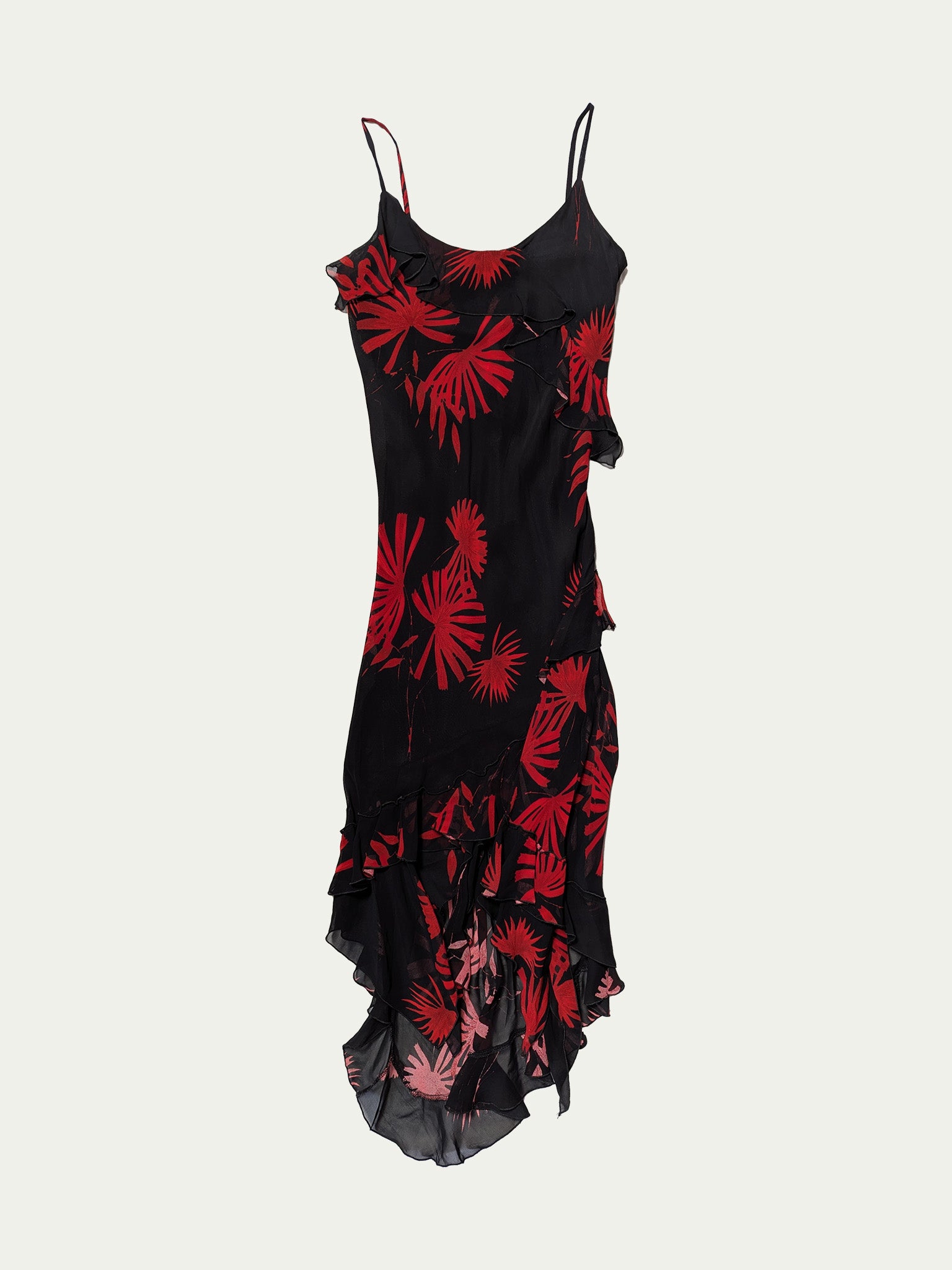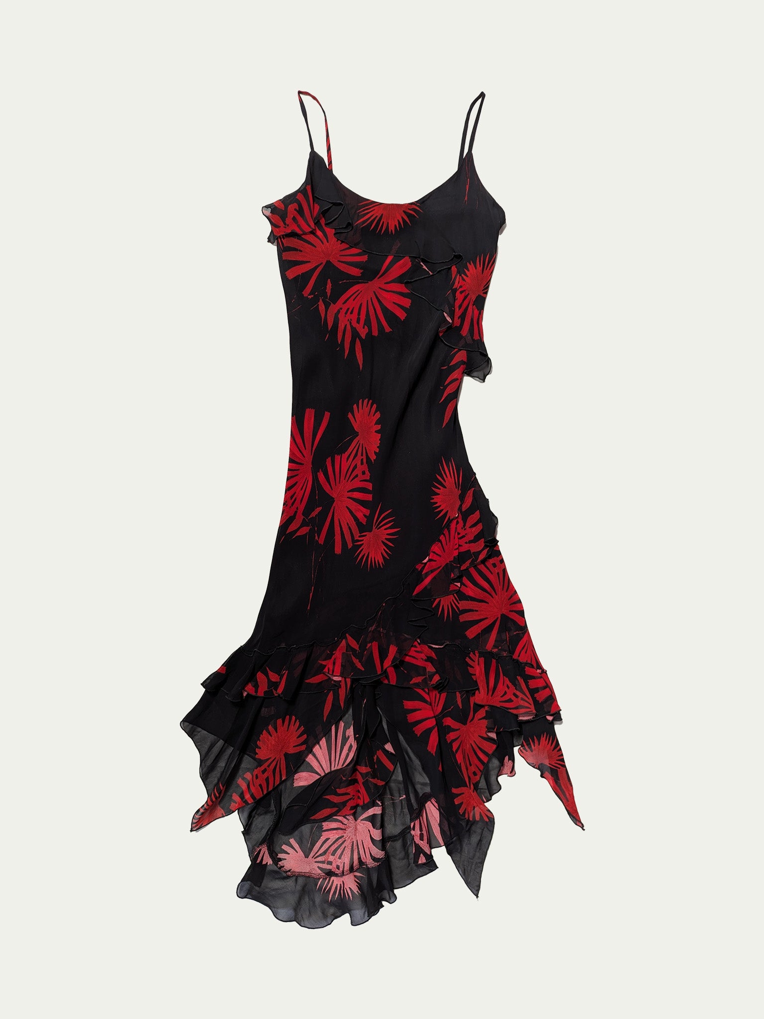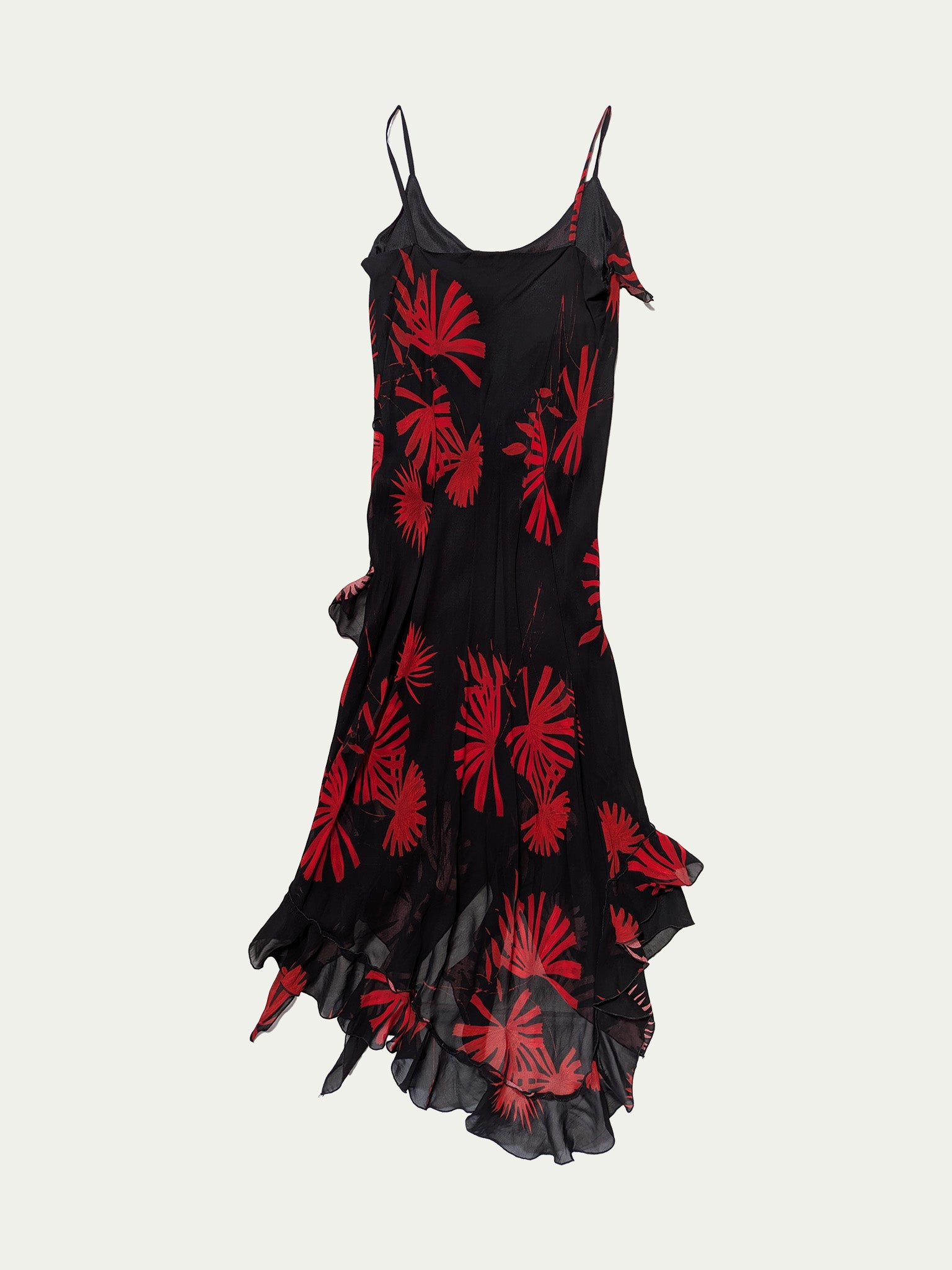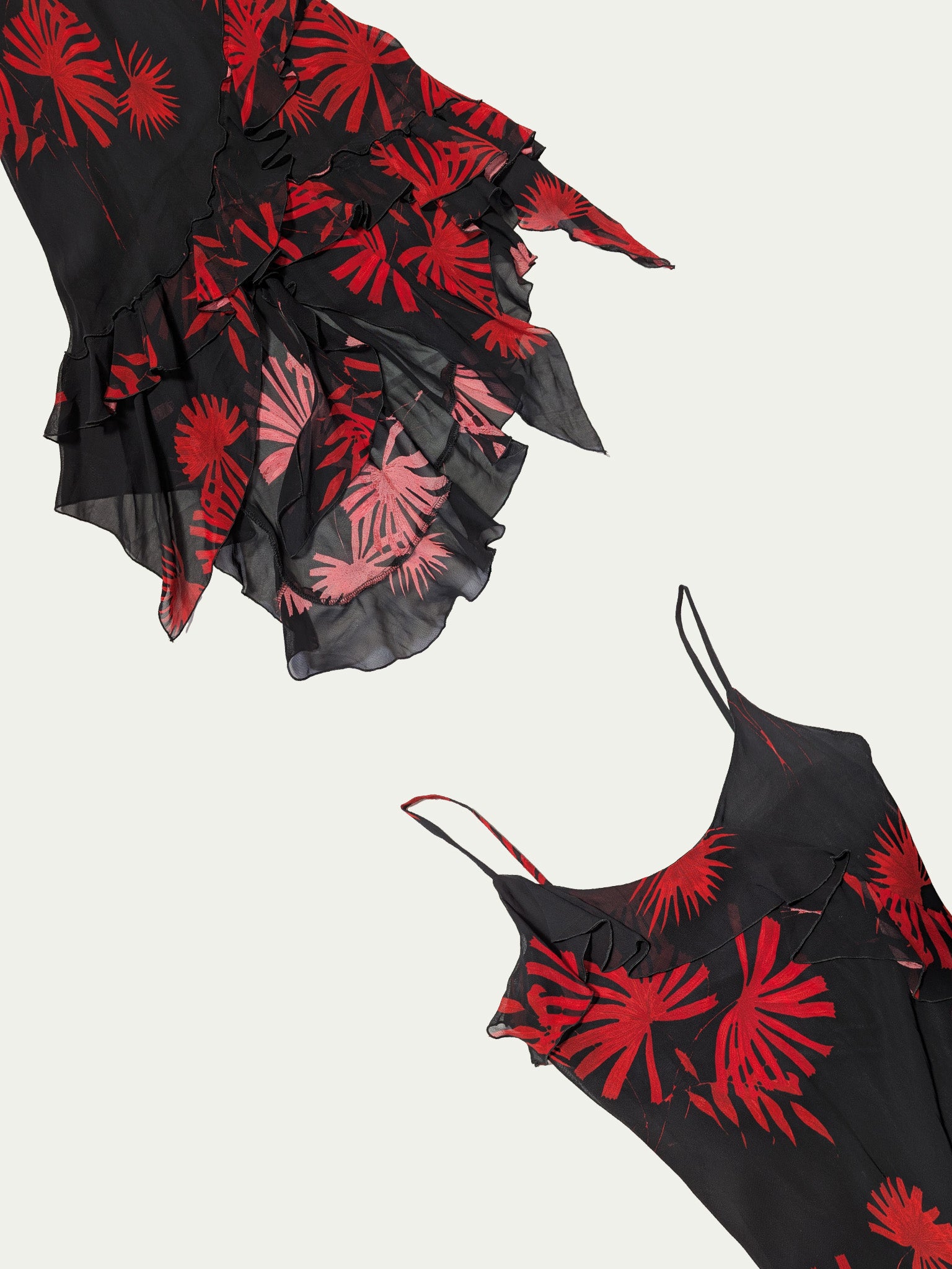 שמלת מקסי א-סימטרית משיפון Y2K בשחור ואדום, מלאה בקפלים וחיתוכים מטורפים, בחלק החזה ובחלק החצאית, עם דוגמה אבסטרקטית