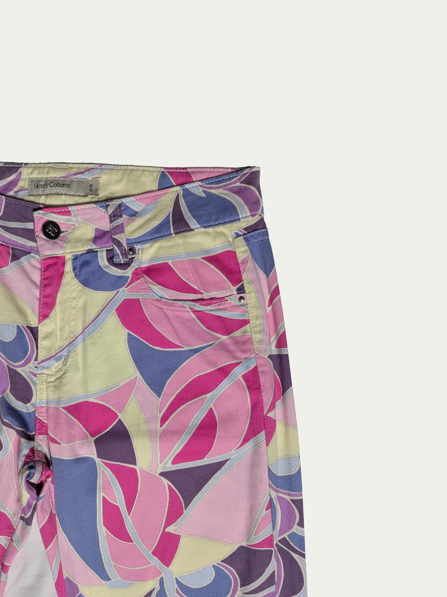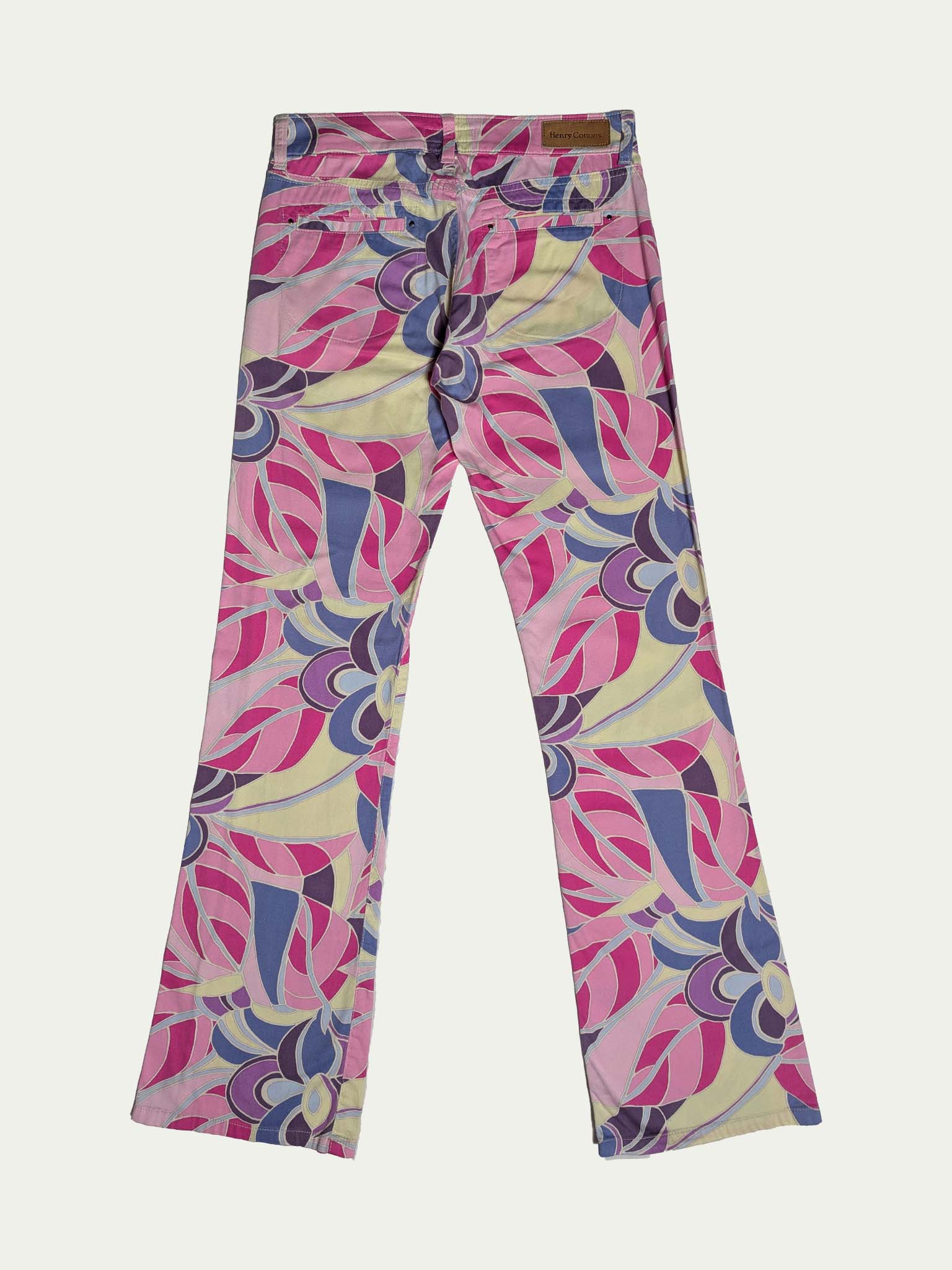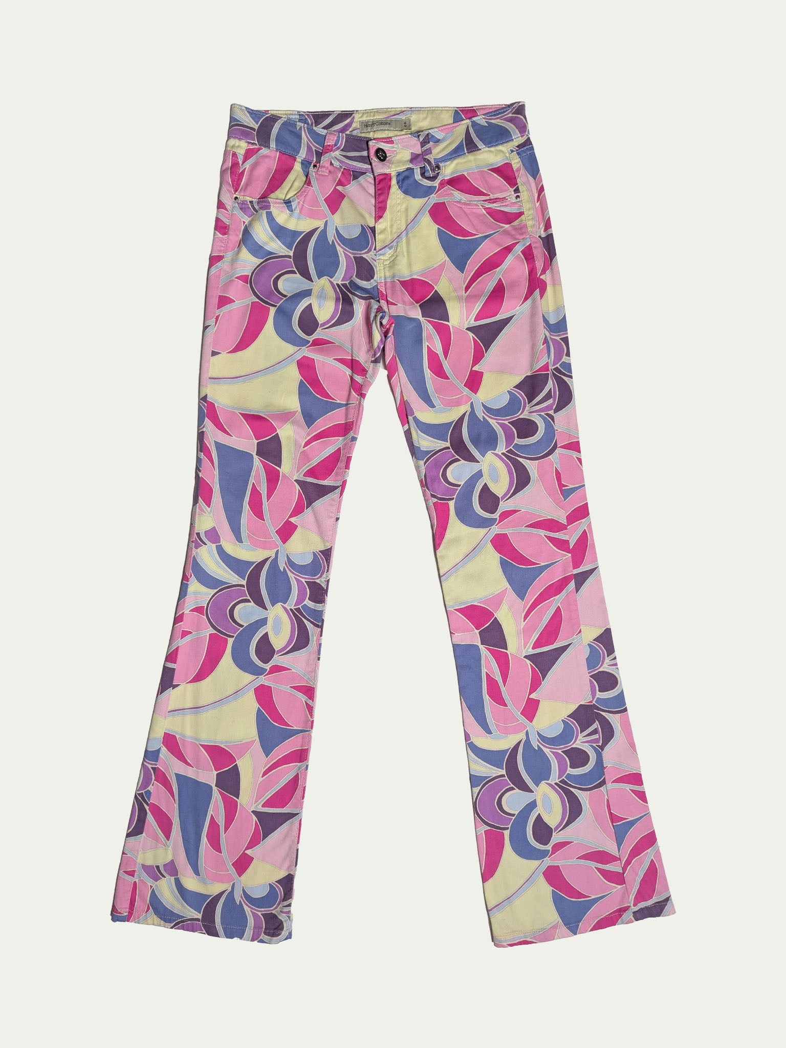 מכנסי Y2K מתרחבים של Henry Cottons, בגזרה בינונית, עם הדפס בסגנון פוצ'י, בגווני פסטל.