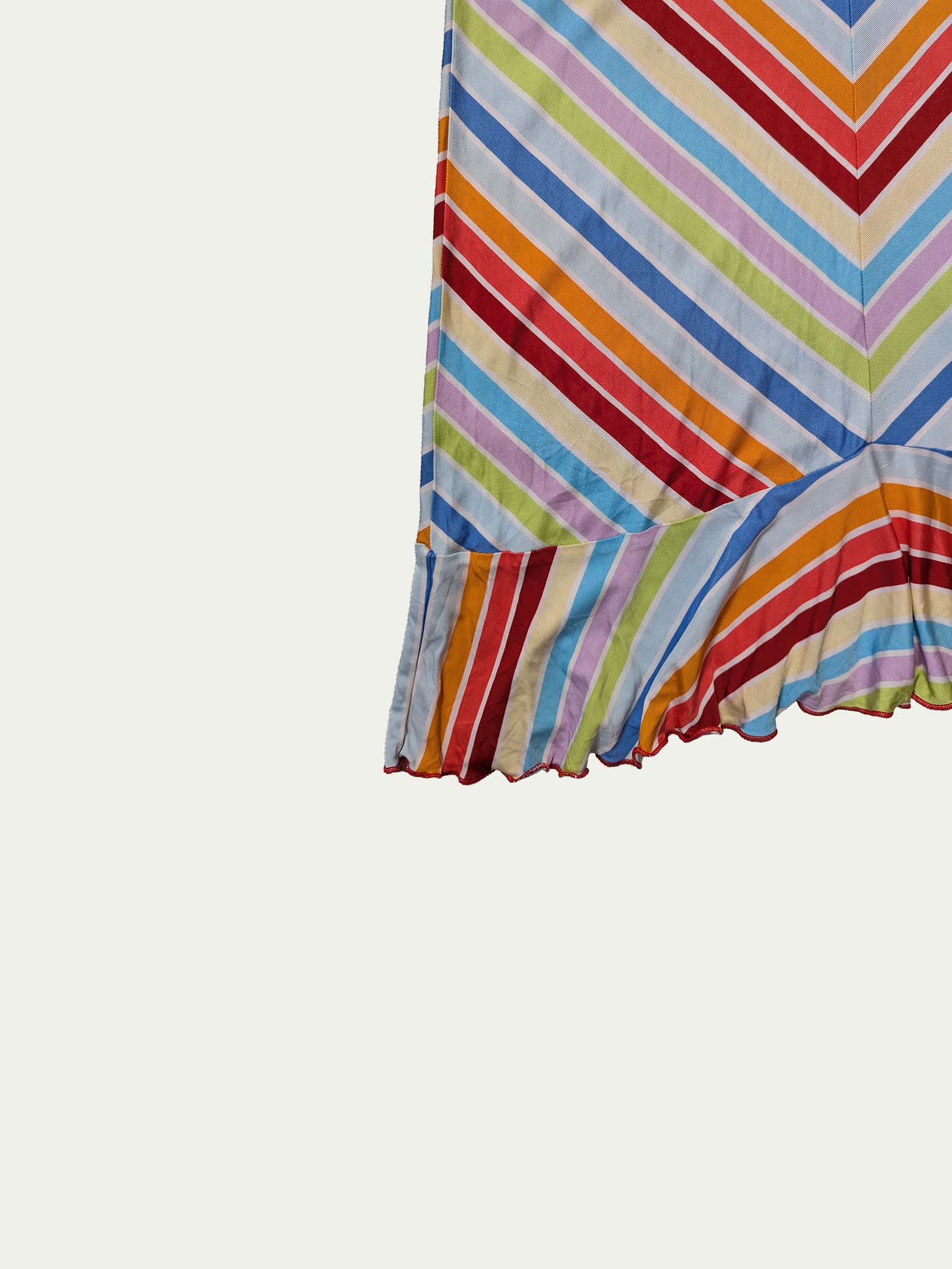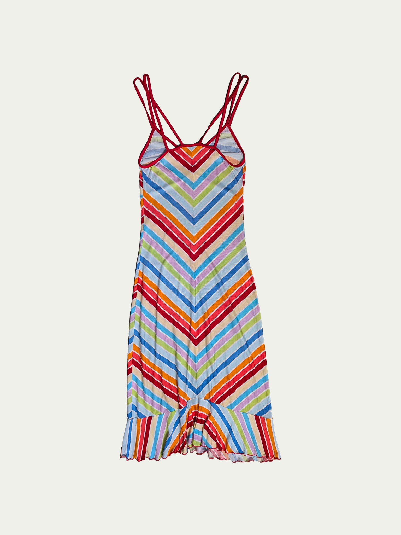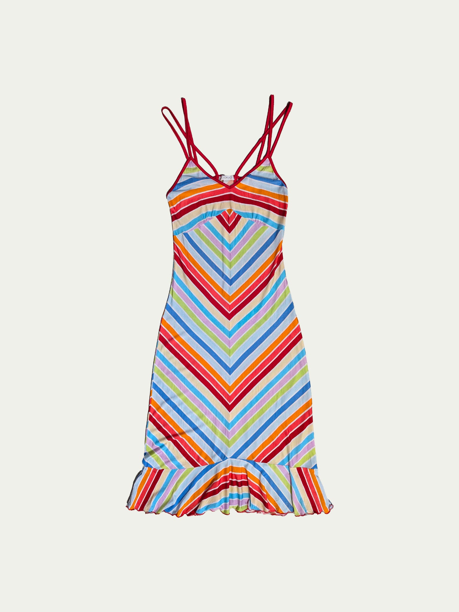 שמלת מידי גמישה של קוקאי Y2K הכוללת דוגמת פסים רב צבעונית, קו שוליים מקושט, רצועות כפולות מוצלבות וגזרה מחמיאה וצמודה לגוף.