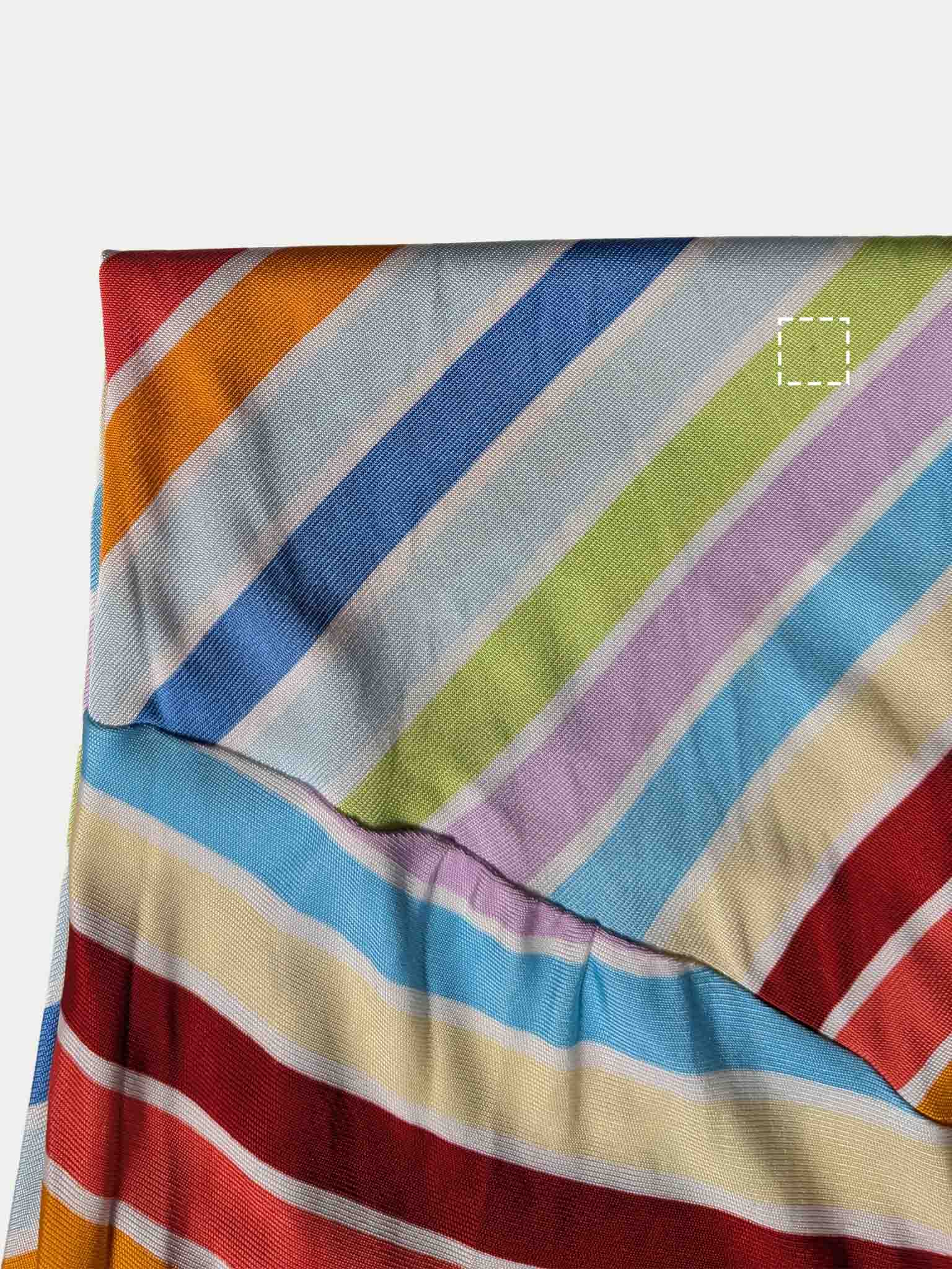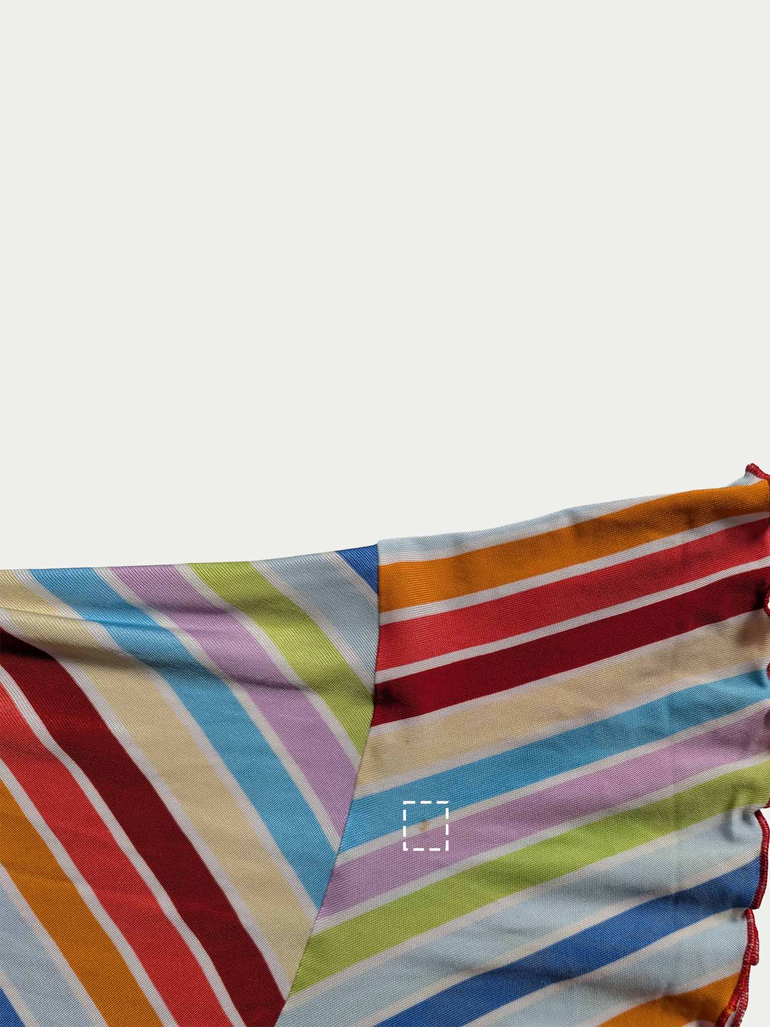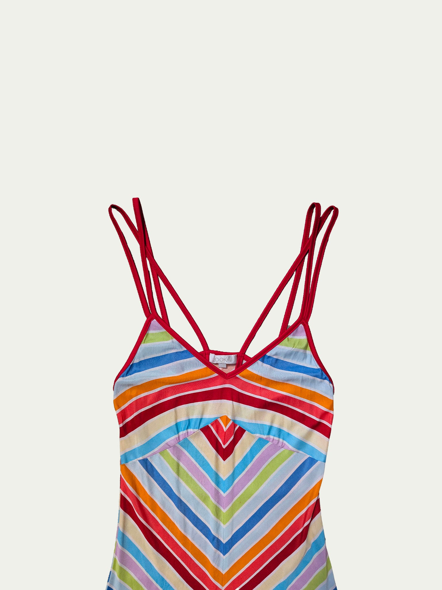 שמלת מידי גמישה של קוקאי Y2K הכוללת דוגמת פסים רב צבעונית, קו שוליים מקושט, רצועות כפולות מוצלבות וגזרה מחמיאה וצמודה לגוף.