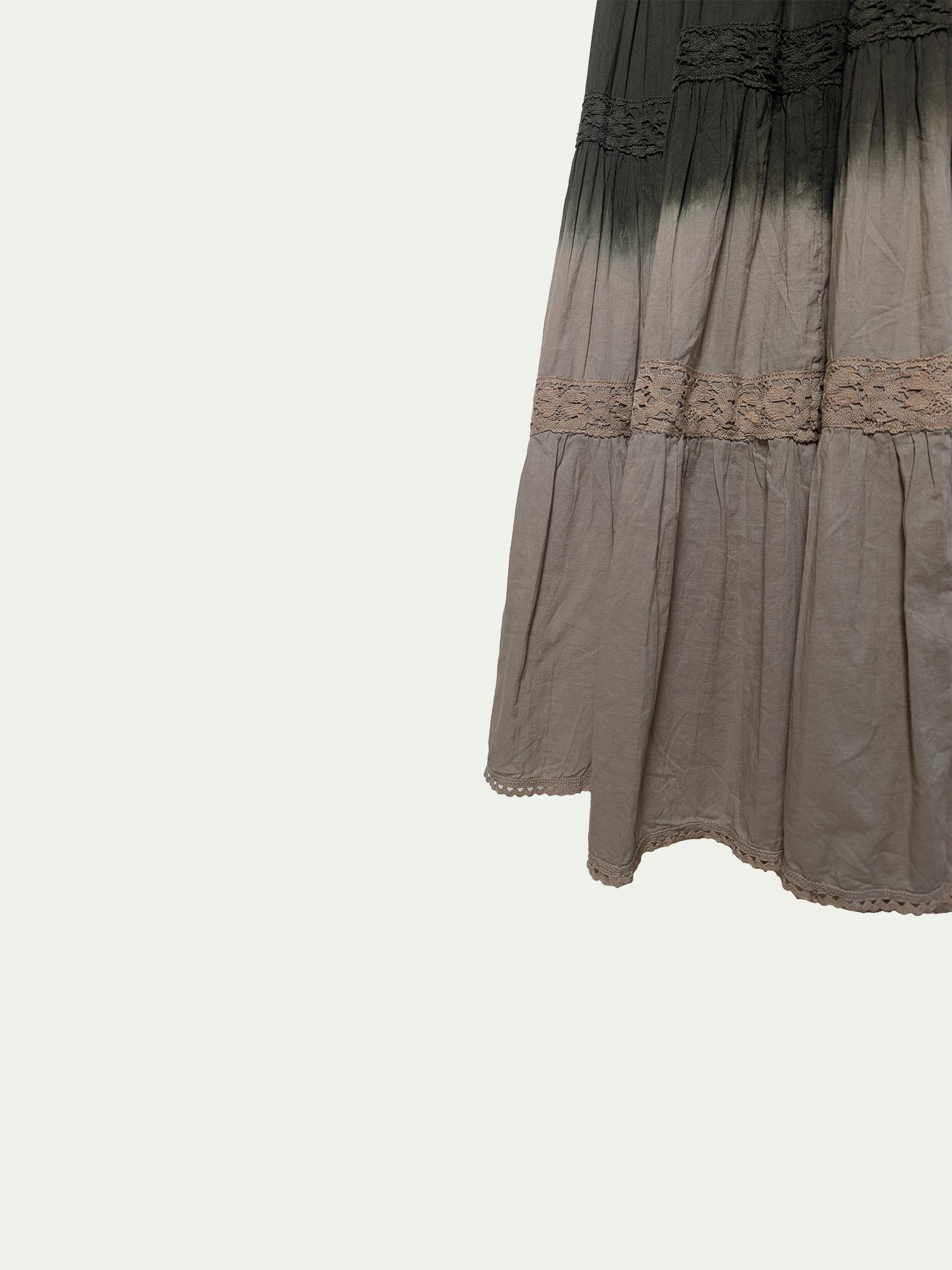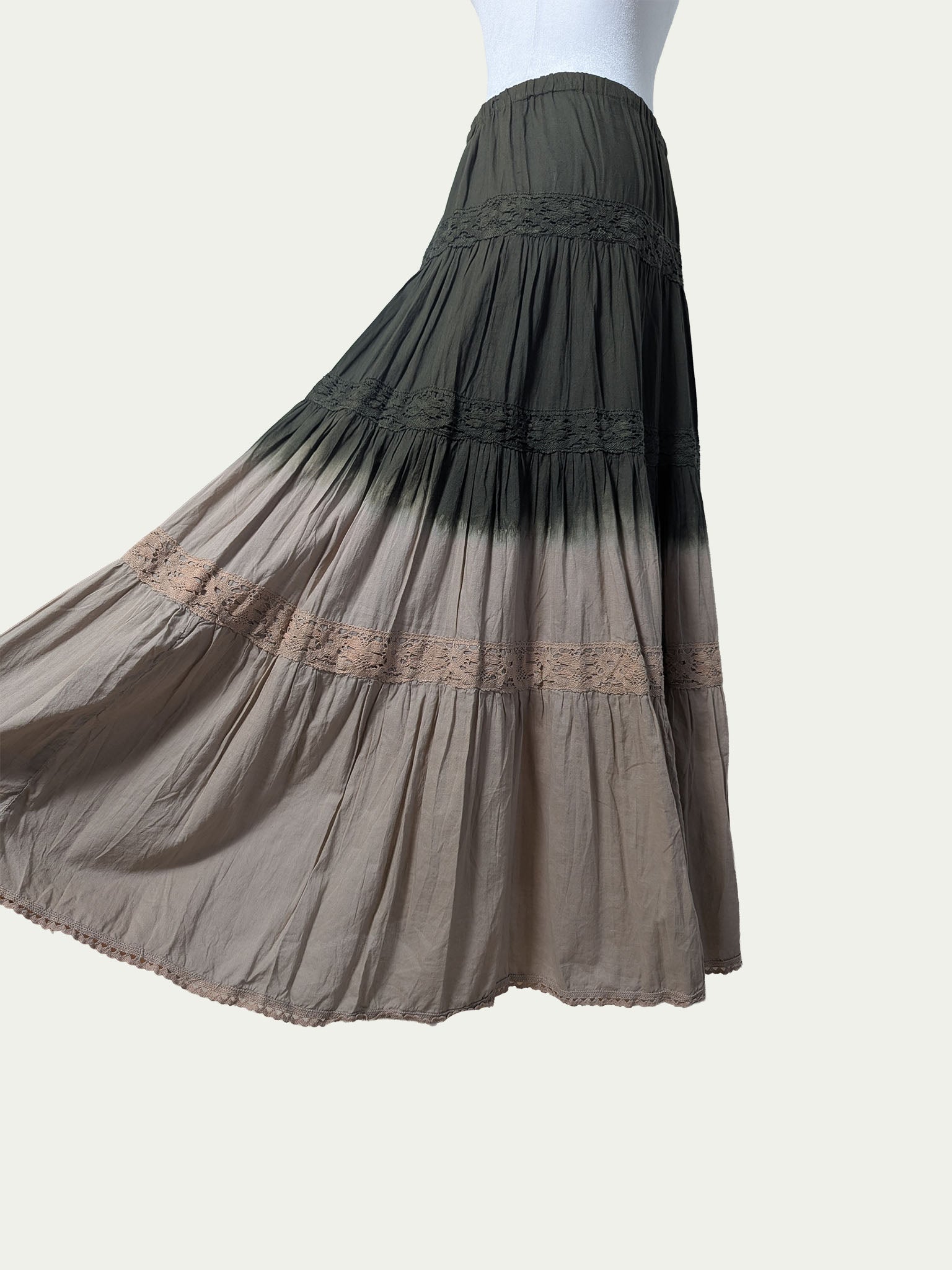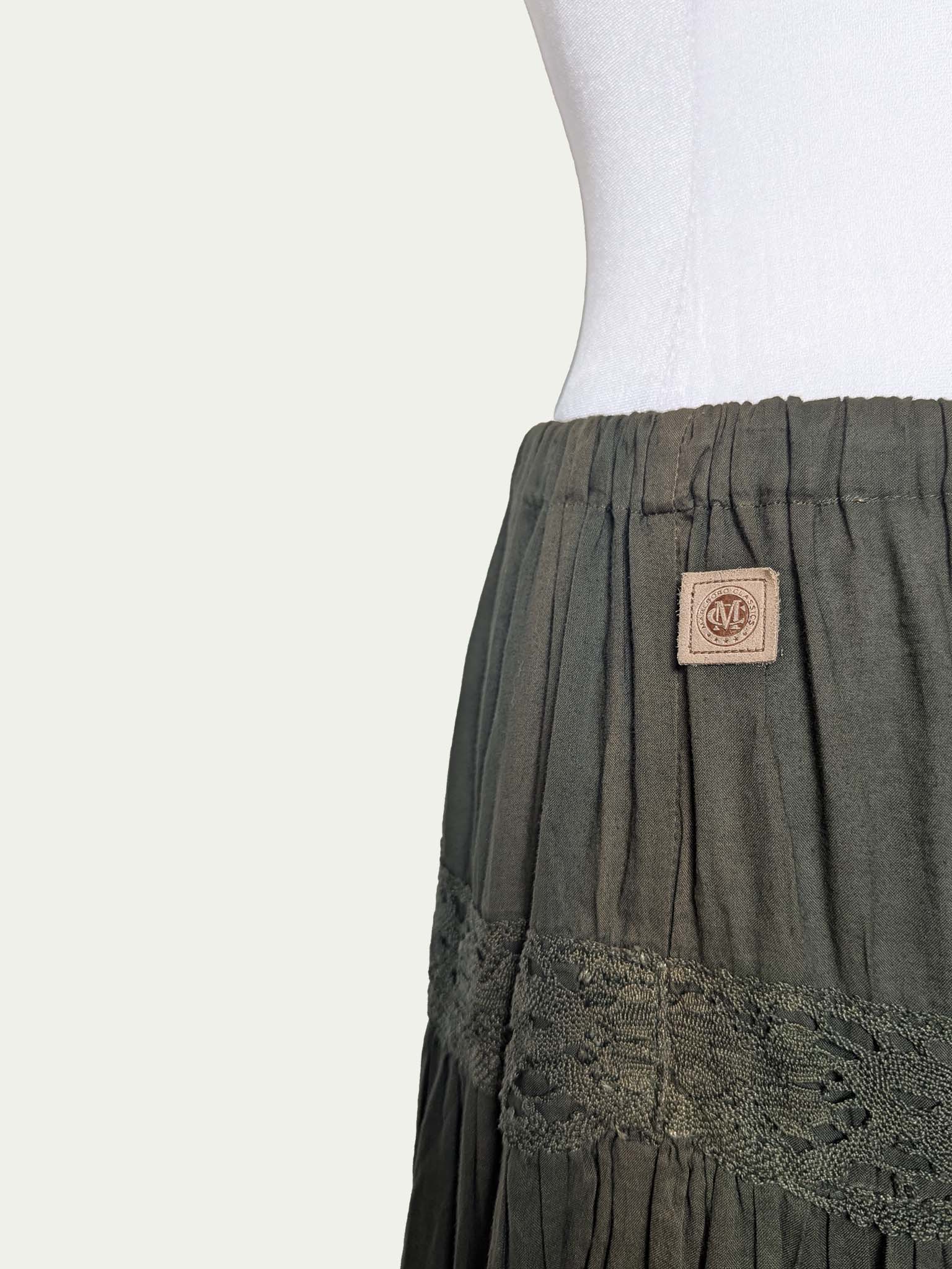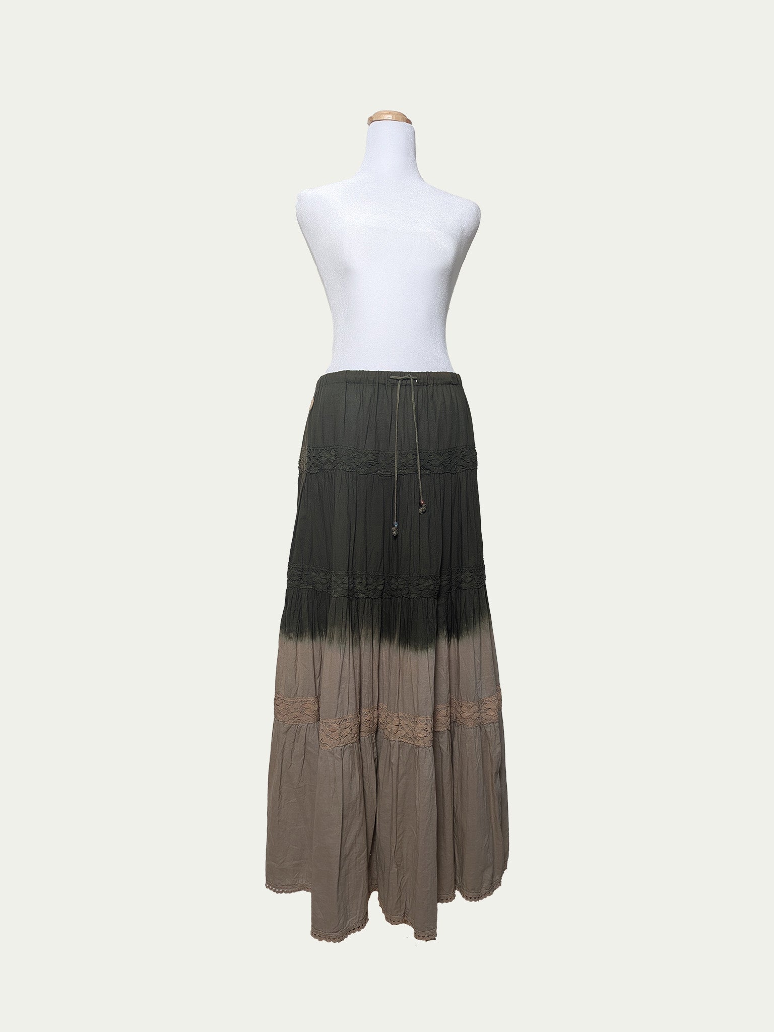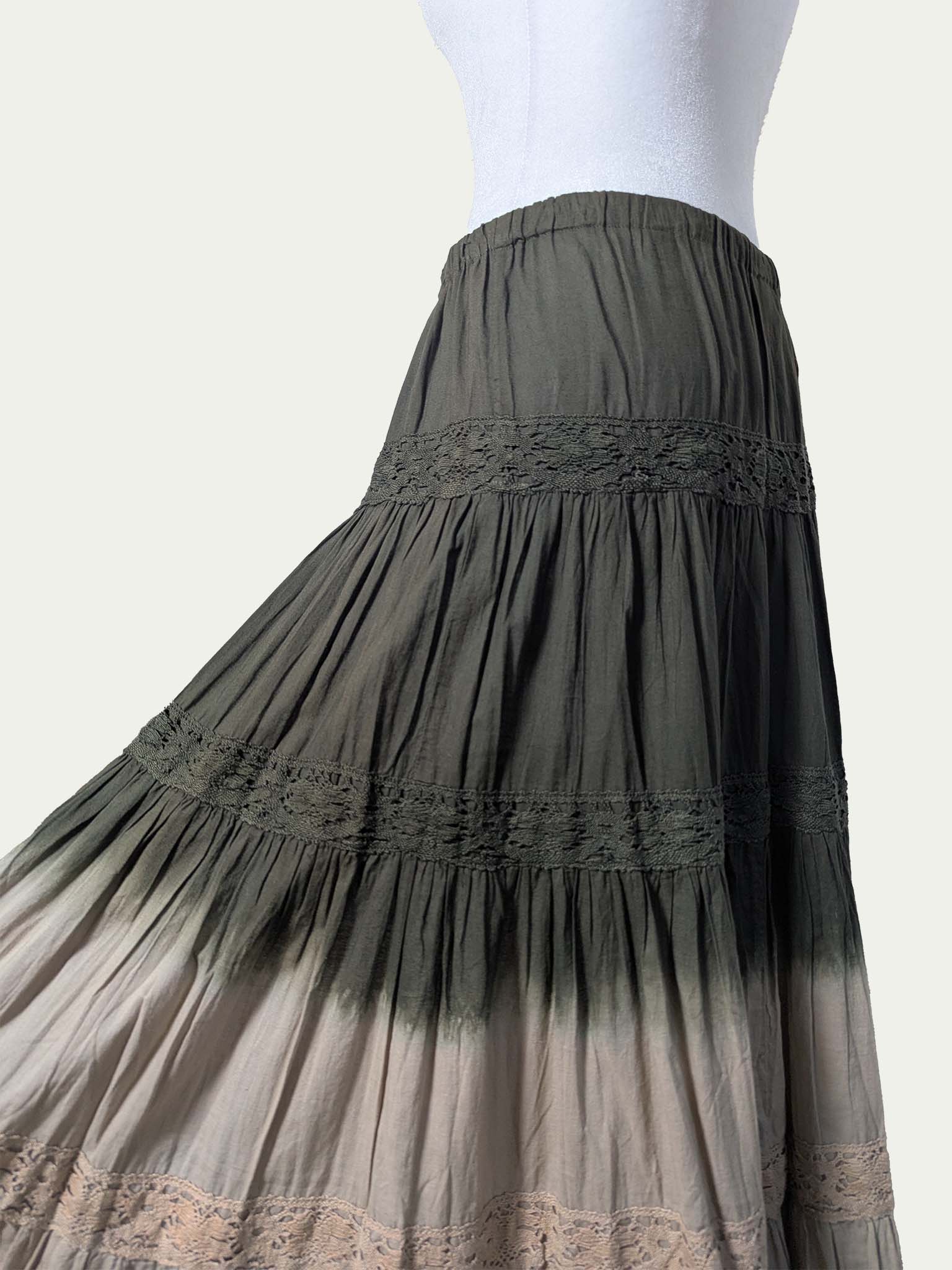 Early 2000s tiered maxi skirt by Marlboro Classics, made of soft cotton with lace strips throughout. Features an elastic waistband with laces for an adjustable fit. Boho chic with a relaxed flow.