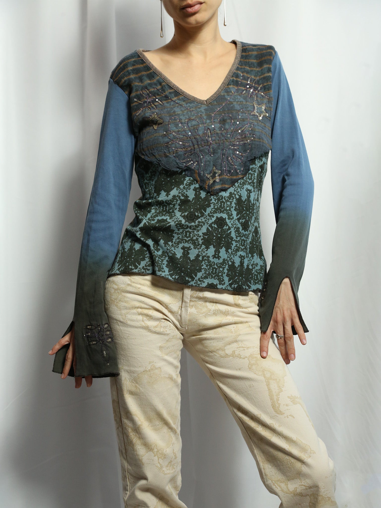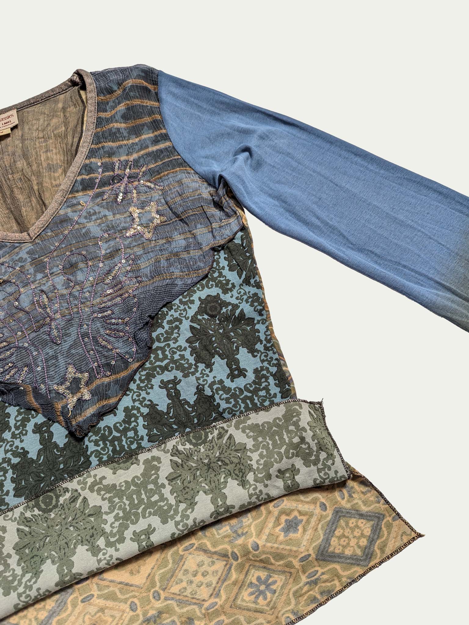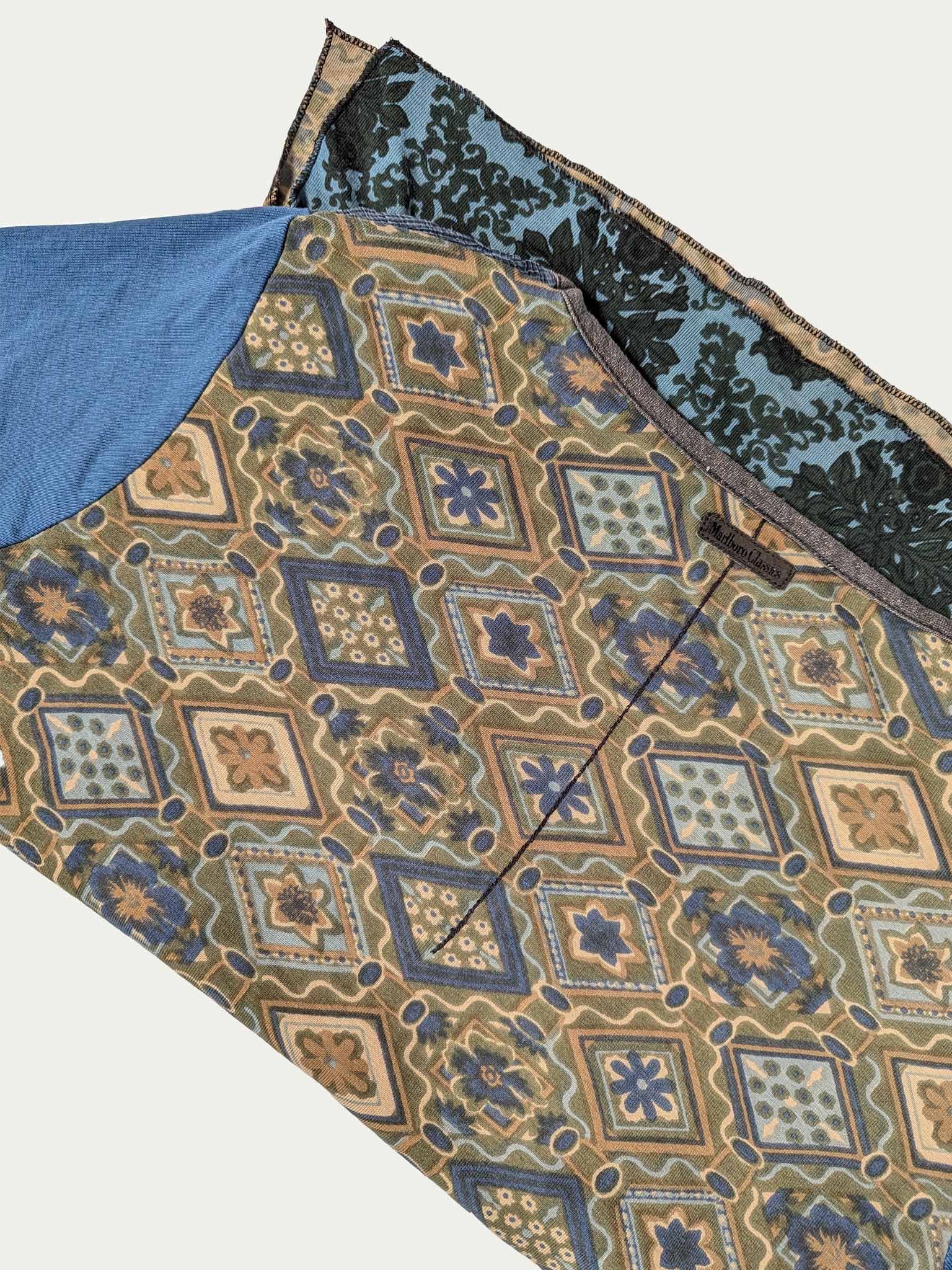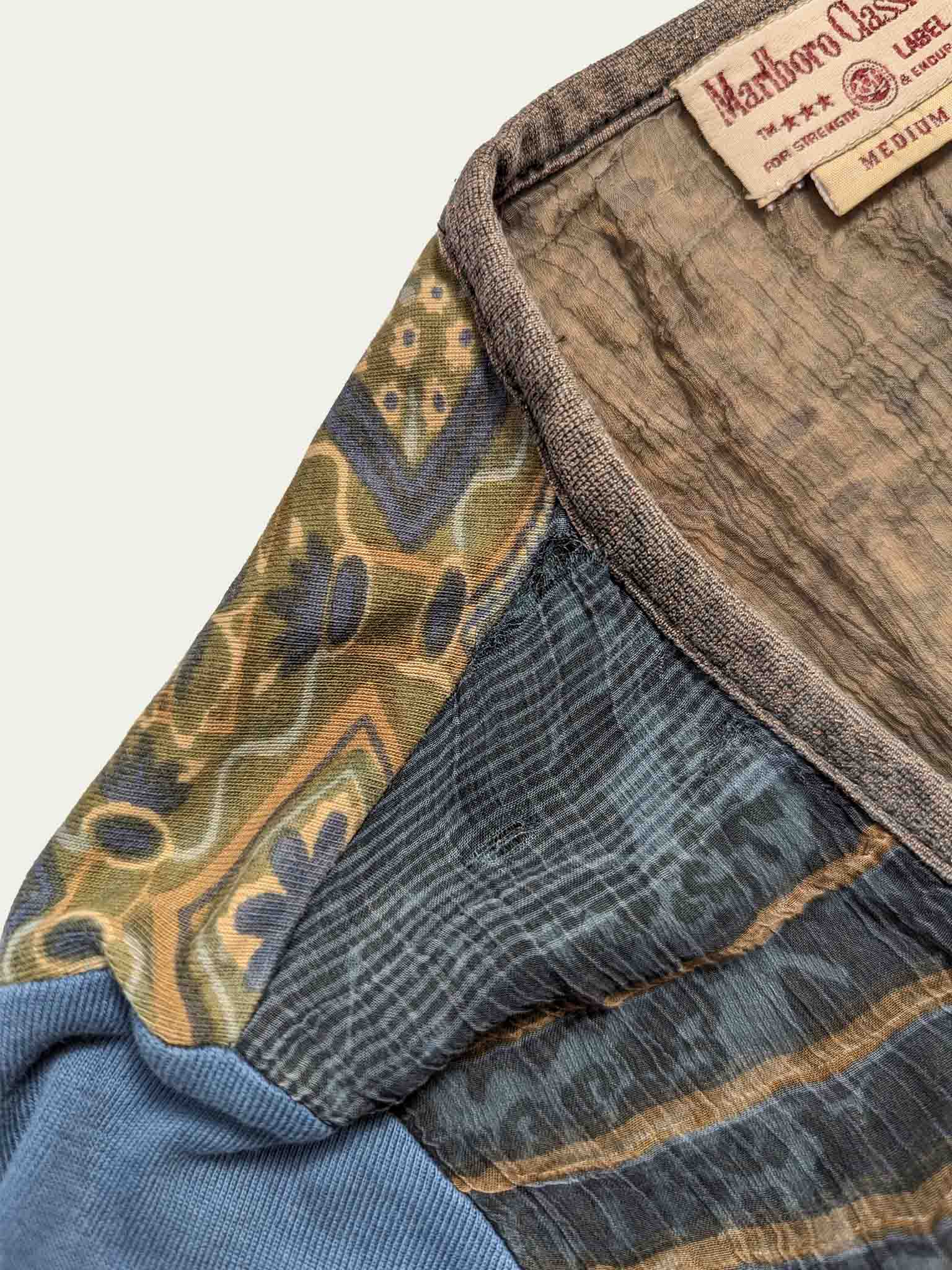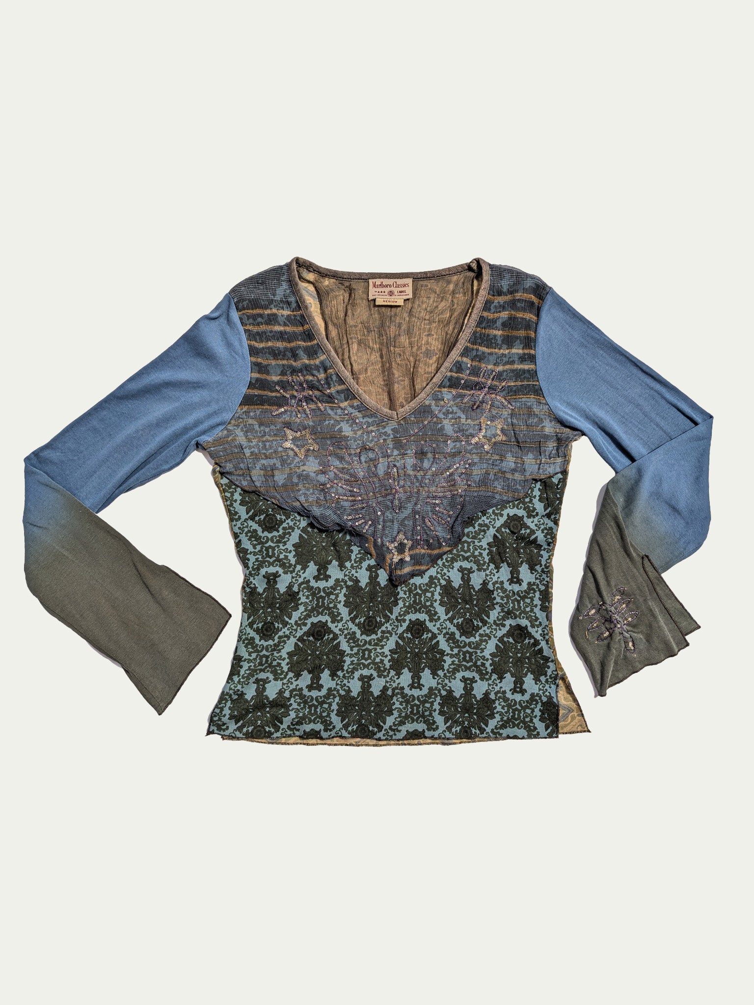 טופ בסגנון Marlboro Classics עם אפליקציות Y2K, בגווני אוקיינוס מעושן, עשוי משלושה בדי כותנה שונים לגב, חזית ושרוולים.