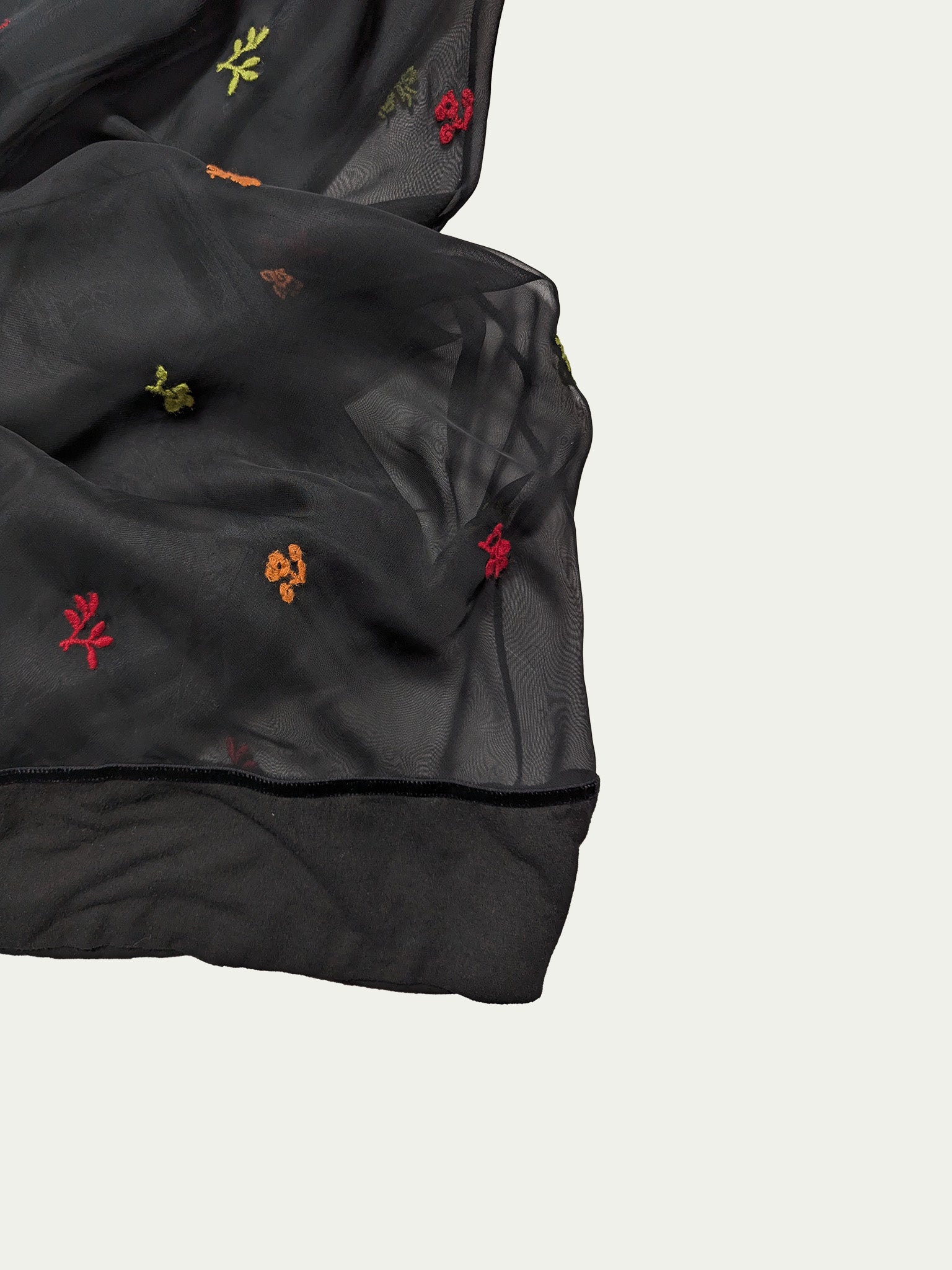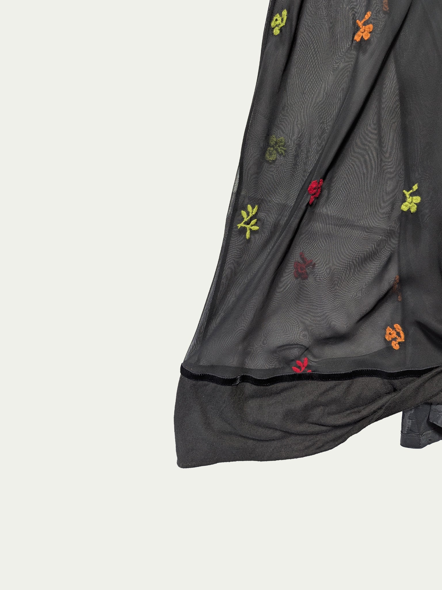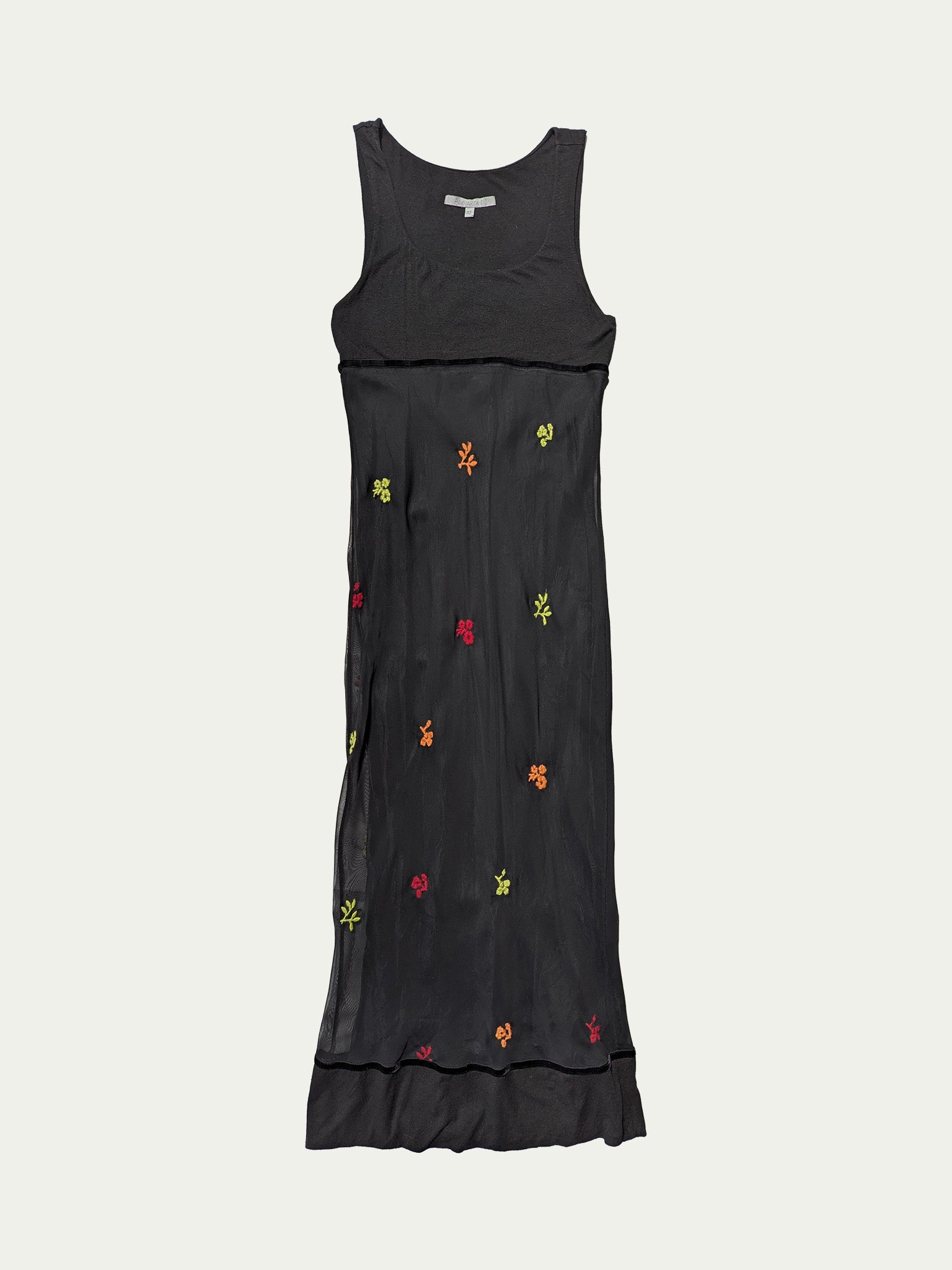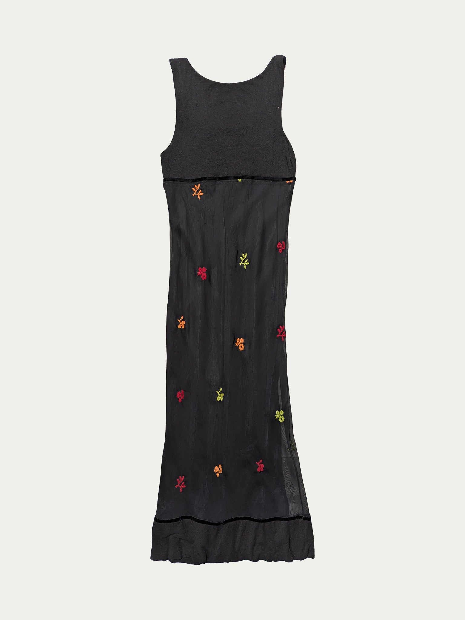 שמלת מקסי שחורה משנות ה-90, עשויה משילוב של בדי כותנה ושיפון