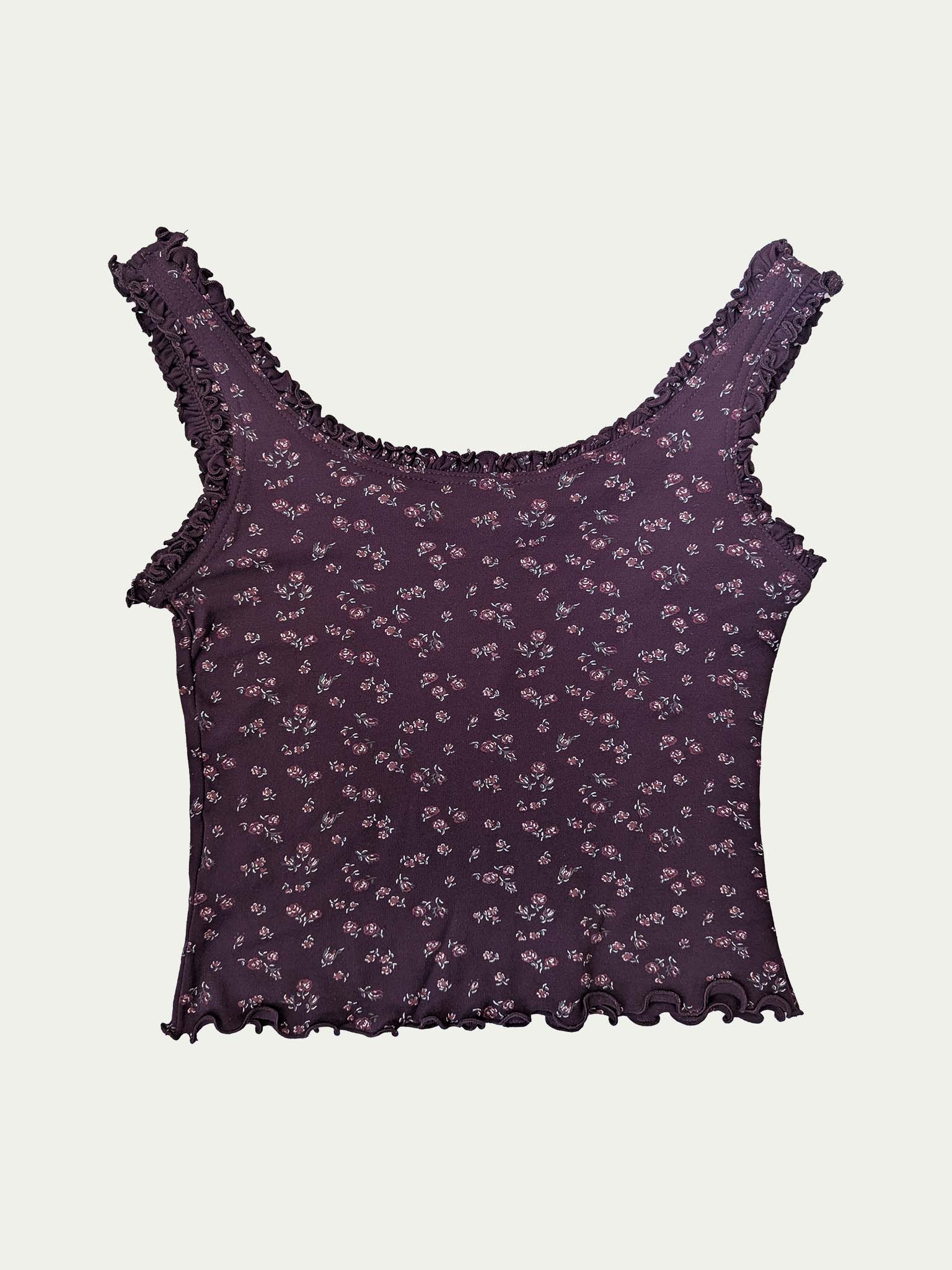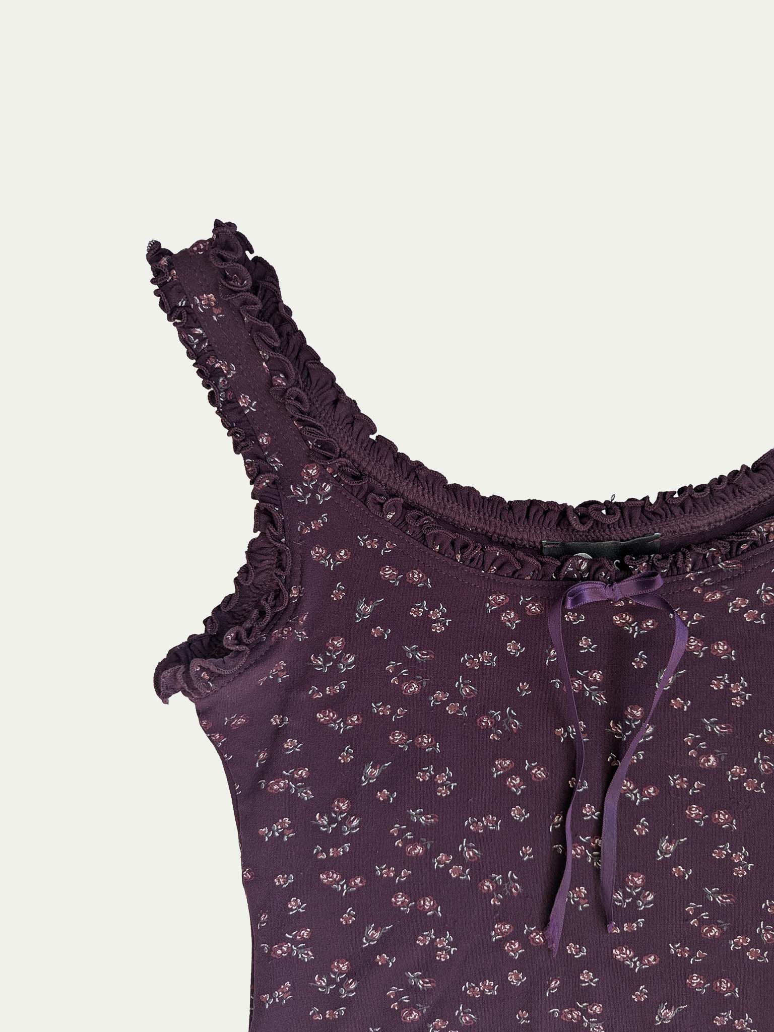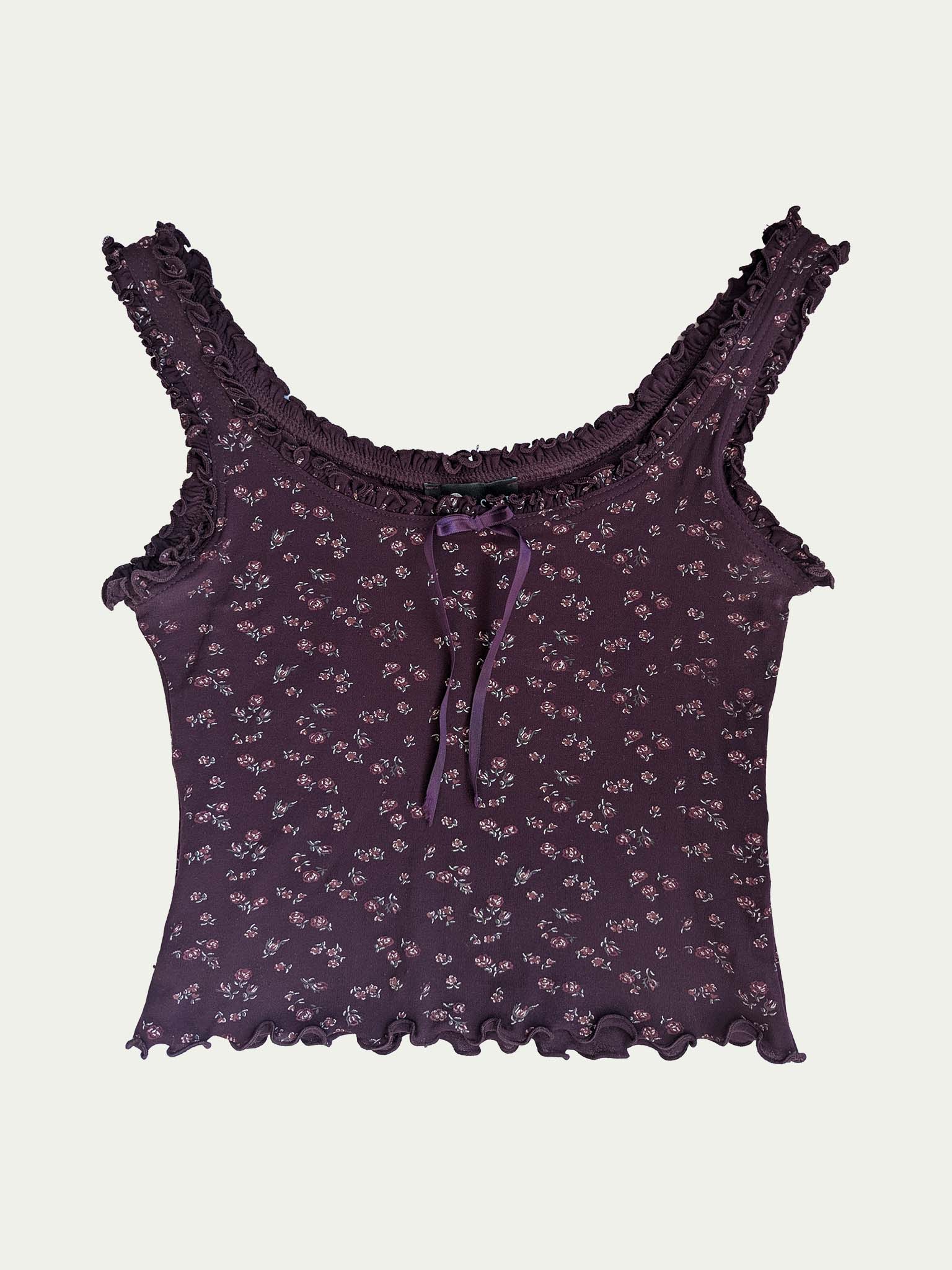 טופ בגזרה קצרה של אורסיי משנות ה-90, בגוון חציל, עם דוגמת פרחים. כוללת מחשוף רחב וקישוטי קפלים לאורך קו החזה ורצועות הכתפיים.