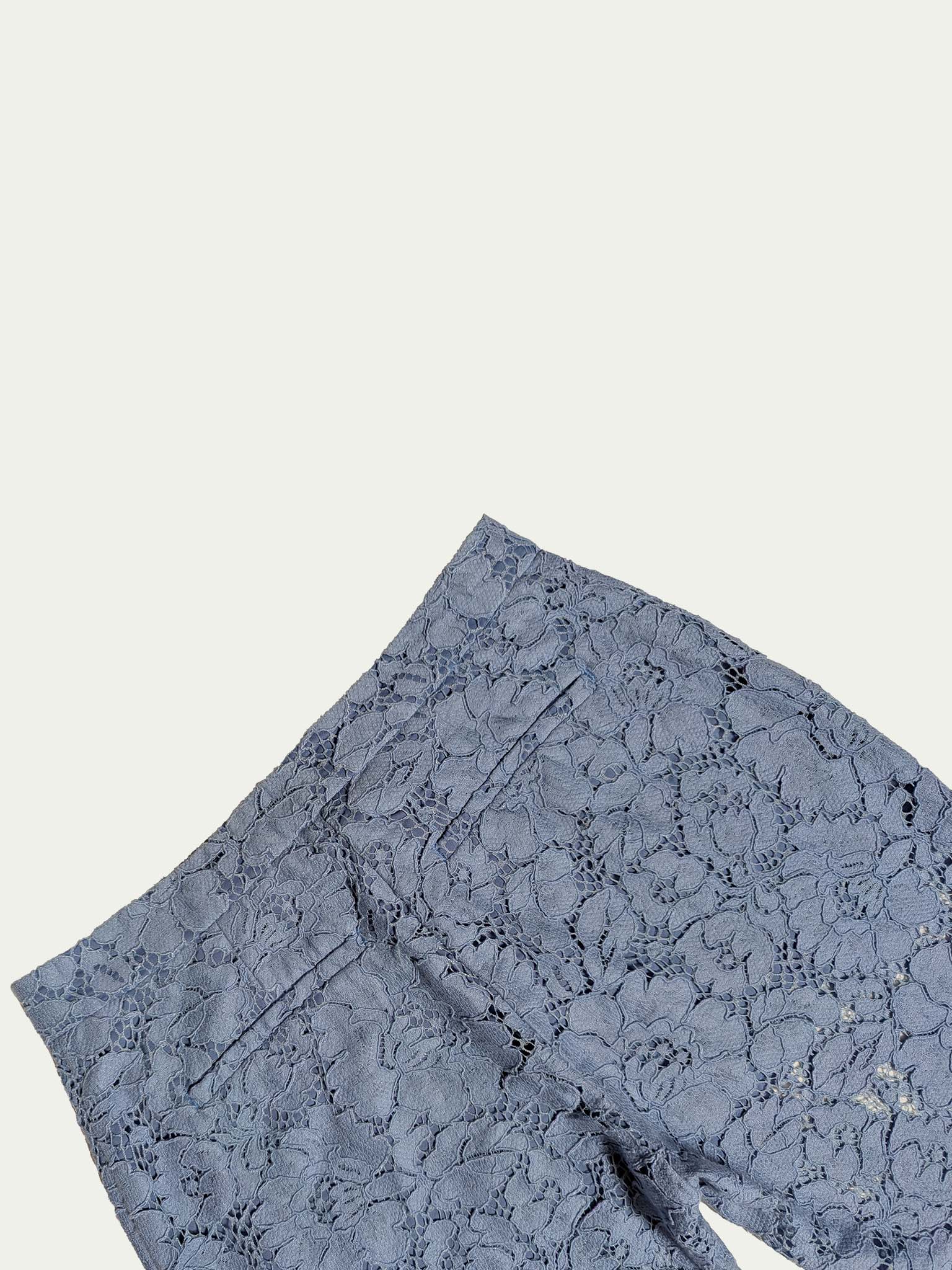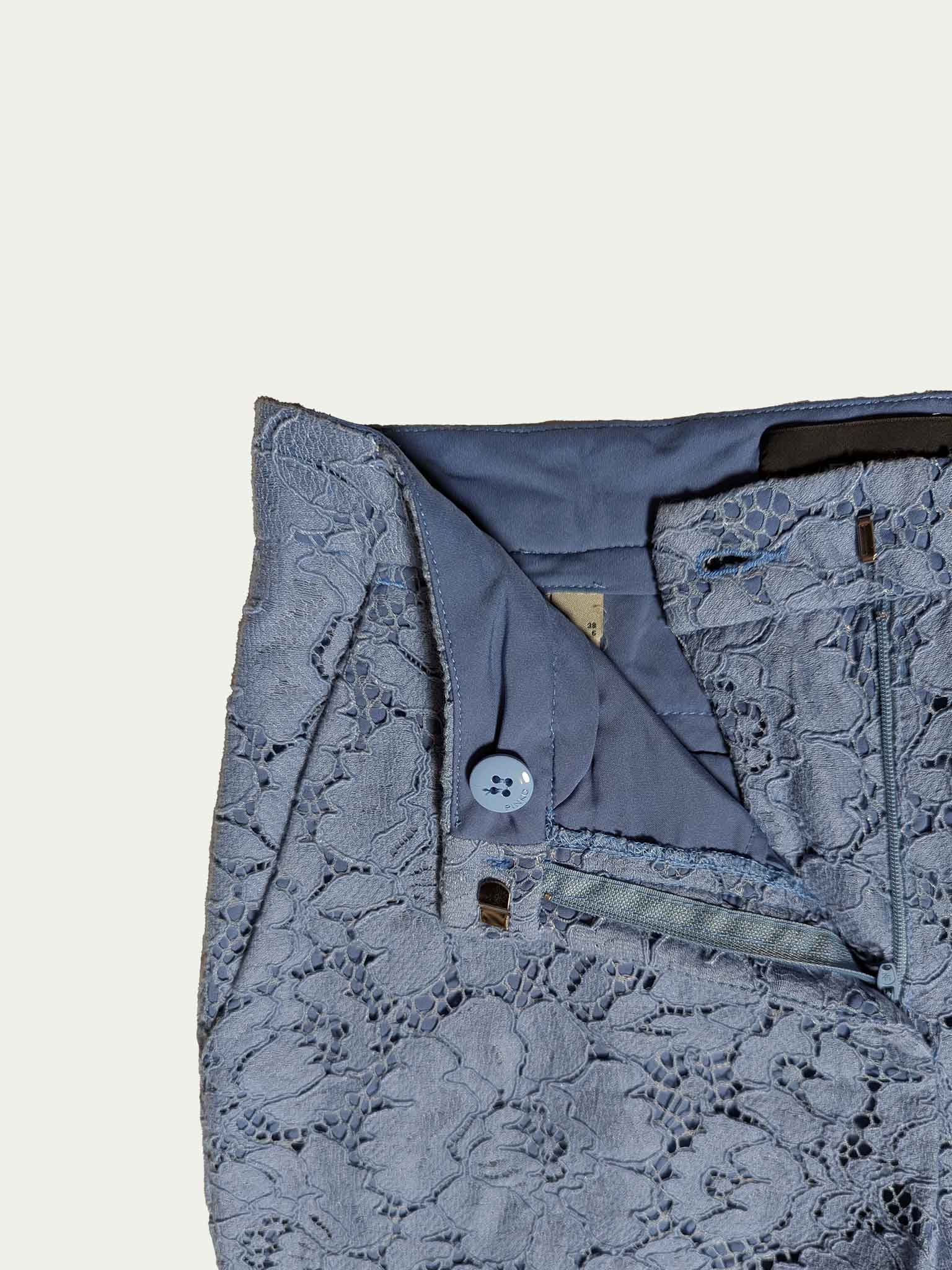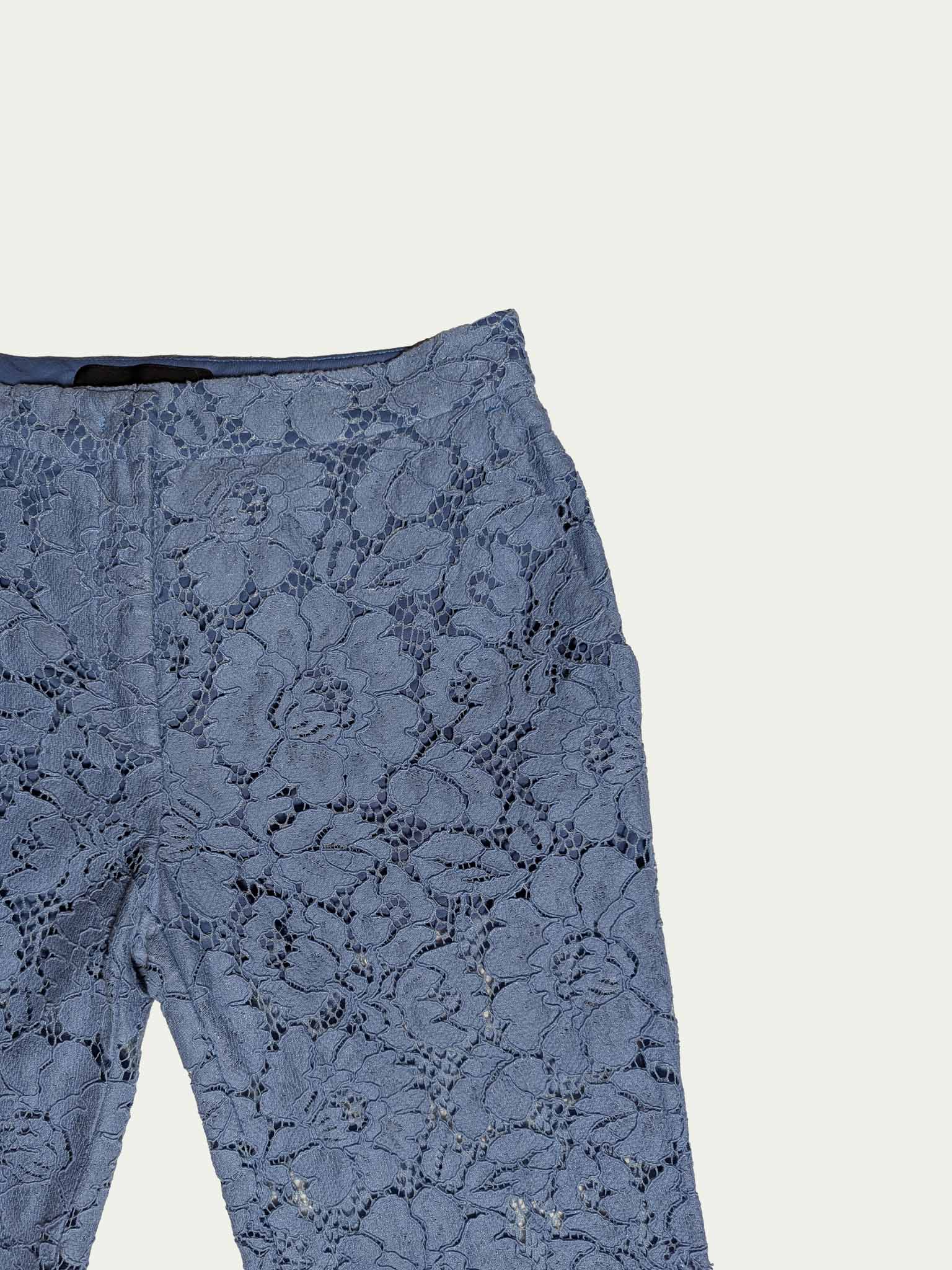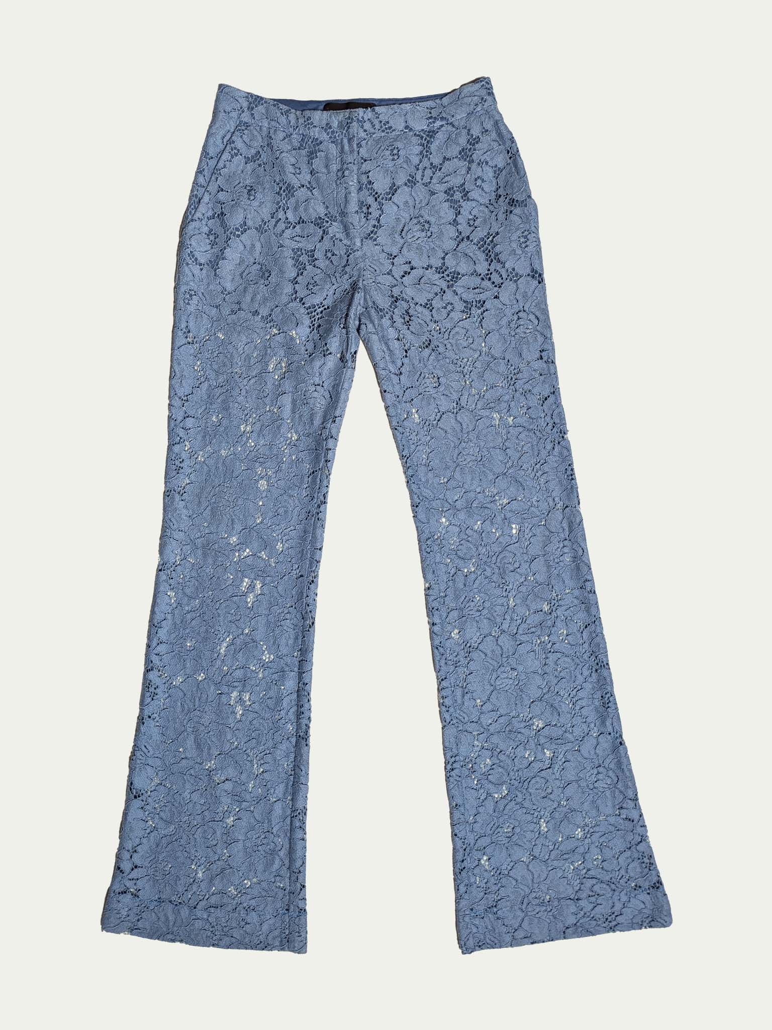 מכנסיים מתרחבים של Y2K Pinko בגזרה בינונית/נמוכה, עשויים מבד תחרה בגוון תכלת.