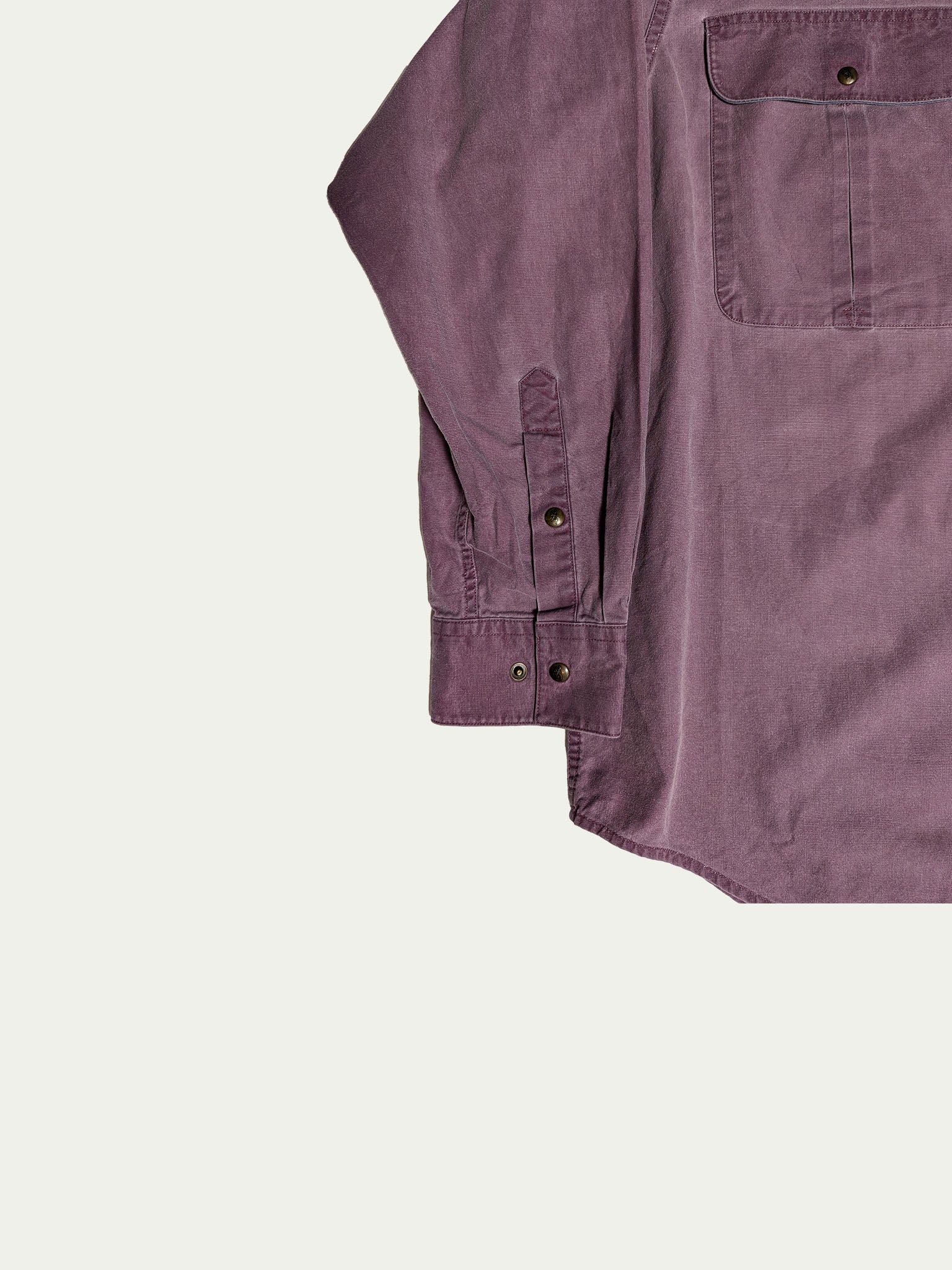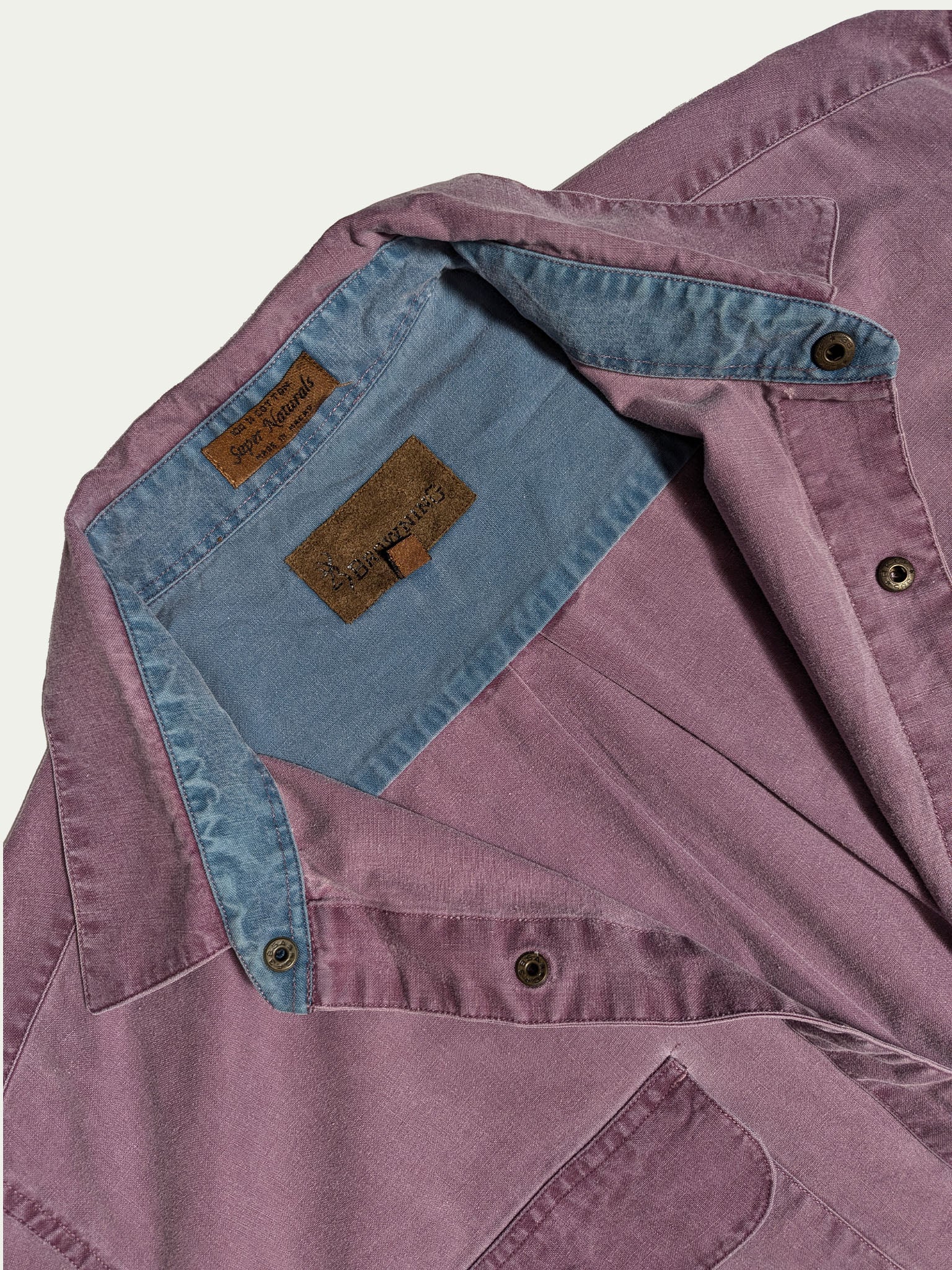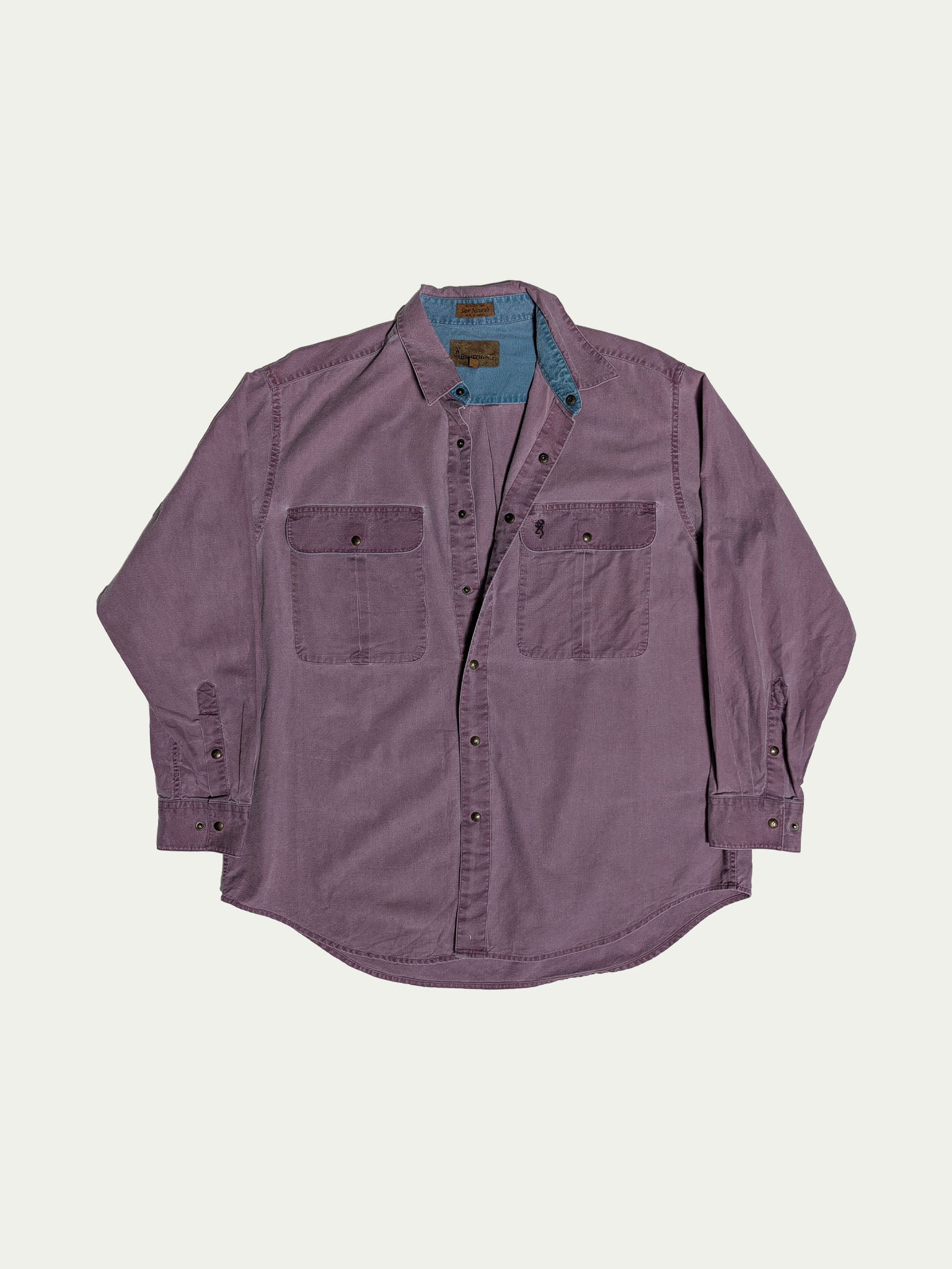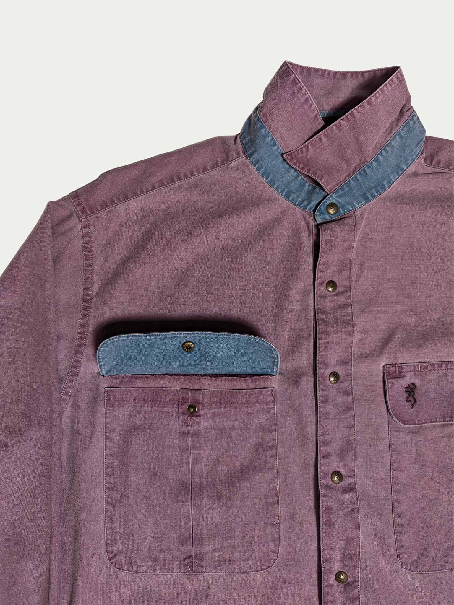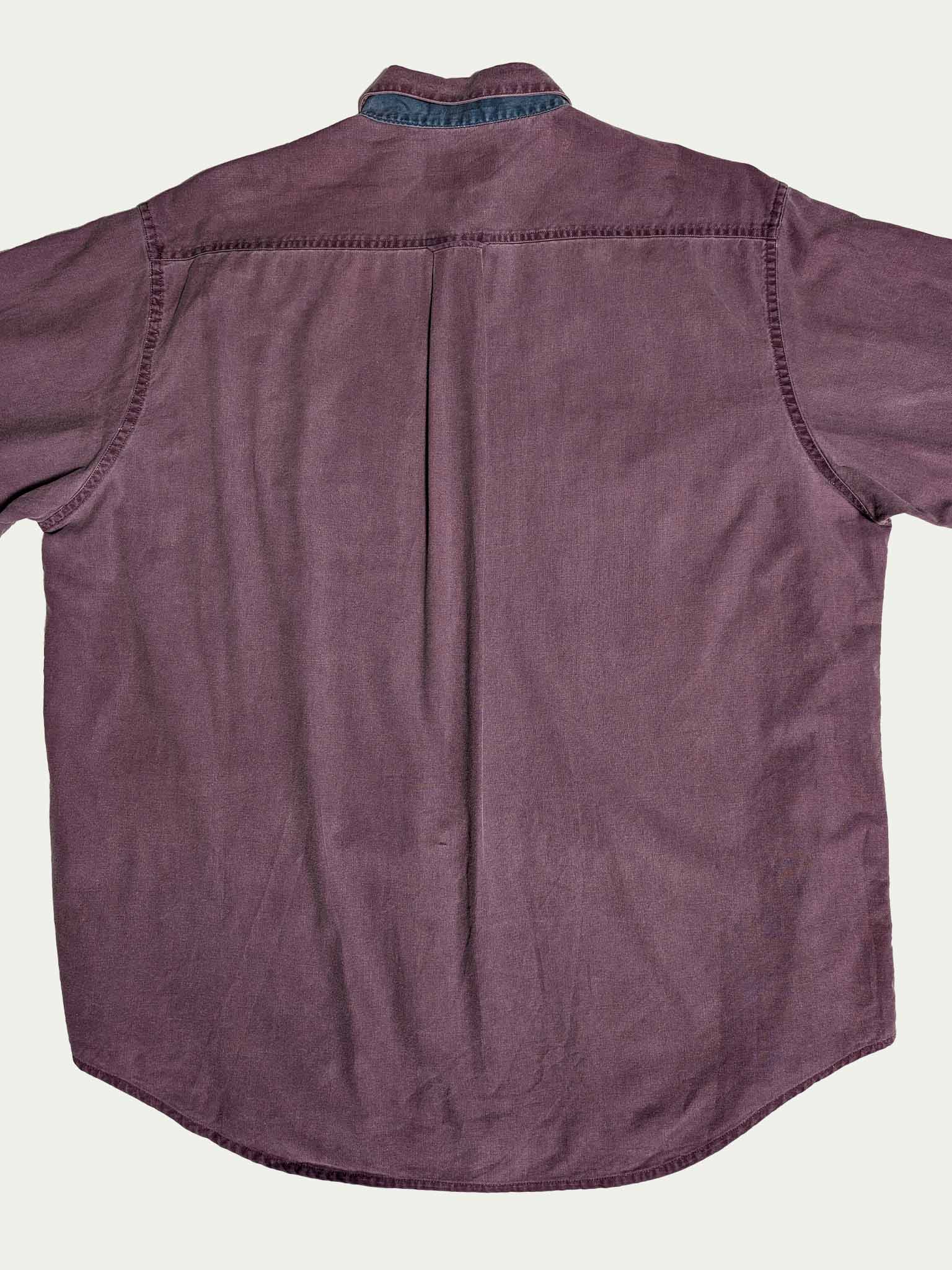 חולצת כותנה לגברים עם כפתורים משנות ה-90, בצבע סגול מעושן, עם אלמנטים בצבע טורקיז בצווארון ובכיסים.