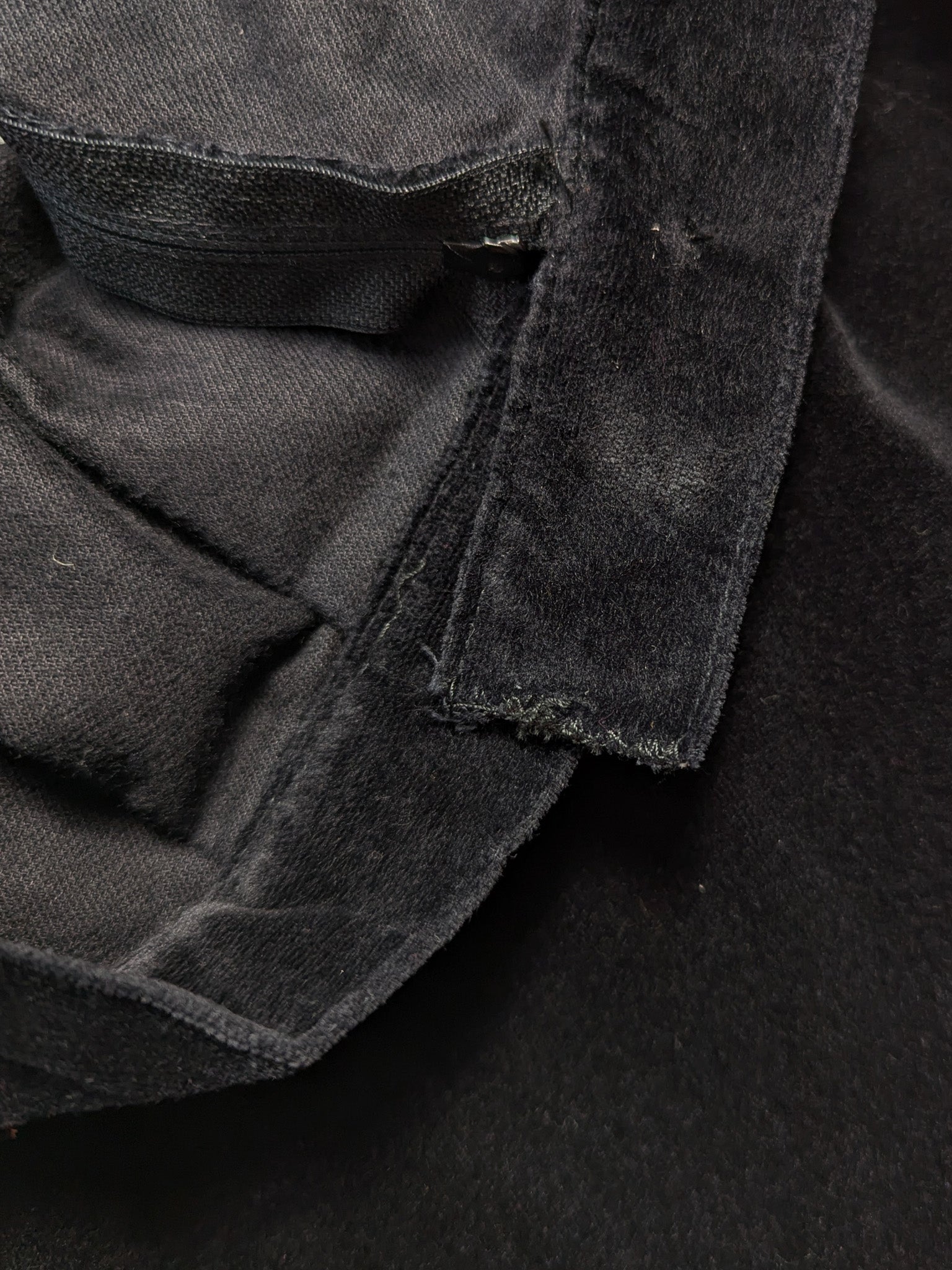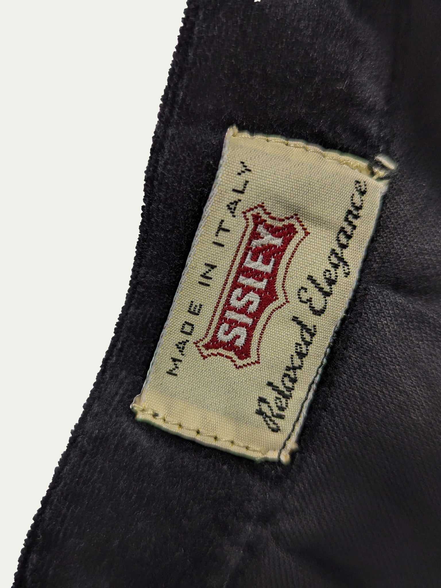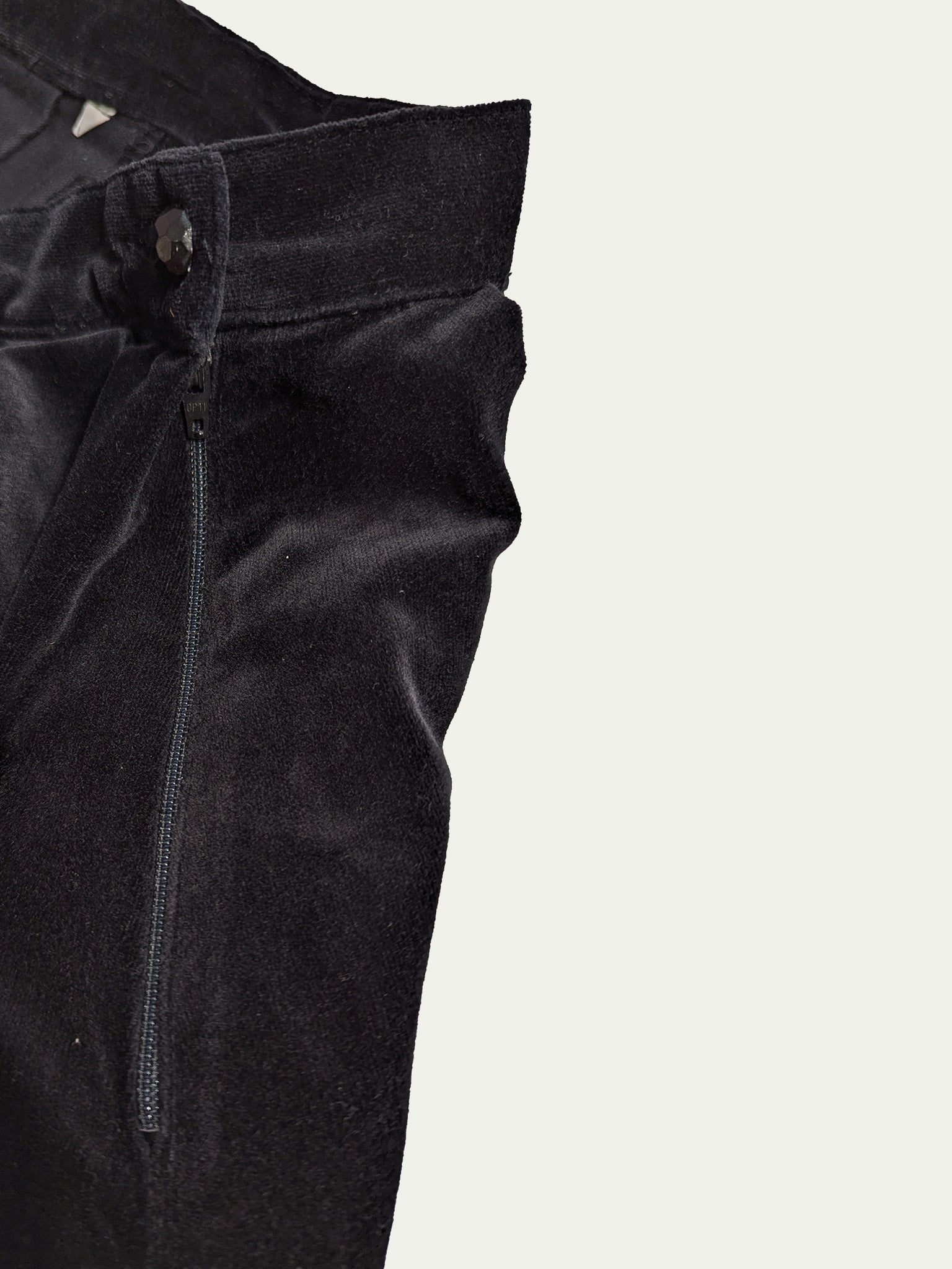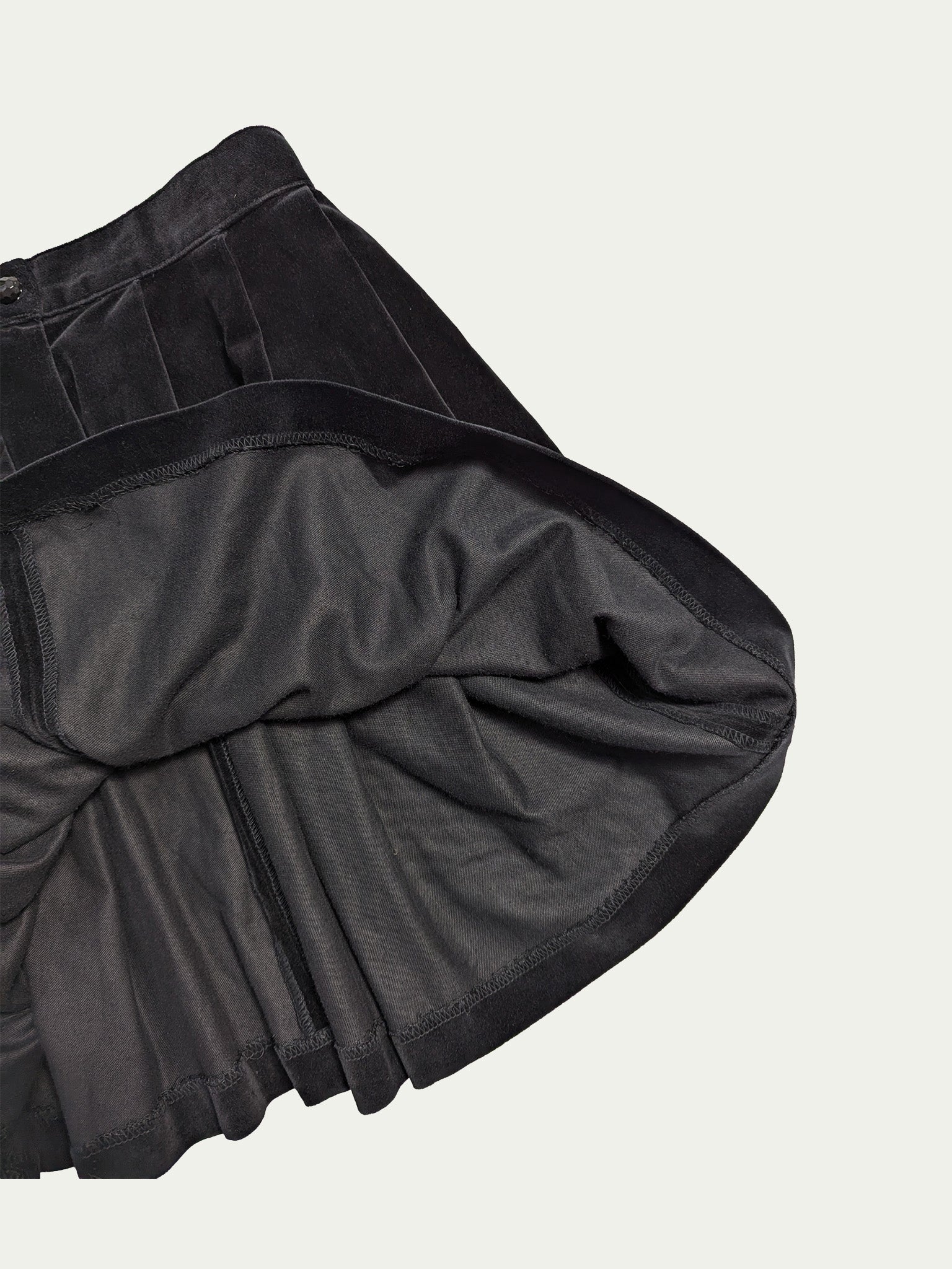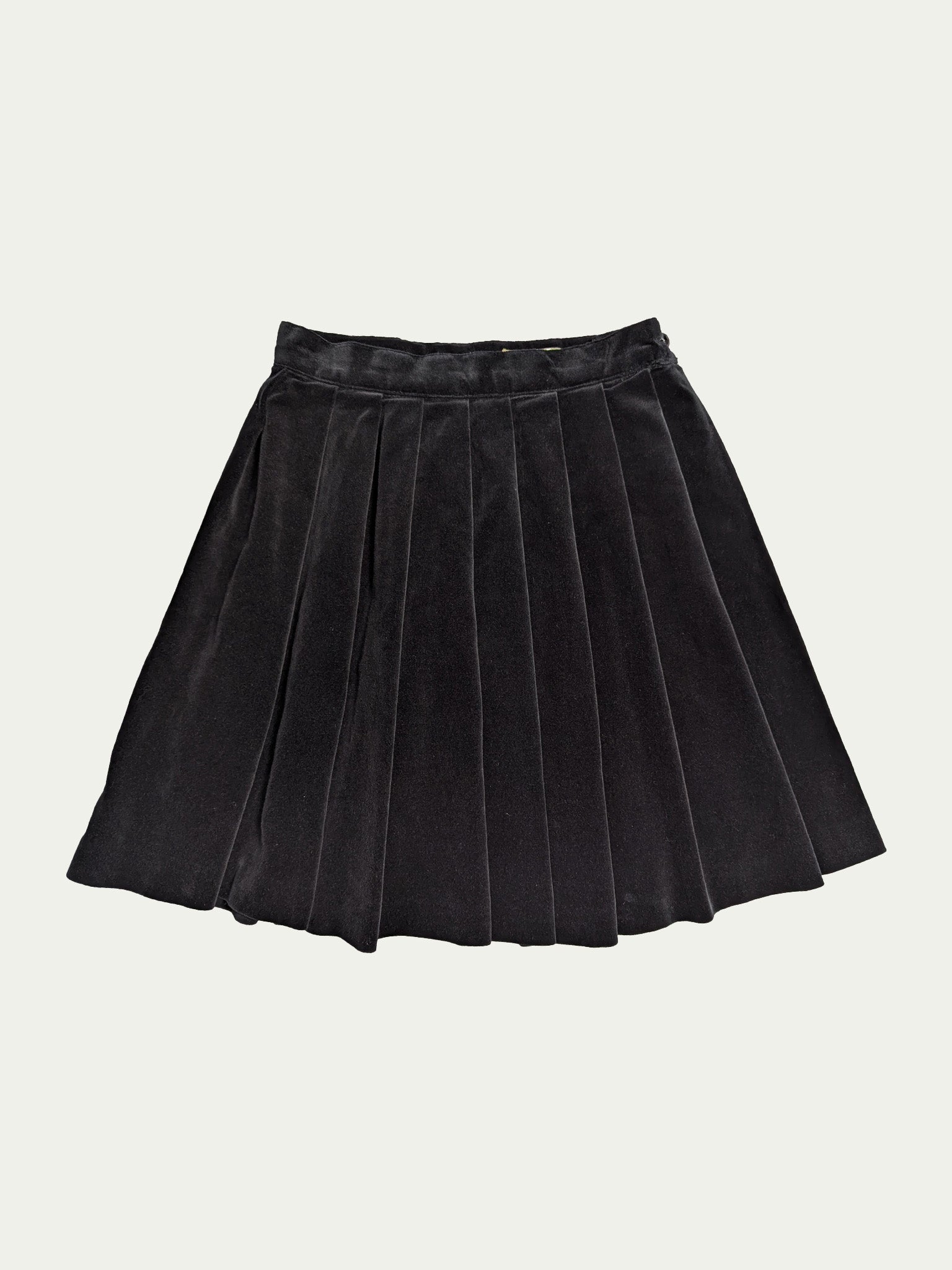 חצאית מיני קפלים של סיסלי מתחילת שנות ה-90, מותן גבוה, עשויה מקטיפה שחורה, עם סגירת כפתור ורוכסן בצד.