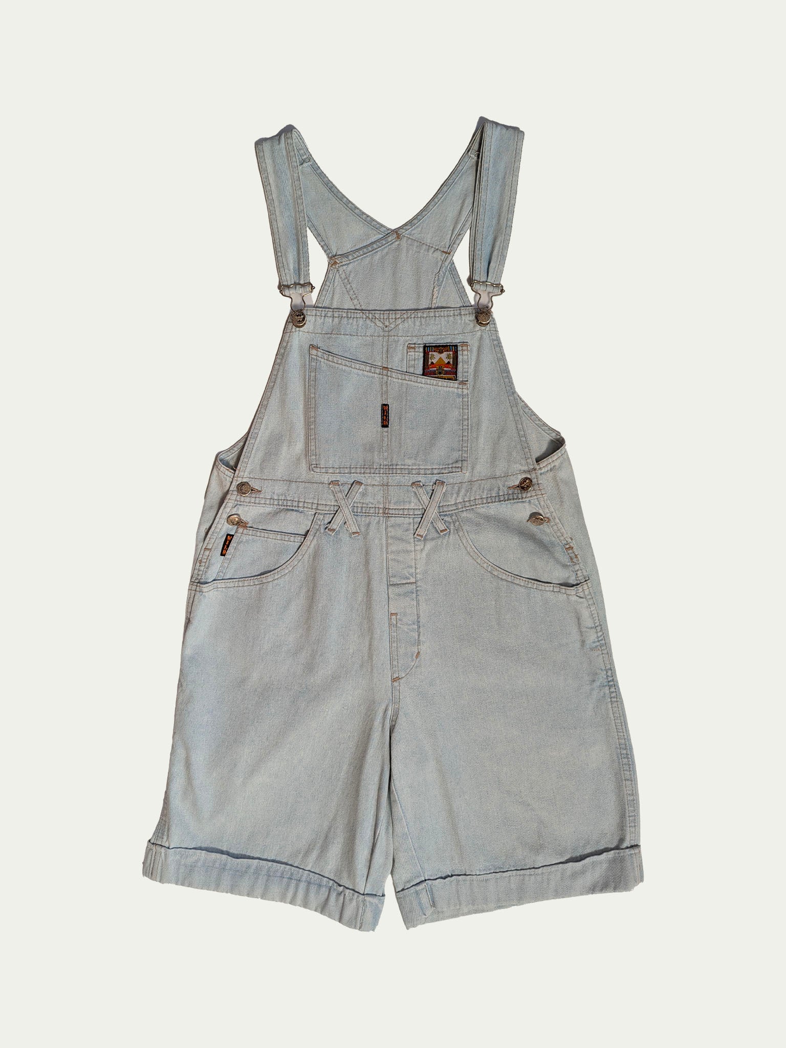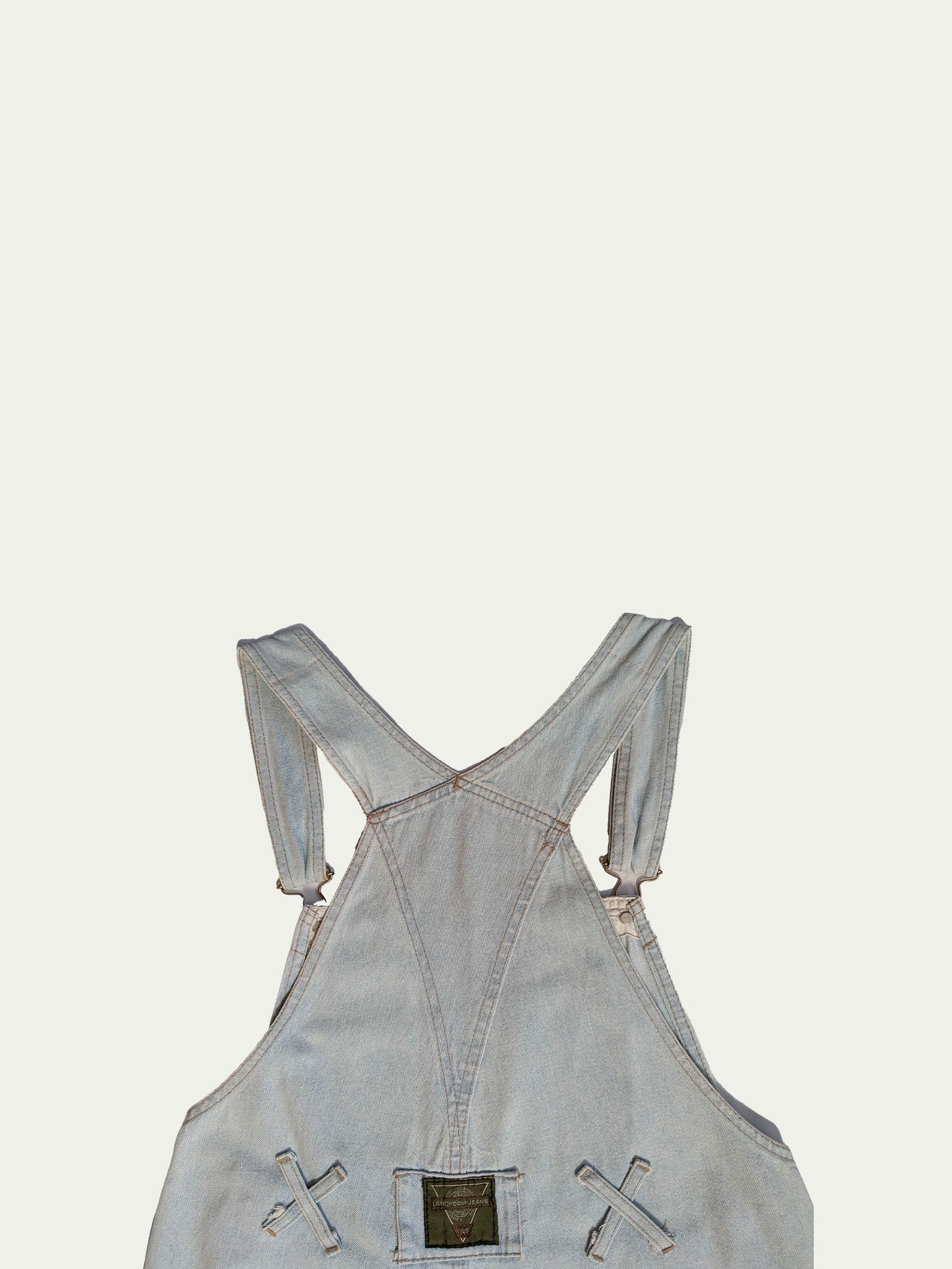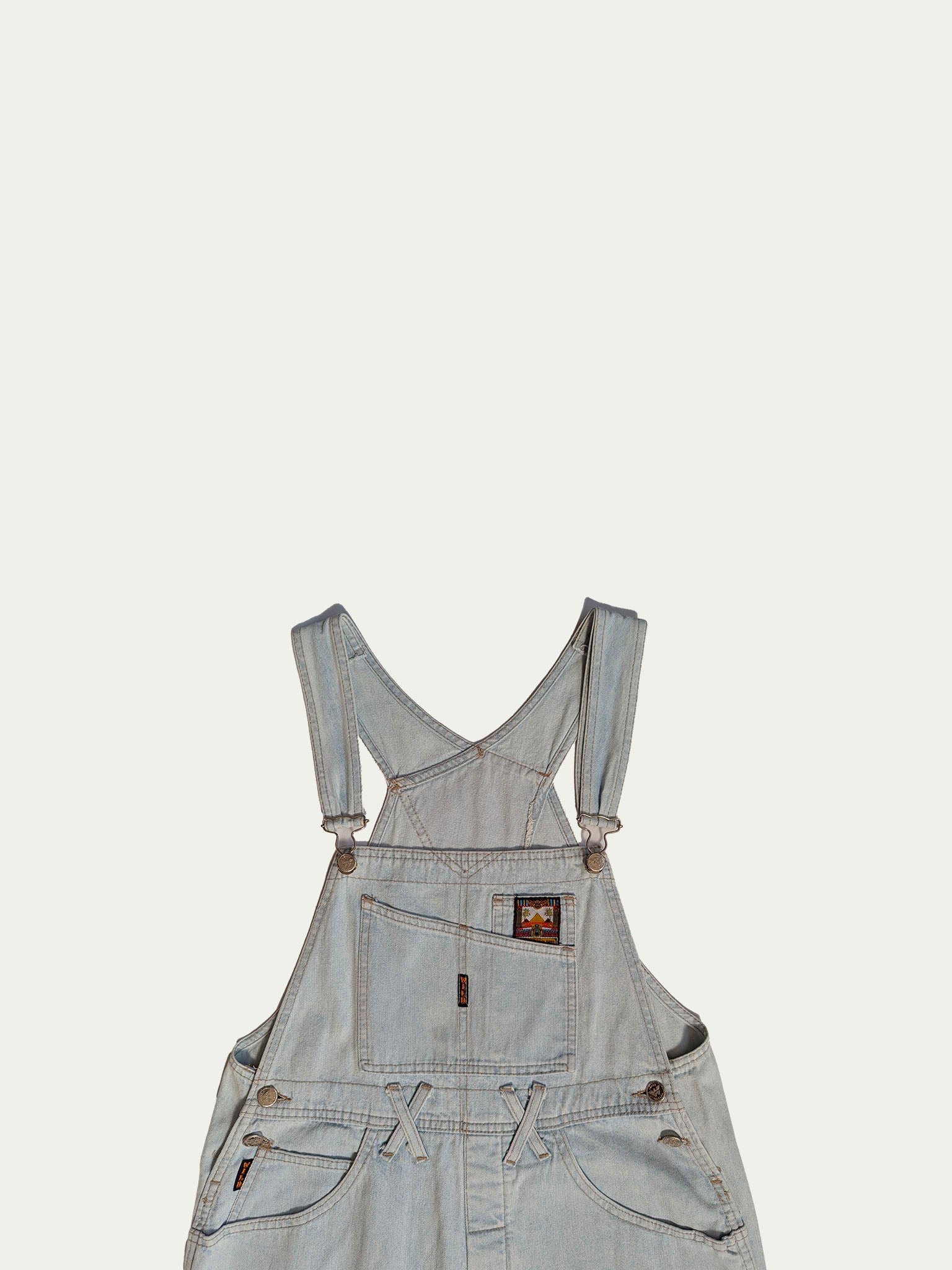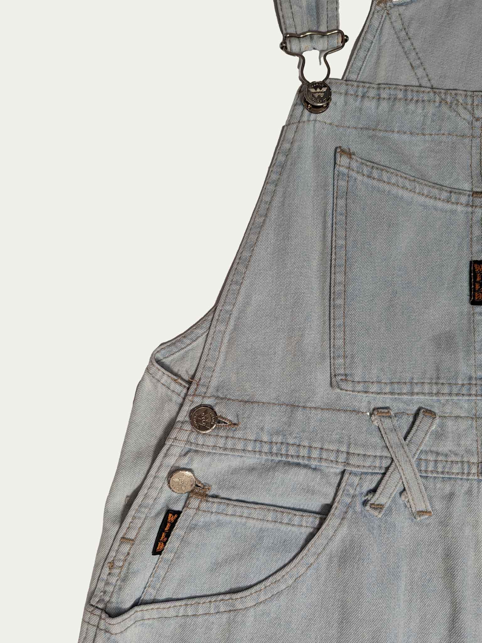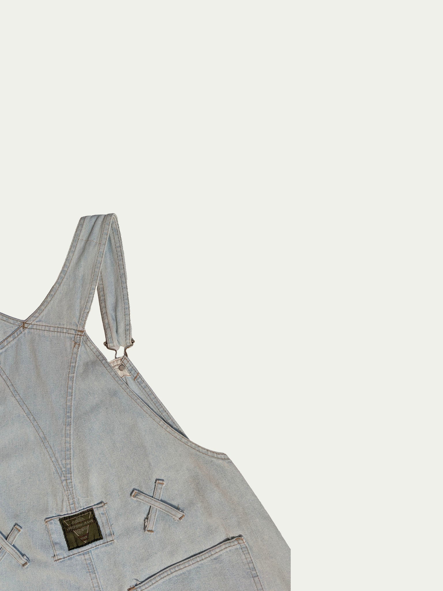 אוברול ג'ינס קלאסי משנות ה-90 עם כיסים קדמיים ואחוריים, לולאות לחגורה ורצועות מתכווננות. הבעלים הקודמים קבעו את אורך הרצועה בעזרת תפר, שניתן להסירו בקלות במידת הצורך.