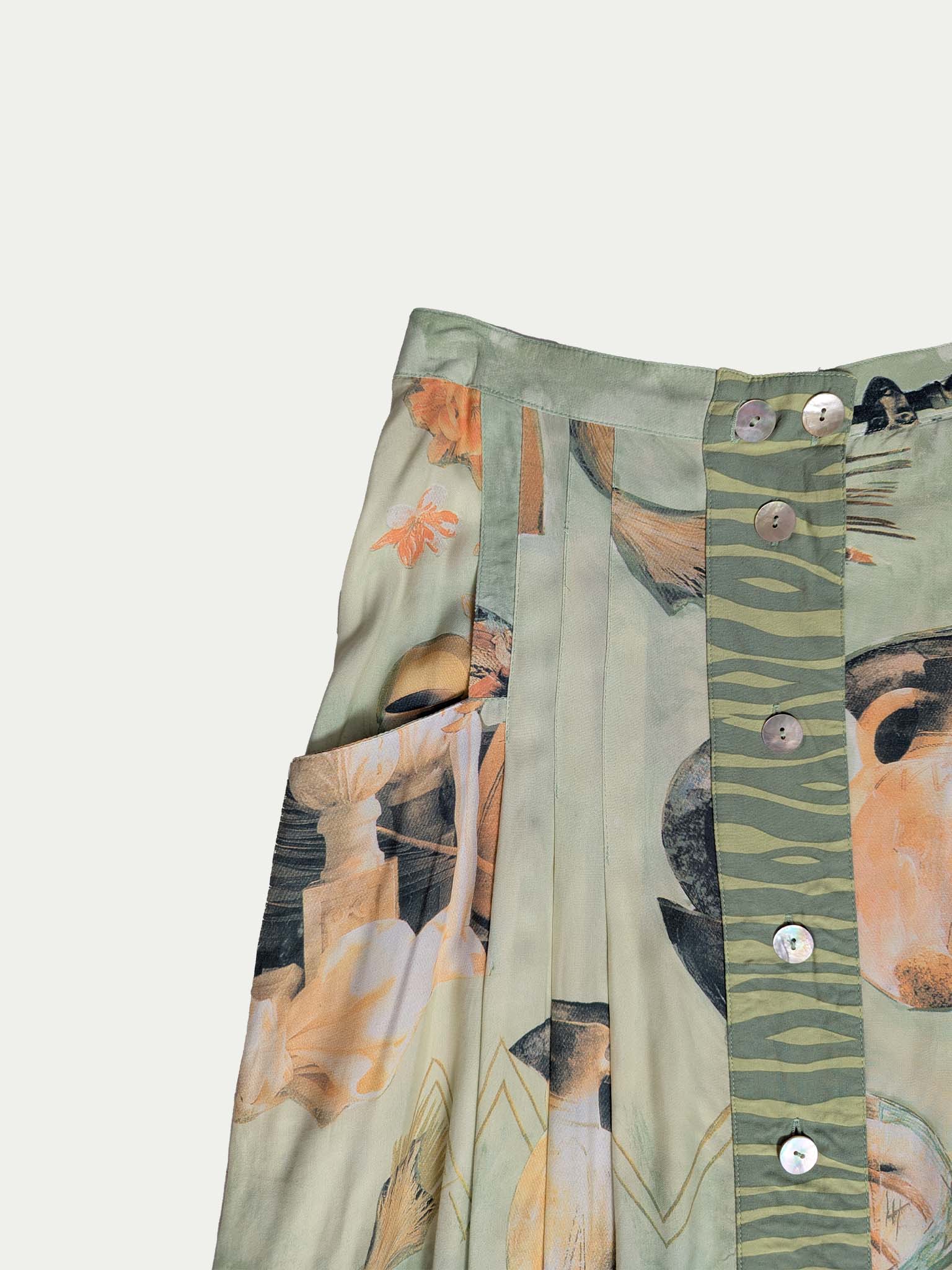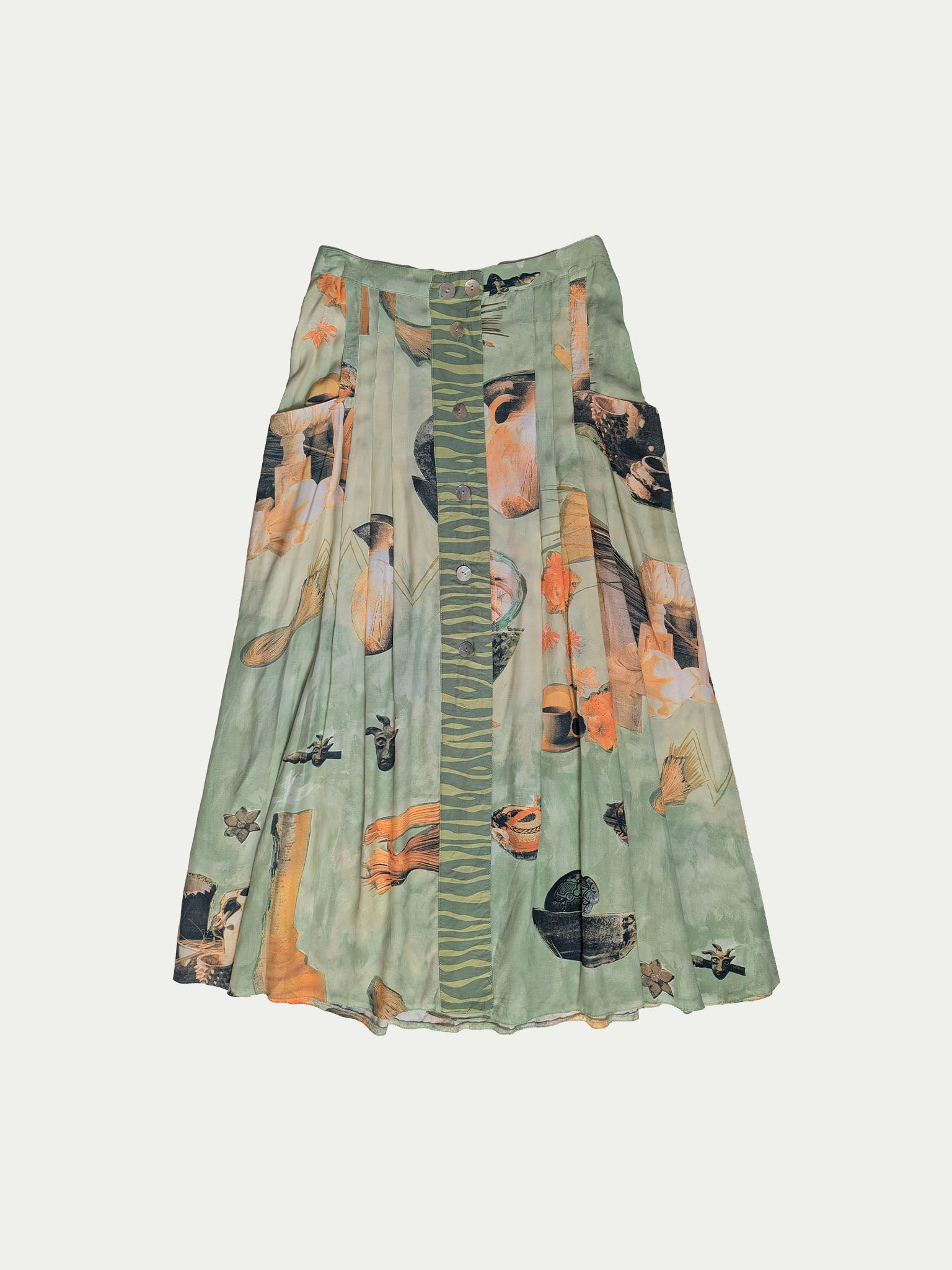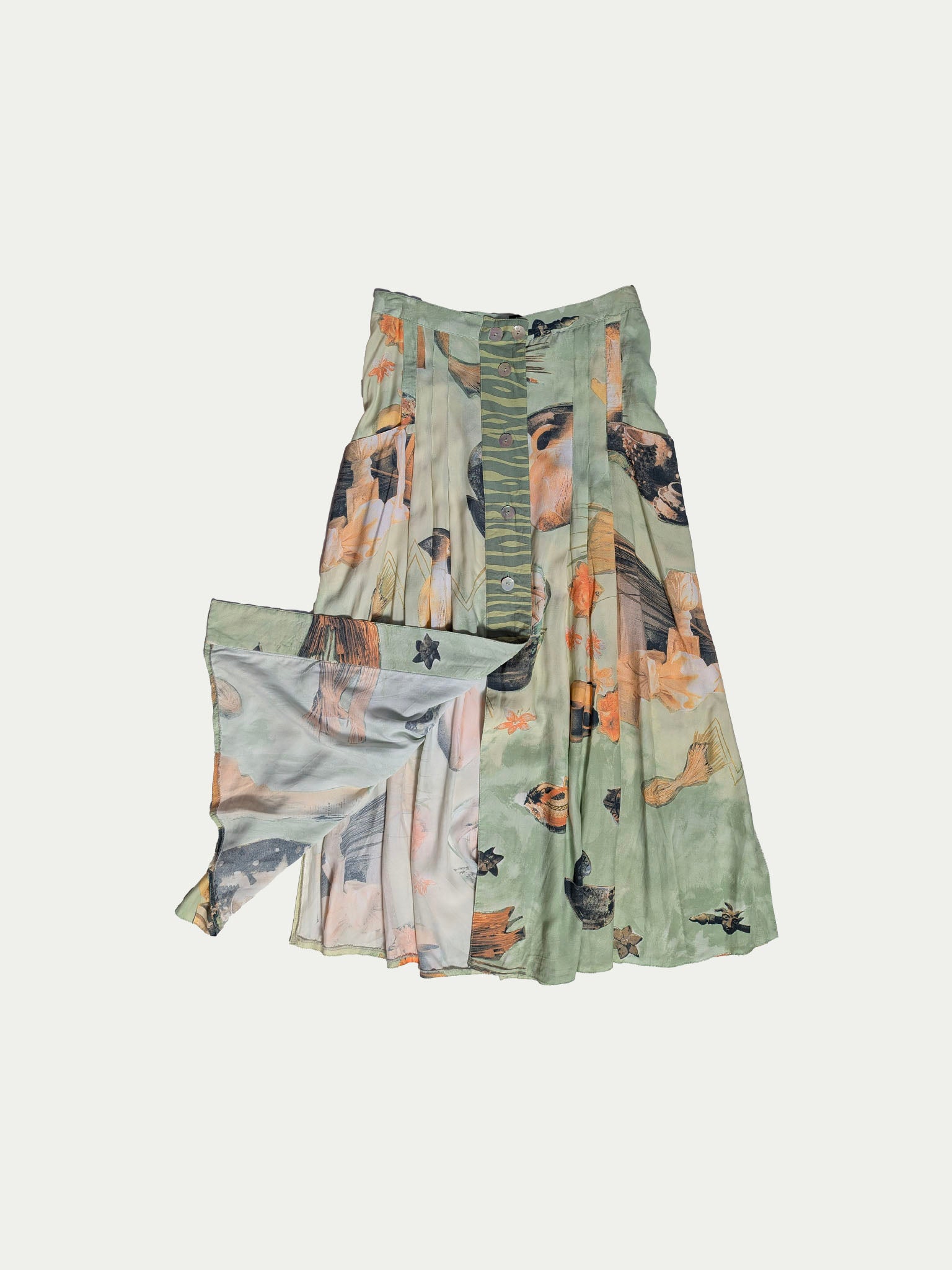 חצאית מקסי קפלים בגזרה גבוהה קלאסית משנות ה-80/90, הכוללת שני כיסים קדמיים, רצועה אמצעית עם הדפס חיות וסגירת כפתורים באורך מלא, ושסעים רחבים בשני הצדדים. מגיעה עם כפתור נוסף. מציגה הדפס של חפץ נדיר, בצבע ירוק מנטה רך ובהיר עם נגיעות כתום-אוקרה עדינות. קלאסי ועל-זמני.
