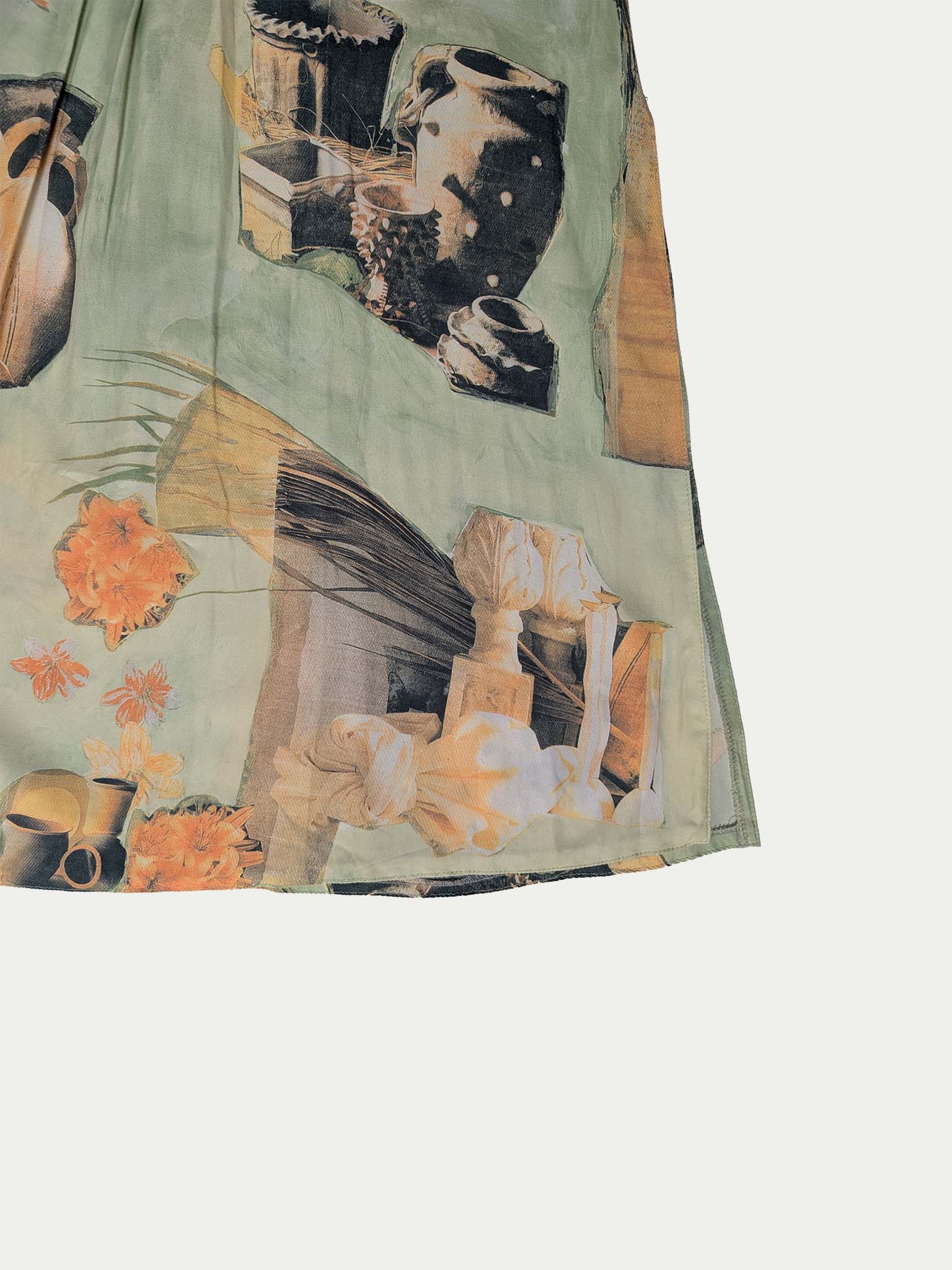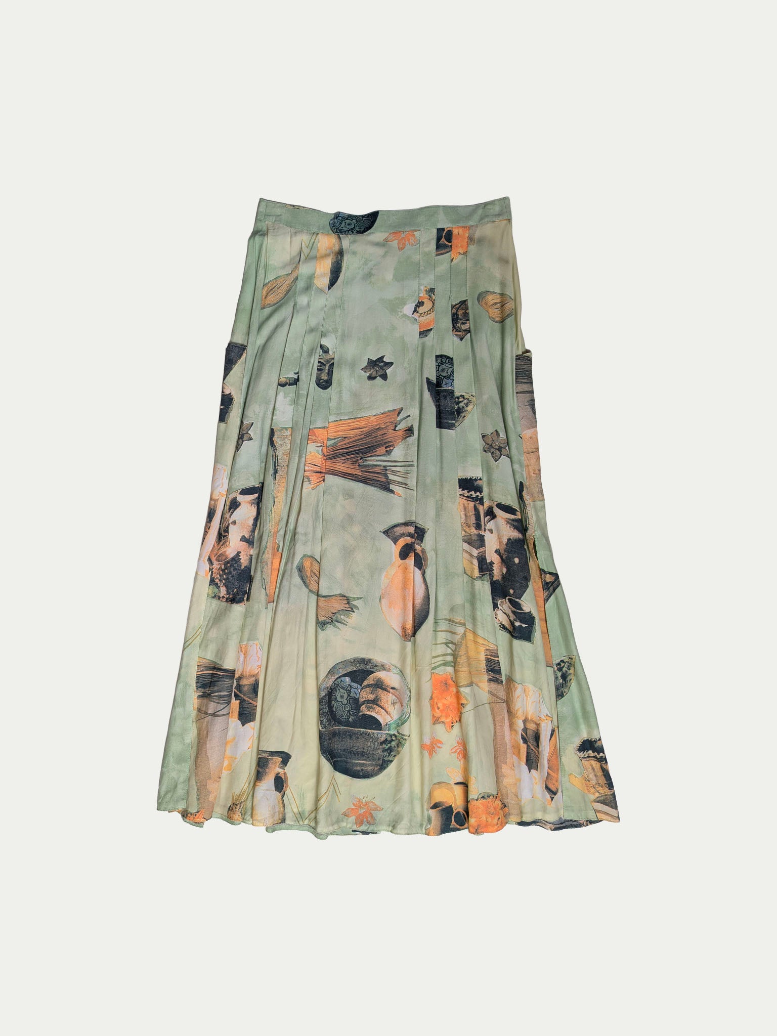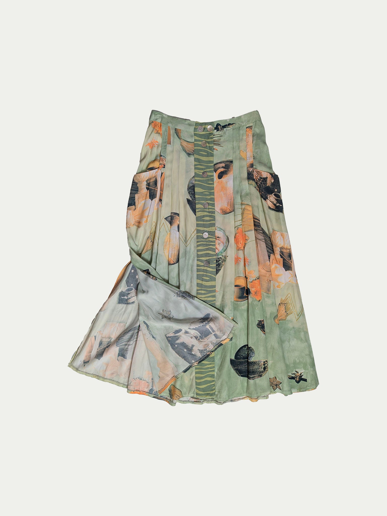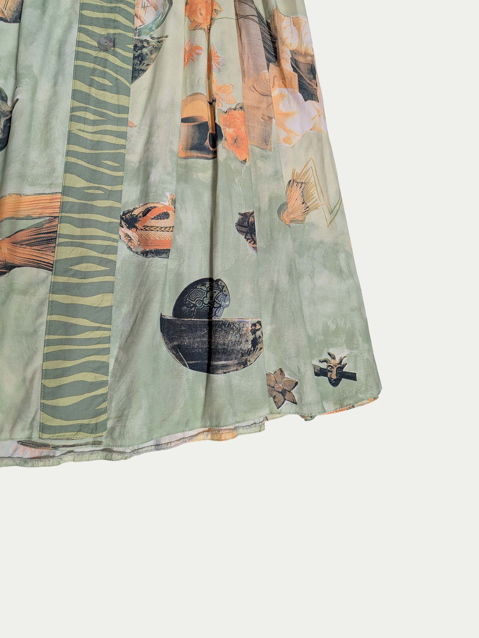 חצאית מקסי קפלים בגזרה גבוהה קלאסית משנות ה-80/90, הכוללת שני כיסים קדמיים, רצועה אמצעית עם הדפס חיות וסגירת כפתורים באורך מלא, ושסעים רחבים בשני הצדדים. מגיעה עם כפתור נוסף. מציגה הדפס של חפץ נדיר, בצבע ירוק מנטה רך ובהיר עם נגיעות כתום-אוקרה עדינות. קלאסי ועל-זמני.