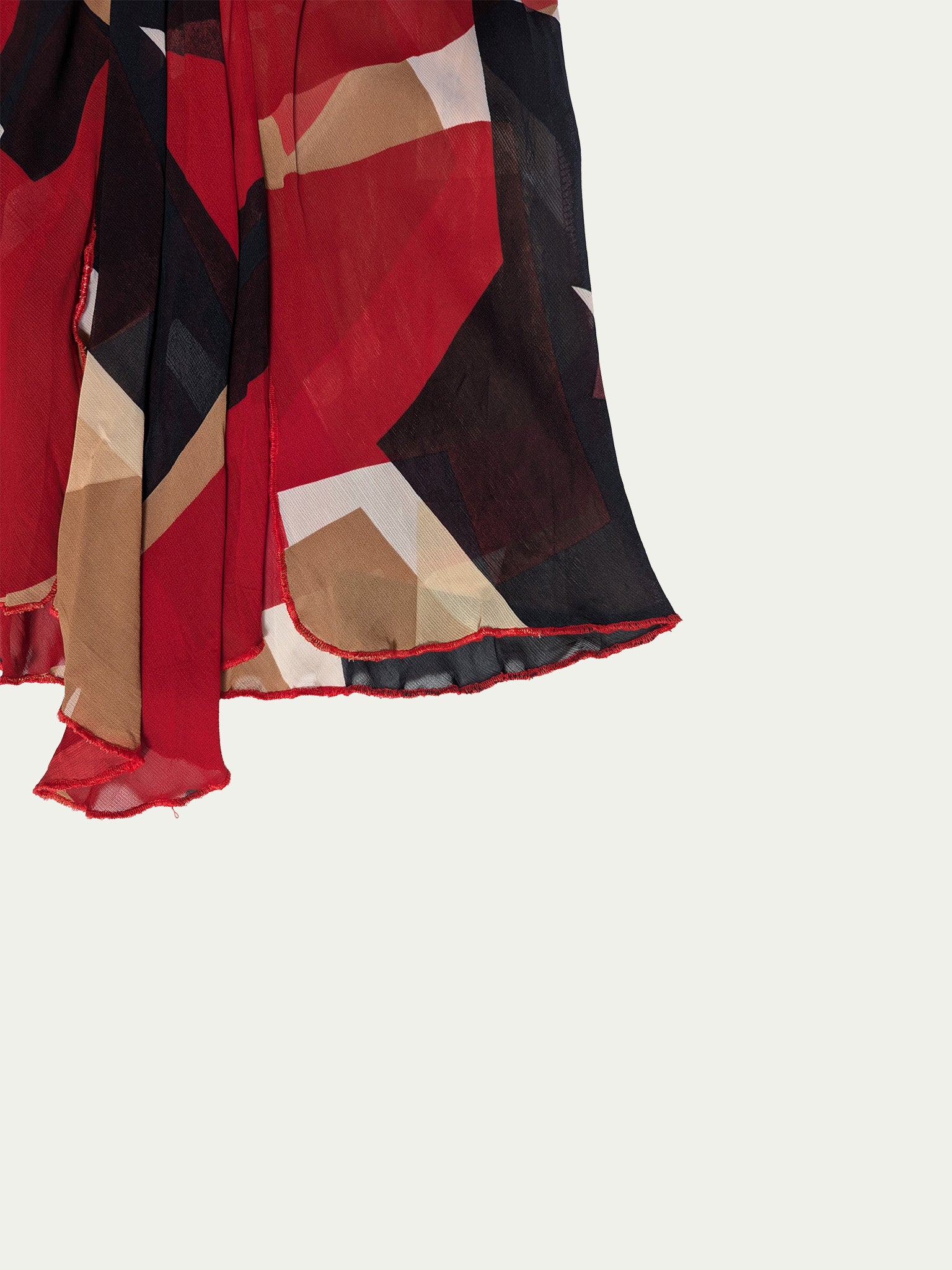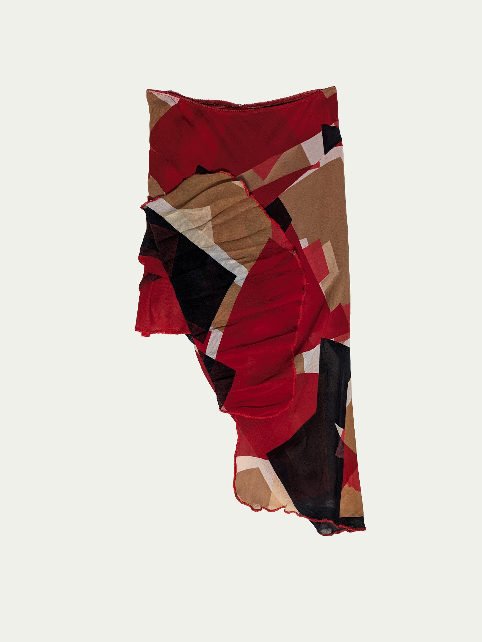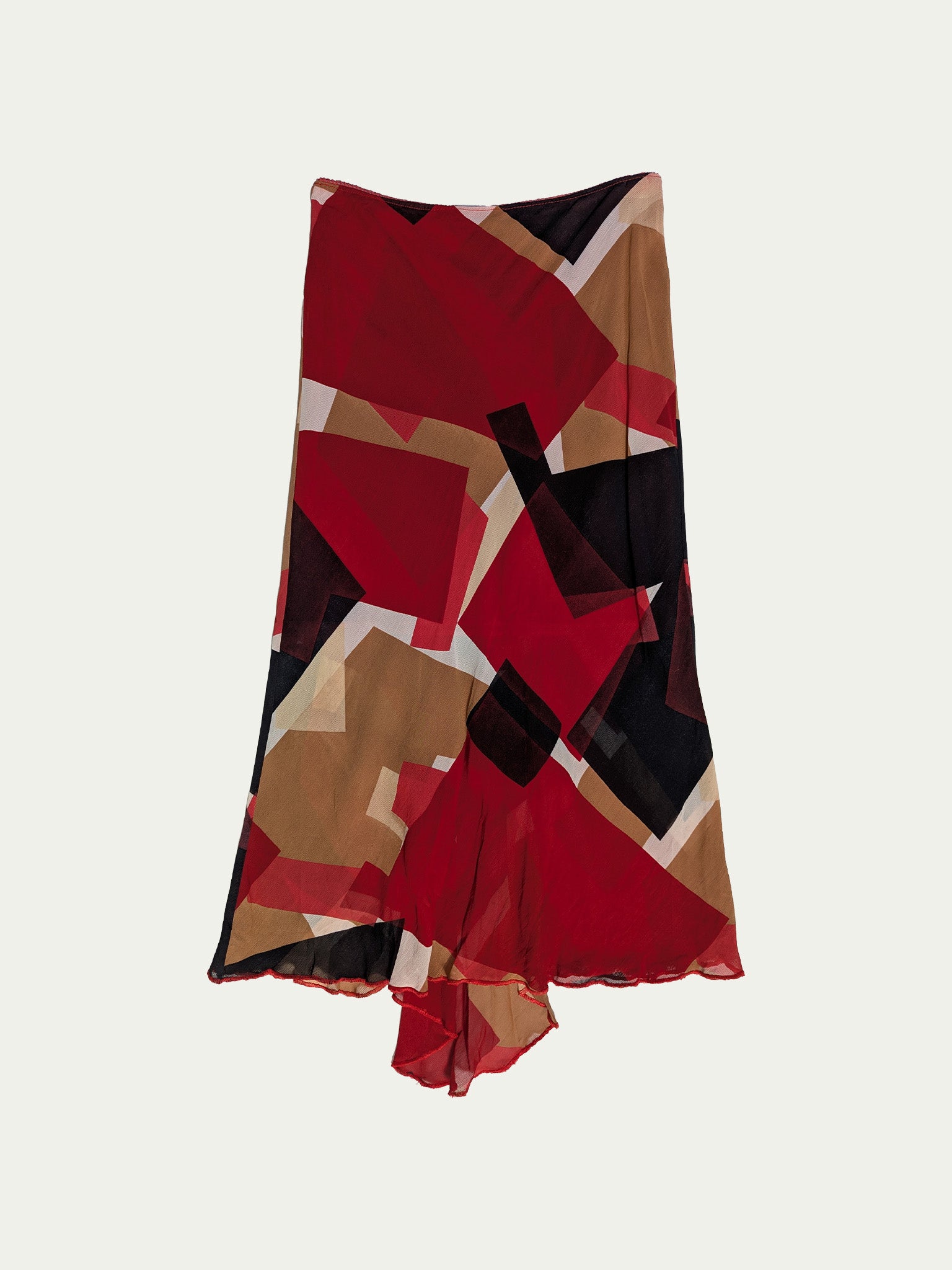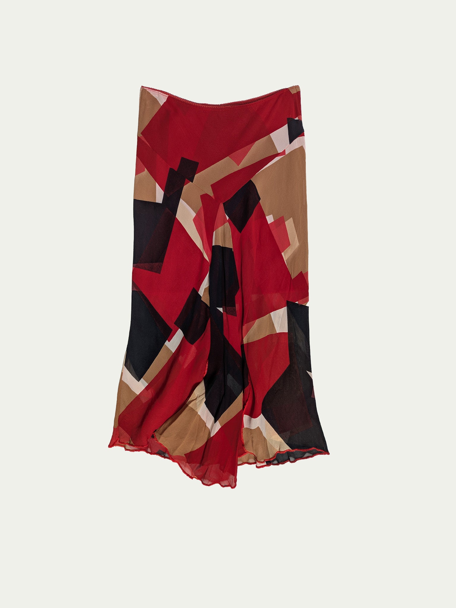 חצאית מידי בסגנון Y2K, עם הדפס גיאומטרי מופשט בצבעי בורדו, חום בהיר ושחור.