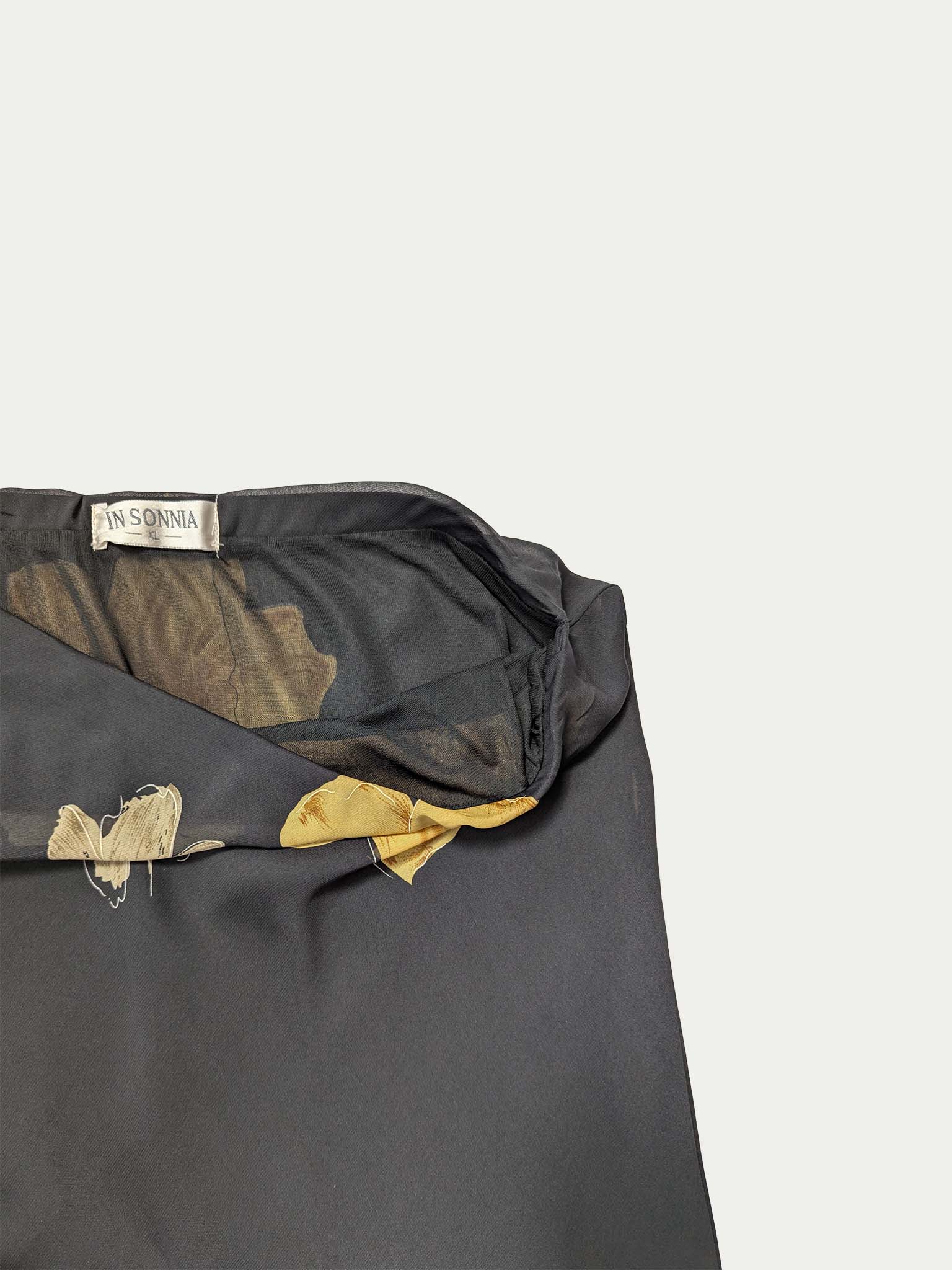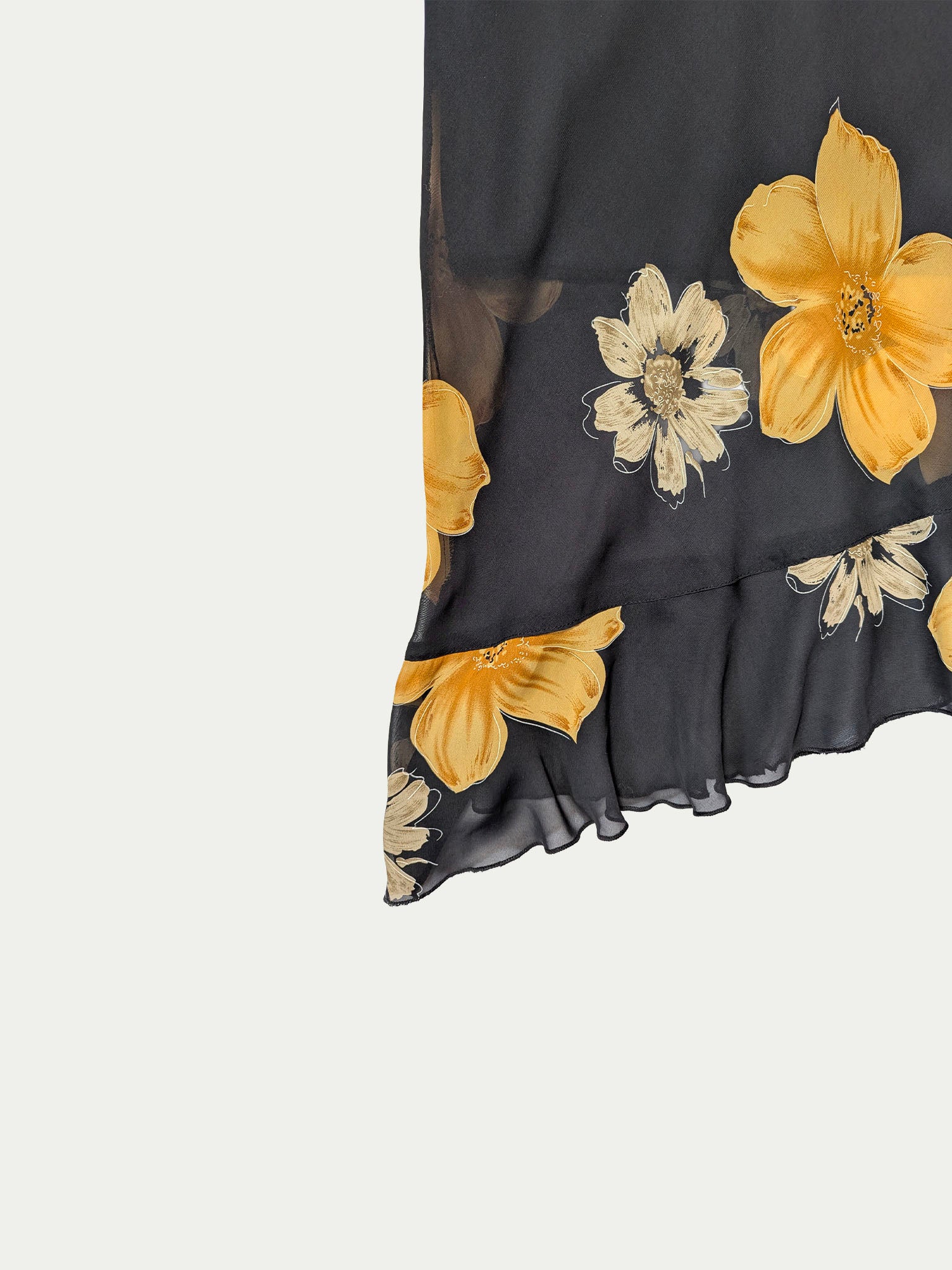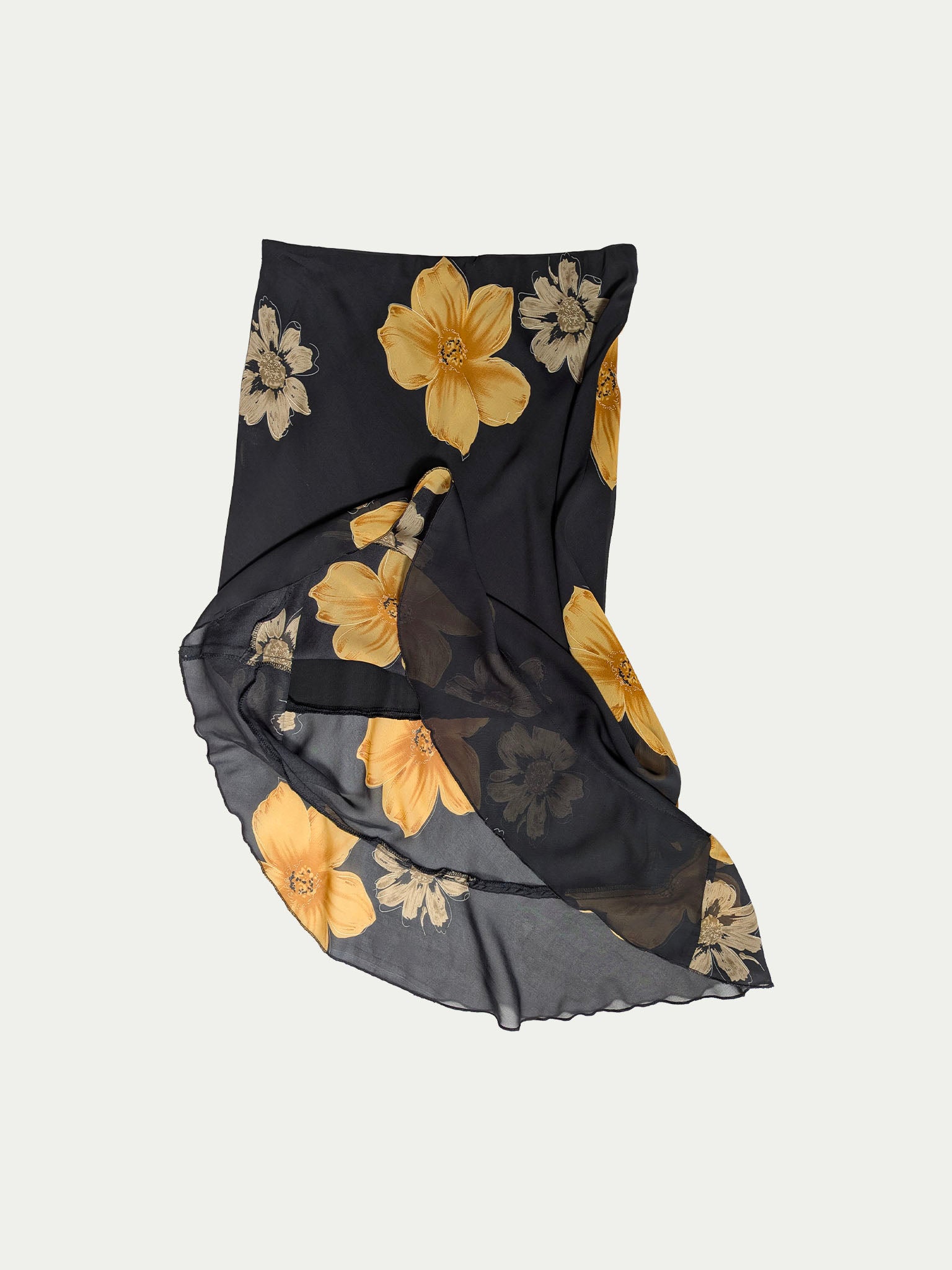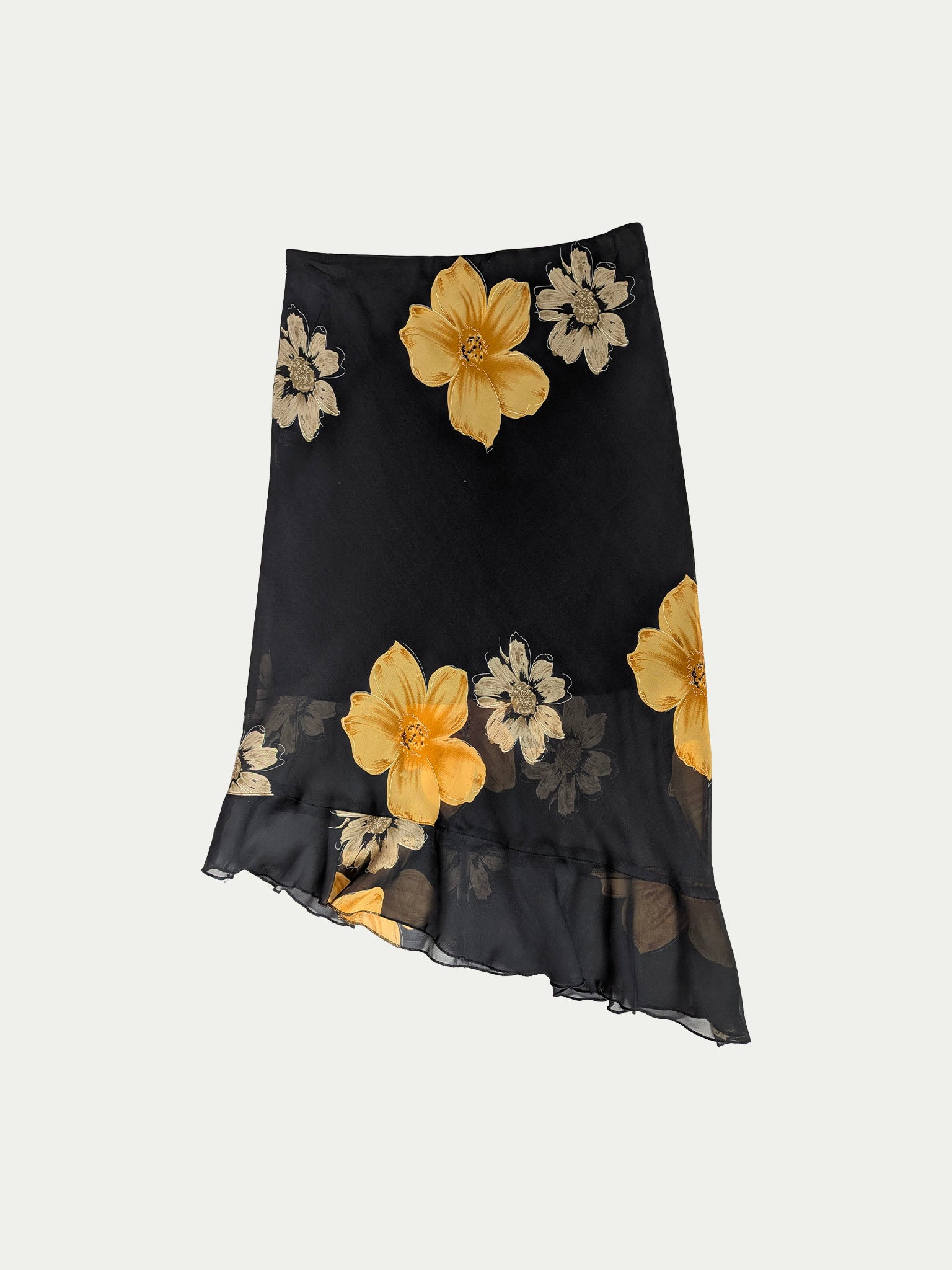 חצאית מידי מסוף שנות ה-90 עם מכפלת מקושטת אלכסונית וגומי במותן. עשויה משיפון שקוף מעט, חלקית סינתטי, עם בטנה, עם הדפס פרחוני צהבהב על רקע שחור.