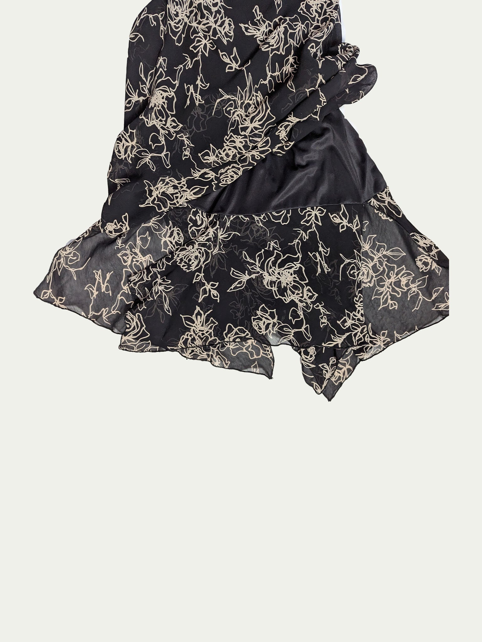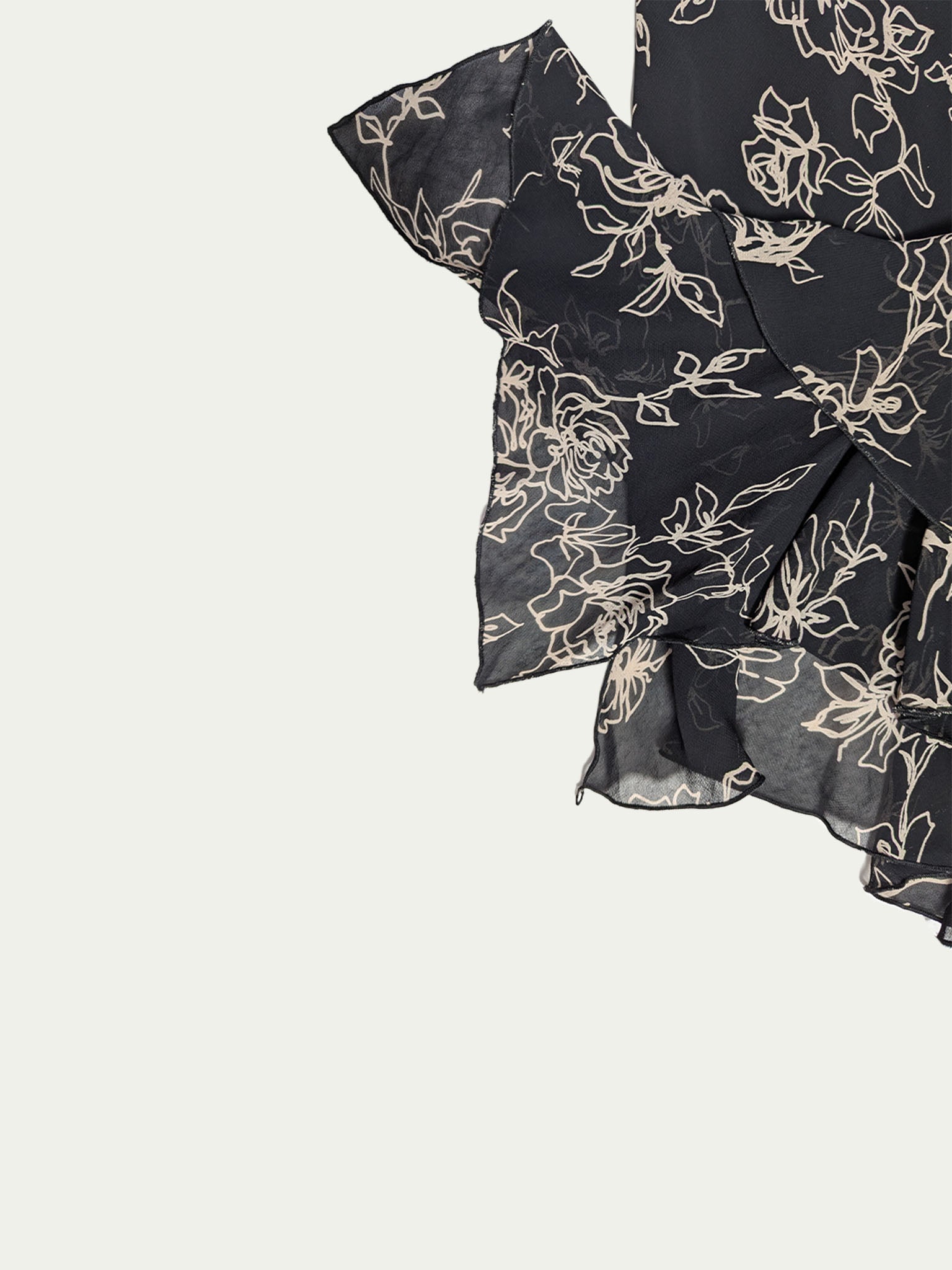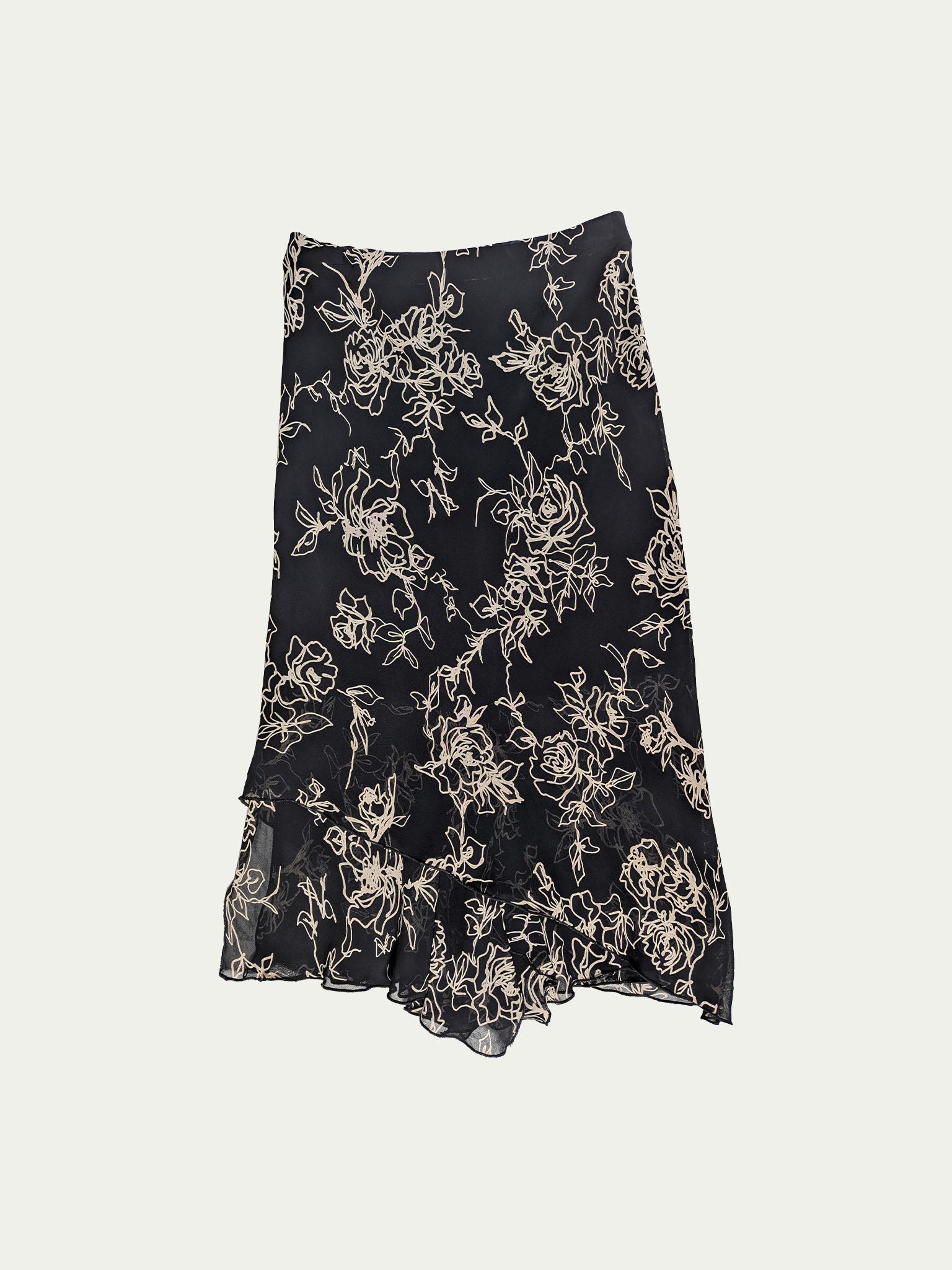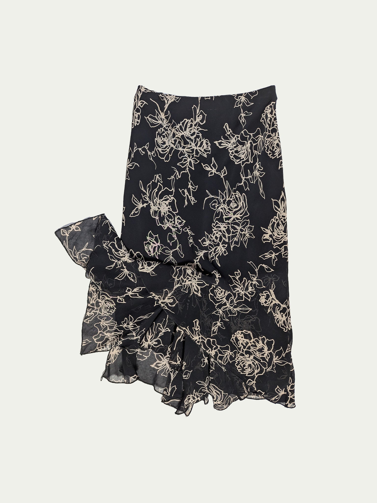 חצאית מידי-מקסי בסגנון Y2K, עם דוגמת פרחים בשחור-לבן, וכמה שכבות א-סימטריות ומקושטות, היוצרות צורת מכפלת ייחודית.