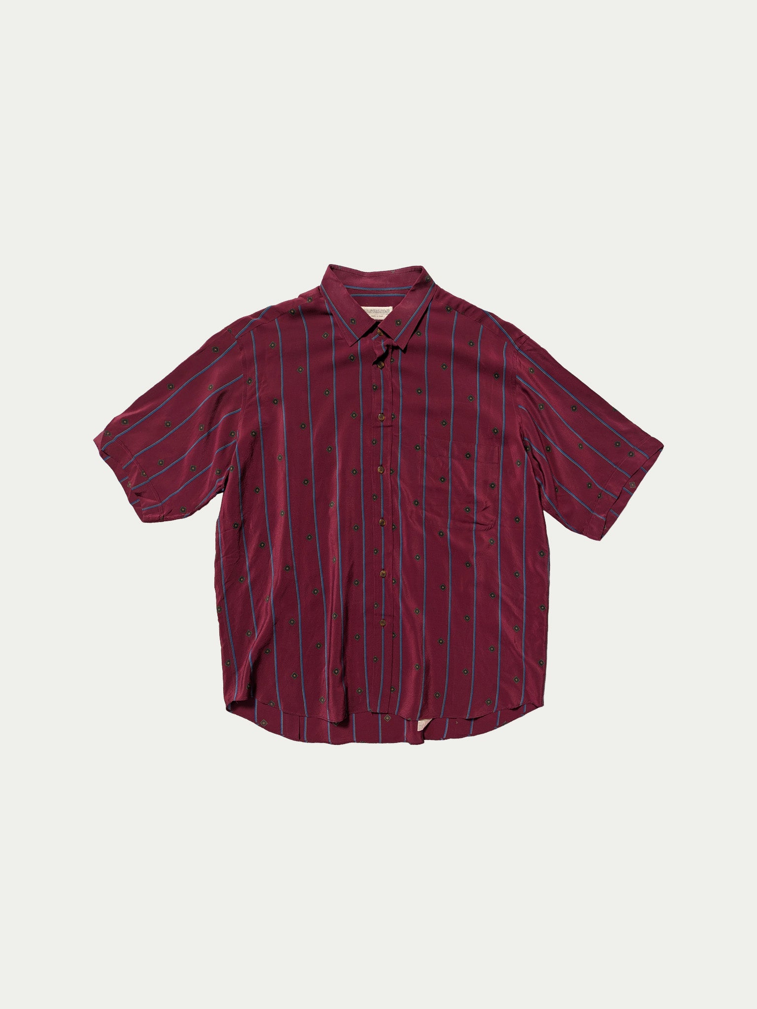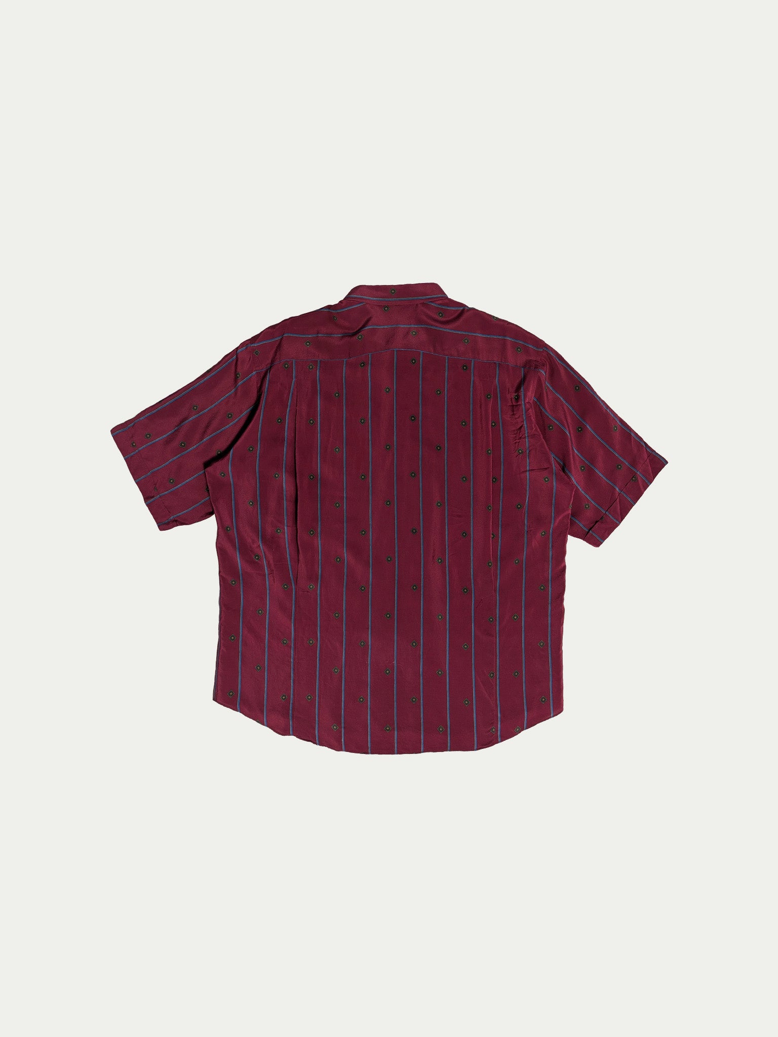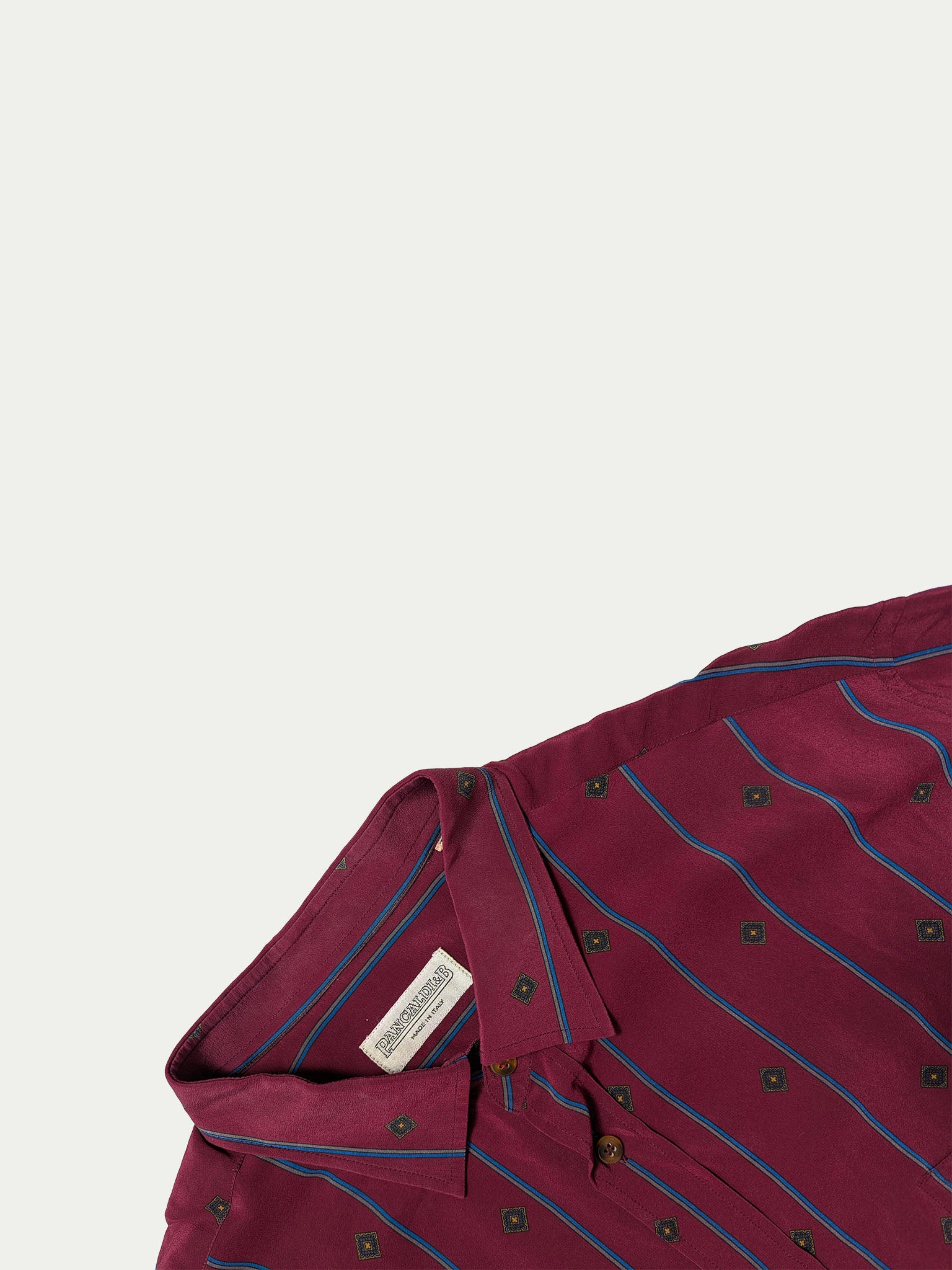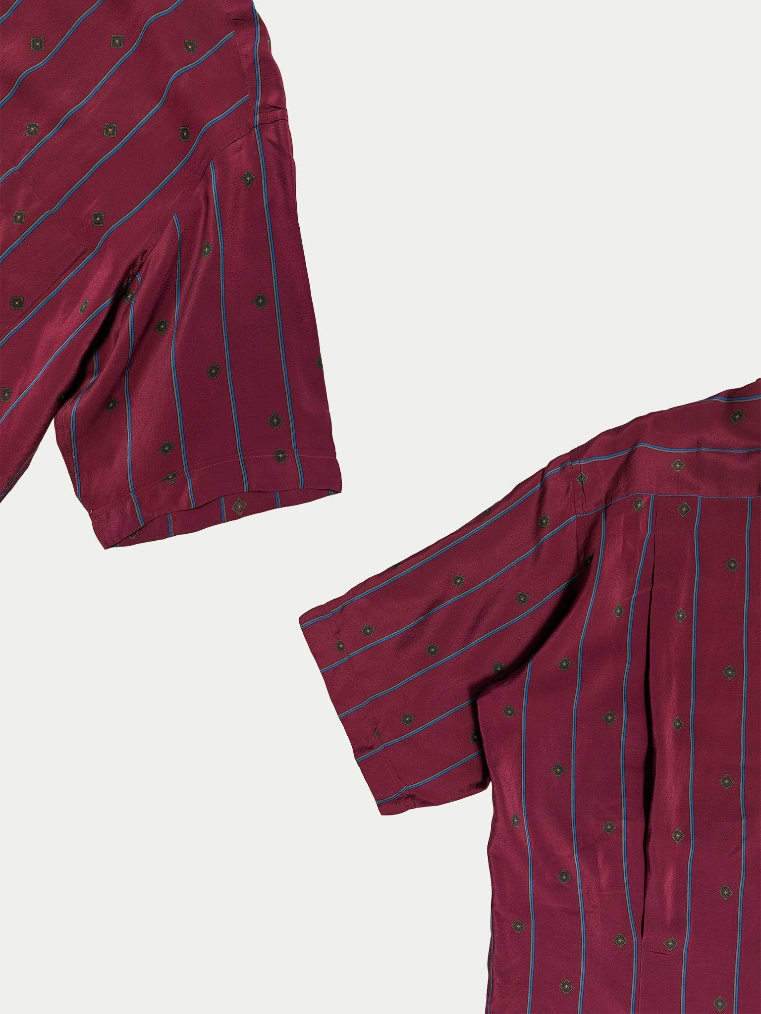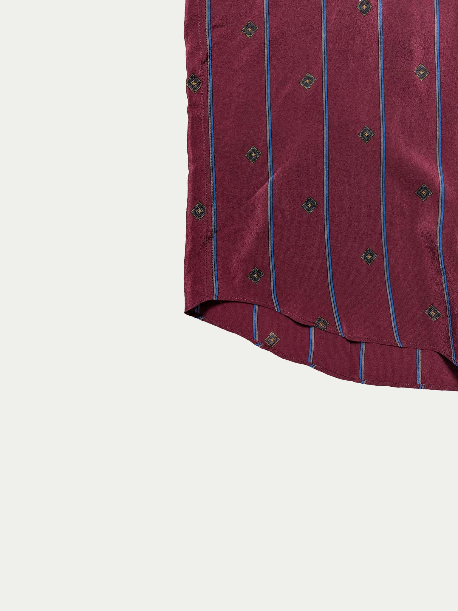 חולצת משי בצבע בורדו לגברים, מודפסת משנות ה-90, הכוללת כיס קדמי, קפלים ייחודיים בגב ומכפלת מעוגלת מעט.