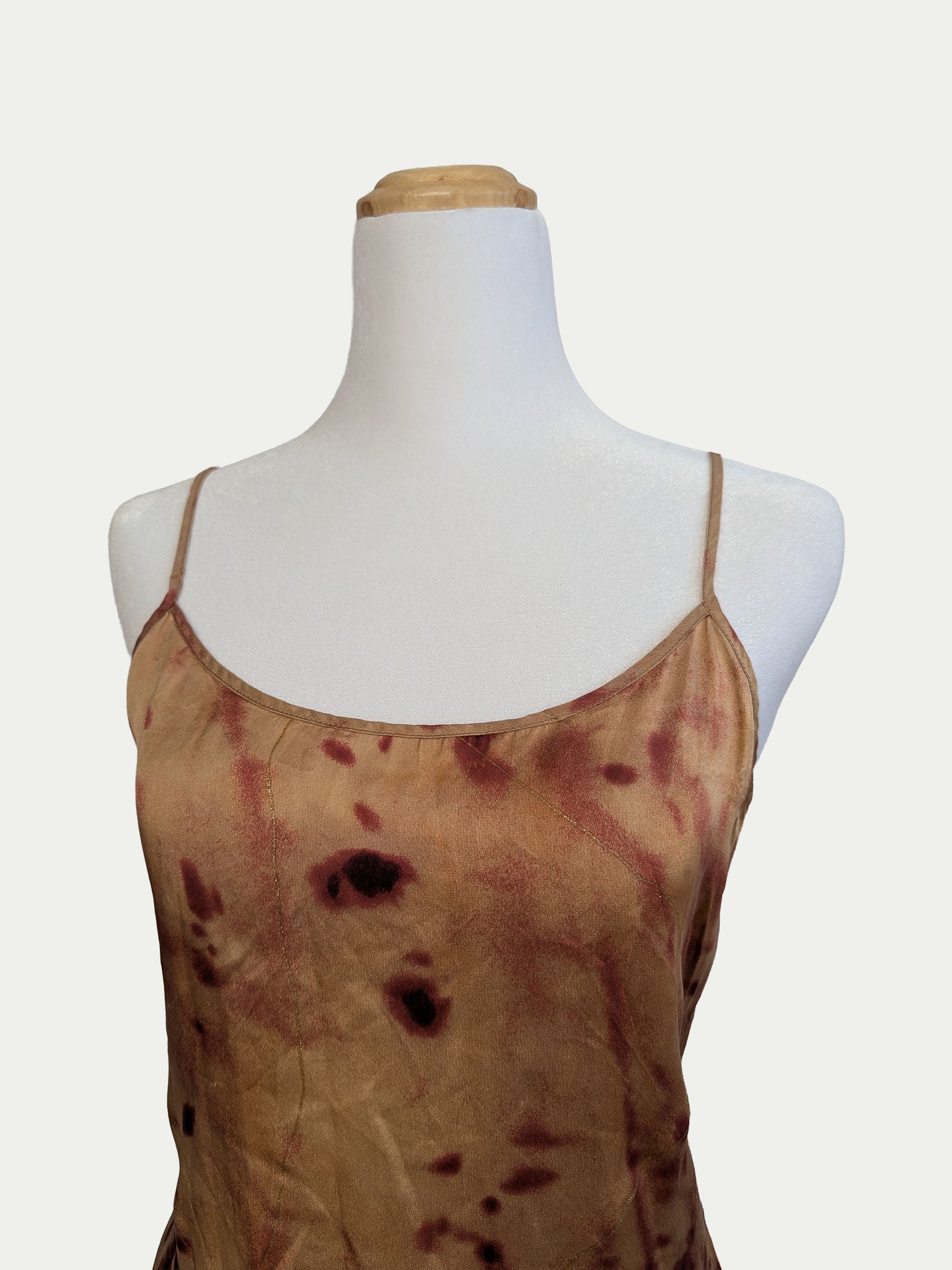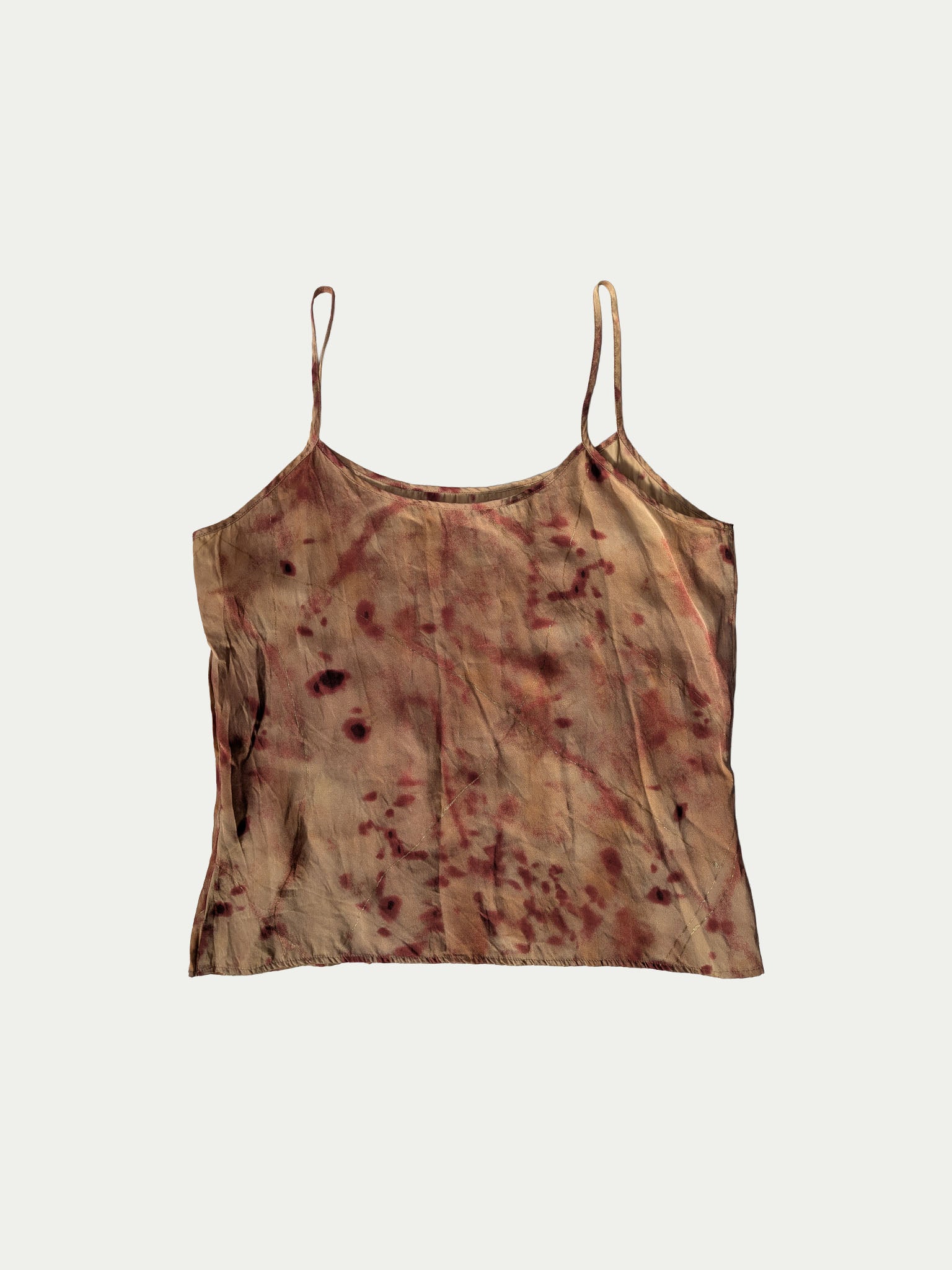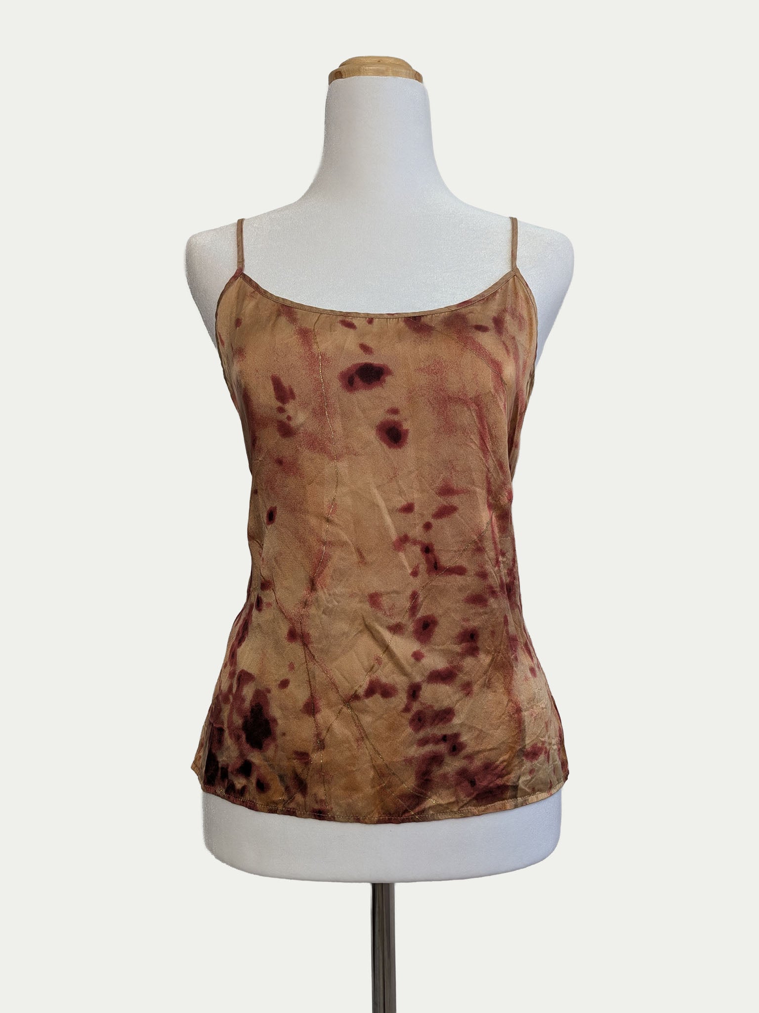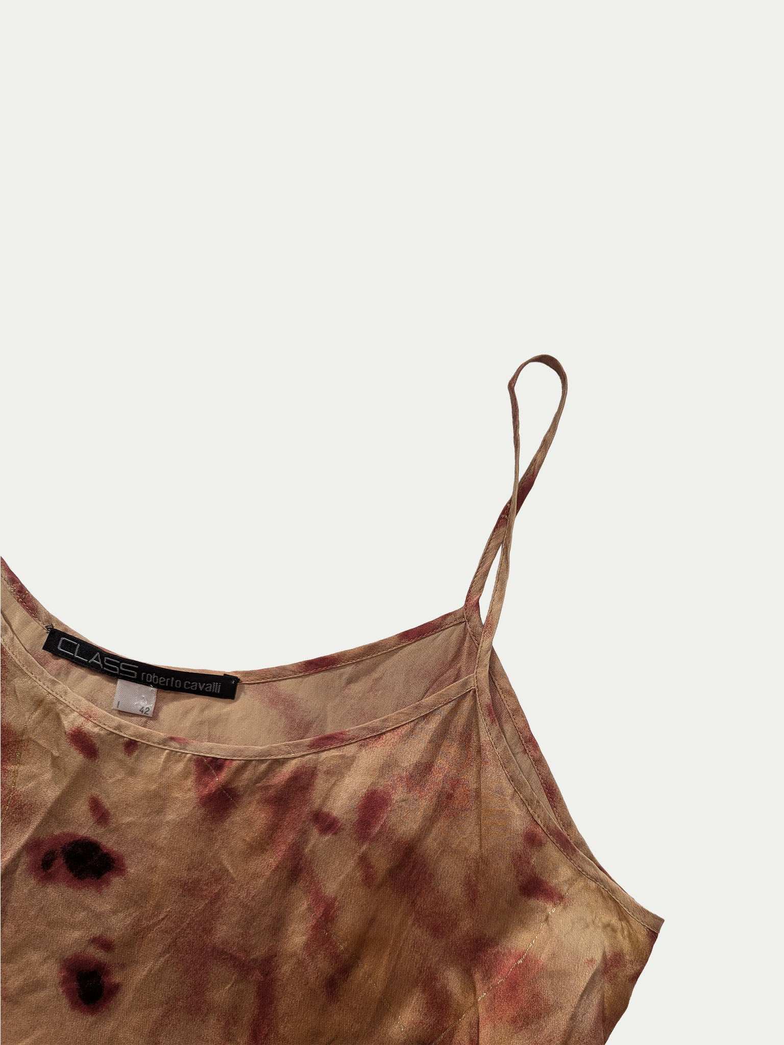גופיית משי של רוברטו קוואלי , עם הדפס מקורי בסגנון טאי-דאי בגווני זהב ובורדו, ומעוטר בפסים עדינים של זהב לכל אורכו. קלילה, זורמת ואלגנטית.