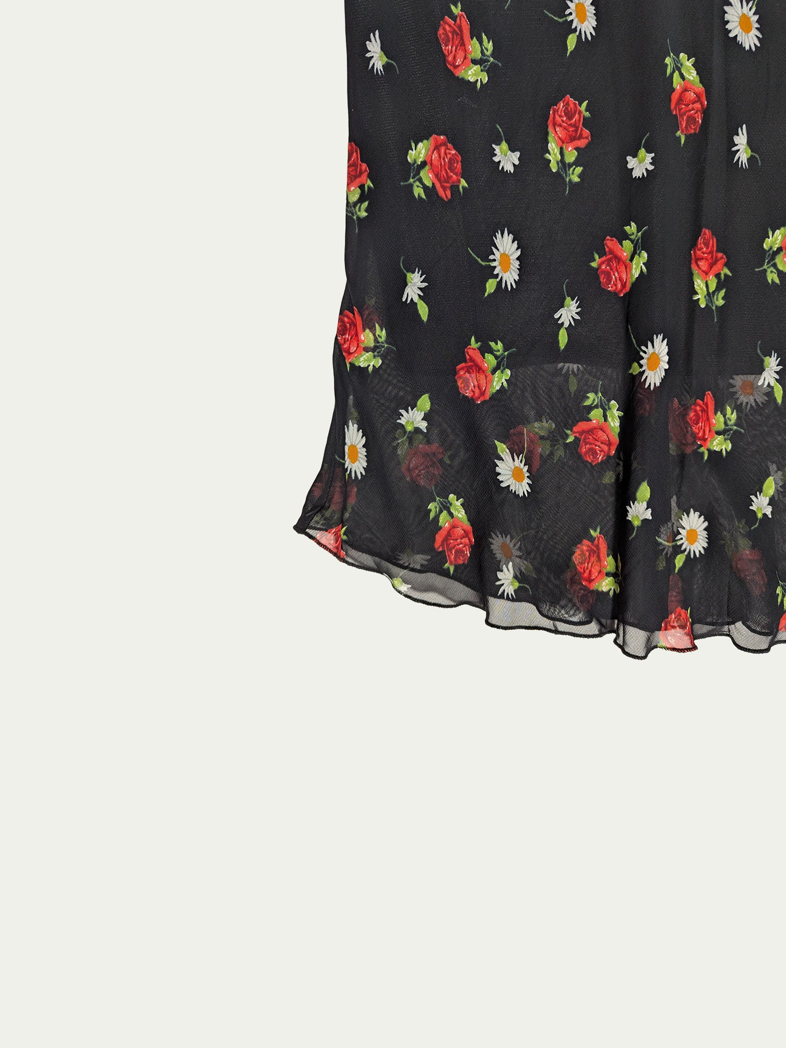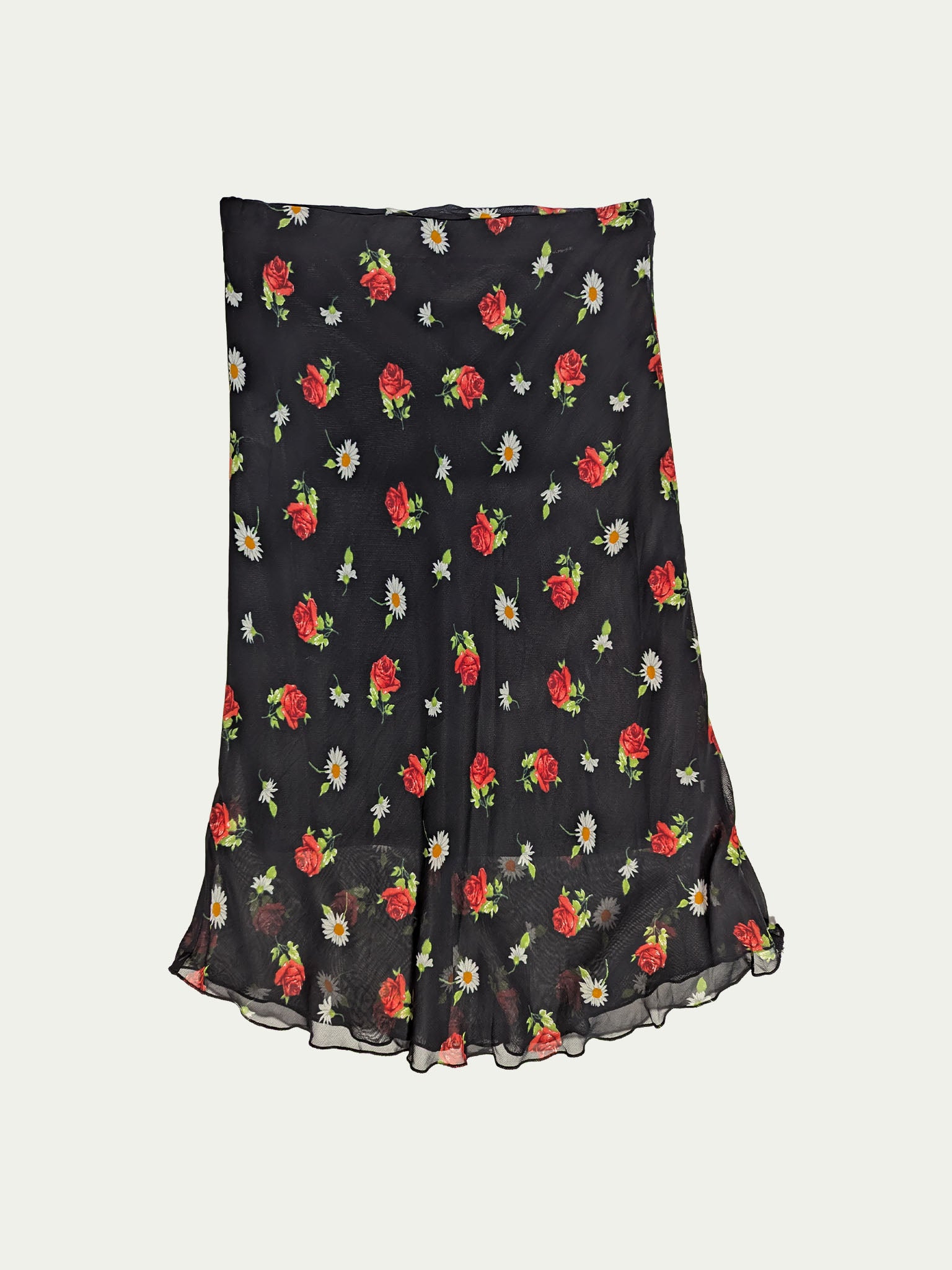חצאית מידי-מקסי משנות ה-90, שחורה עם דוגמת פרחים קטנים.
