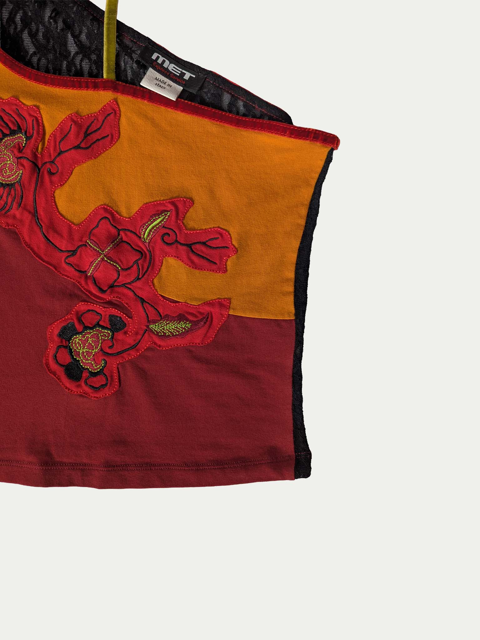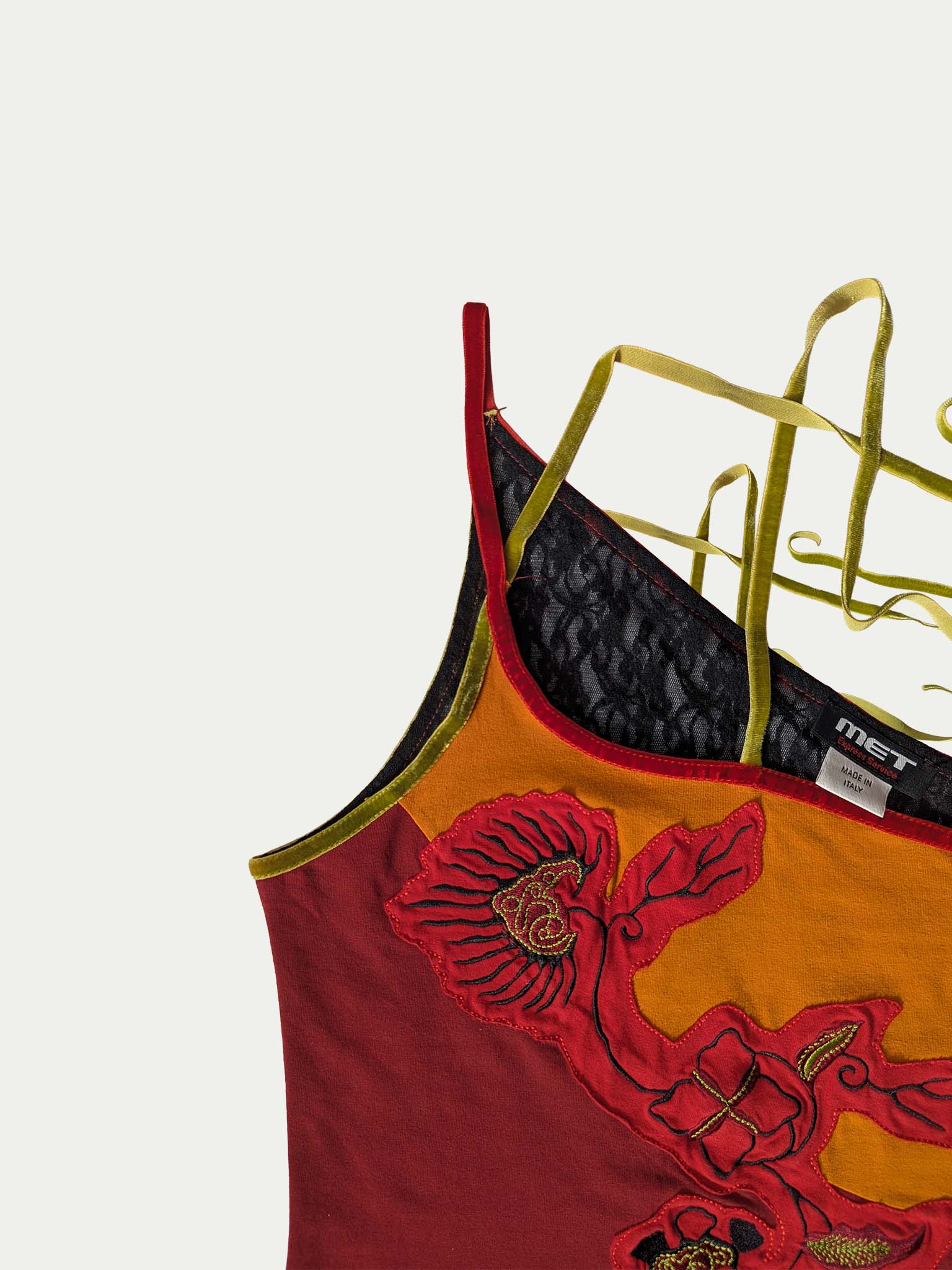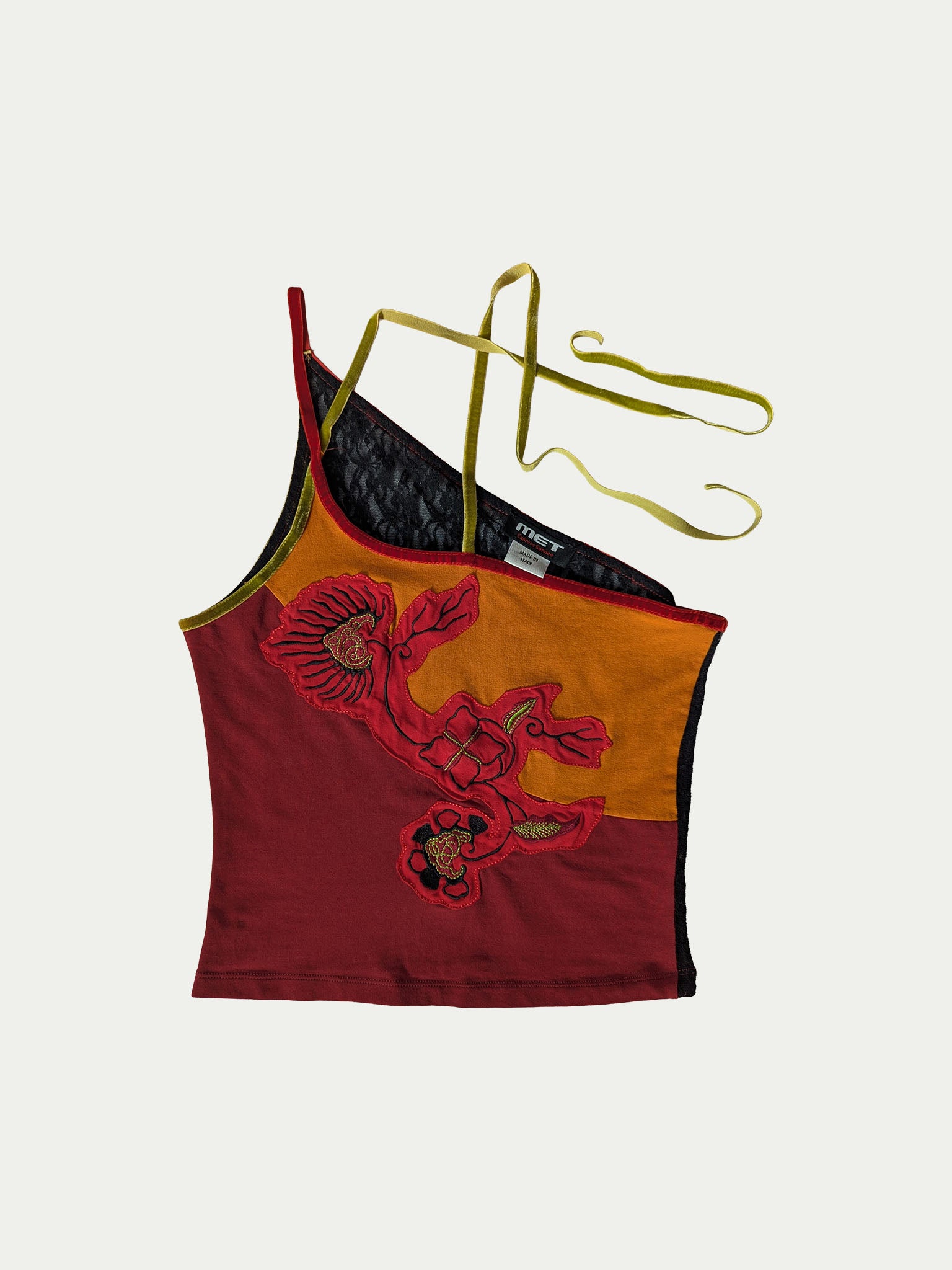 גופייה קרופ משנות ה-90 עם עבודות טלאים ופרטים רקומים, גב תחרה מלא וקשירה א-סימטרית לצווארון. גוונים לוהטים עם נגיעה ירוקה פאנקית ורצועות קטיפתיות.