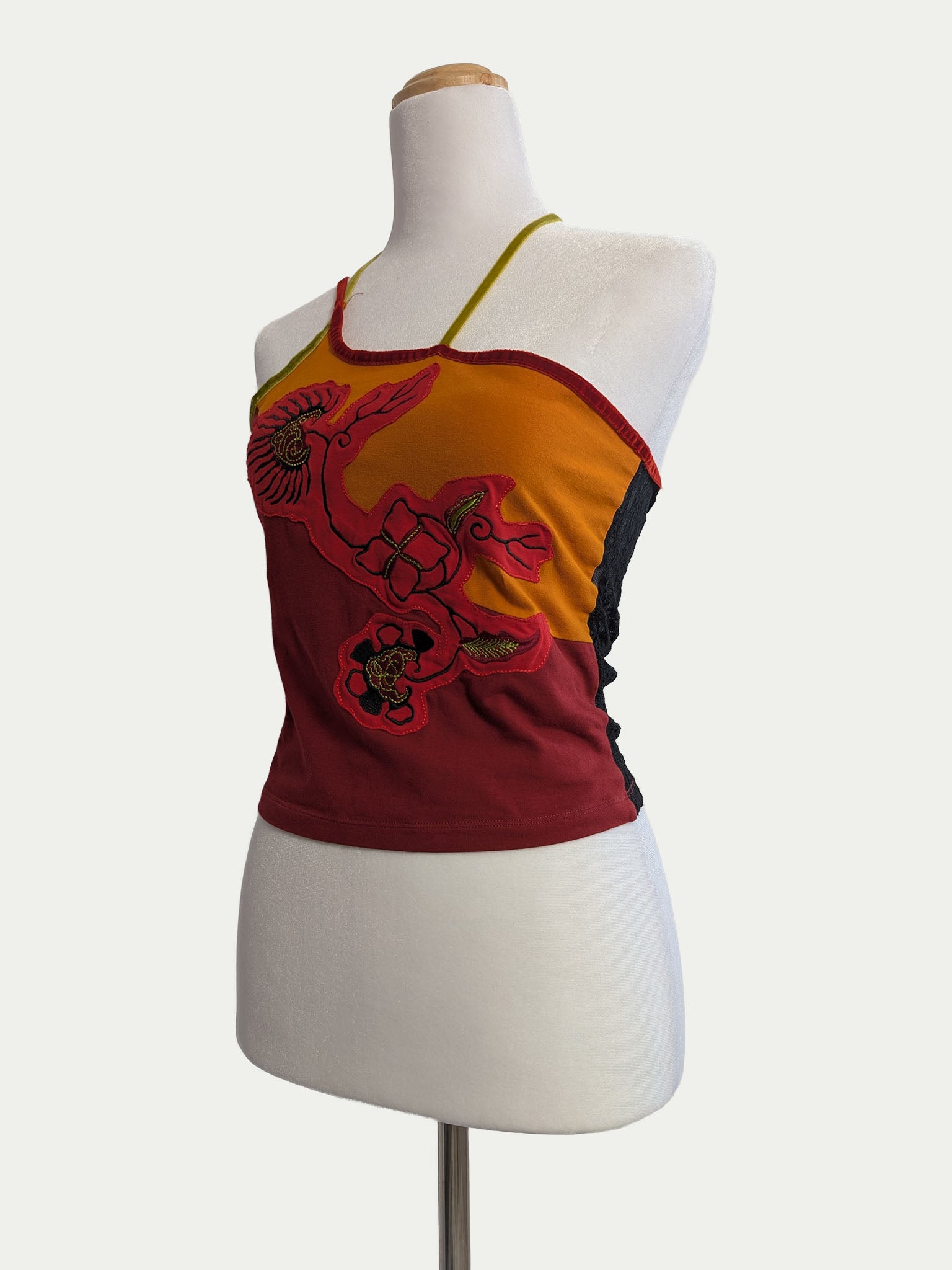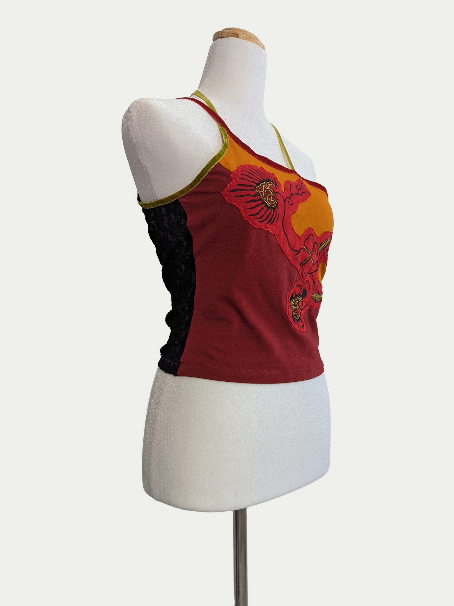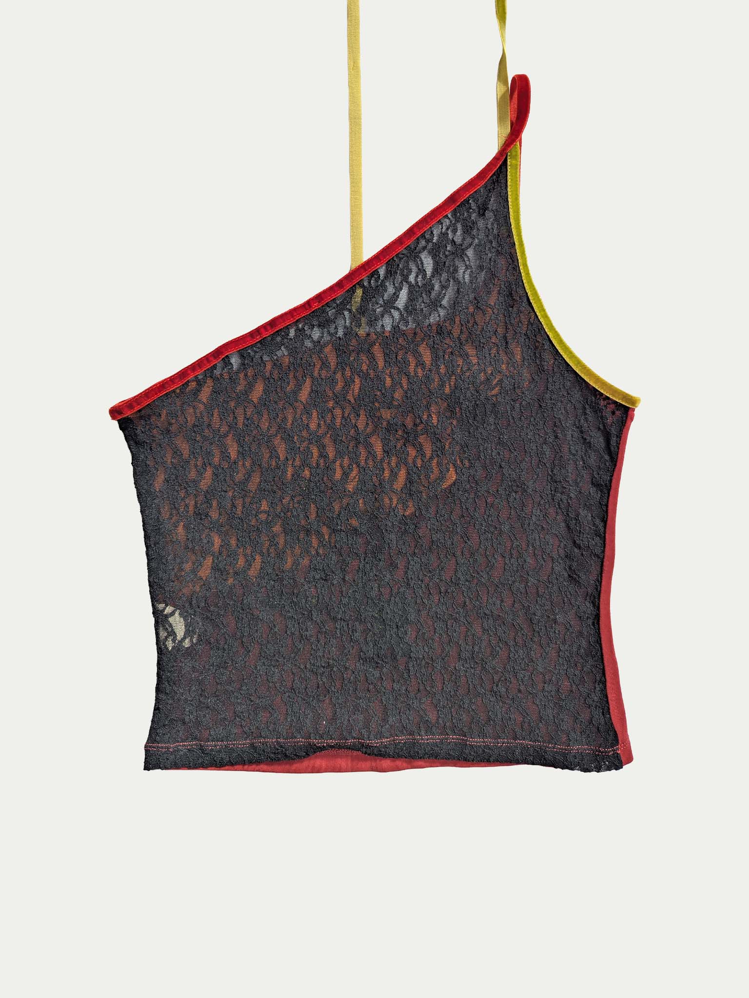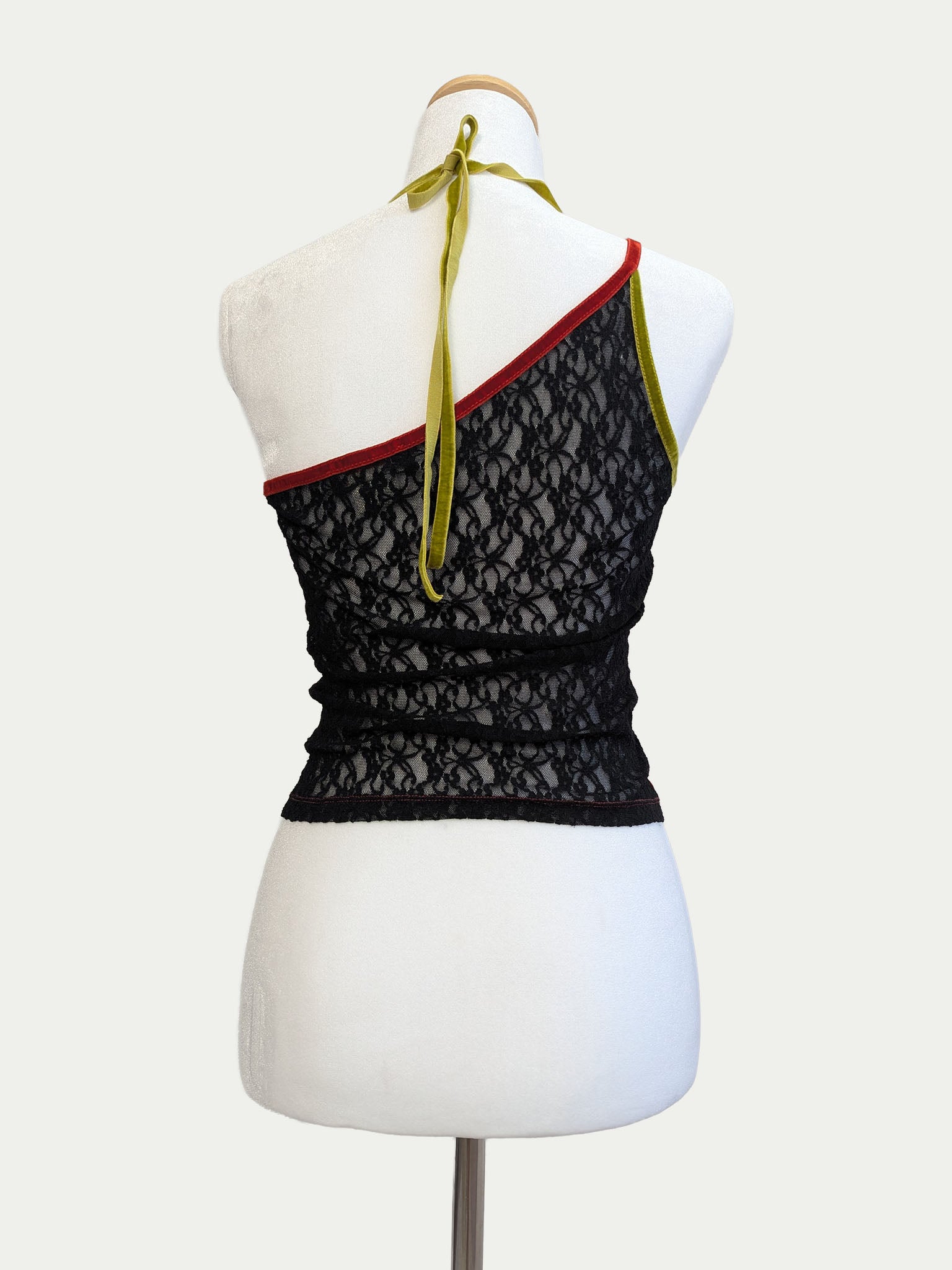 גופייה קרופ משנות ה-90 עם עבודות טלאים ופרטים רקומים, גב תחרה מלא וקשירה א-סימטרית לצווארון. גוונים לוהטים עם נגיעה ירוקה פאנקית ורצועות קטיפתיות.