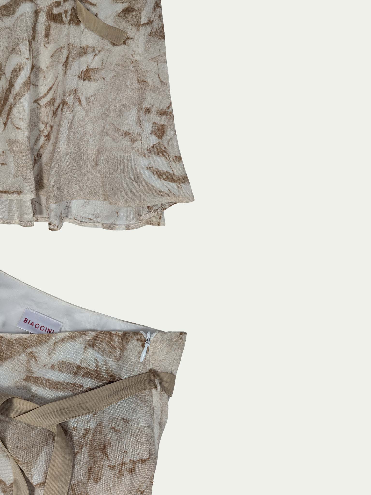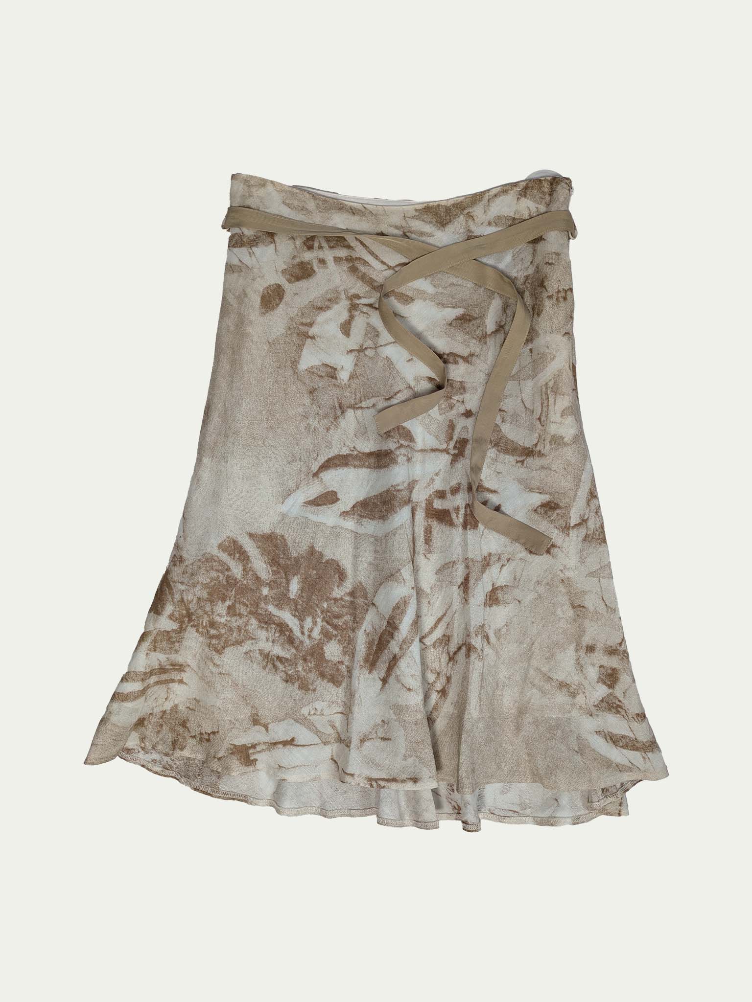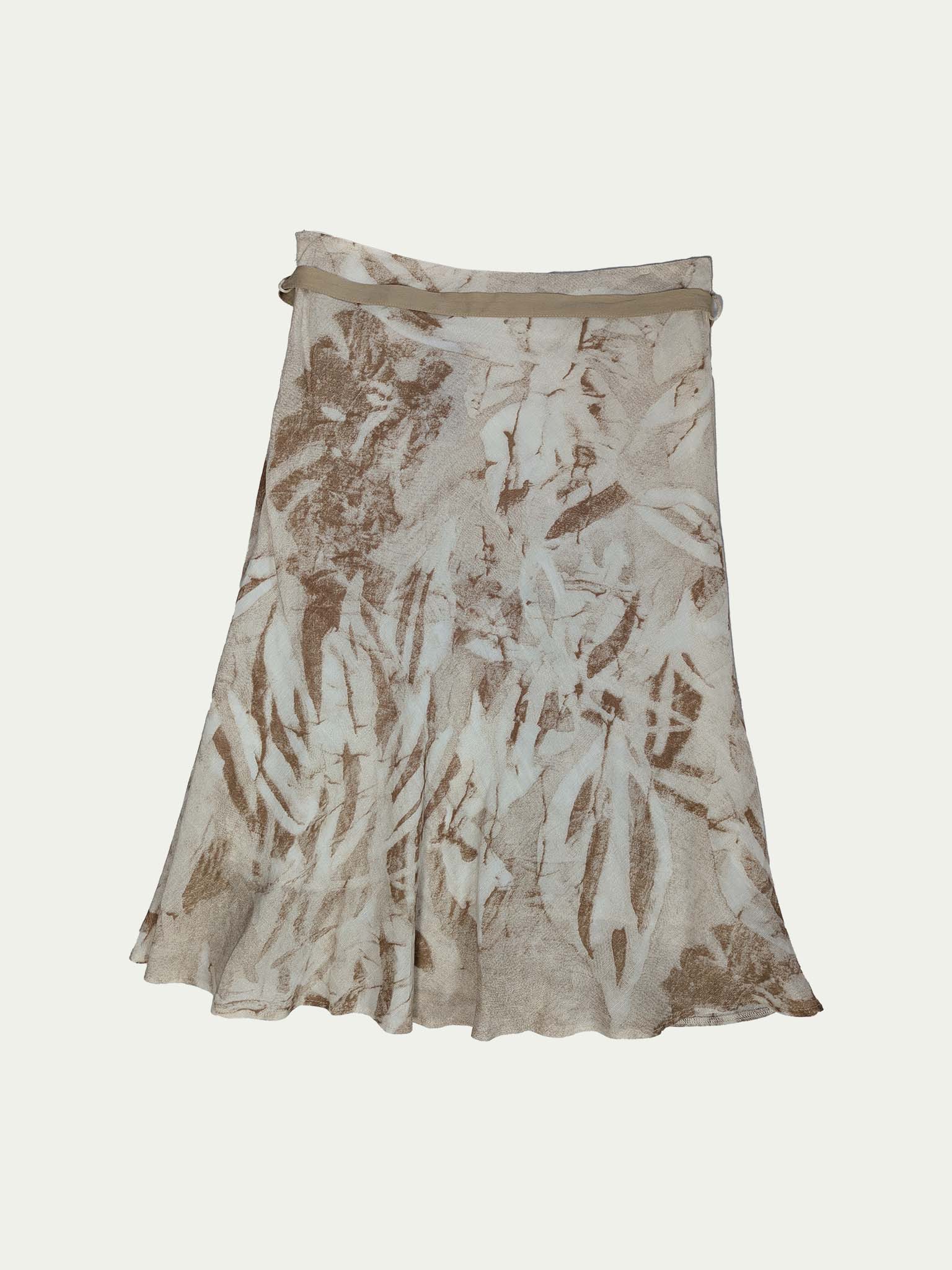 חצאית מידי מבד פשתן וויסקוזה של Y2K, קלילה מאוד ושקופה מעט, עם בטנה לבנה אטומה.