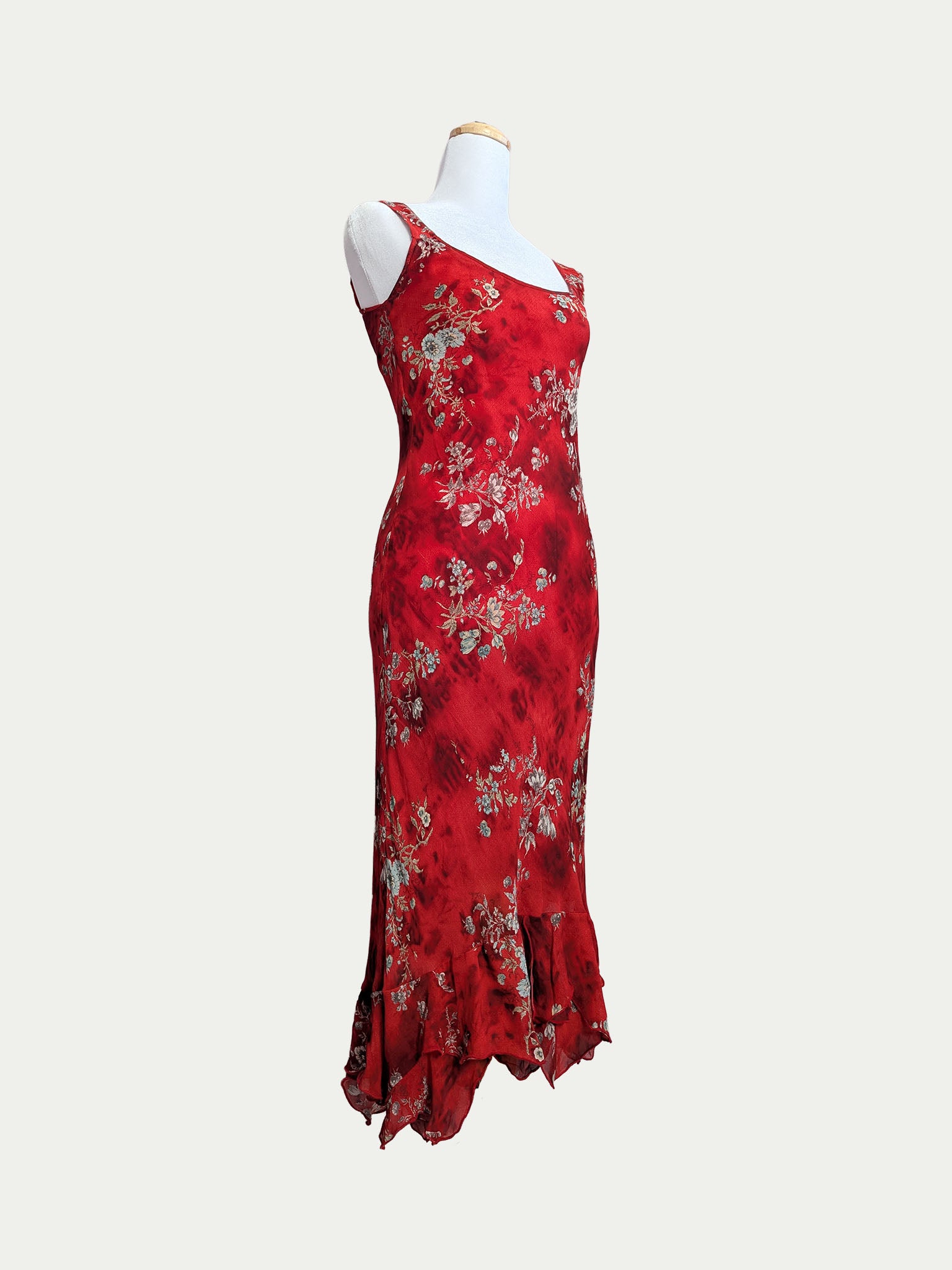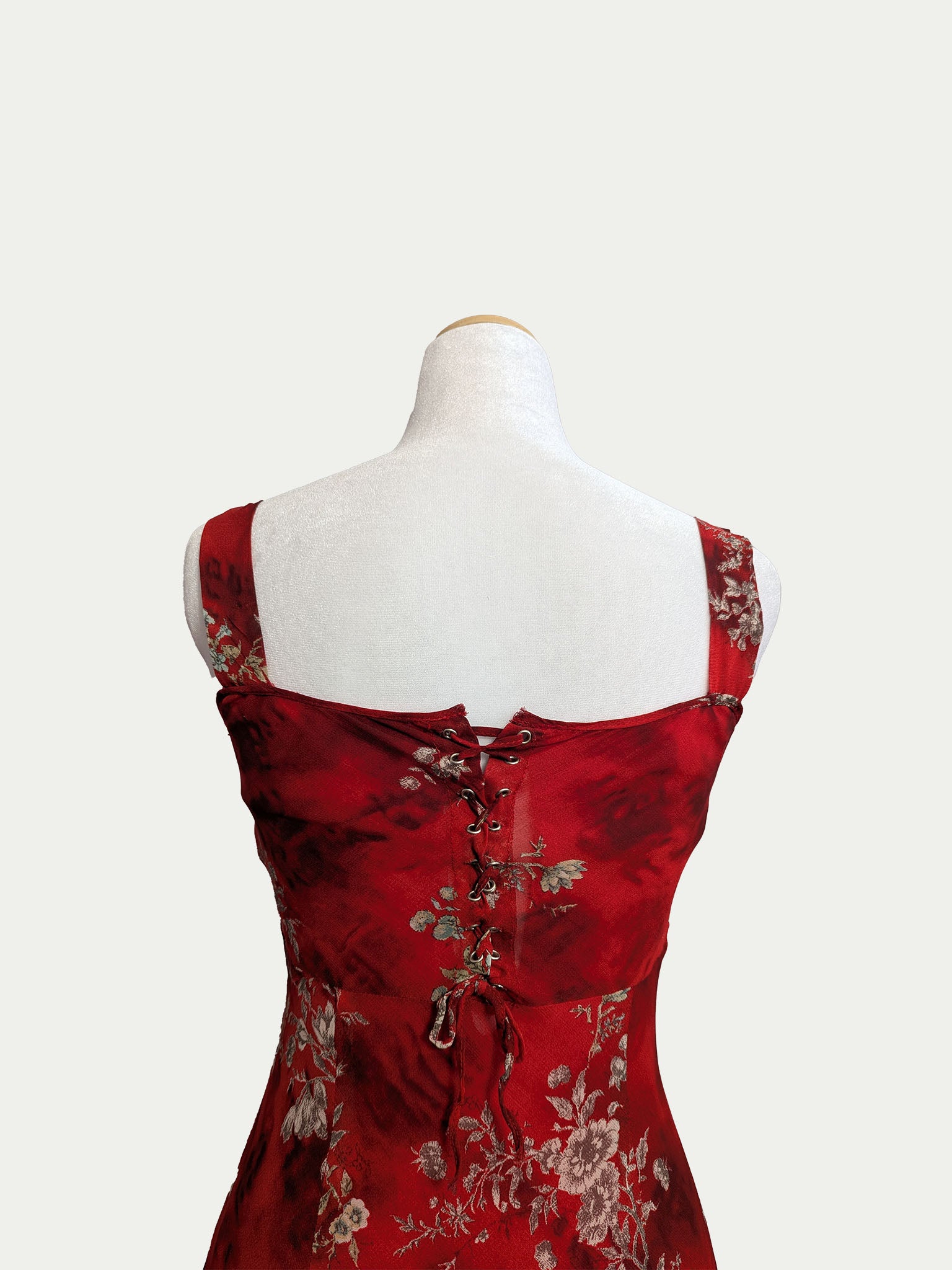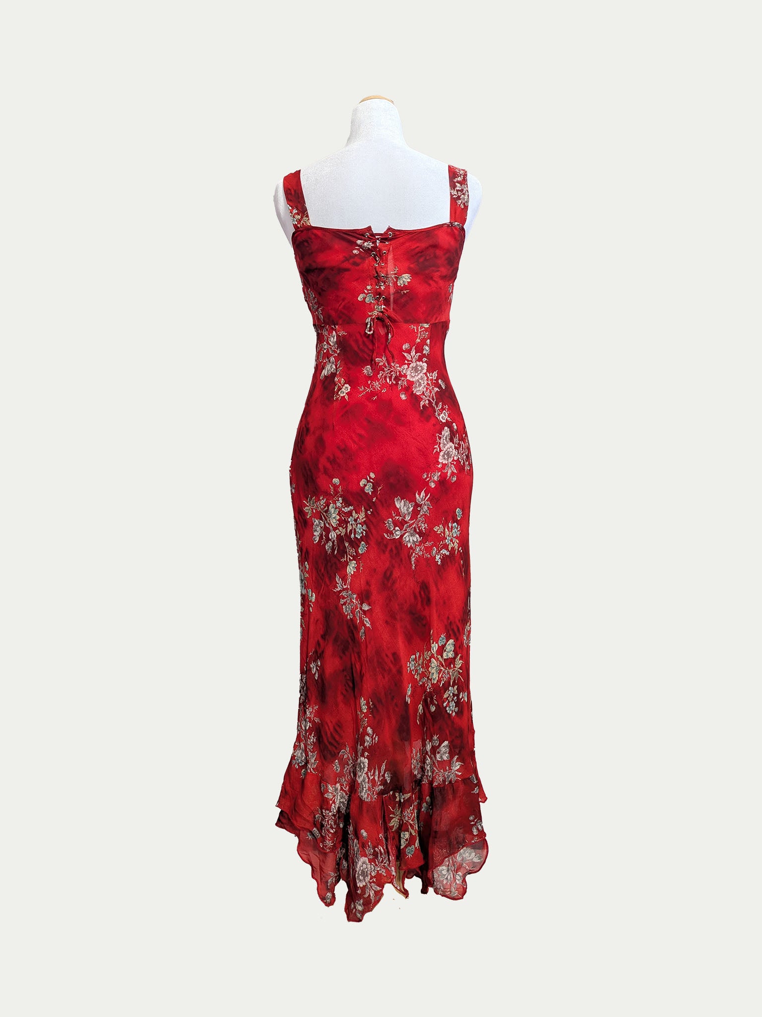Amazing 90s red viscose dress with flamenco flair. Designed with a corset-style lace-up back and an asymmetrical ruffled hem.