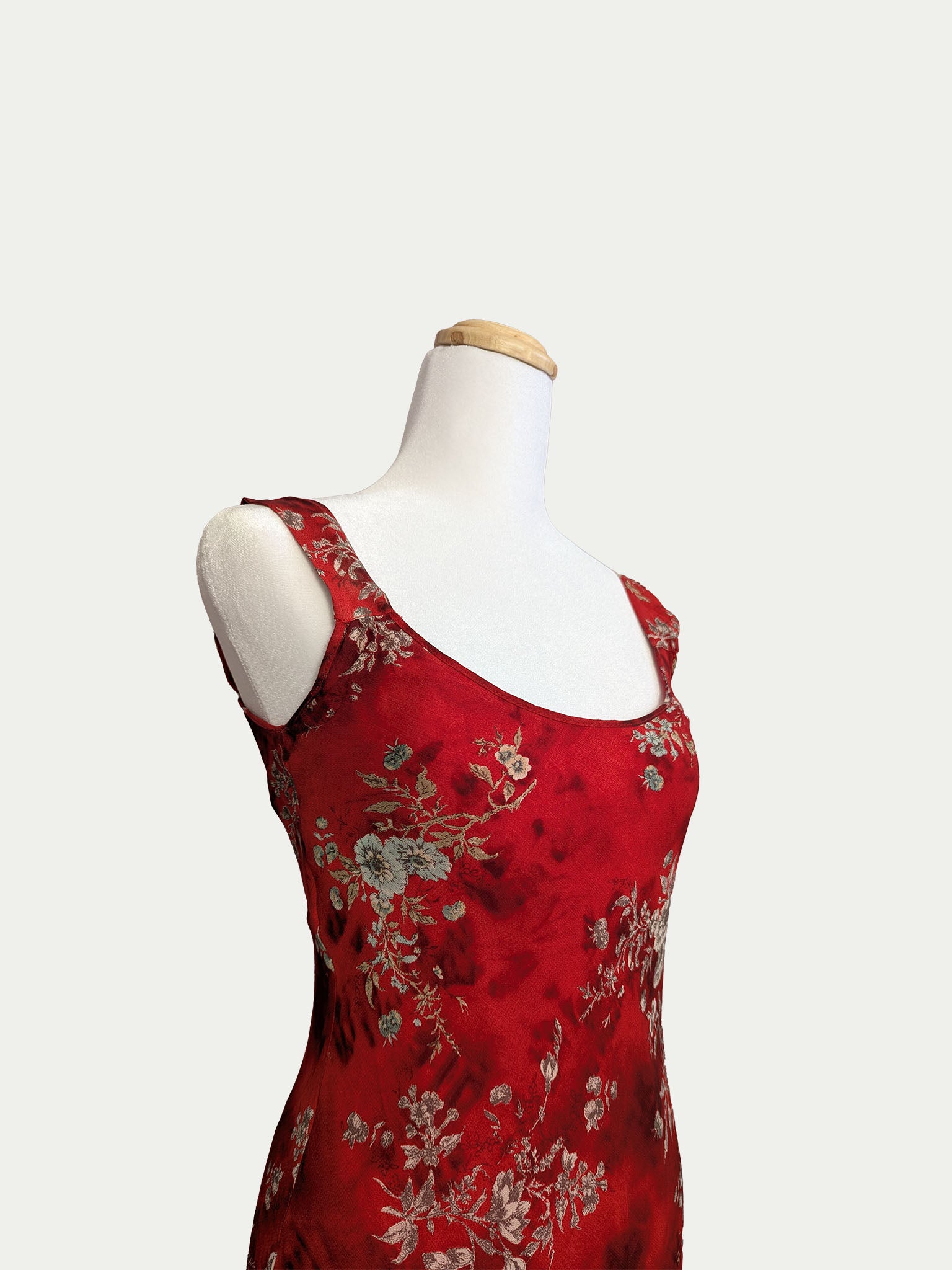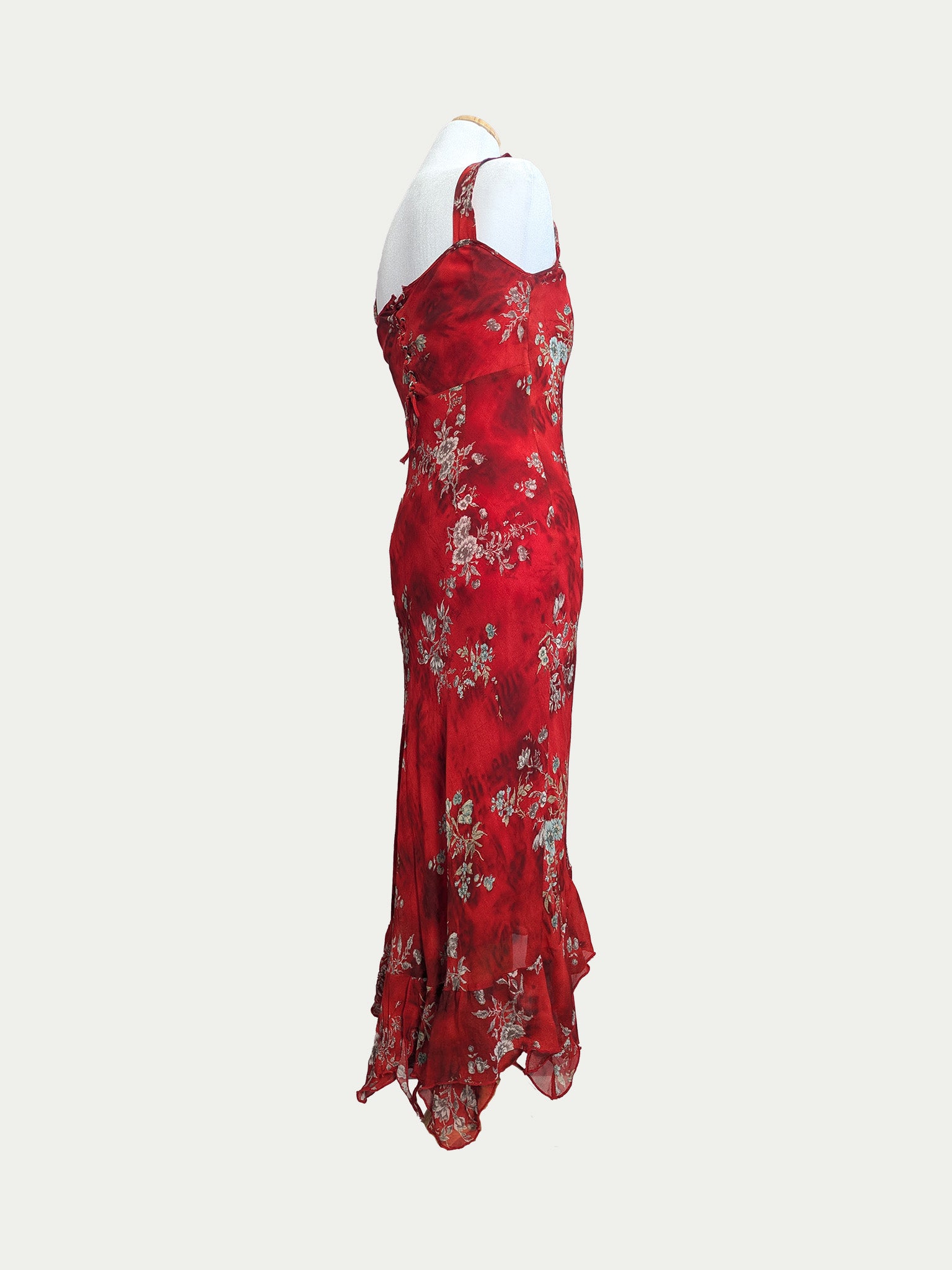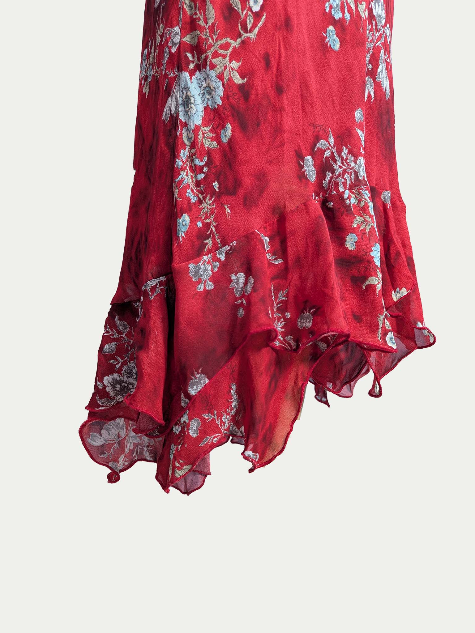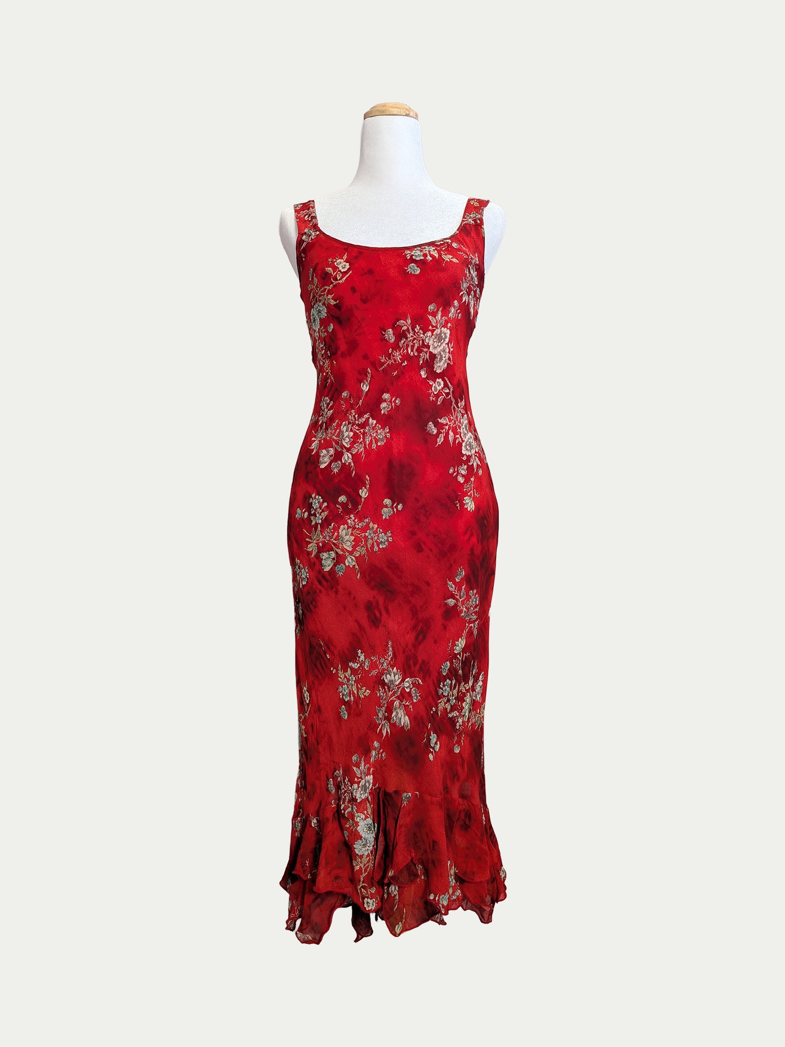 Amazing 90s red viscose dress with flamenco flair. Designed with a corset-style lace-up back and an asymmetrical ruffled hem.