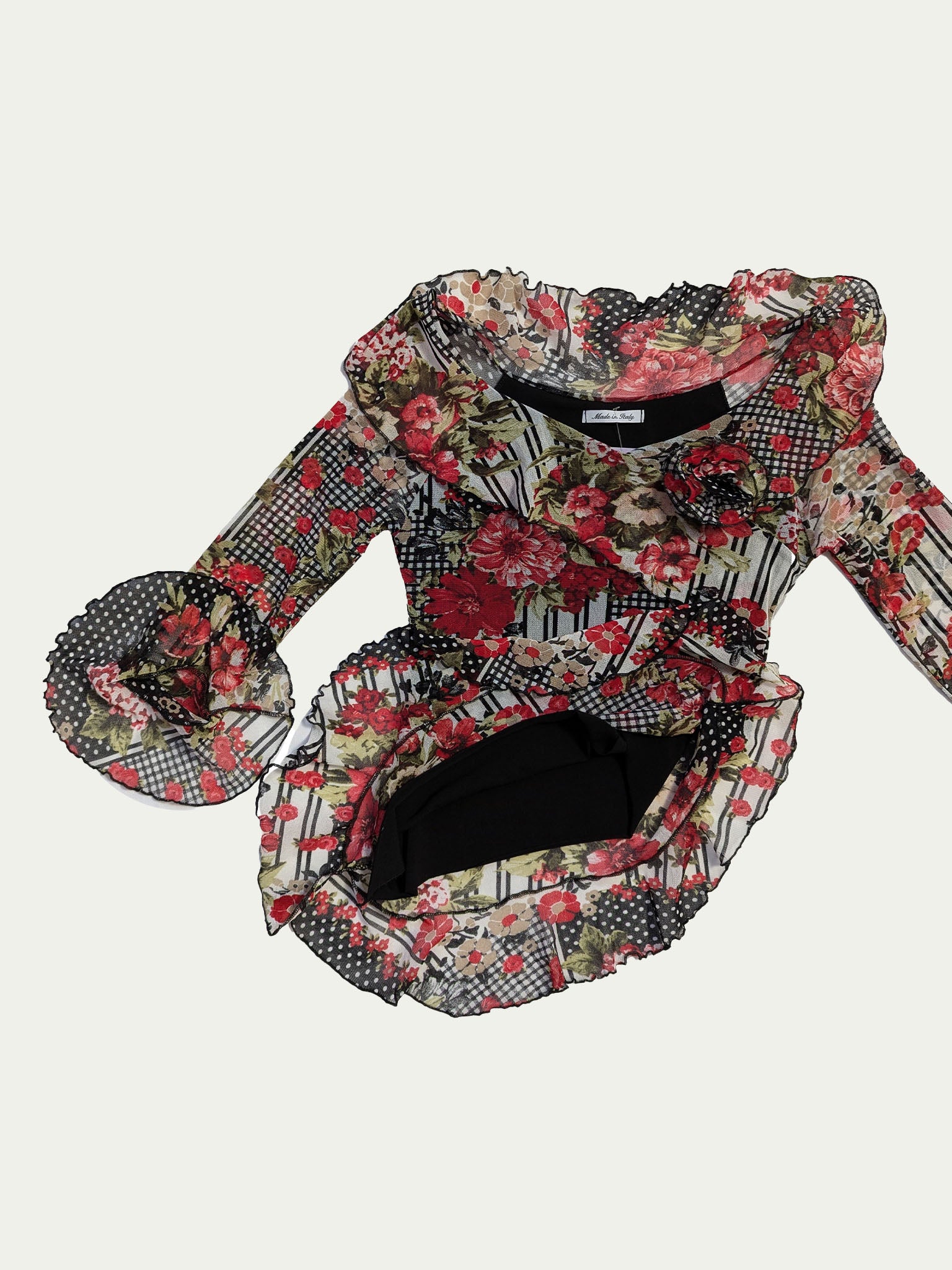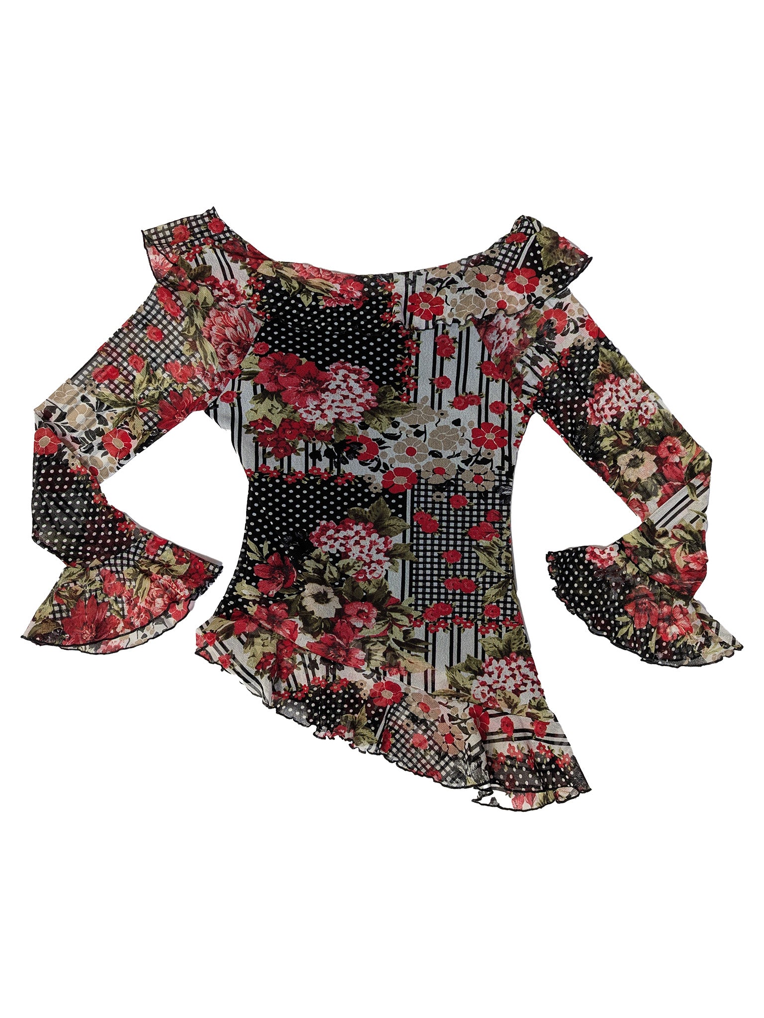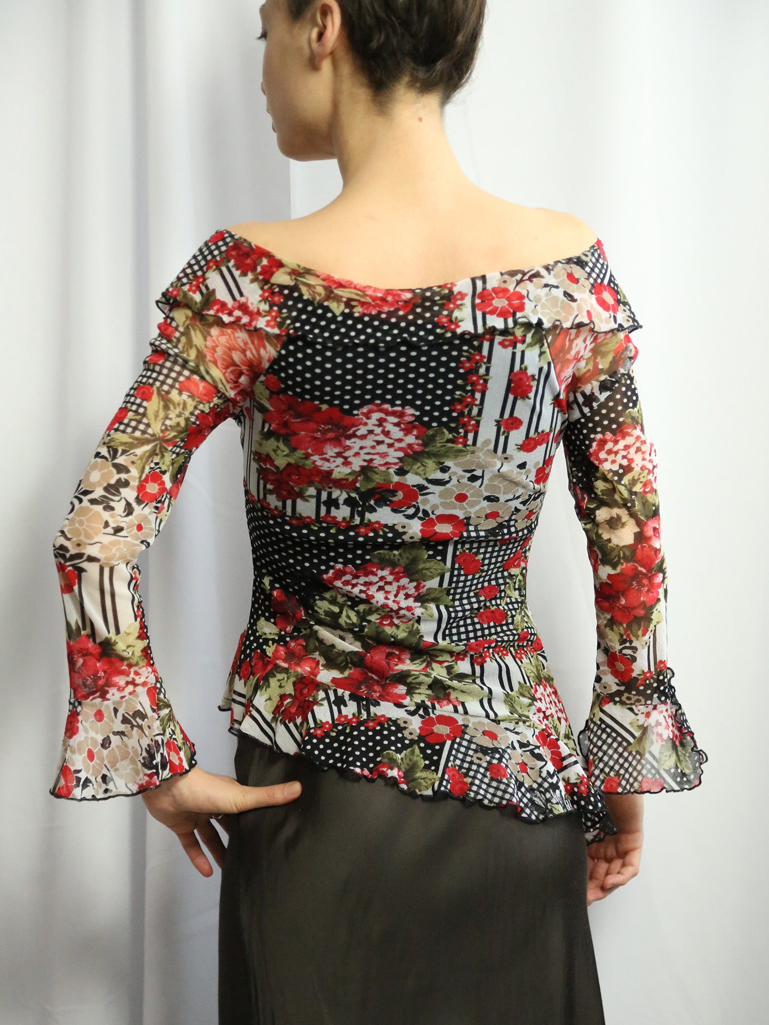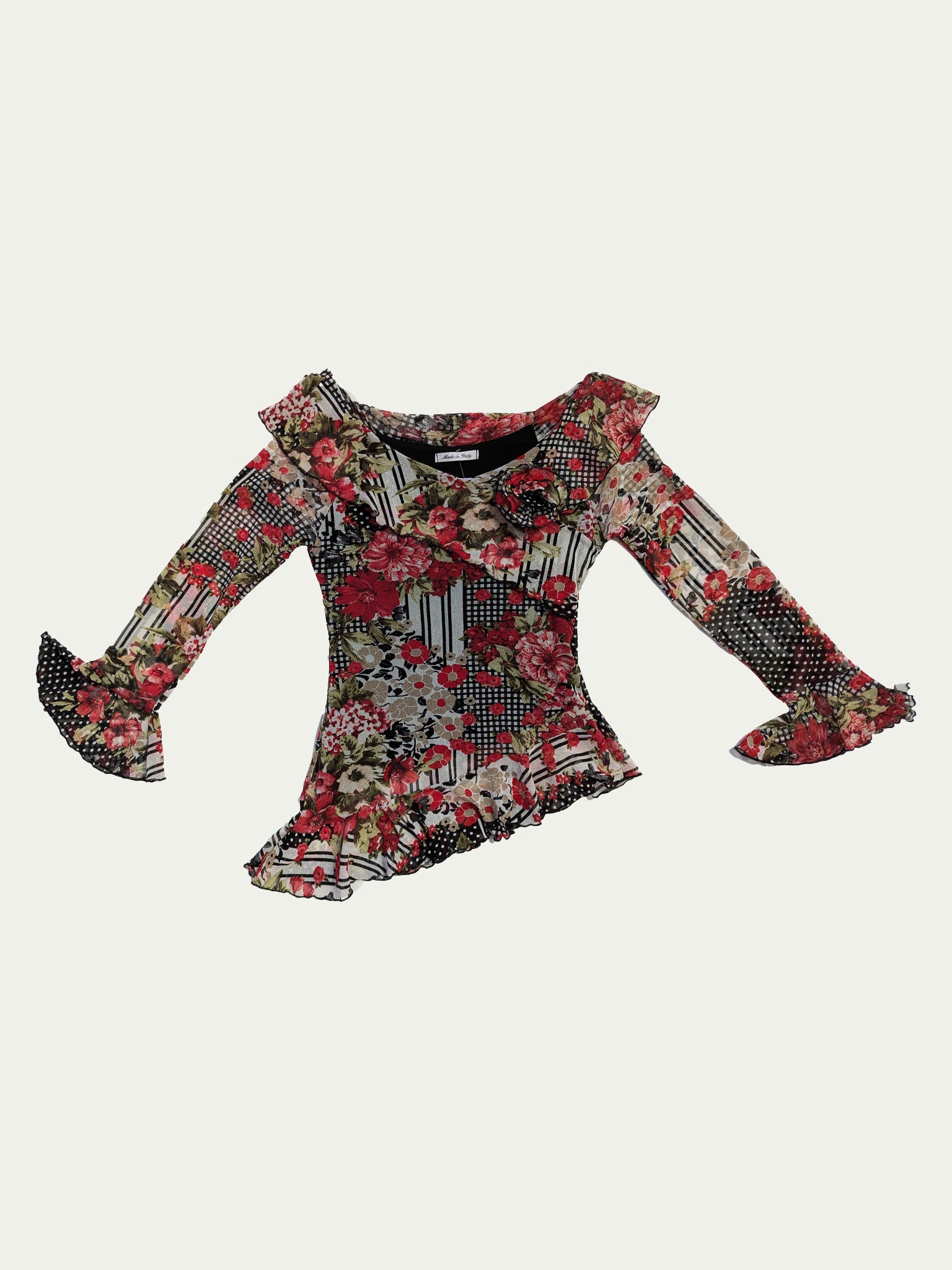 טופ רשת בסגנון Y2K, עם מחשוף רחב ומקושט בגזרת עוטף, שרוולי מניפה, מכפלת אלכסונית ומקושטת, ועיטור רשת בסגנון ורד רשת על החזה, בסגנון פלמנקו.