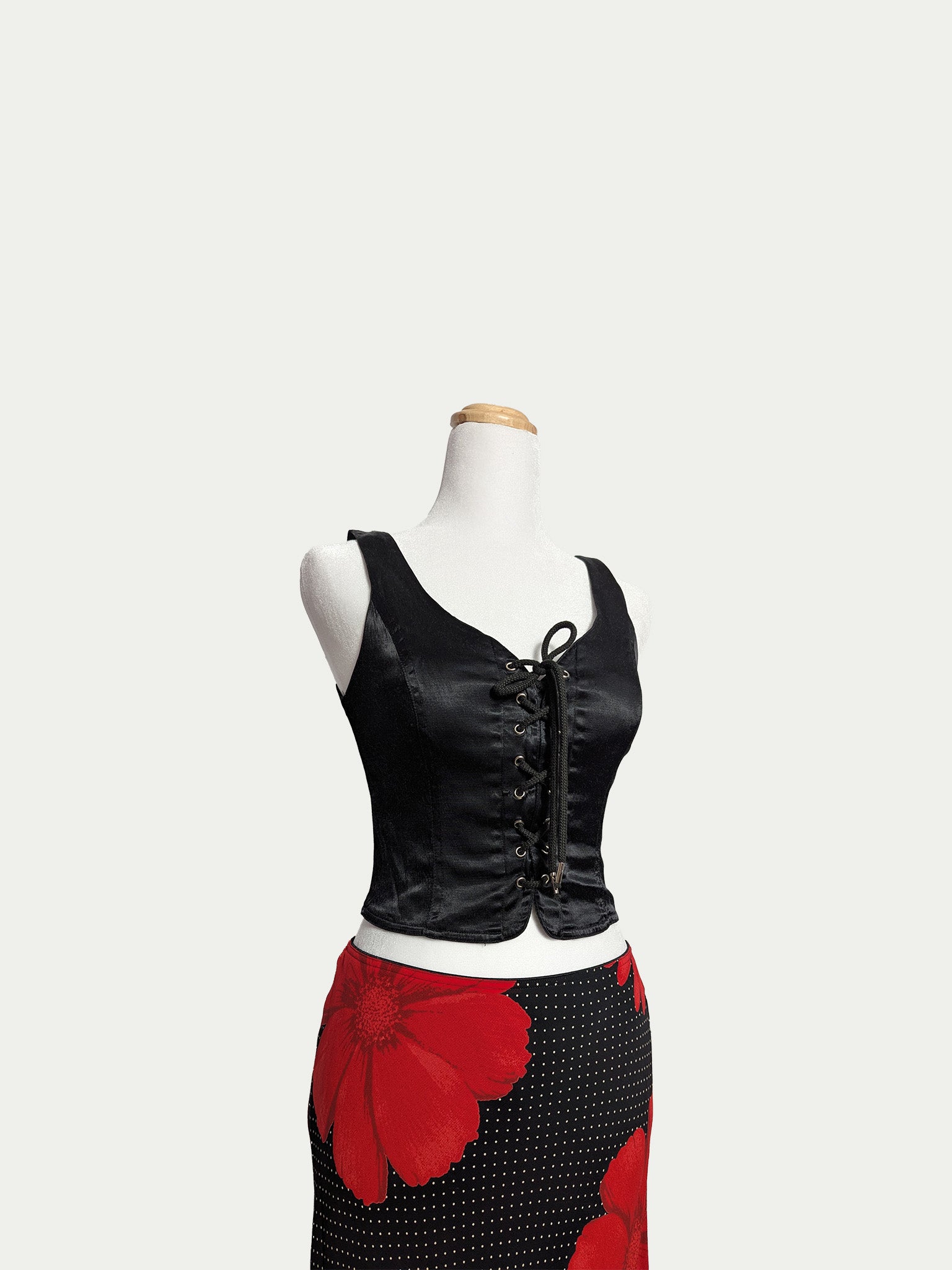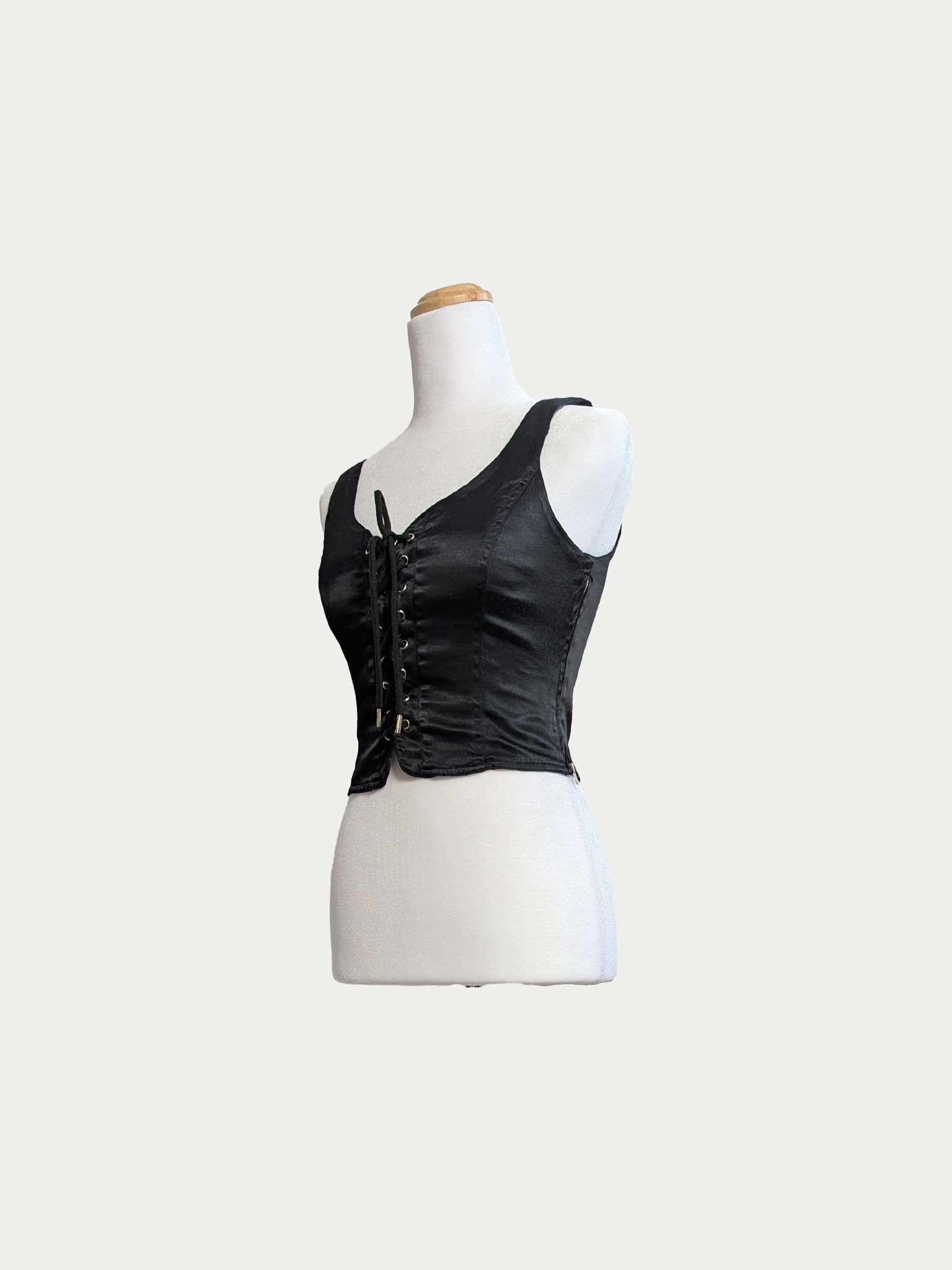 90s Black Moschino top designed as a corset, featuring front tie laces, a side zipper, and a sculpting stretch fit. Elastic and comfortable, with a clean silhouette that curves perfectly to the body.