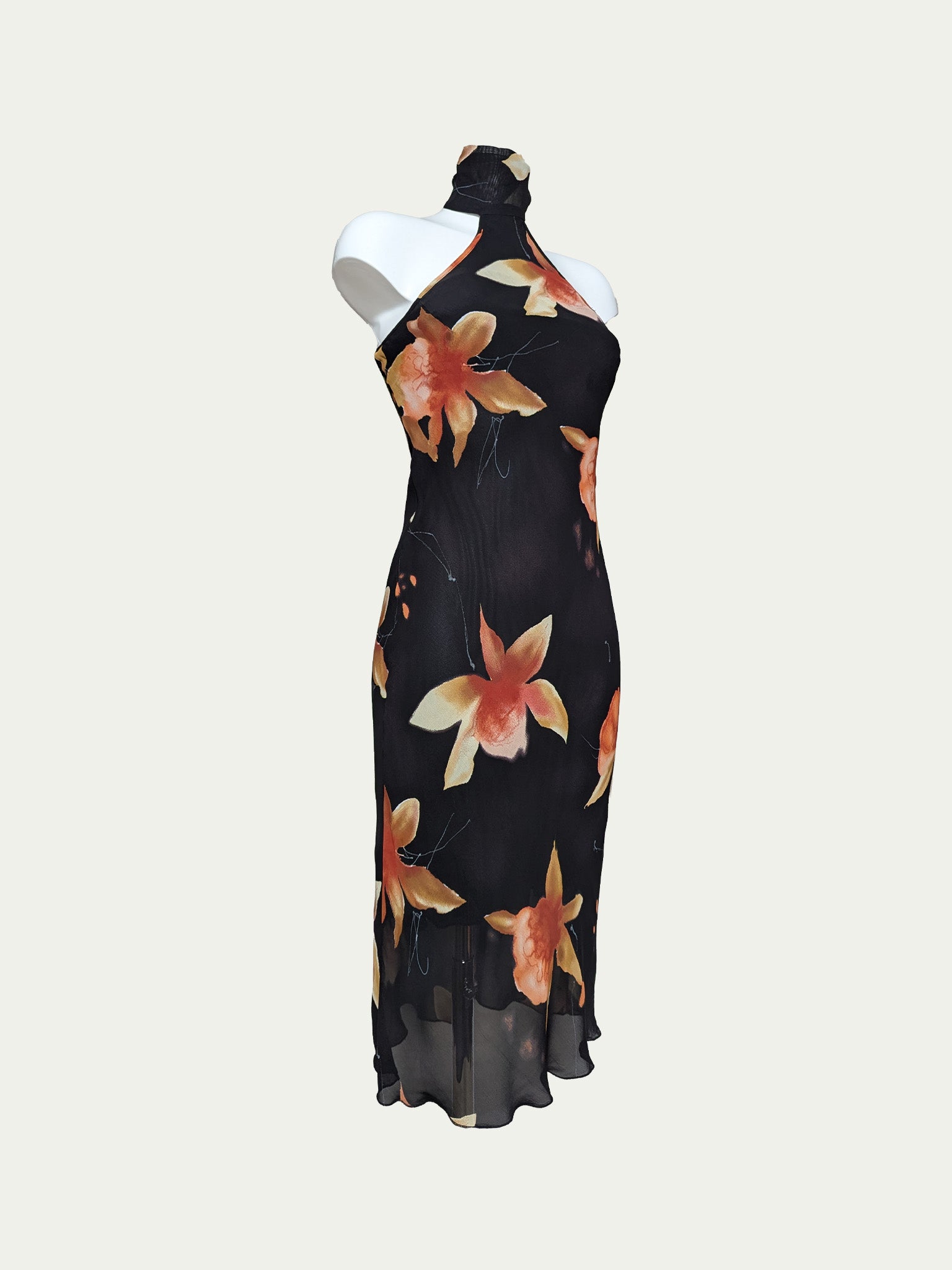 Rare 90s viscose dress featuring a distinctive collar and open back. Designed with a laced neck closure, above-ankle length, and opaque lining. Elegant and timeless.