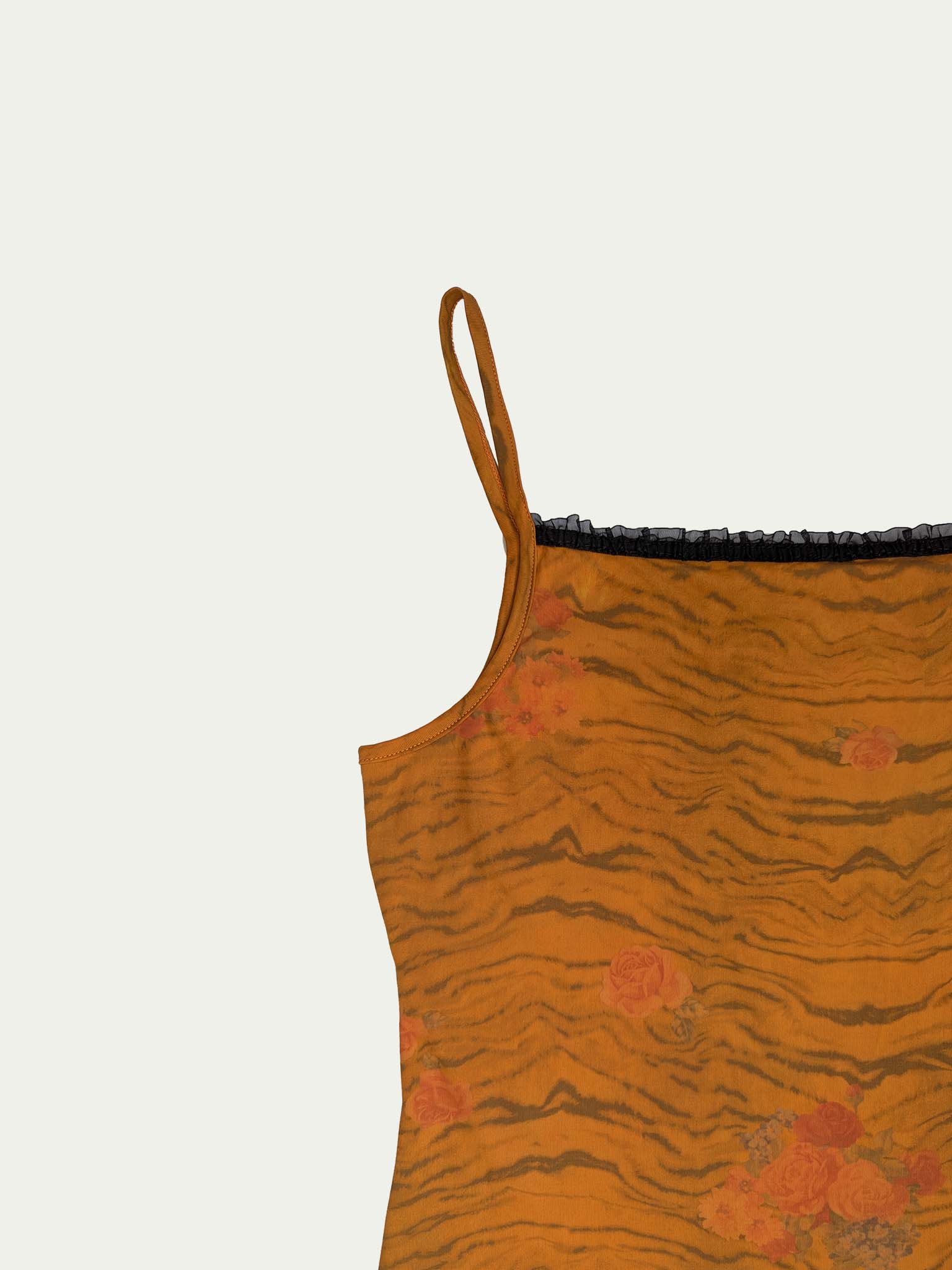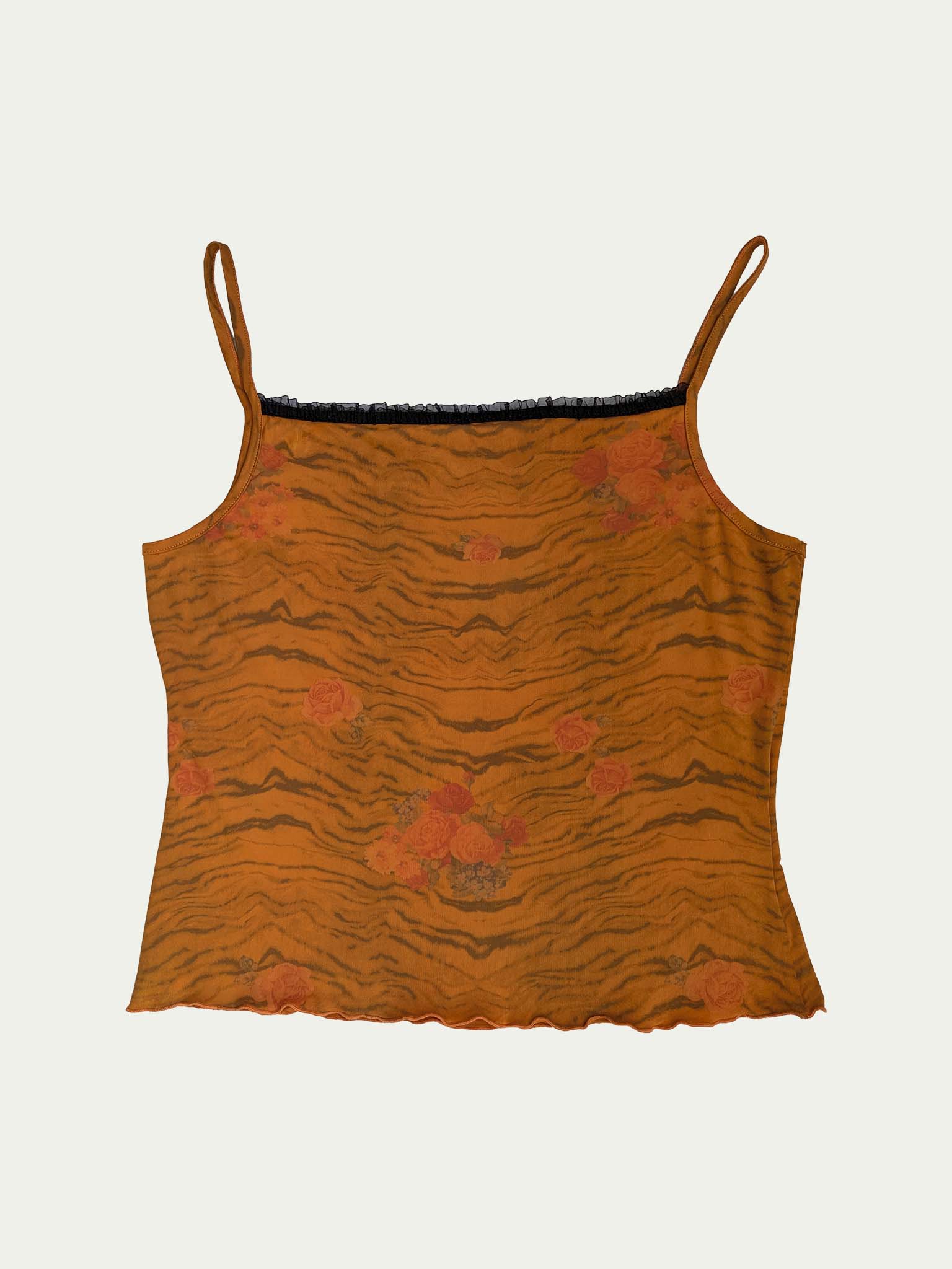טופ קרופ-טופ גמיש משנות ה-90, עם הדפס נמר וורדים בגוון כתום כהה, כולל מחשוף מרובע, מעוטר בשיפון שחור מקומט בחלקו האחורי והקדמי.