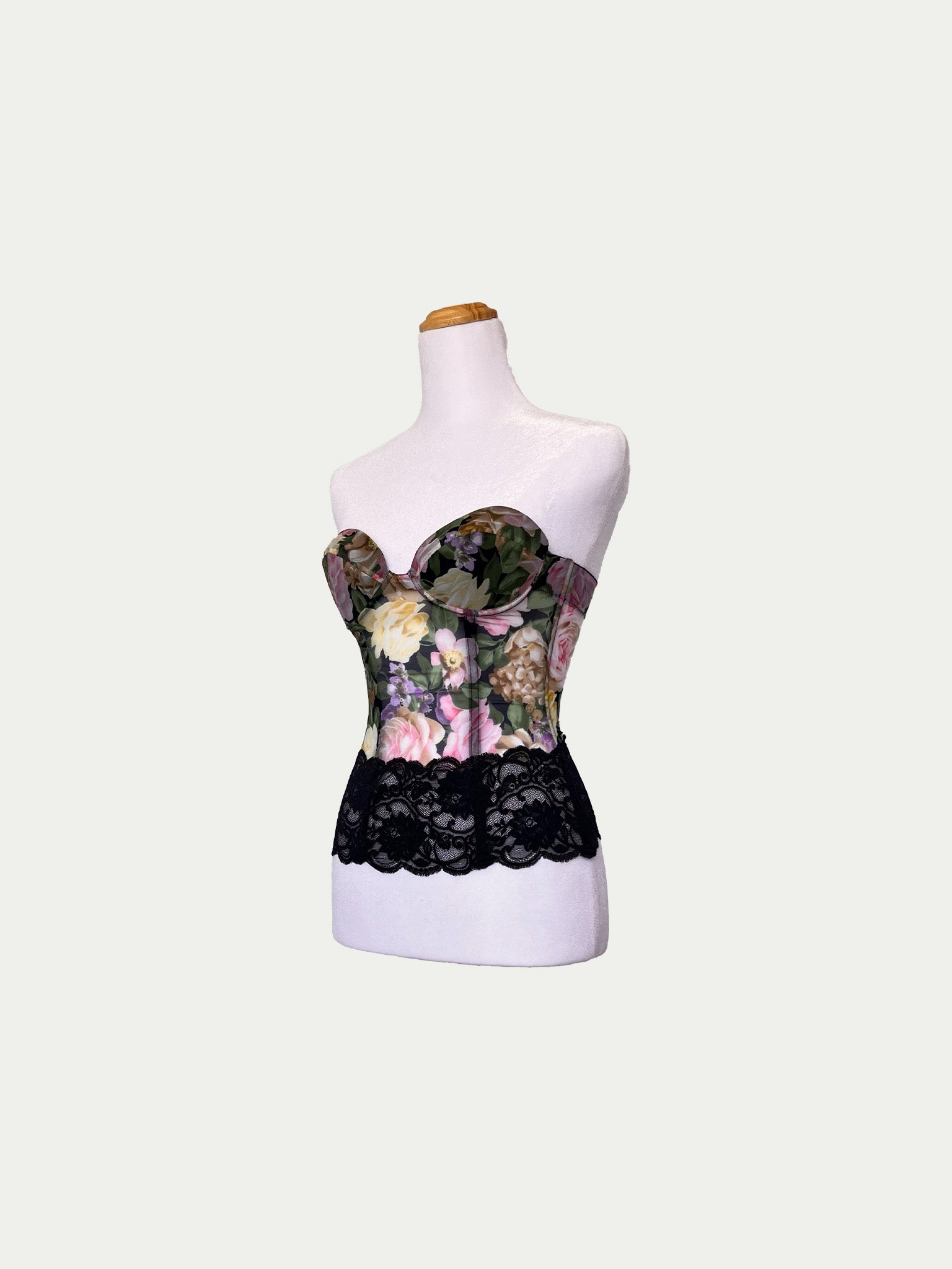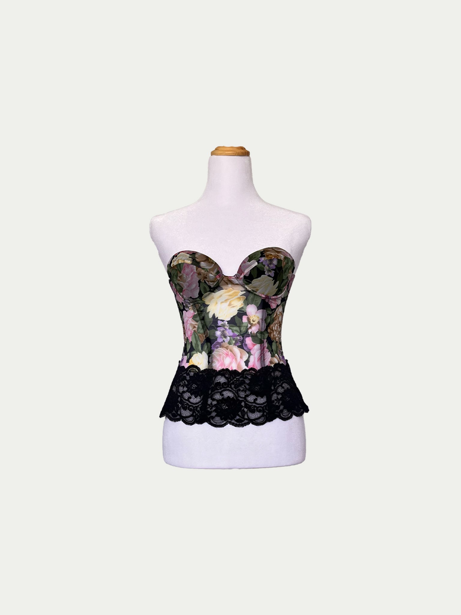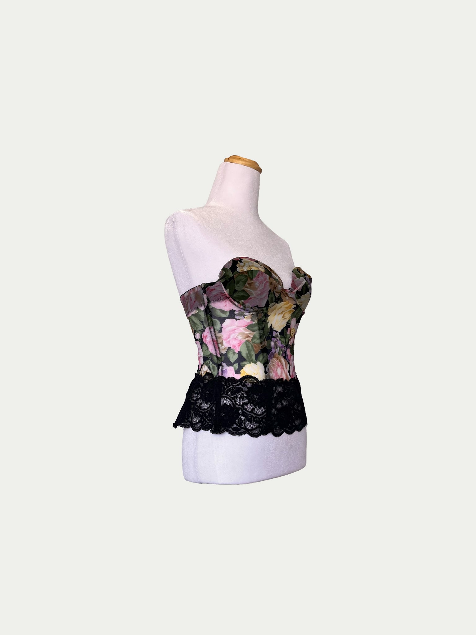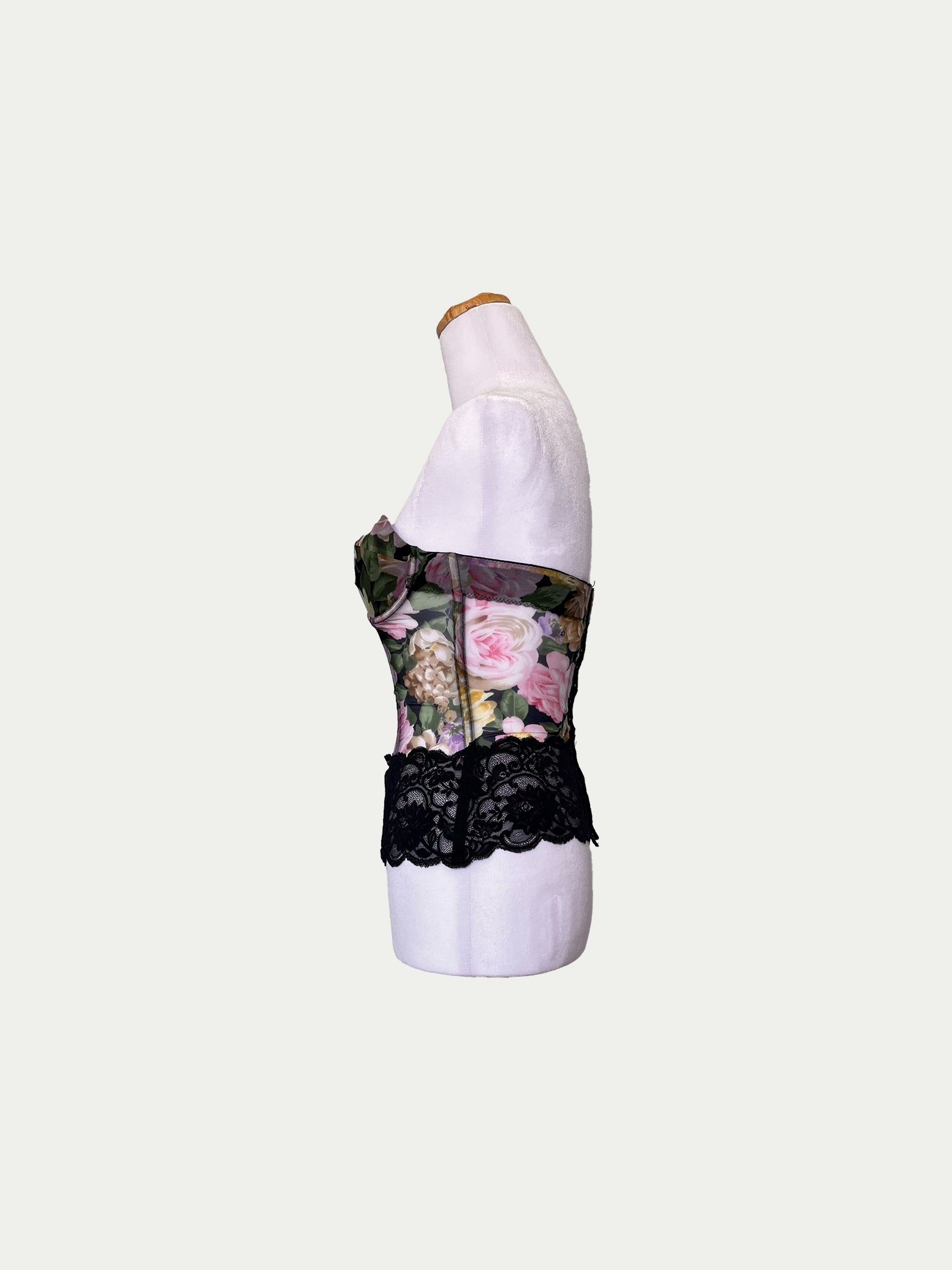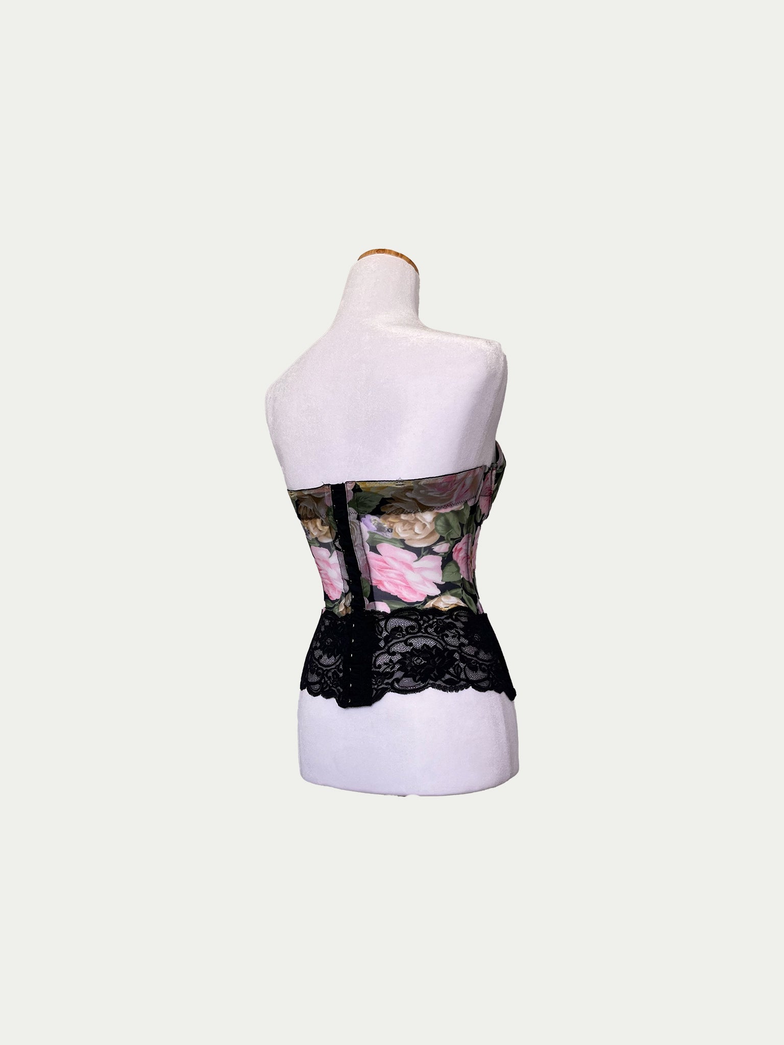 90s corset by Marvel made of floral mesh fabric in soft pastel shades, finished with wide lace paneling at the hem. Boning at the sides and front, with two rows of hook closures at the back.