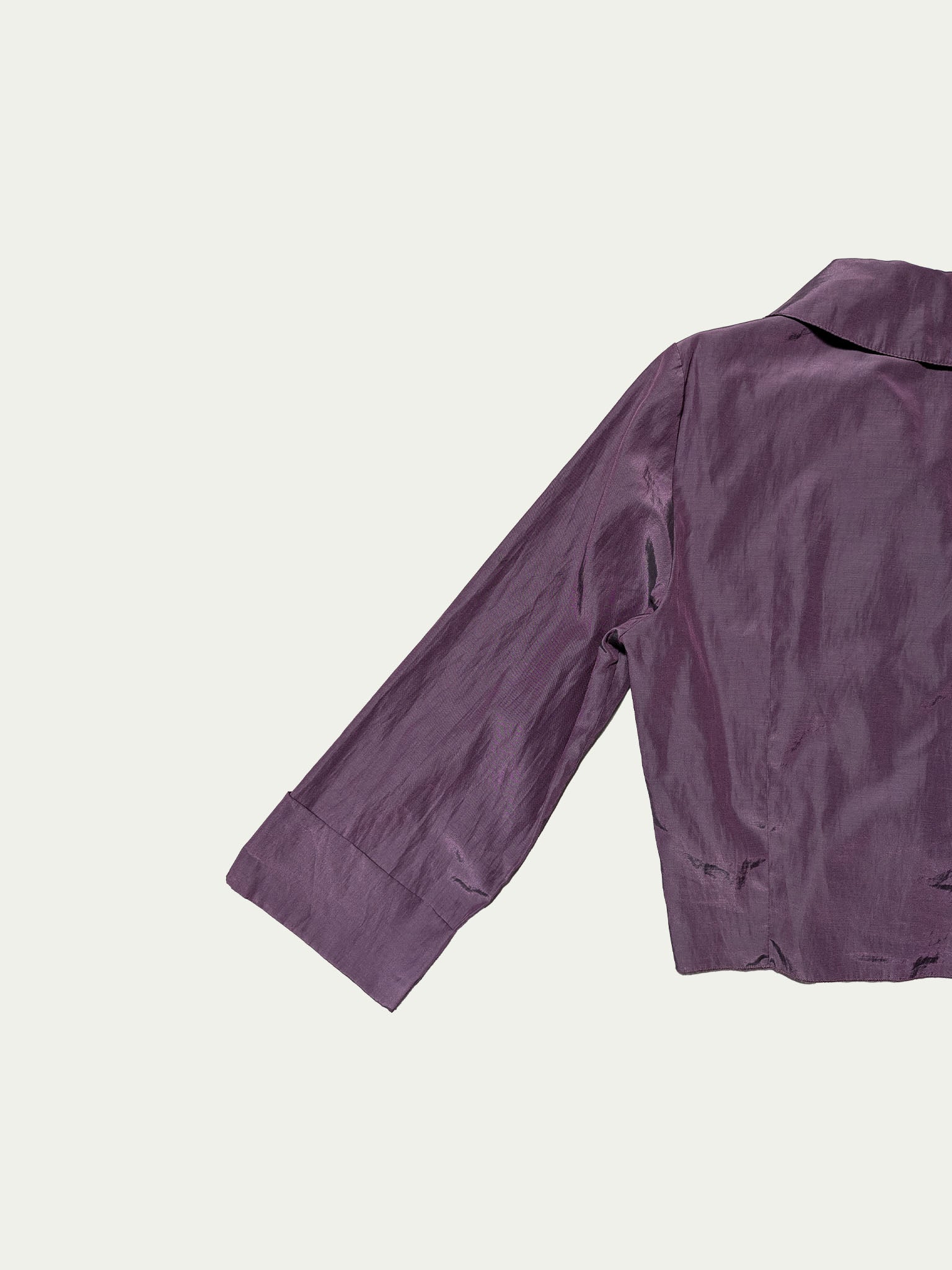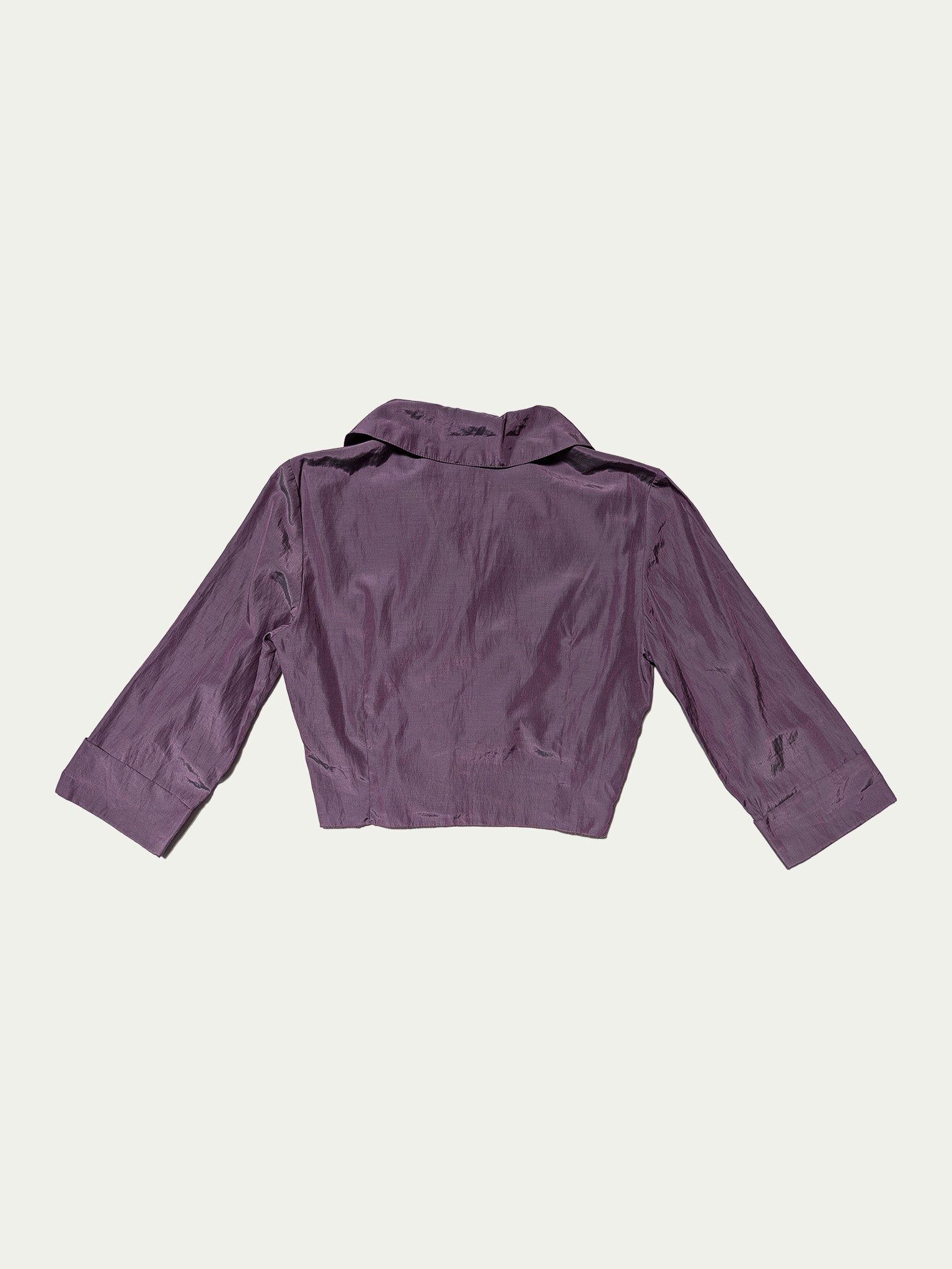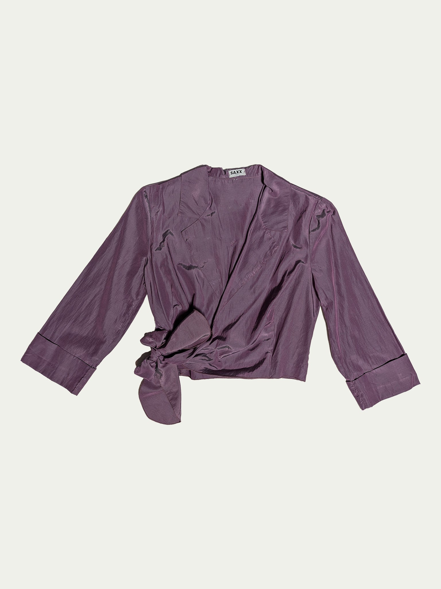 טופ מעטפת בצבע סגול של Y2K, עם שרוולים רחבים 7/8, סגירת כפתור צדדית פנימית וסגירת קשירה עם סרטים מעוגלים רחבים בצד.