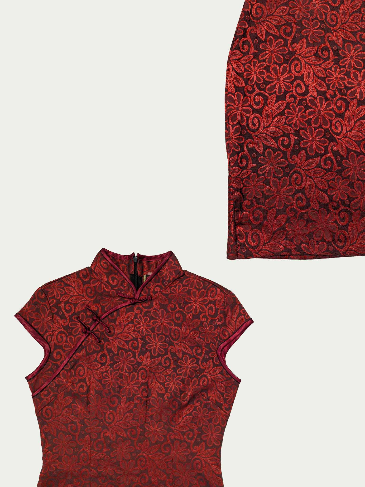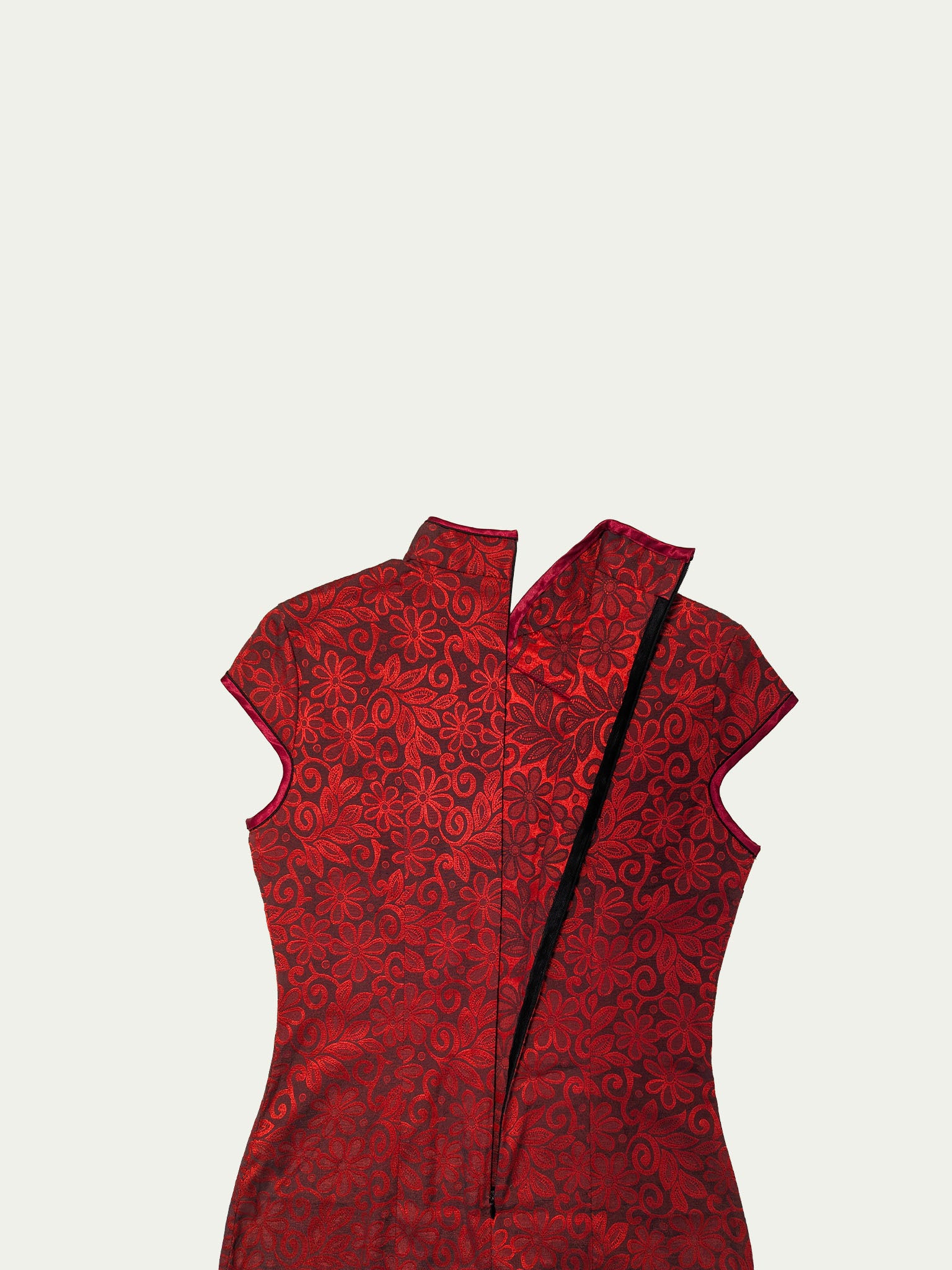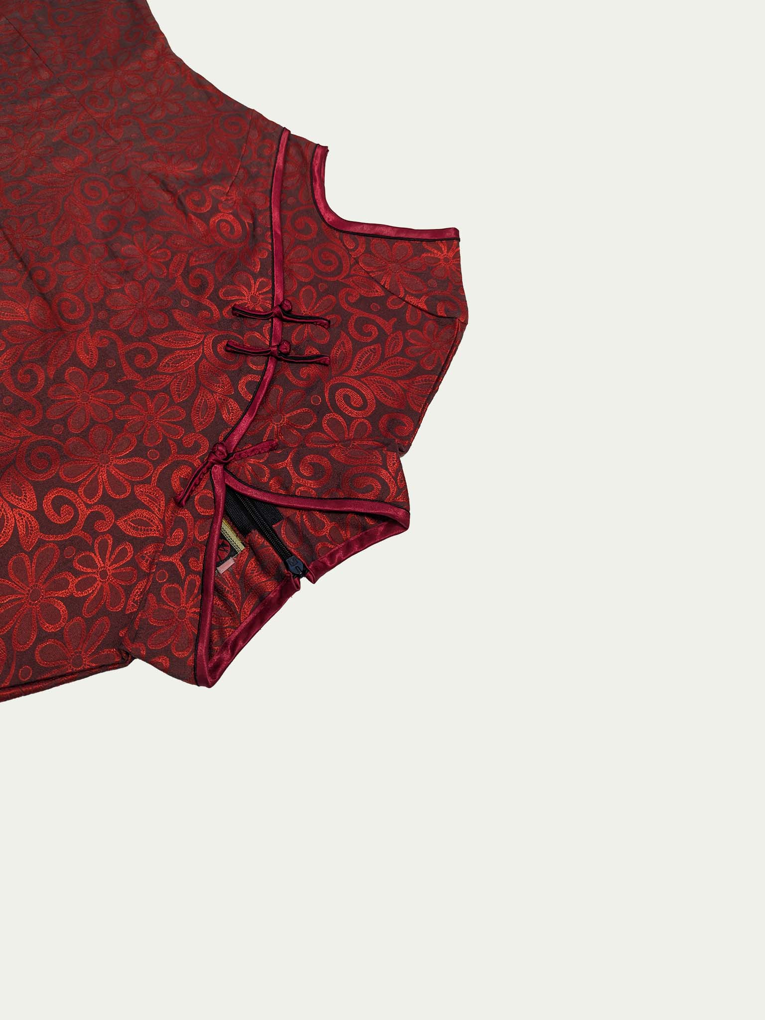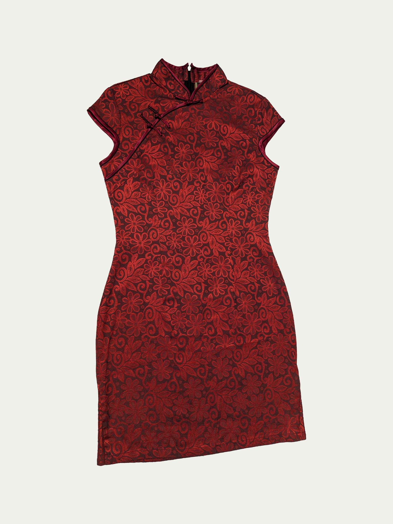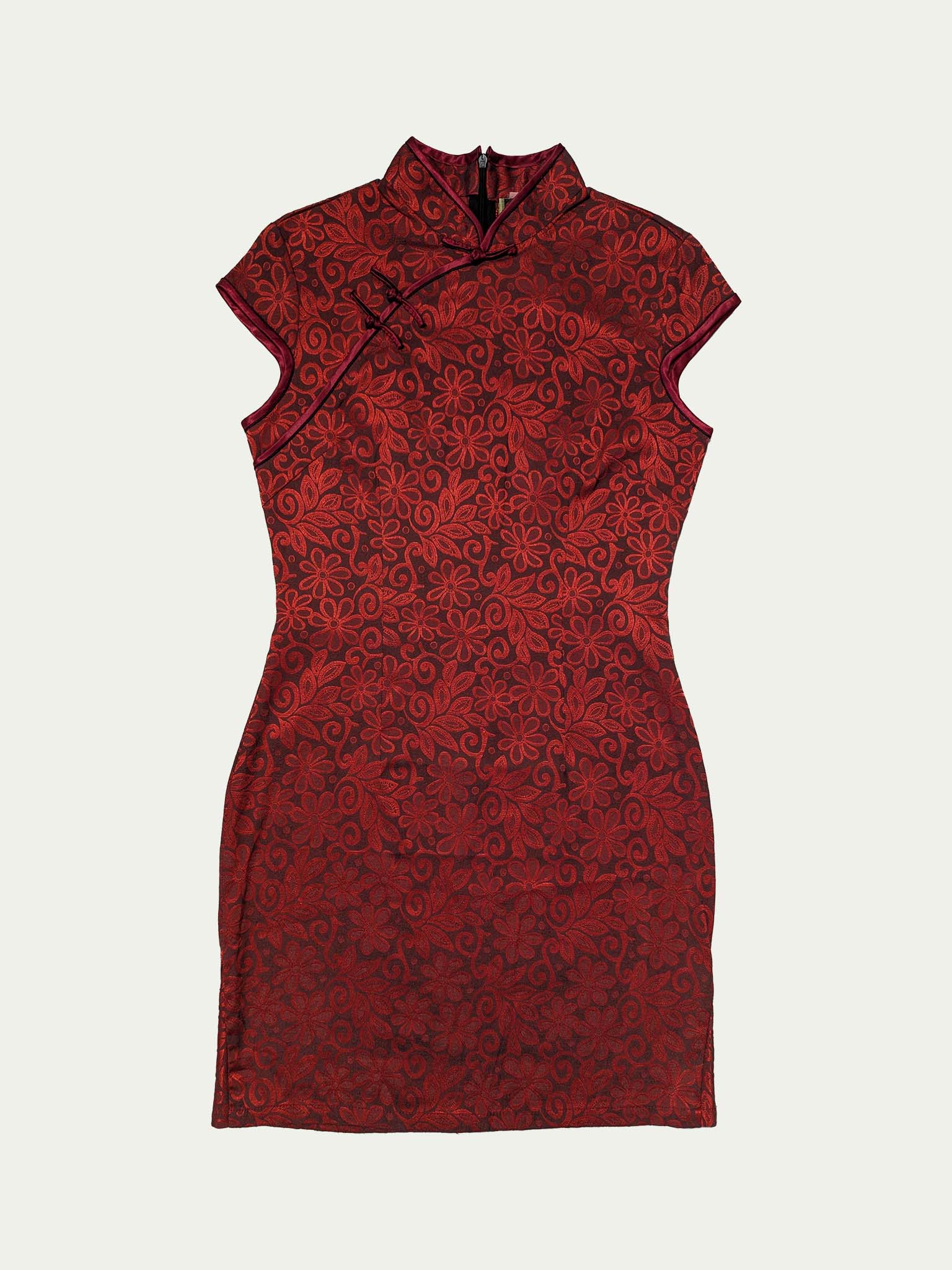 שמלת מיני סינית קלאסית משנות ה-90 עשויה מבד כותנה ז'קארד איכותי בדוגמת פרחים בצבע אדום בורדו, עם גימורים מסאטן וסגירת רוכסן מאחור.