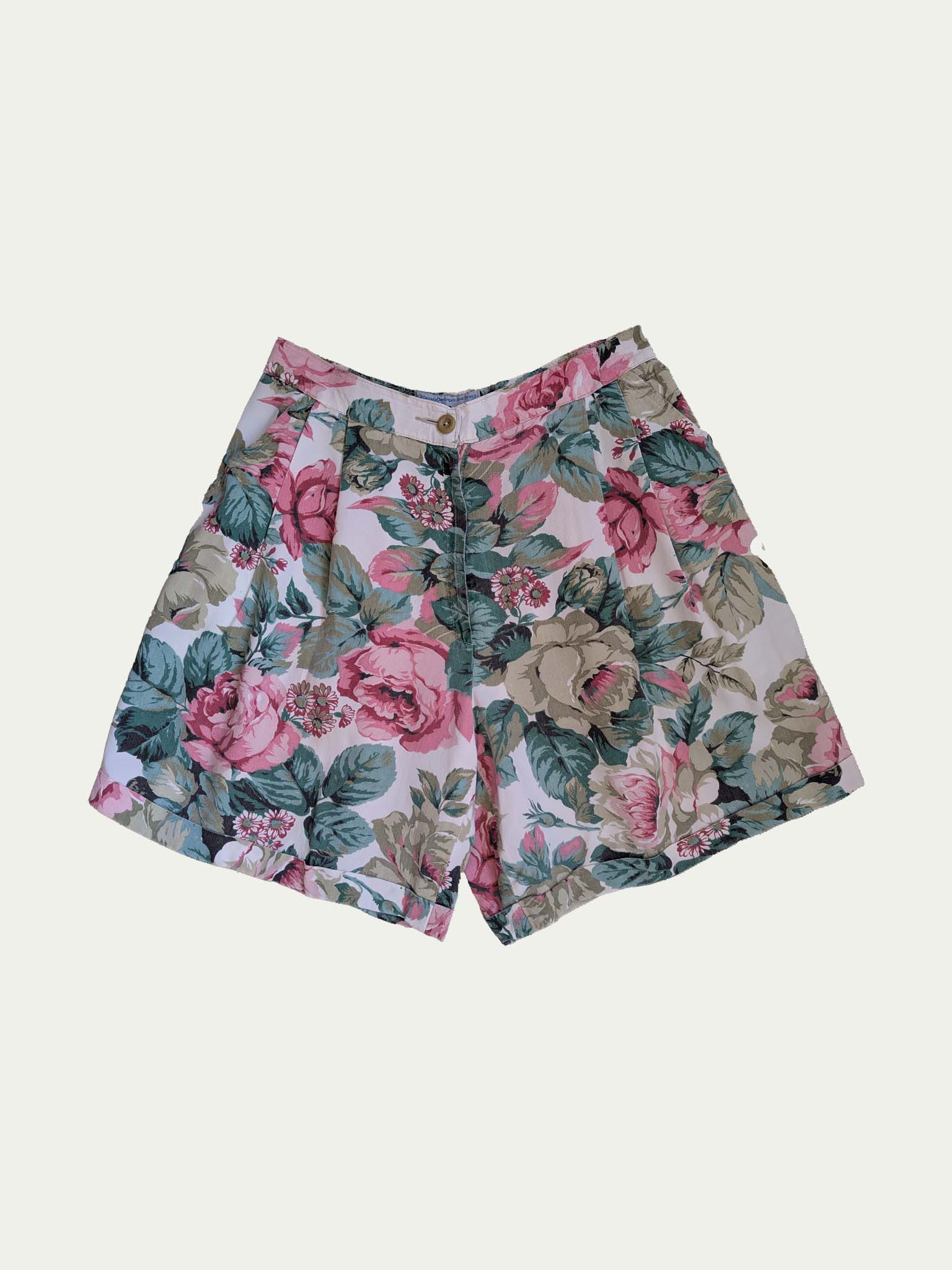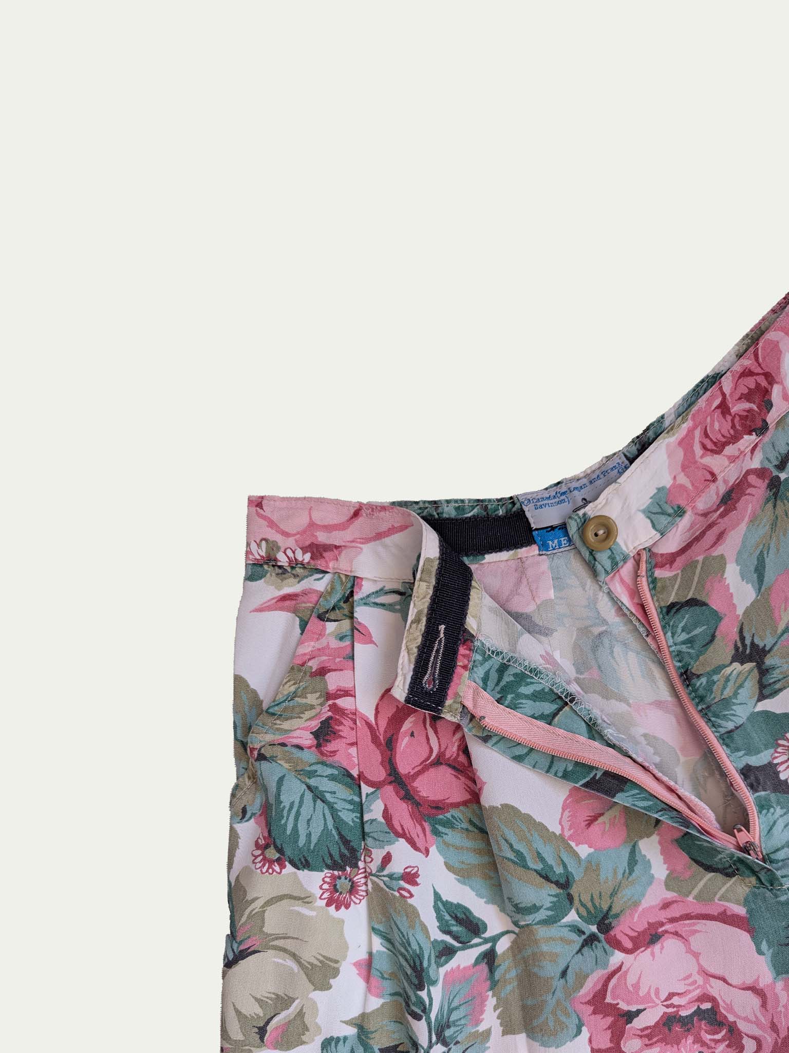 מכנסי כותנה קצרים משנות ה-90, בגזרה קלאסית עם קפלים בגזרה גבוהה, והדפס ורדים פסטלי רומנטי.