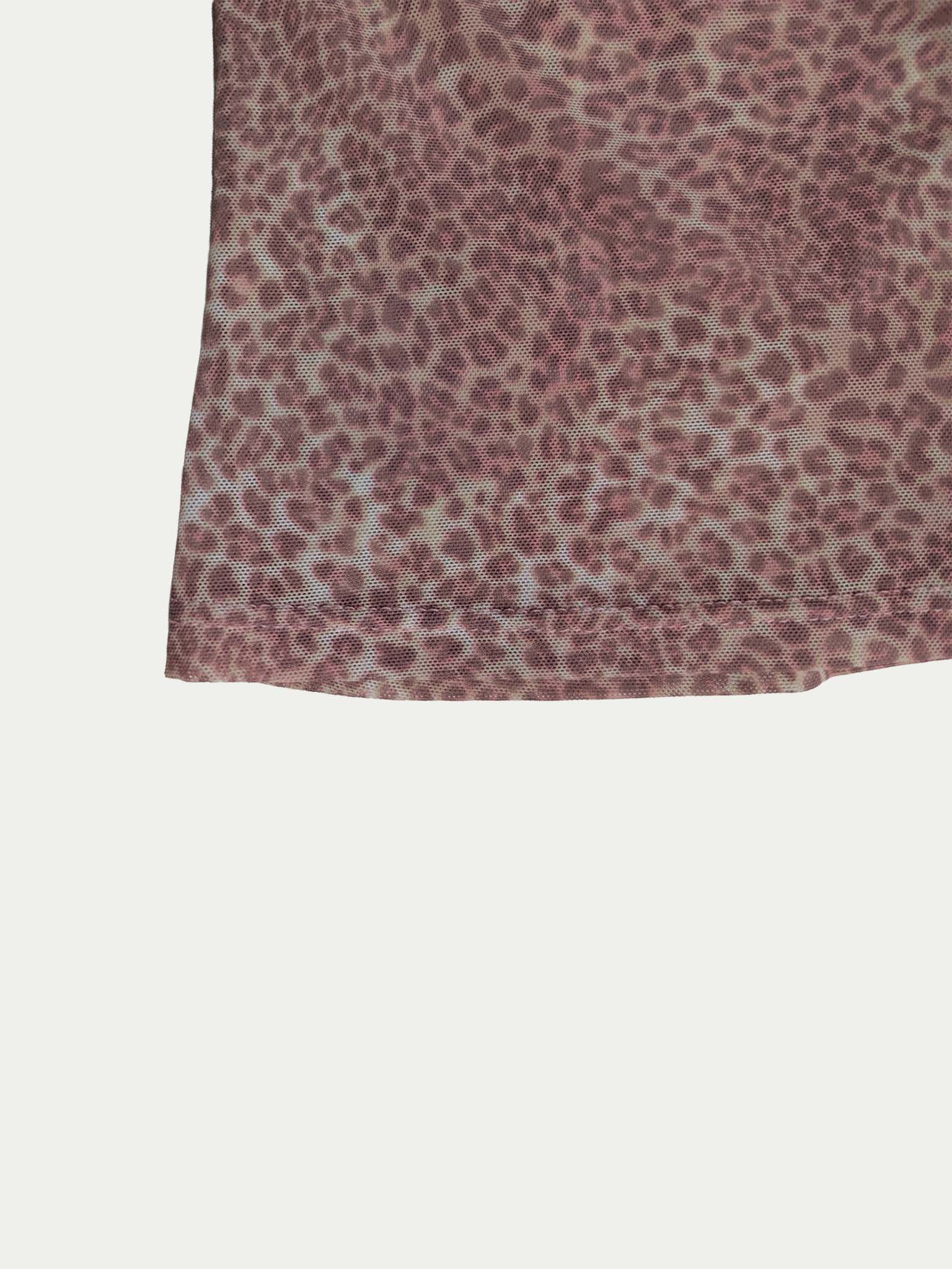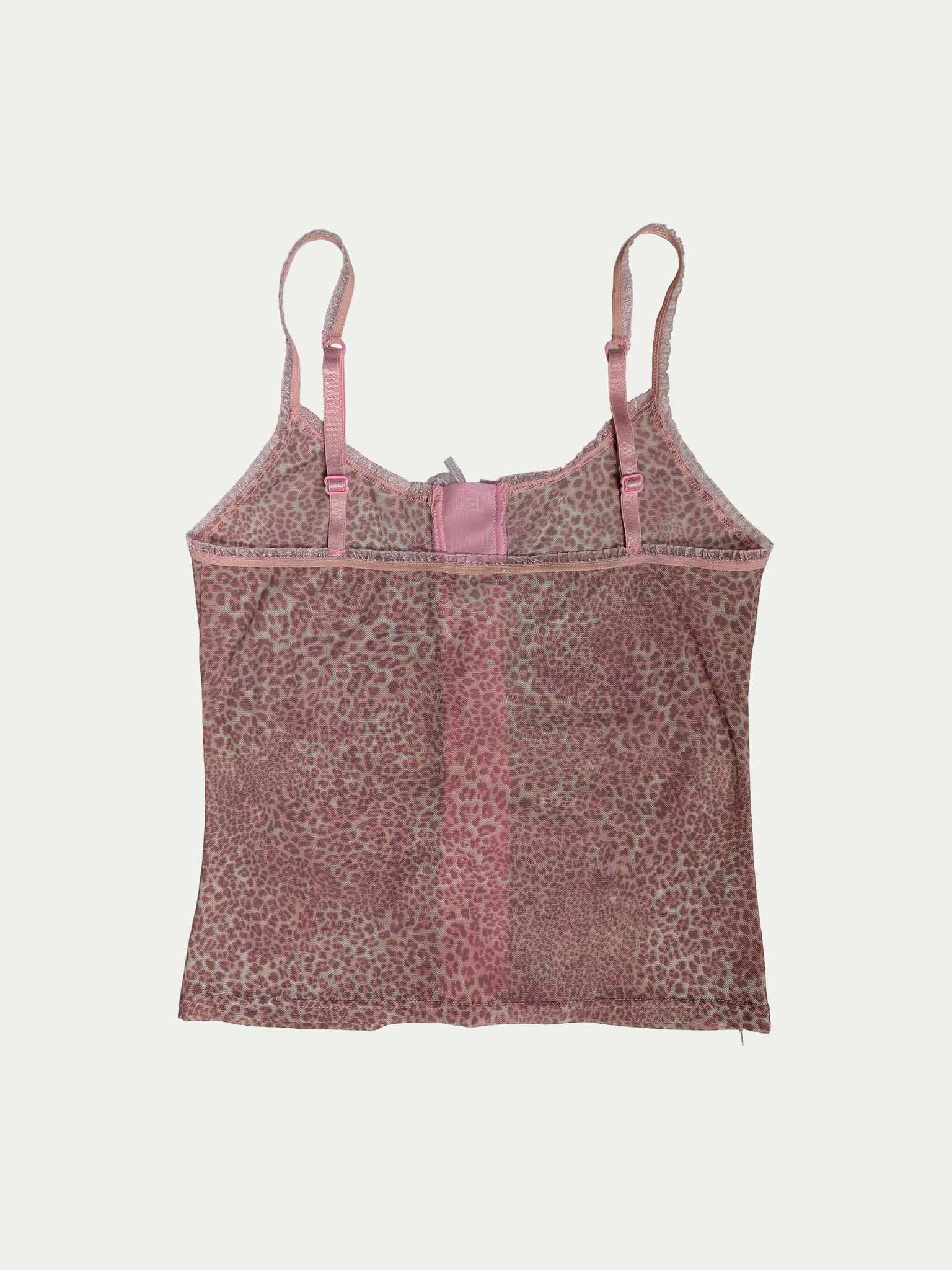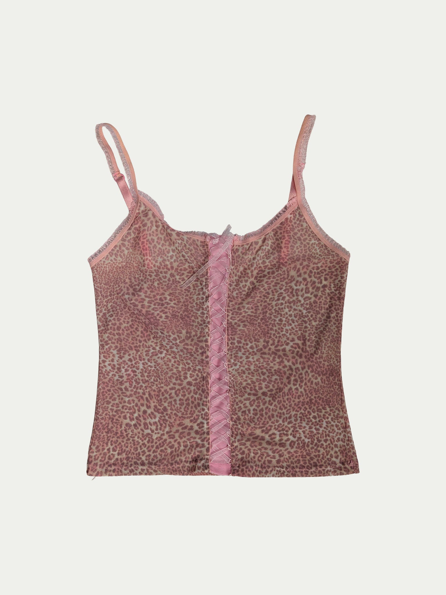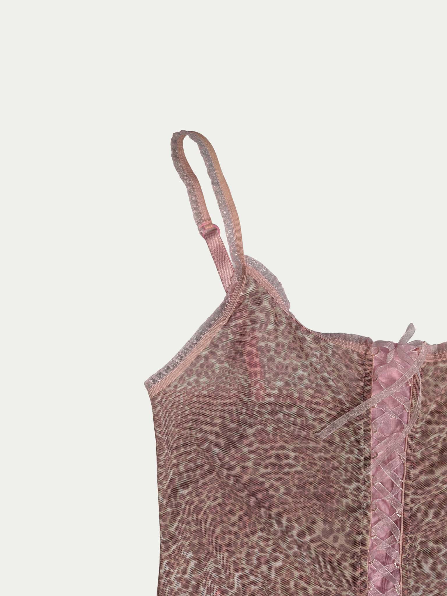 גופיית רשת Y2K עם דוגמת נמר בגוונים ורודים עדינים. מעוצבת עם רצועות מתכווננות ושרוכים בחזית בסגנון מחוך.
