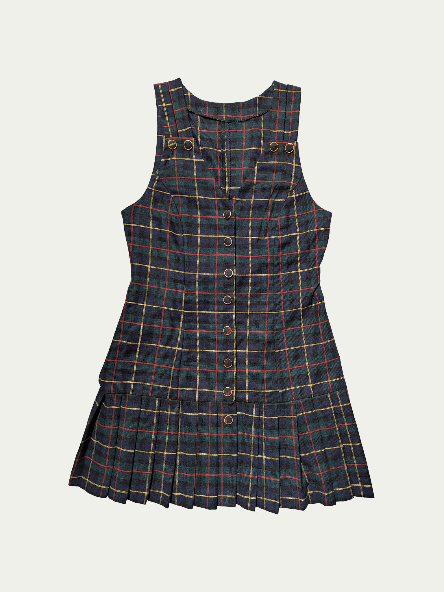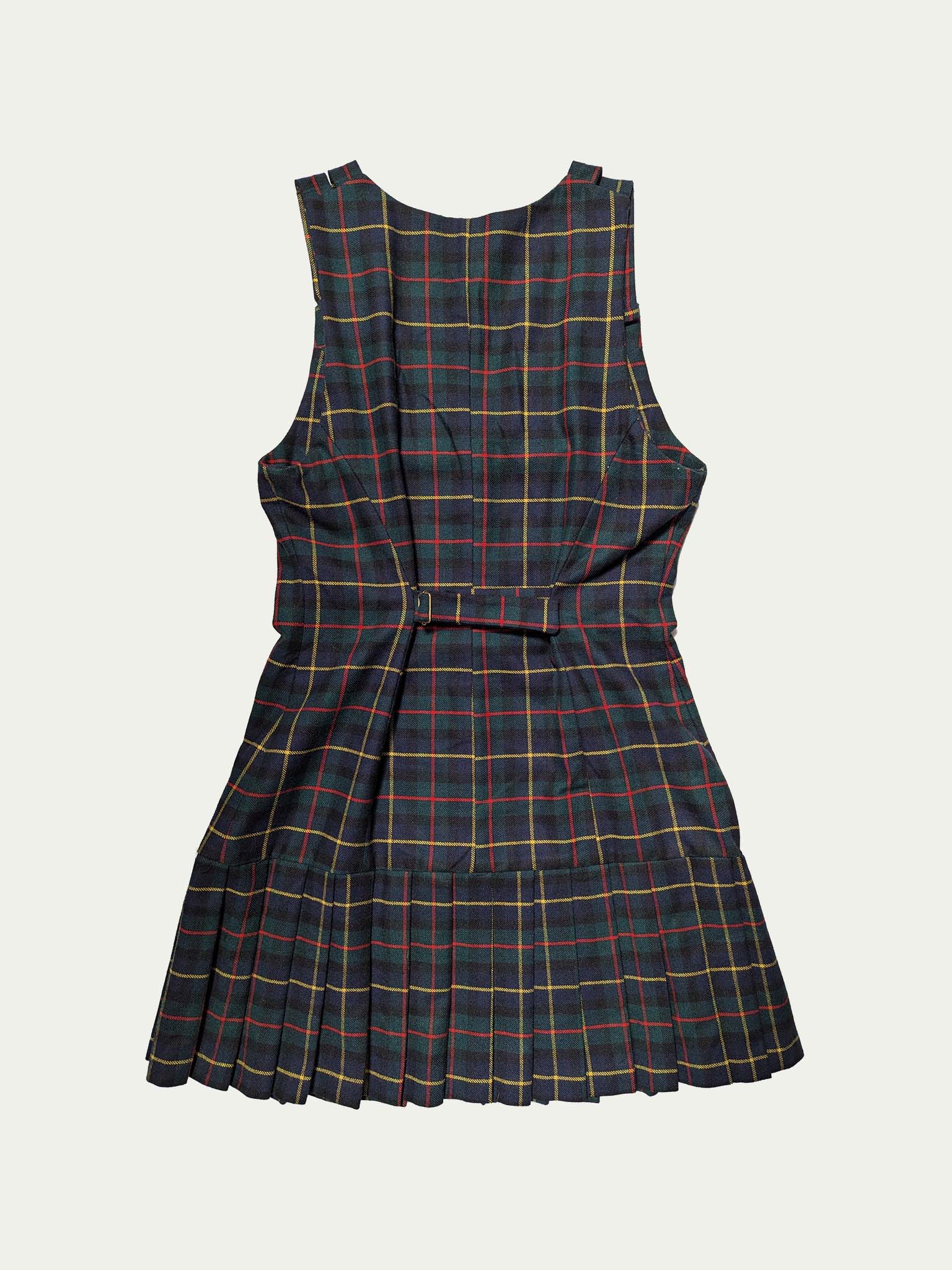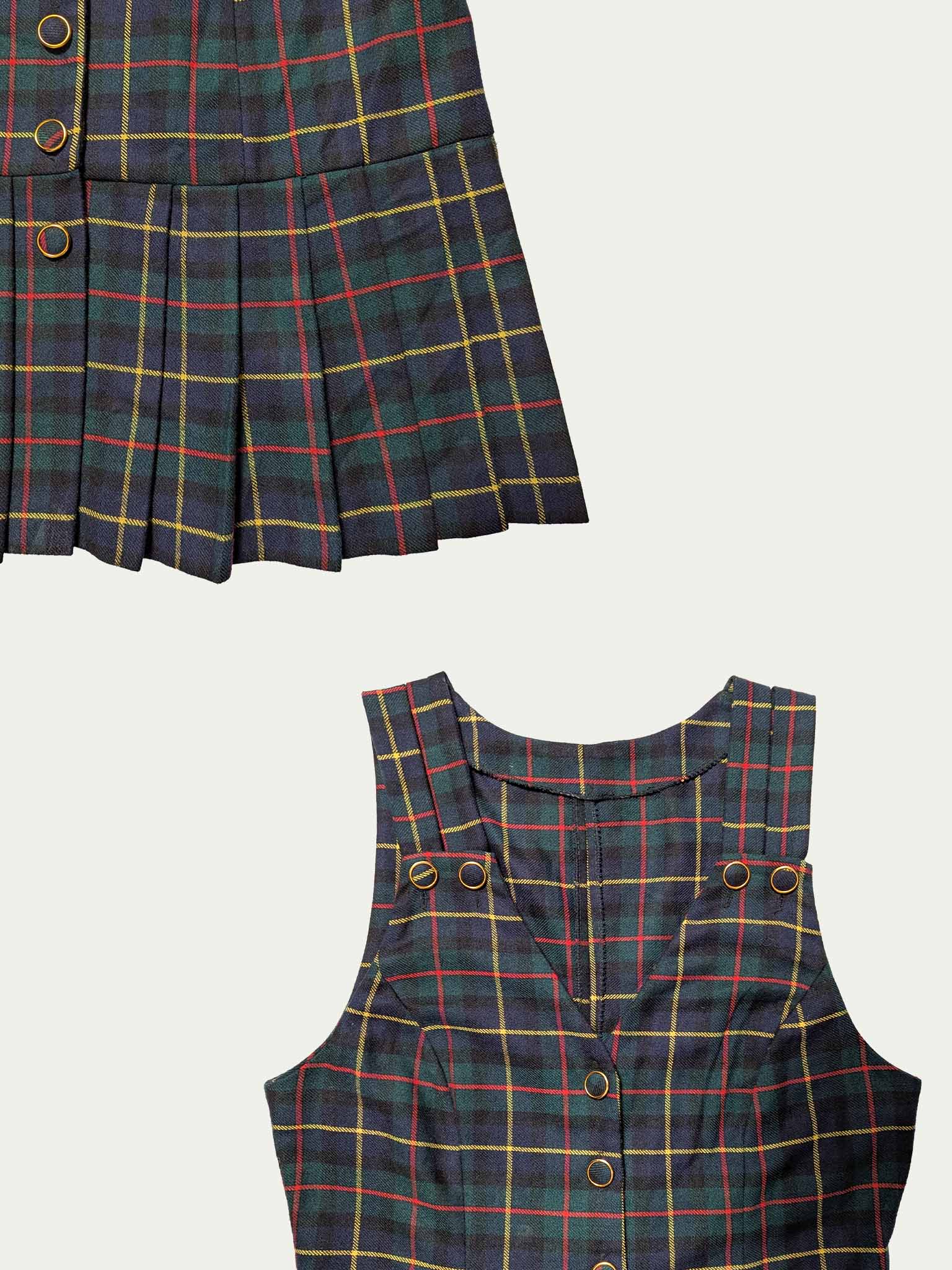שמלת סרפן טרטן קפלים, עשויה מבד משולב צמר, בגווני ירוק-כחול עם נגיעה אדומה-צהובה.