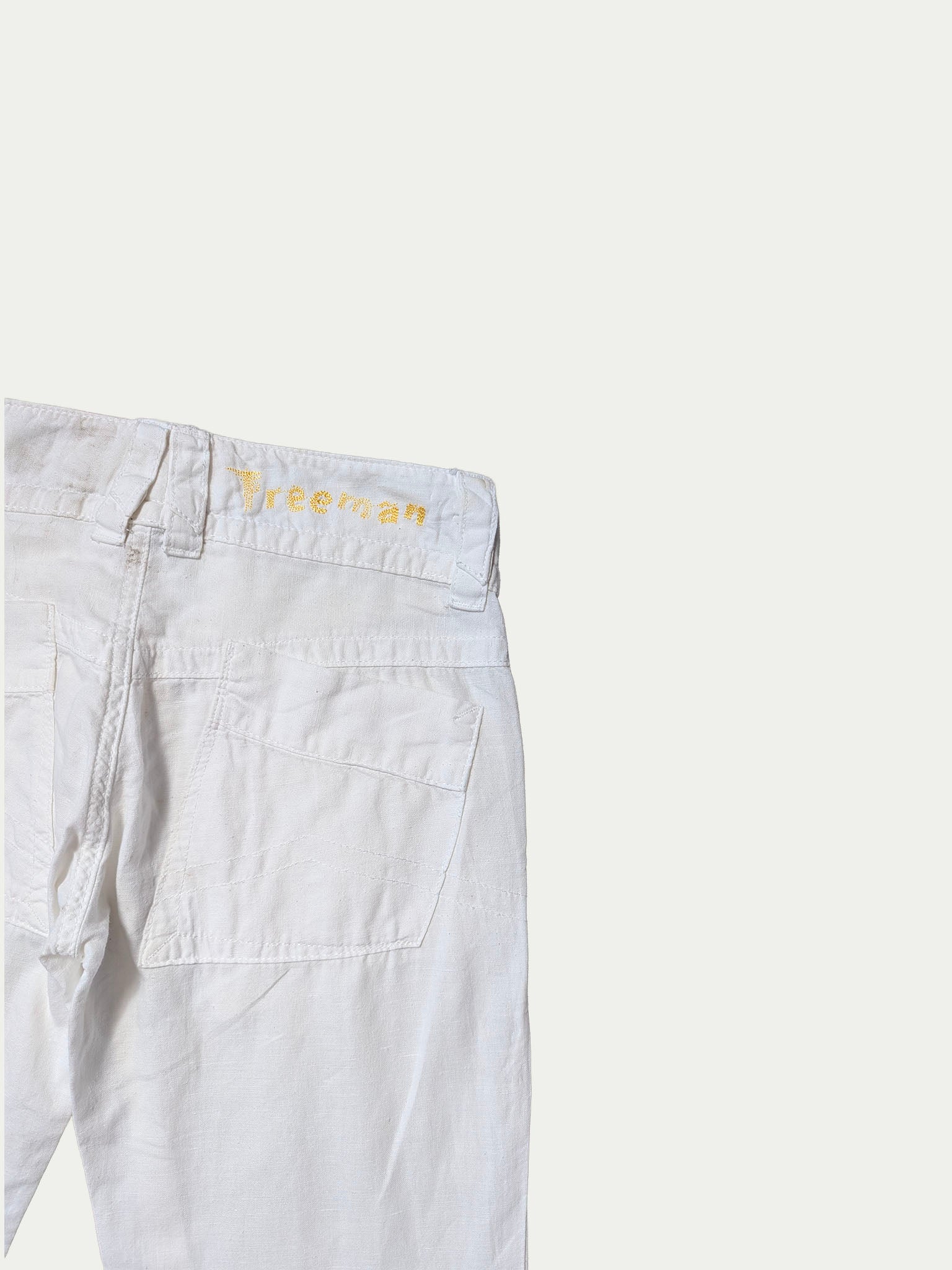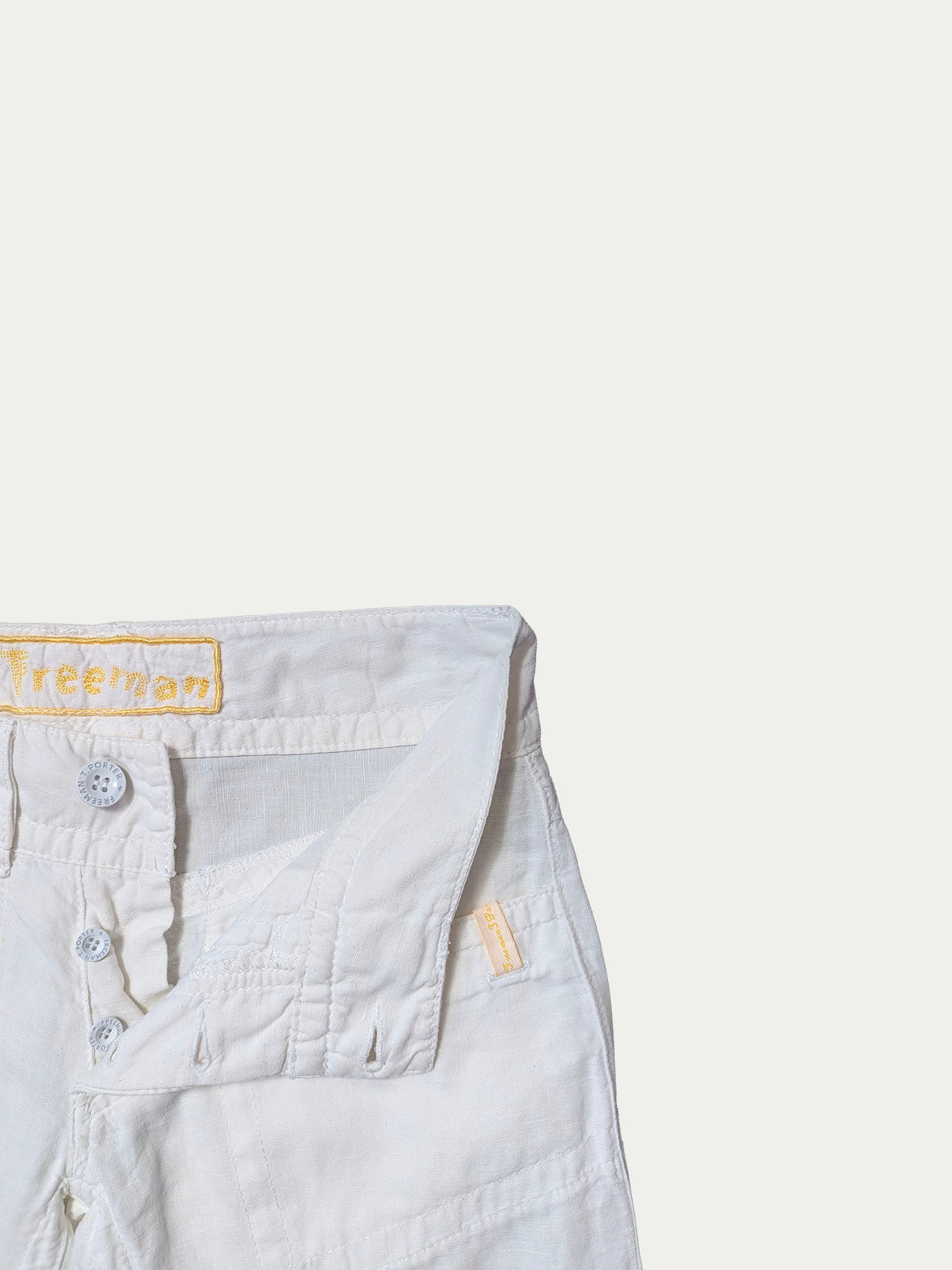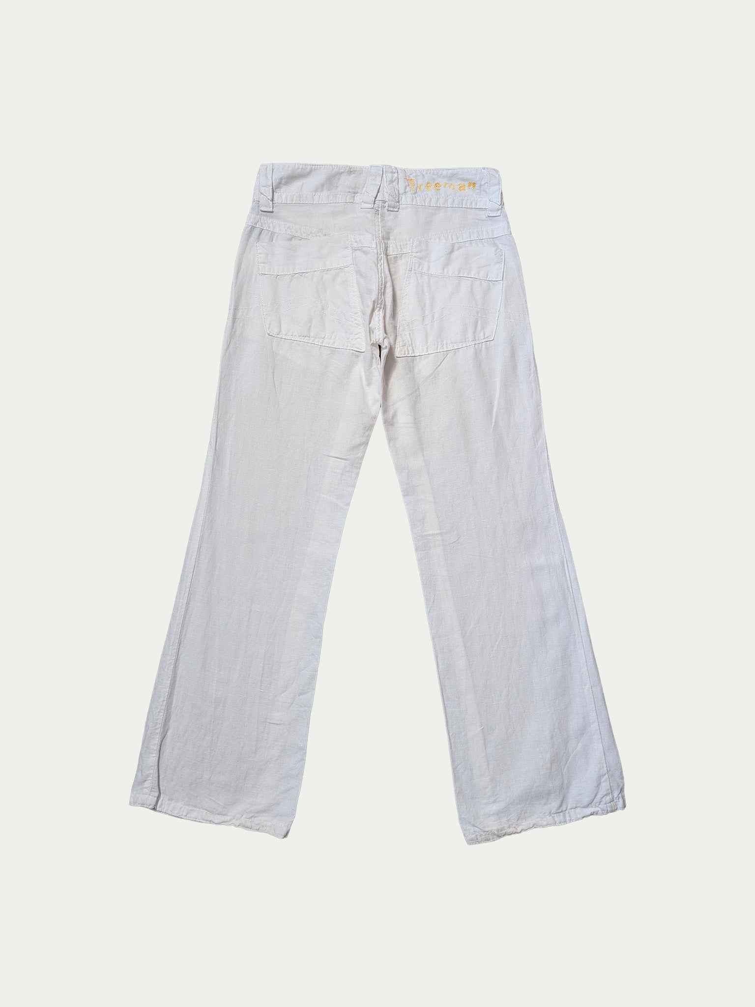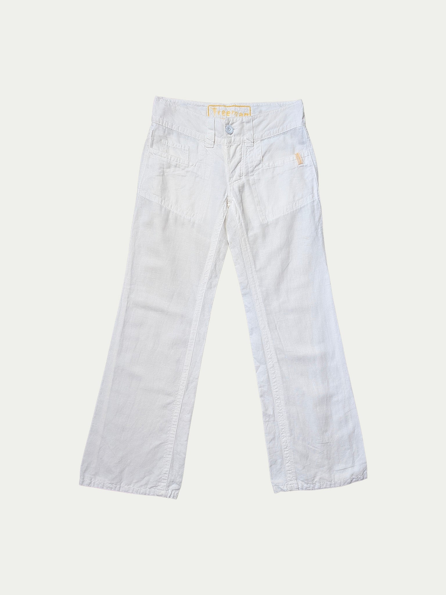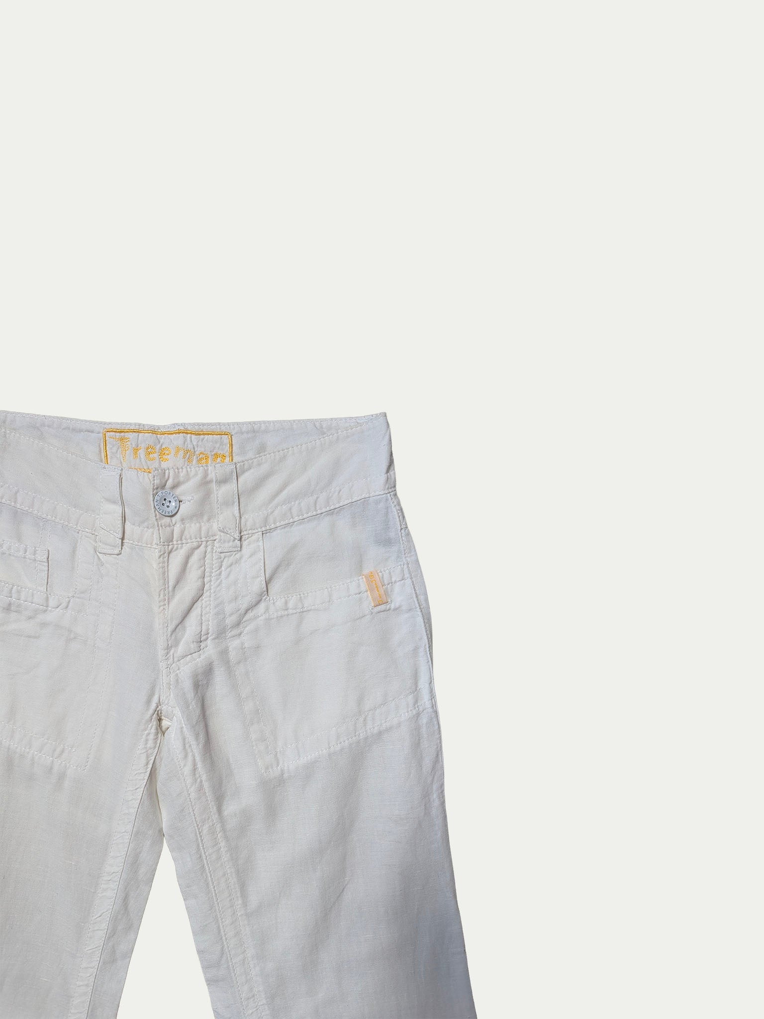 מכנסי דגמ"ח לבנים בגזרה נמוכה של Y2K, עשויים פשתן וויסקוזה, עם כיסים קדמיים ואחוריים בעלי פרטים מגניבים, סגירת כפתור ו-2 כפתורים נסתרים ולולאות לחגורה.