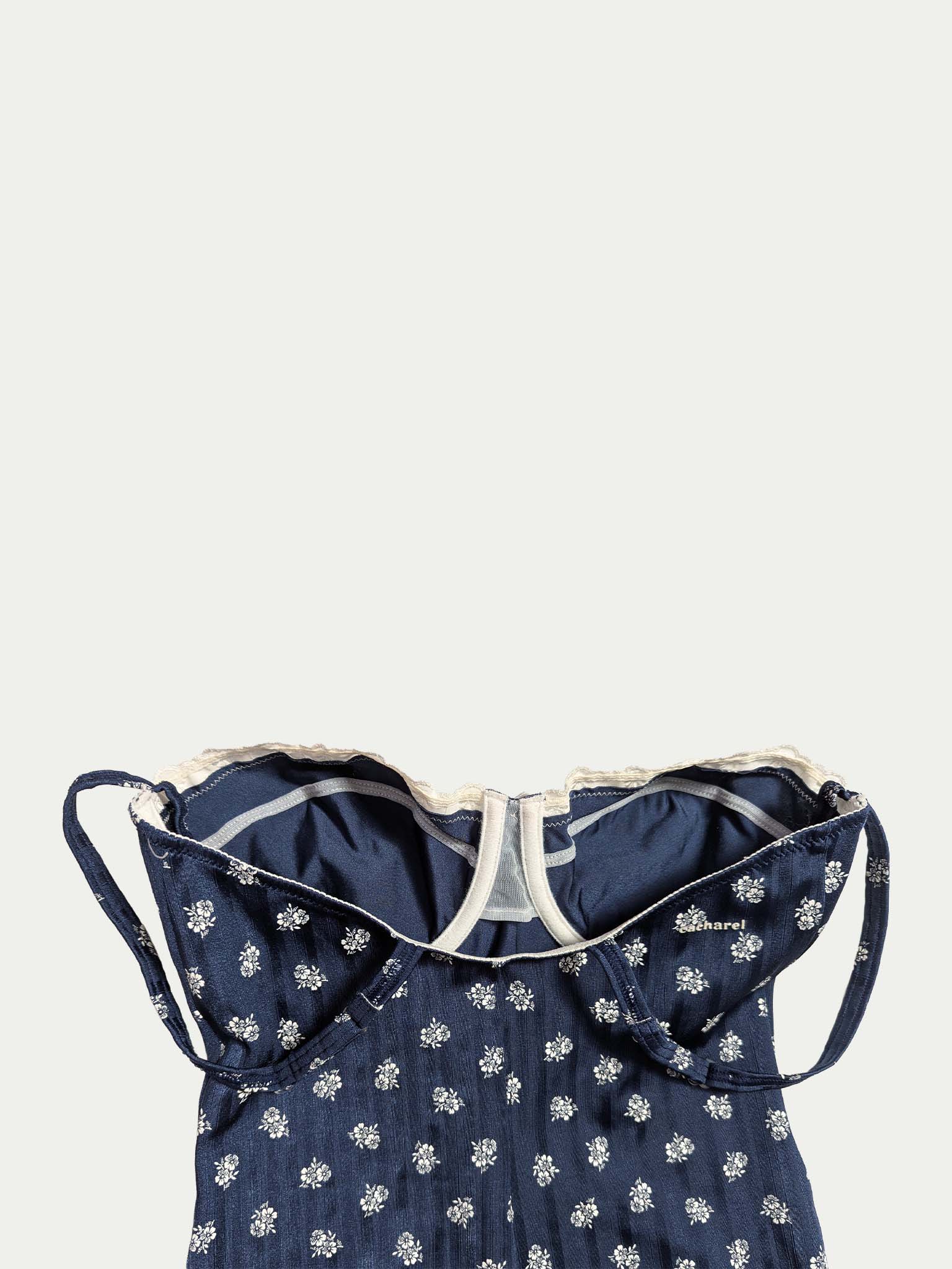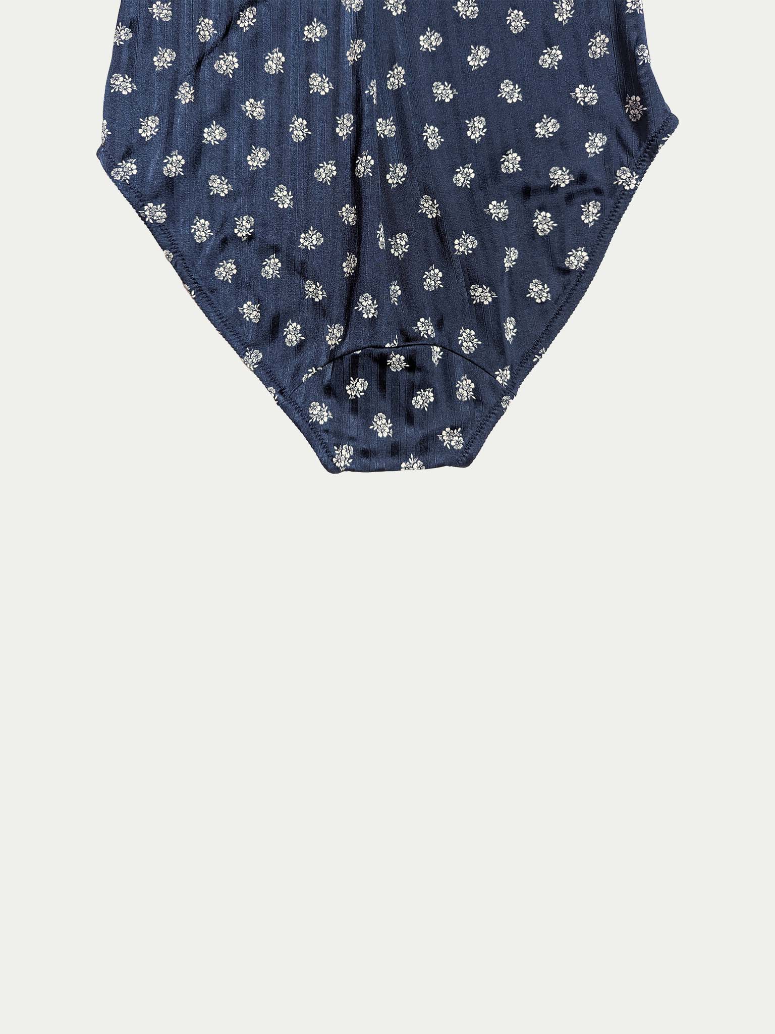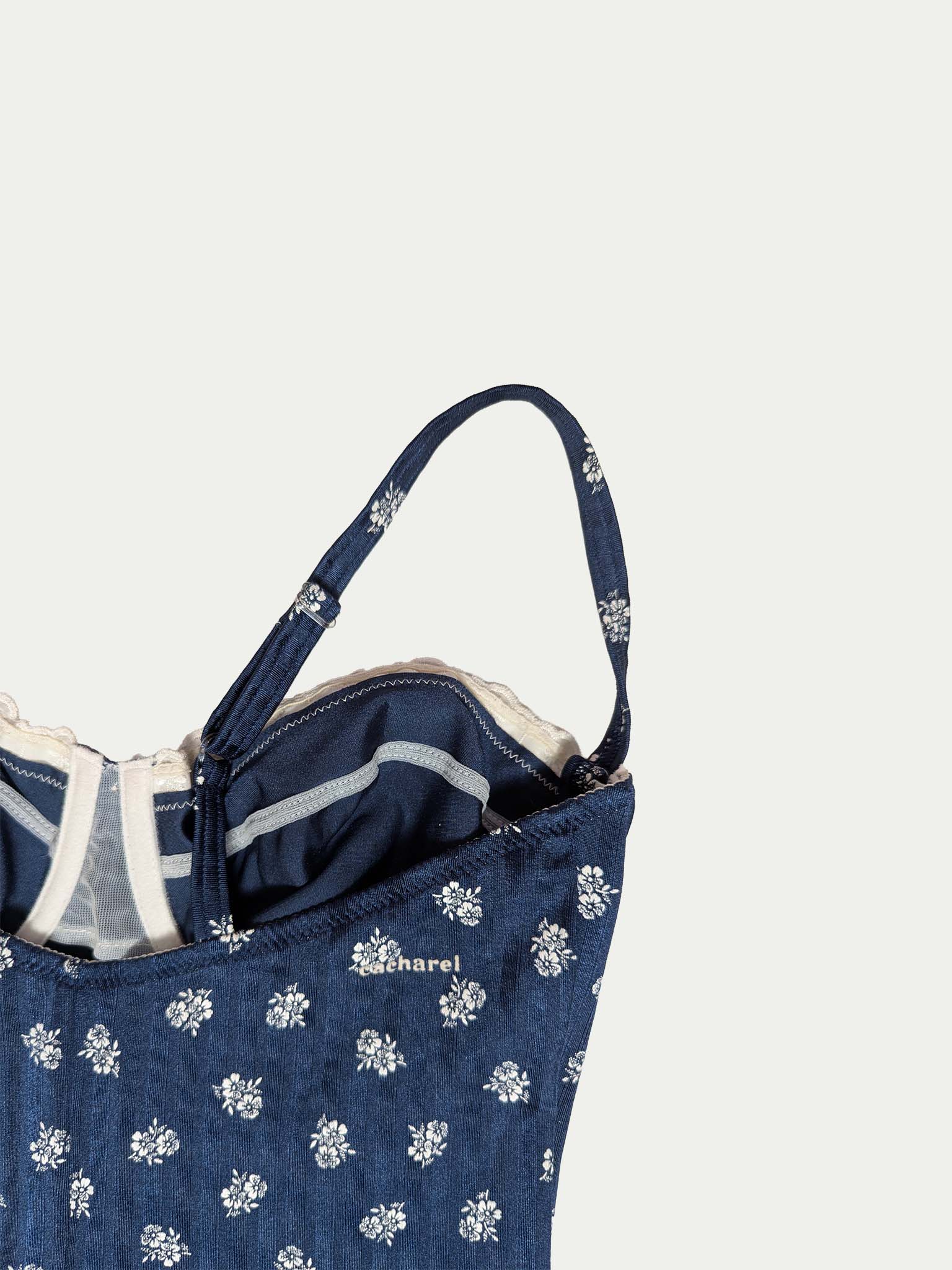 בגד ים קשארל משנות ה-90 בגוון כחול עמוק עם דוגמת פרחים לבנה עדינה. כולל עיצוב בהשראת מחוך עם חזייה מובנית 80C, סגירת כפתורים במפשעה ורצועות מתכווננות לגזרה מעודנת.