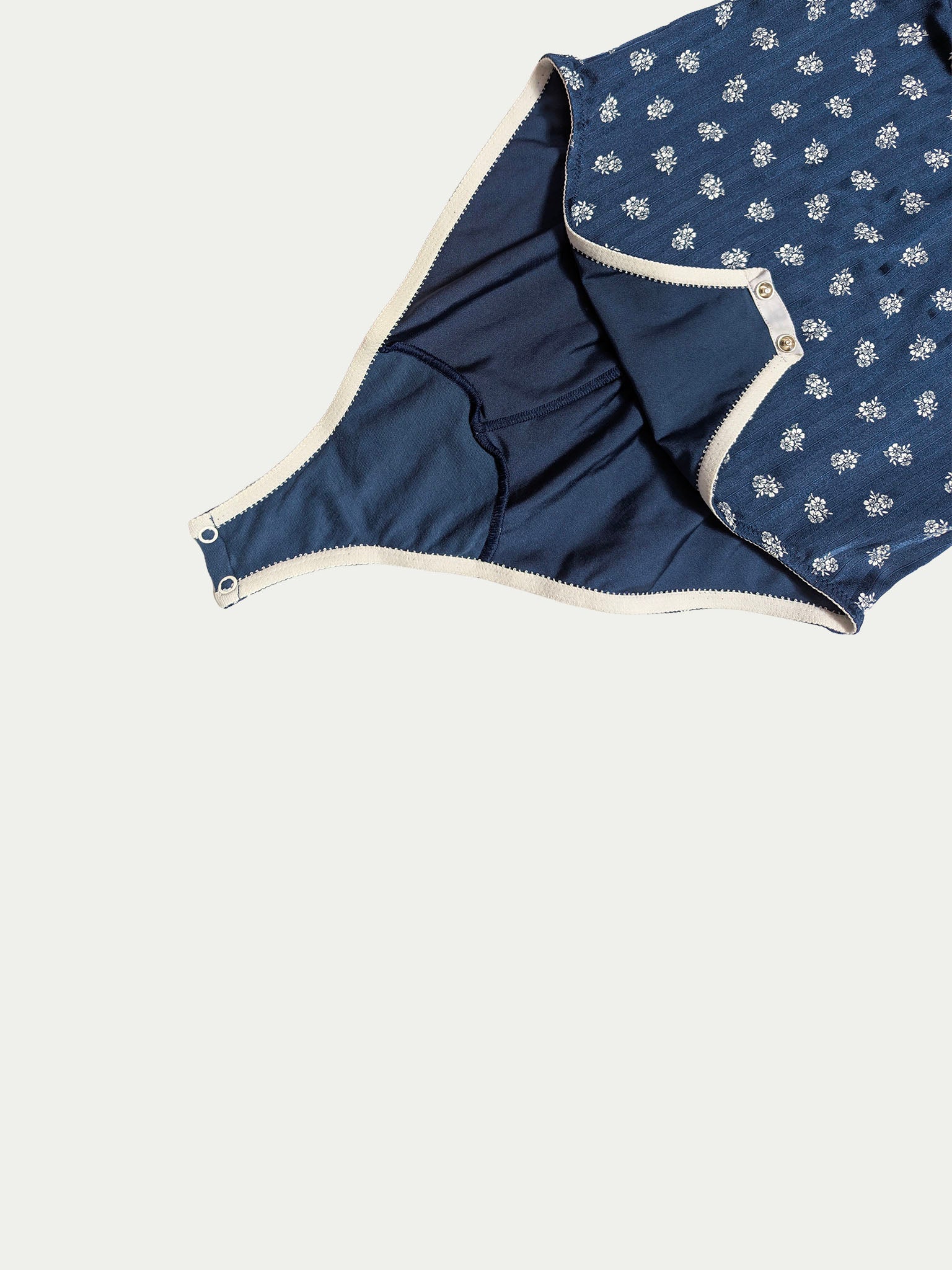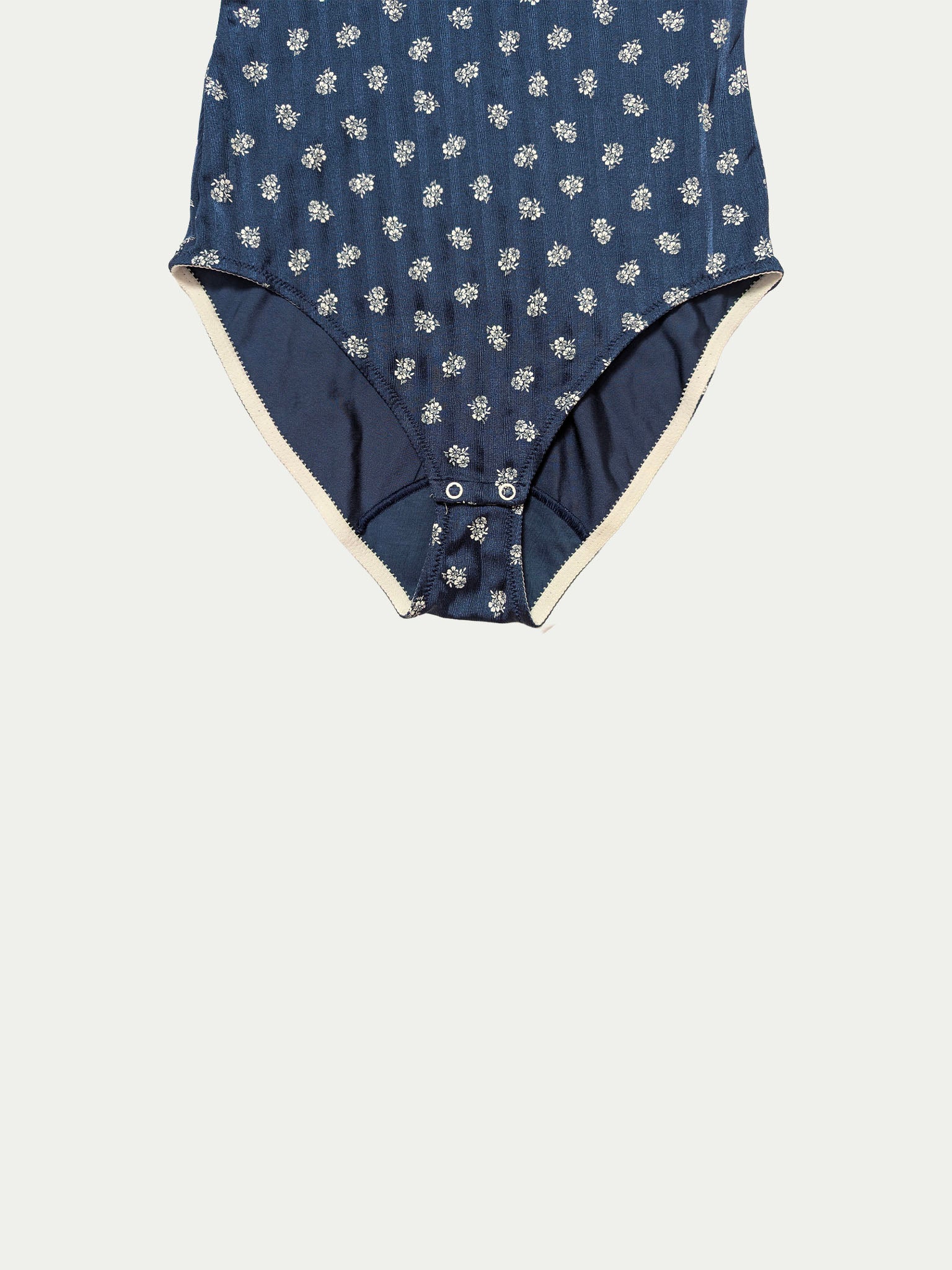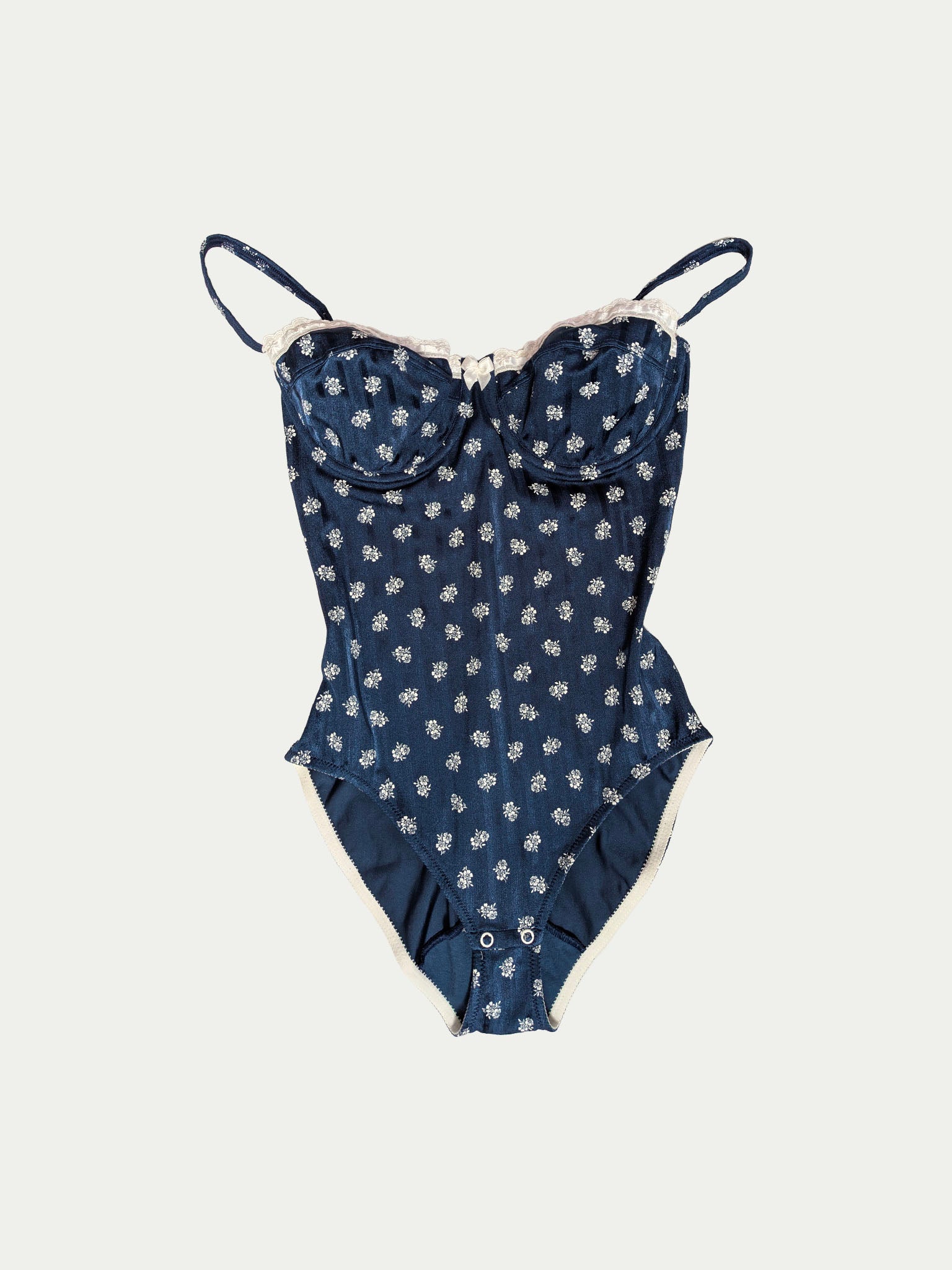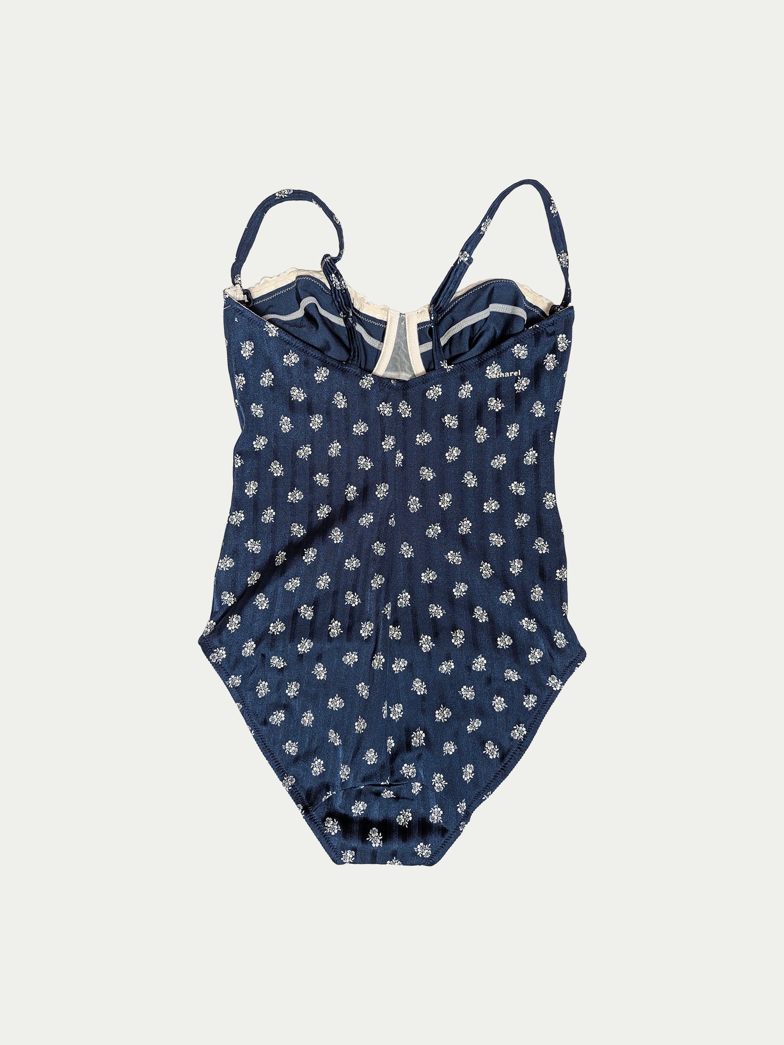 בגד ים קשארל משנות ה-90 בגוון כחול עמוק עם דוגמת פרחים לבנה עדינה. כולל עיצוב בהשראת מחוך עם חזייה מובנית 80C, סגירת כפתורים במפשעה ורצועות מתכווננות לגזרה מעודנת.