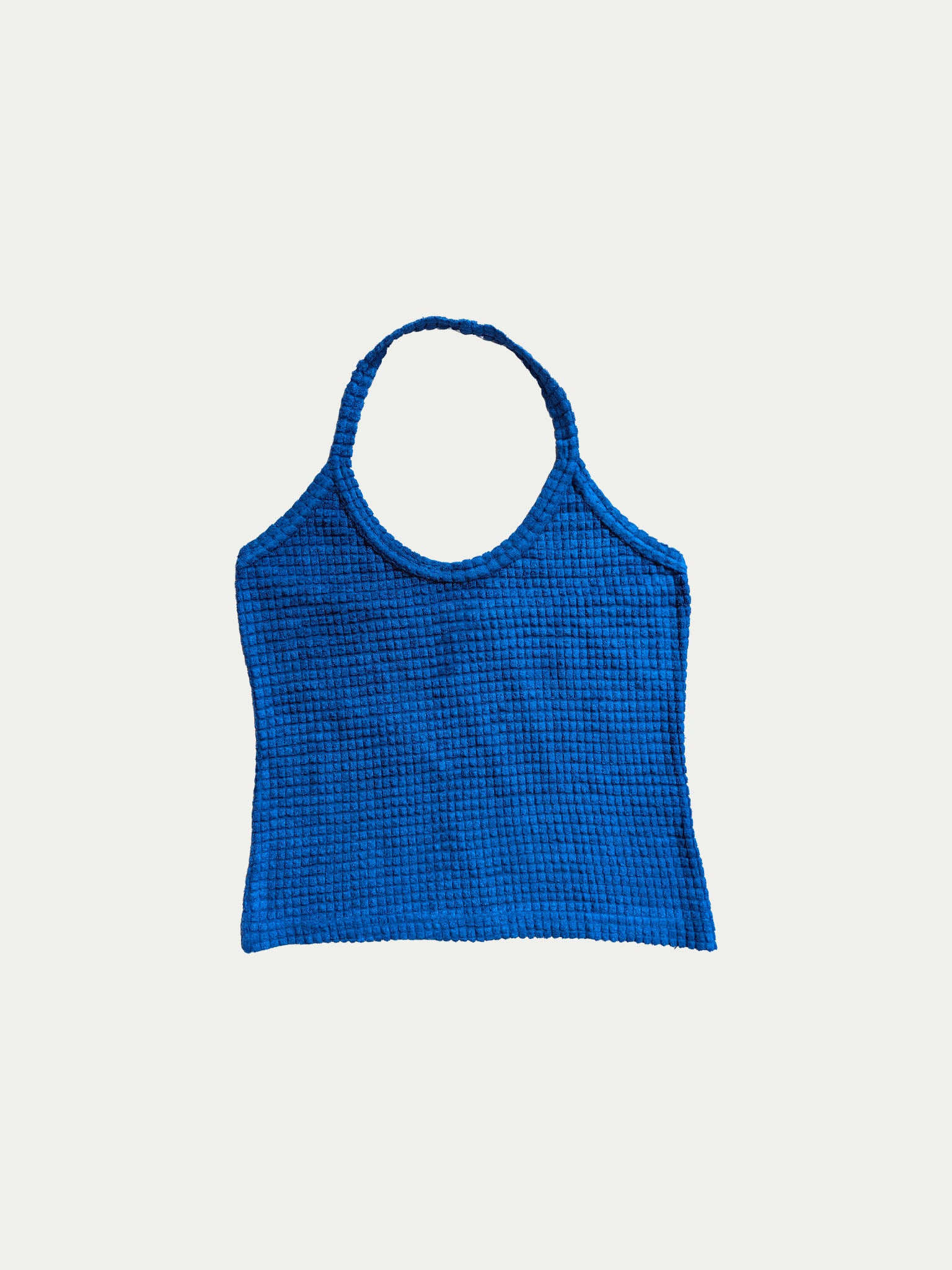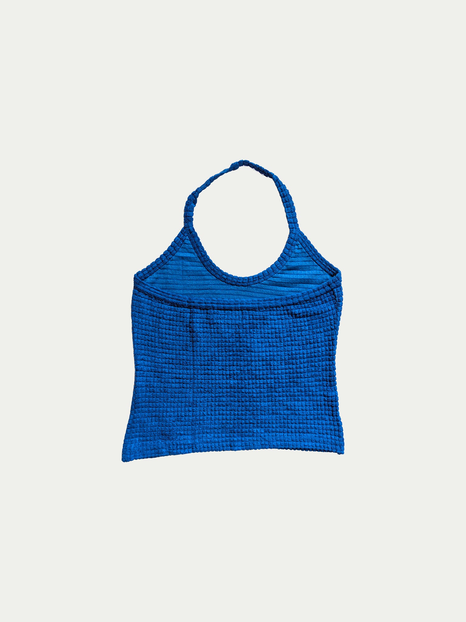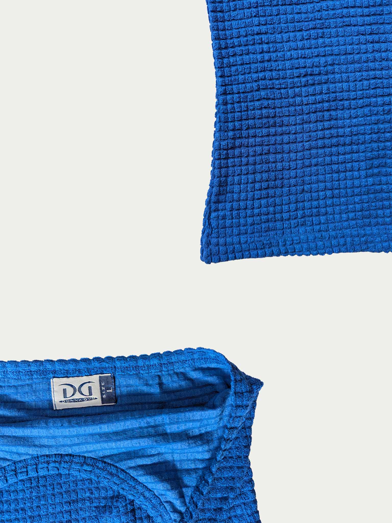 טופ קרופ-טופ בצבע תכלת בולט מבד ייחודי דמוי מגבת בעל מרקם ריבועי. גמיש, אך עם היקף צווארון קטן יחסית - מתאים ביותר לגוף נמוך יותר וחזה קטן עד בינוני.