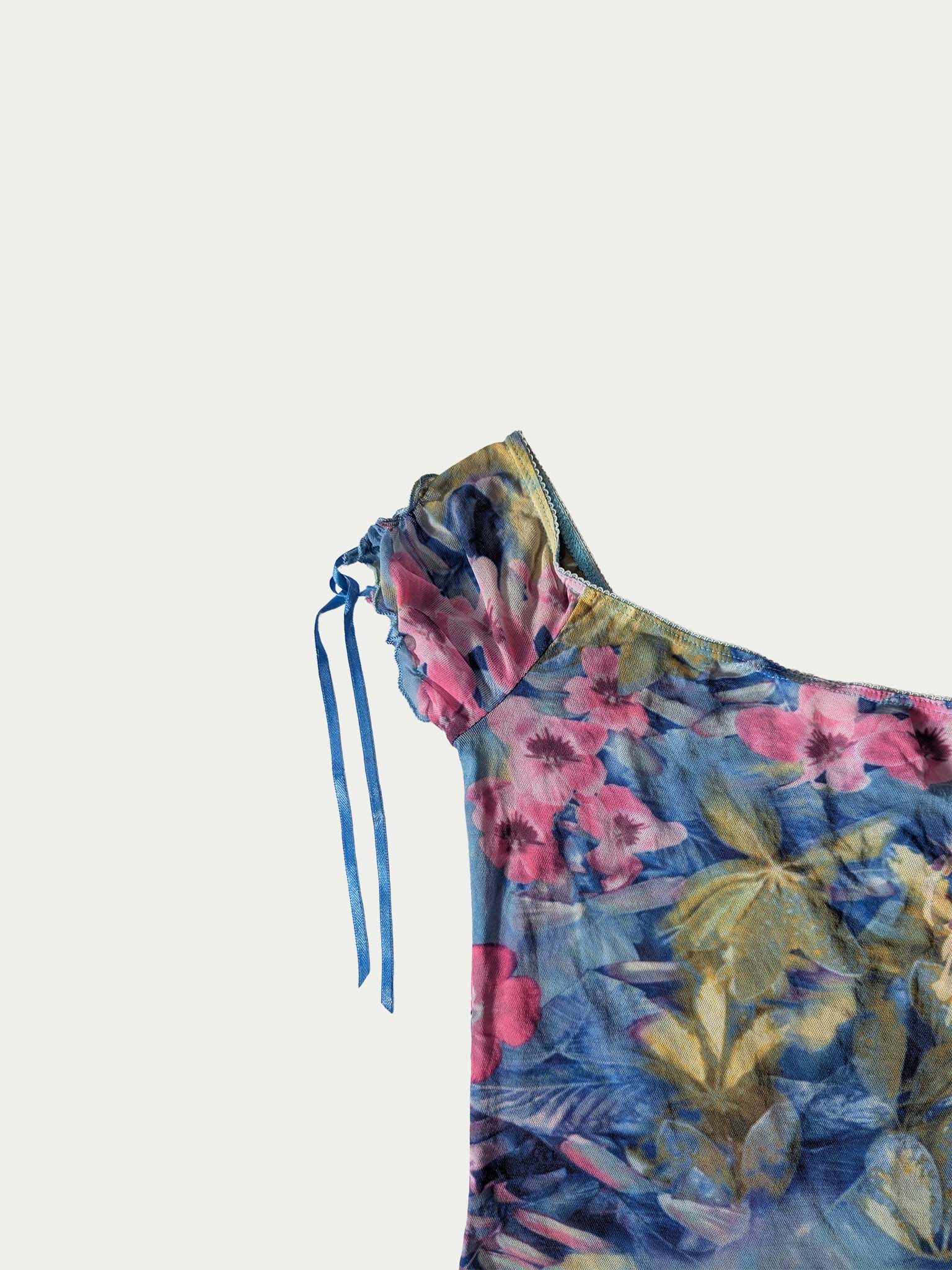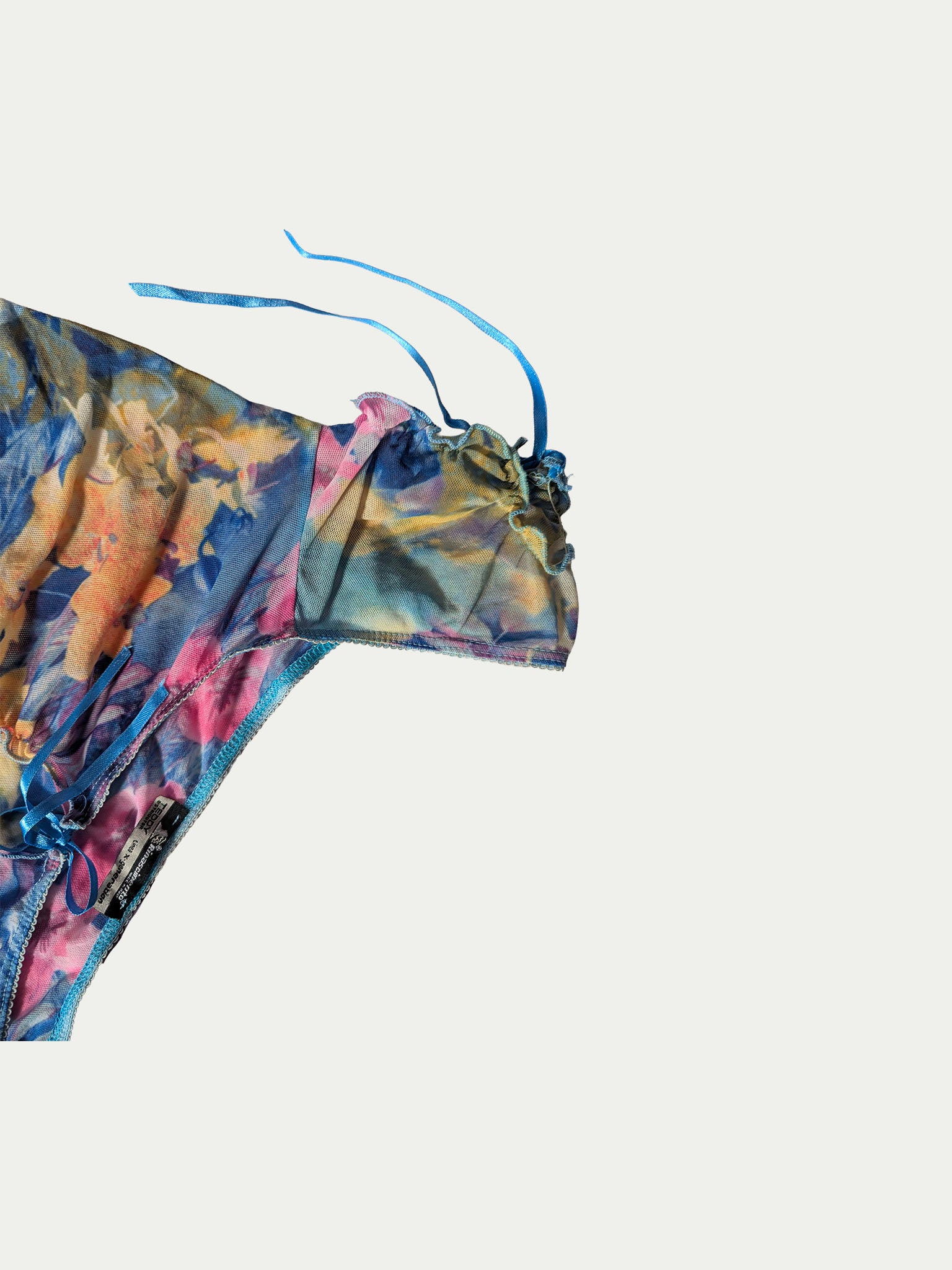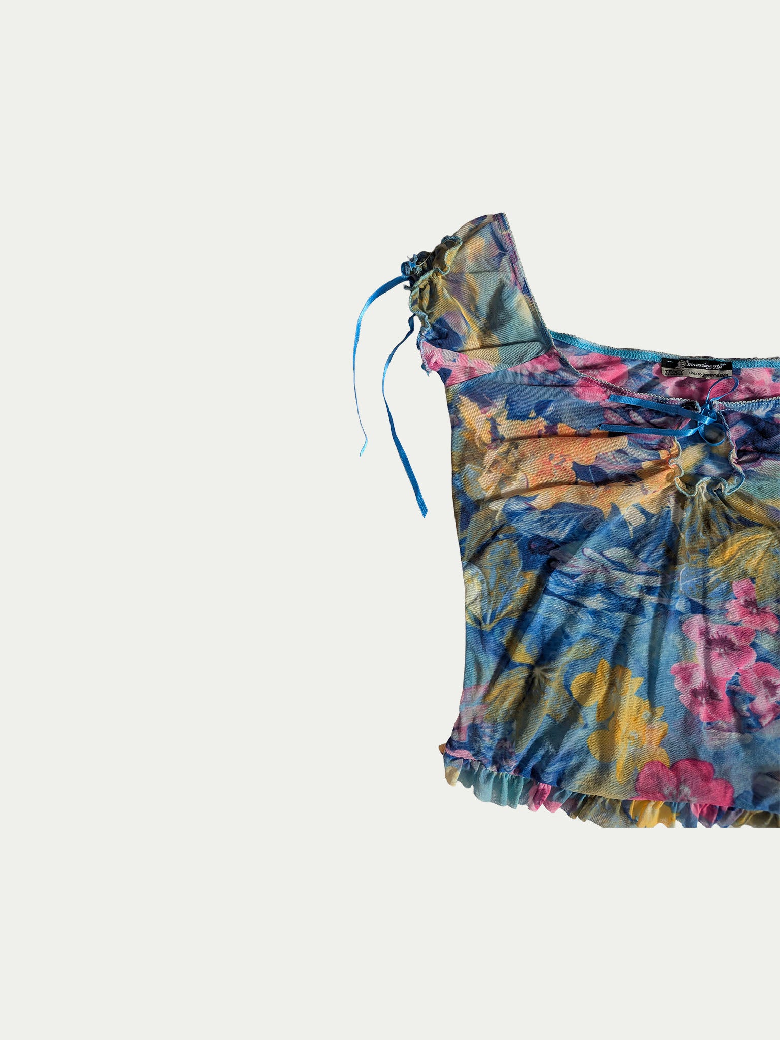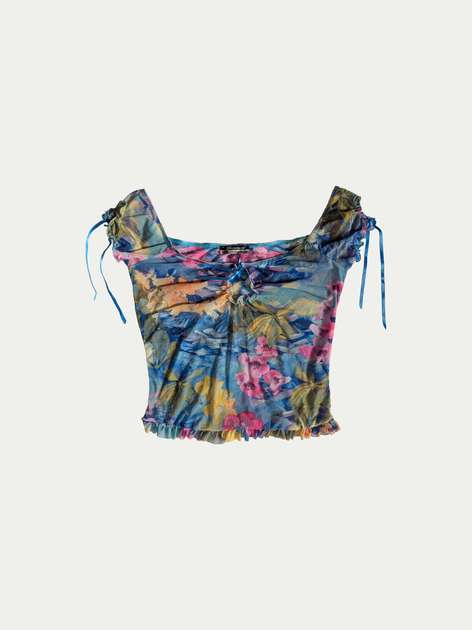 טופ רשת חלומי משנות ה-90 של רינה סימנטו, בעל הדפס פרחוני צבעוני ותוסס בסגנון הוואי. מעוצב עם פרטי סרט עדינים בפתחי השרוולים ובמחשוף, גימור קפלים במכפלת וצווארון נשי רחב שניתן ללבוש כמעט מחוץ לכתפיים.