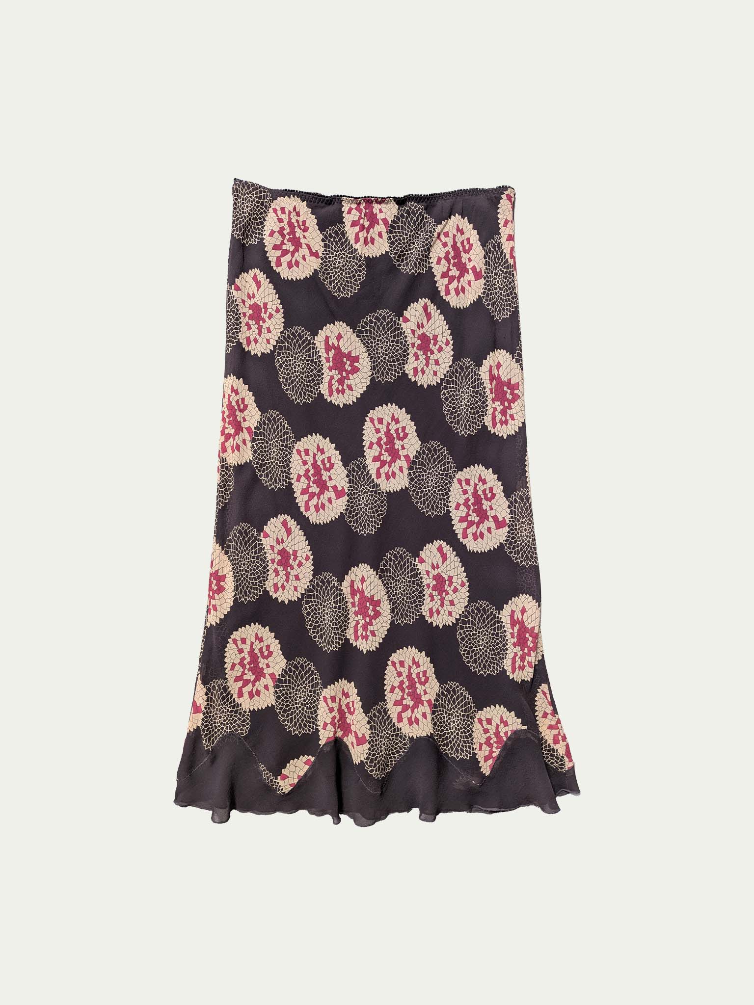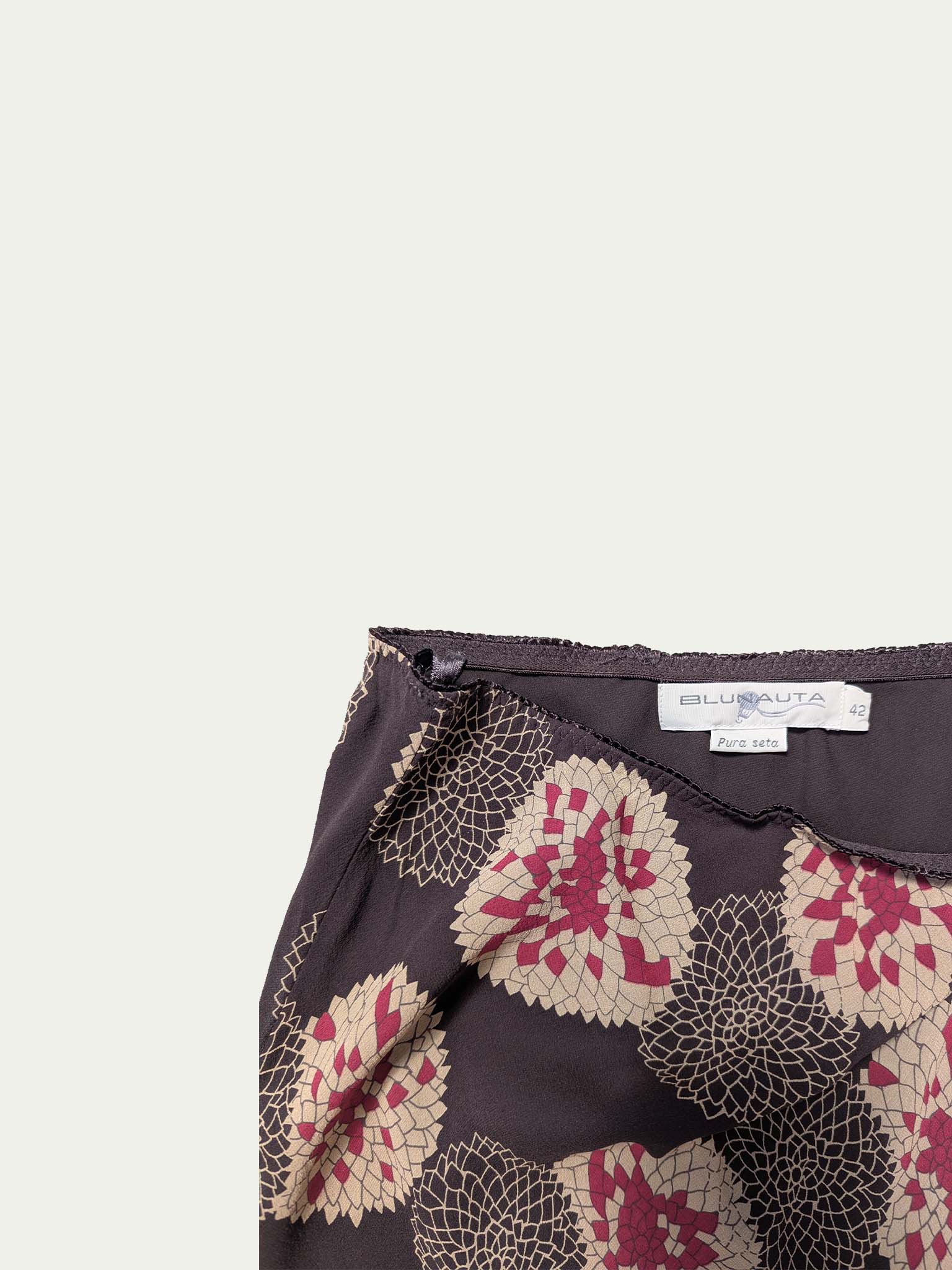 90s silk printed skirt by Blunauta in rich brown tones with a subtle red touch in the print.