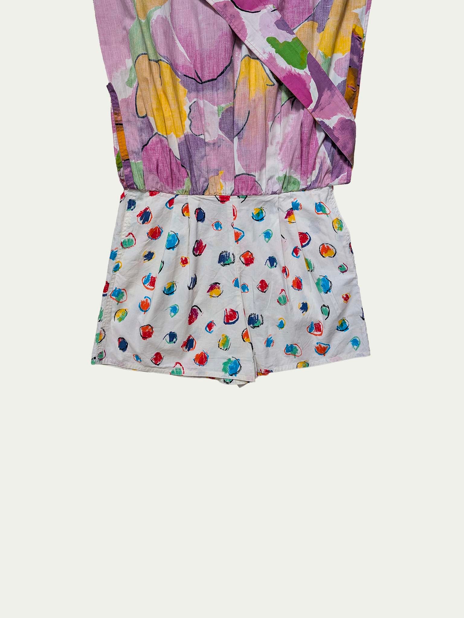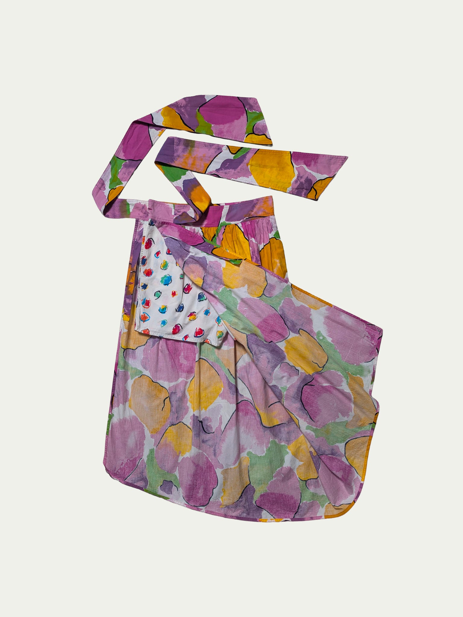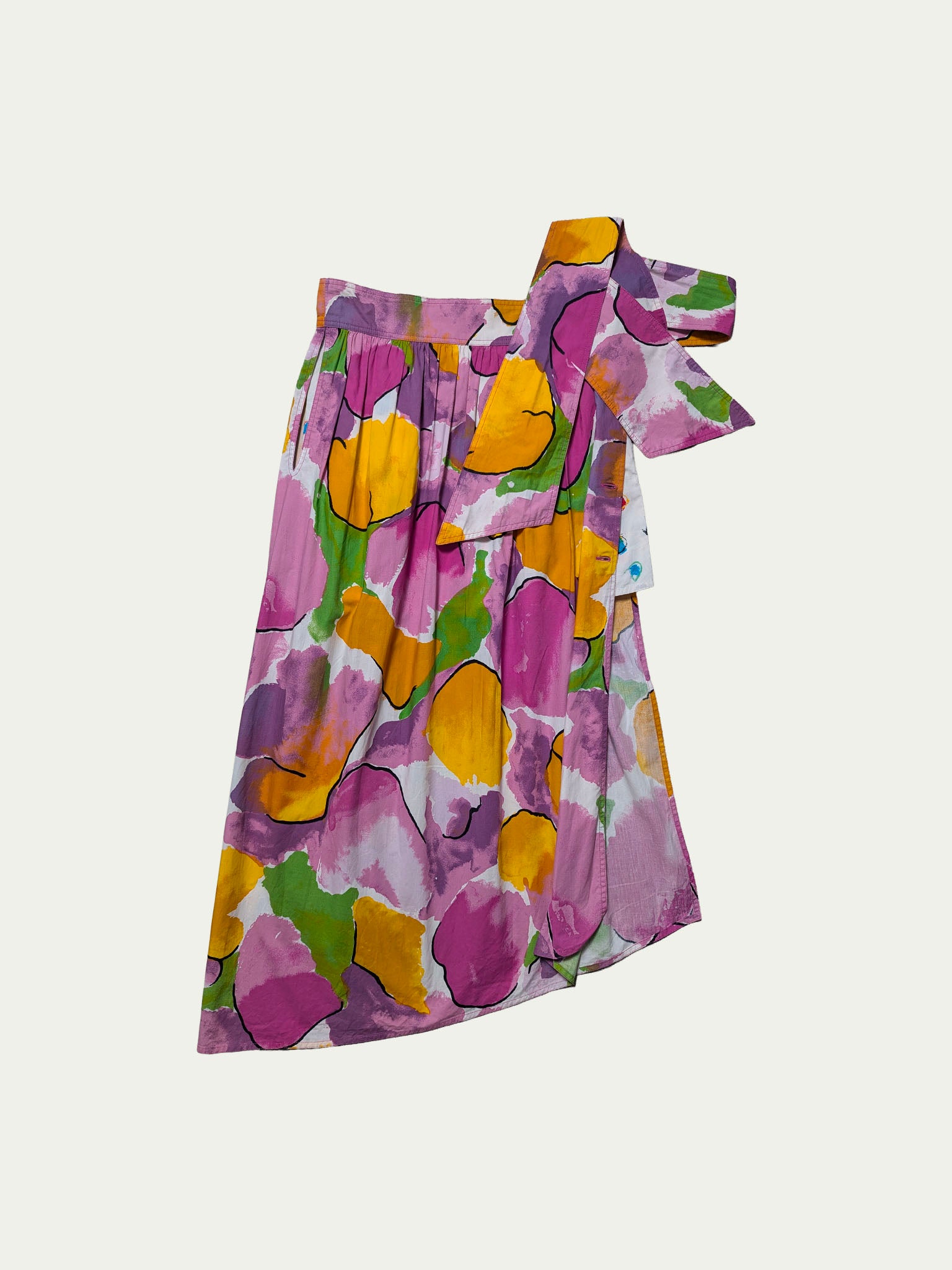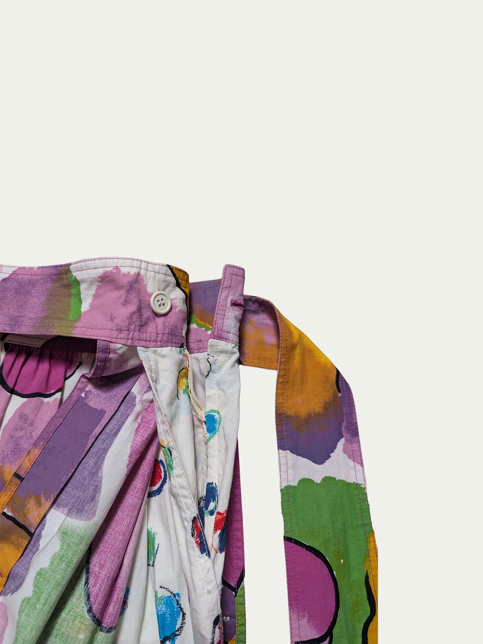 Emanuel Ungaro early 90s statement skirt featuring an original colorful abstract print. Classic high-rise fit with a wide waistband and extra-long, wide tie straps. Unique half-length button side closure allows the option to leave an extended side slit. Designed with a diagonal hemline, two pockets, and - best of all - hidden cotton shorts underneath in a completely different vibrant print. A playful, versatile piece full of character.