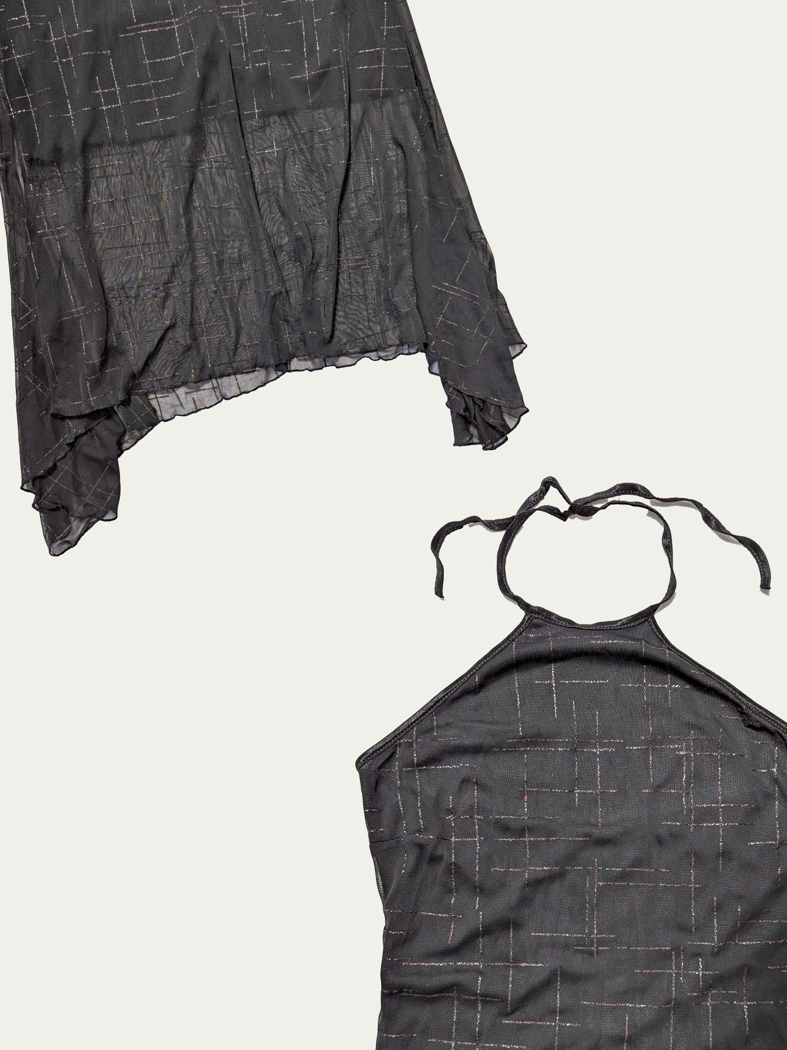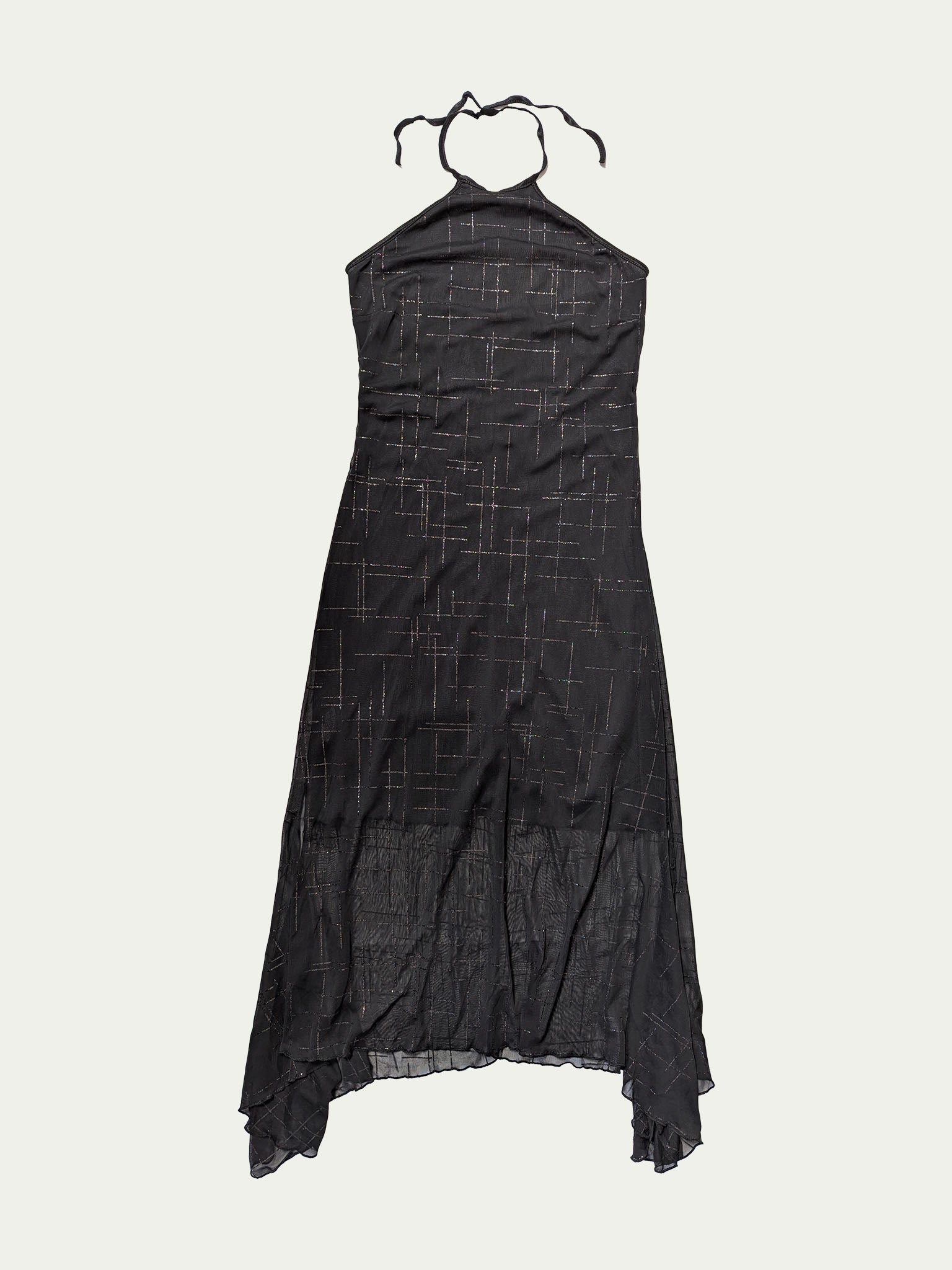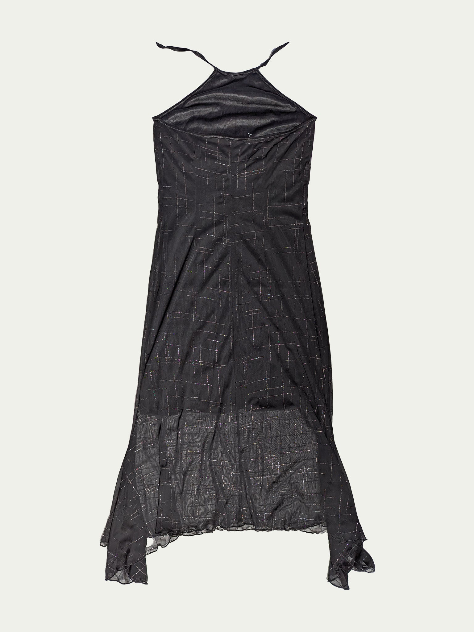 90's evening collar dress, made of a black sheer slightly-elastic fabric, with a glittering textured pattern.