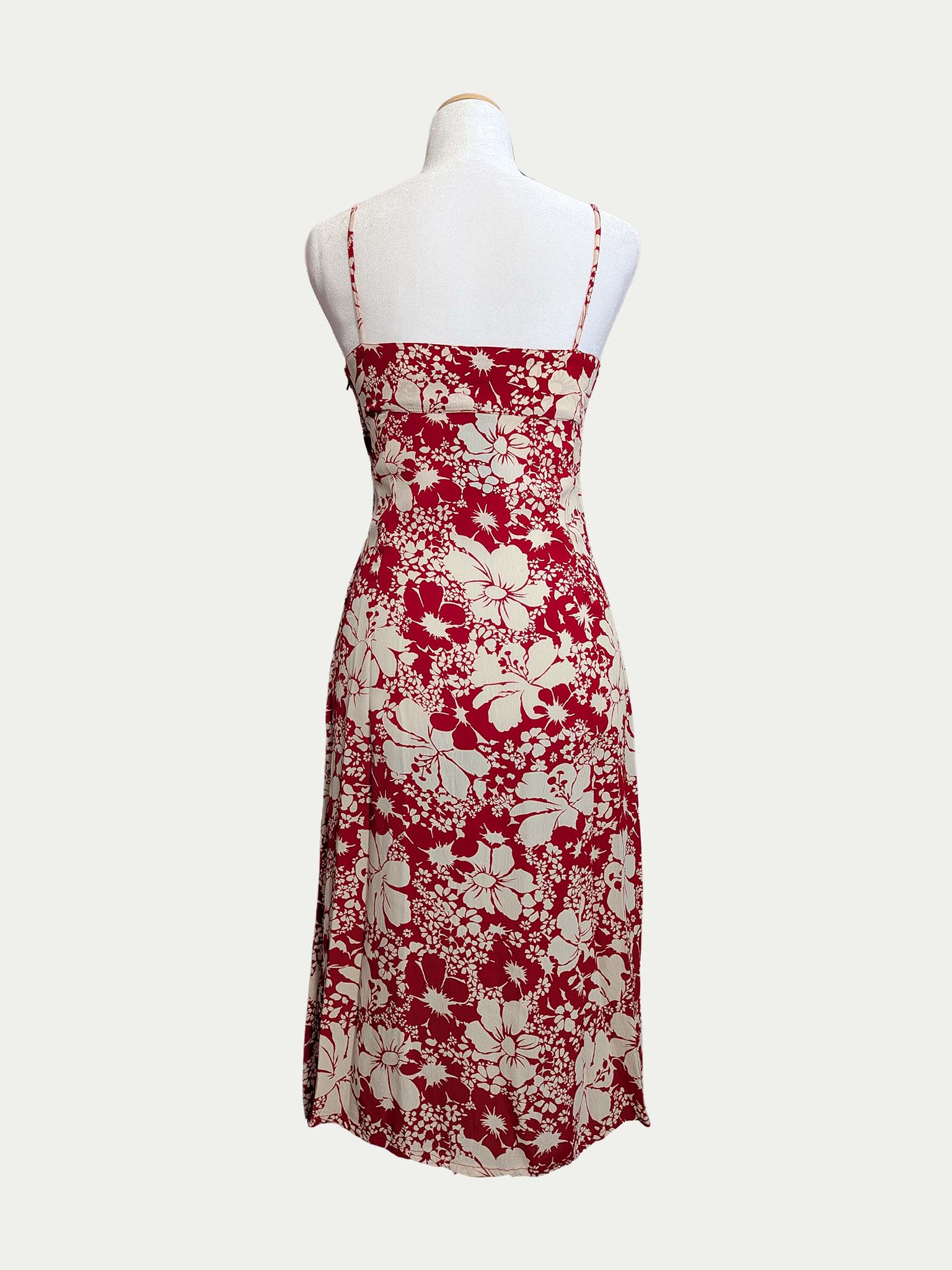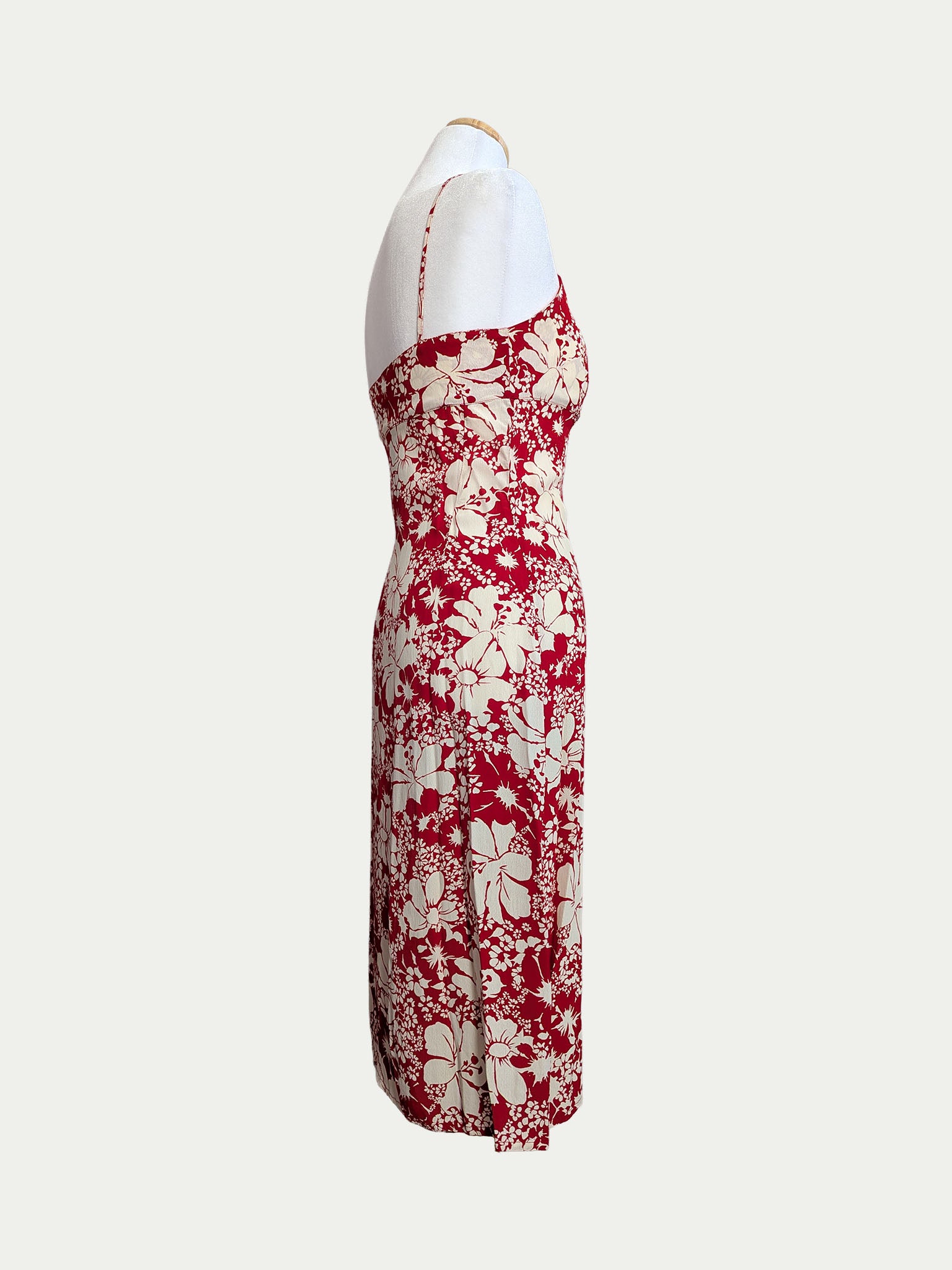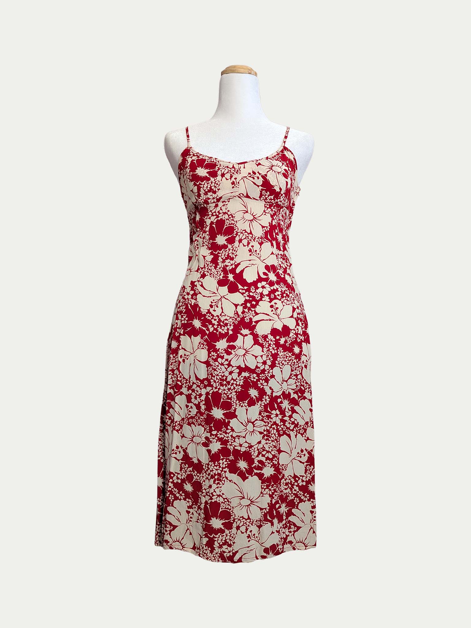 Late 90s midi dress by Hennes, featuring a deep red and white floral print. Made of high-quality viscose with a double-layered chest. Finished with a side zipper and hook closure for a smooth, flattering fit.