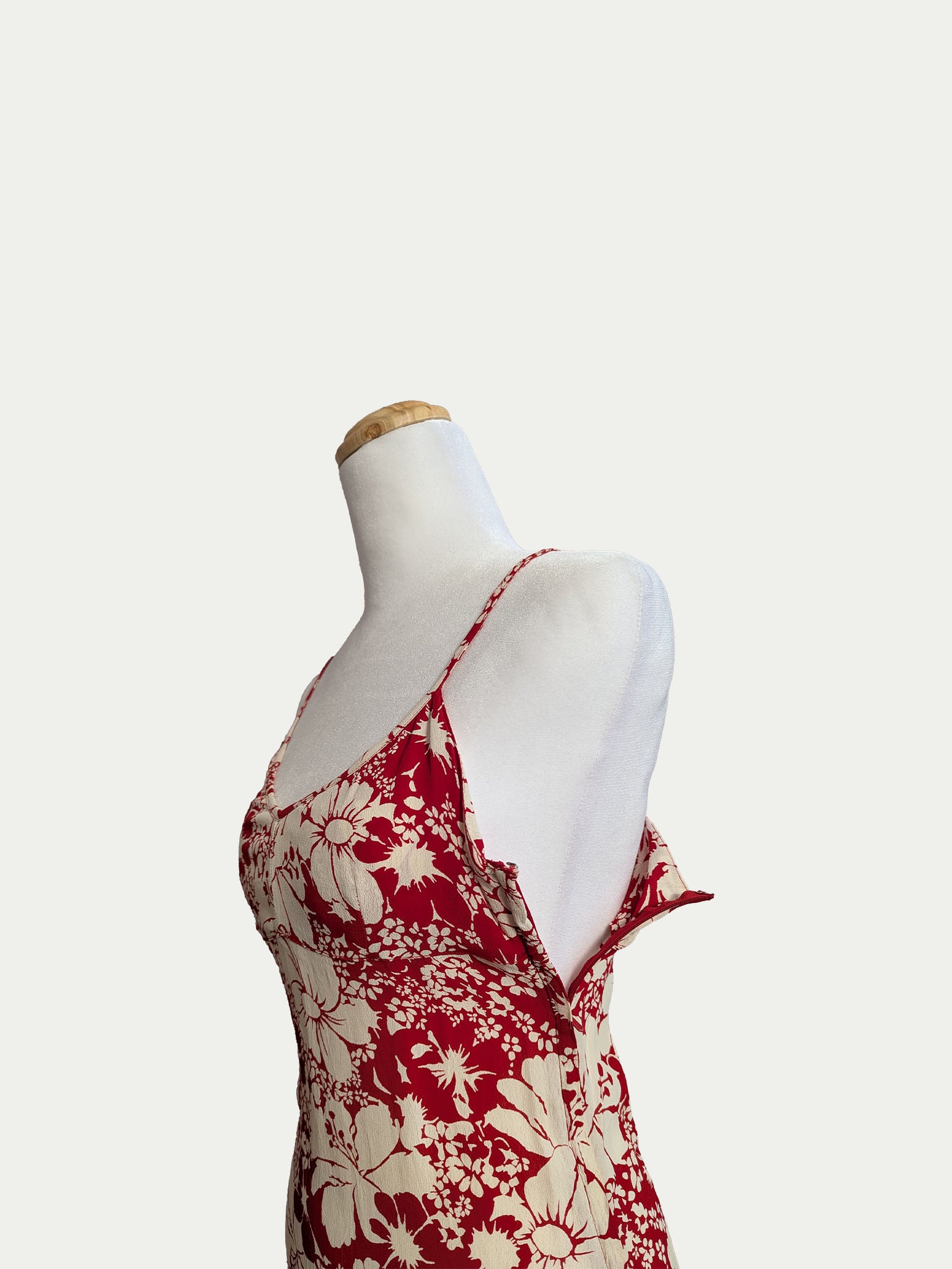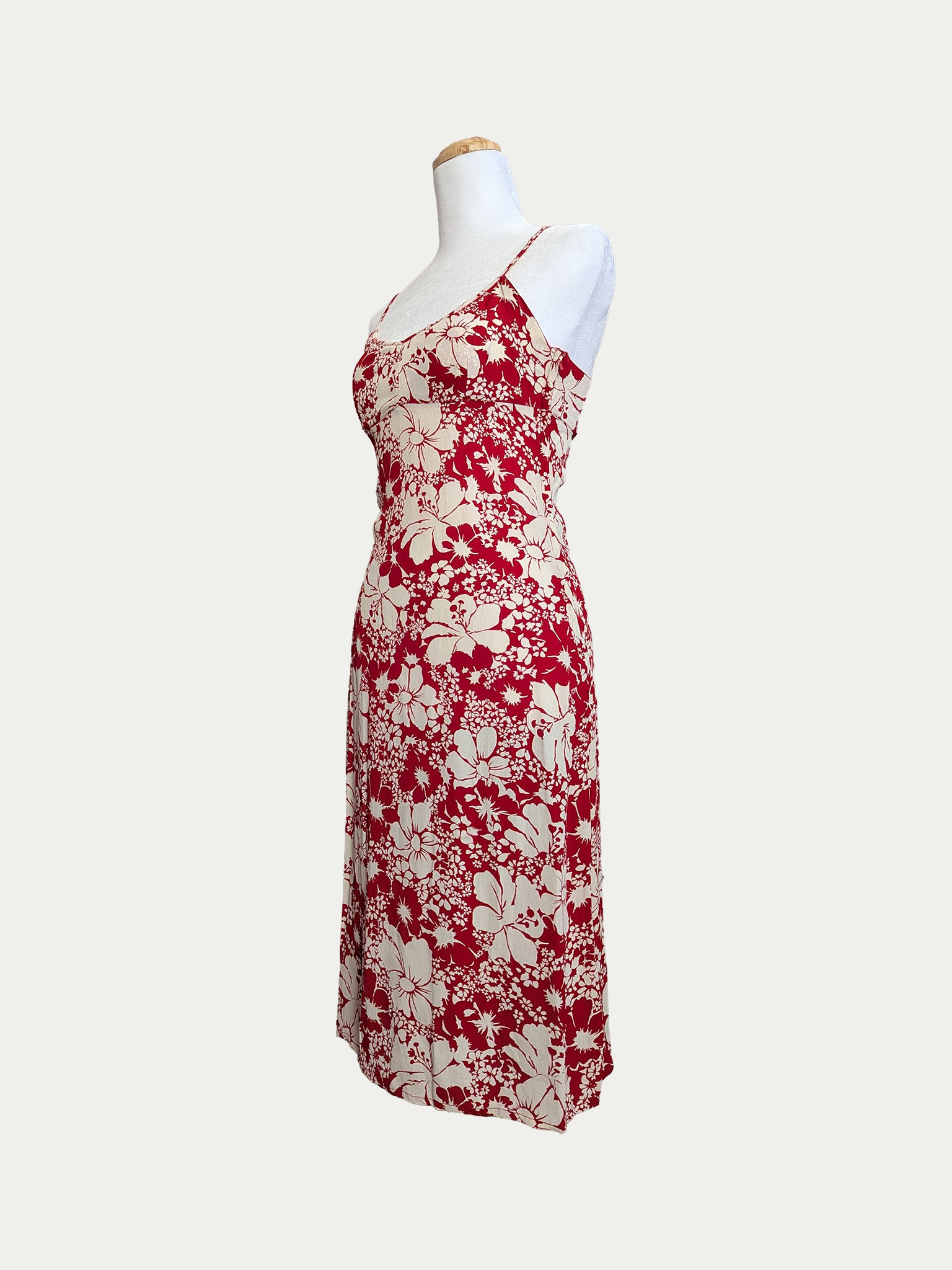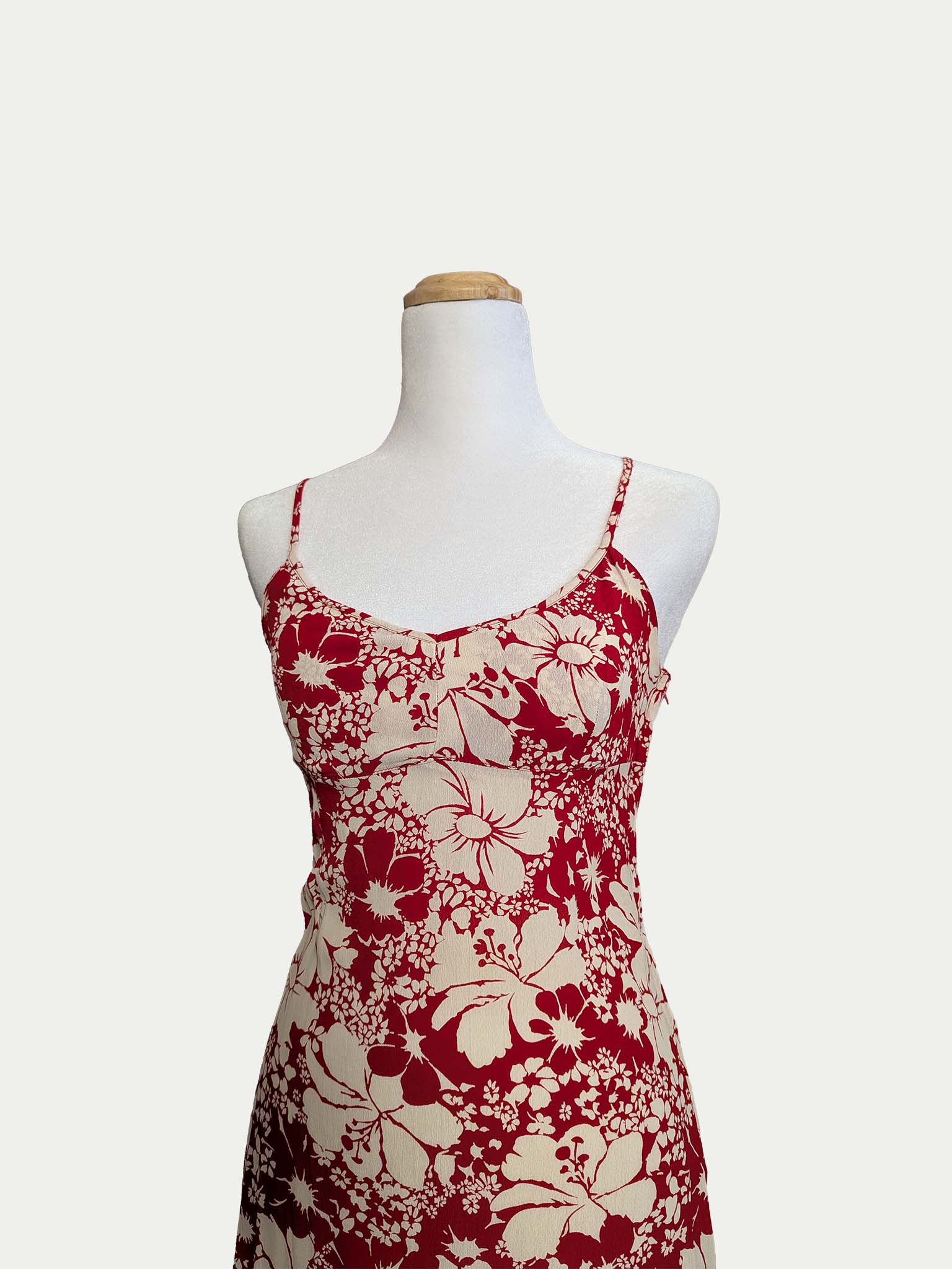 Late 90s midi dress by Hennes, featuring a deep red and white floral print. Made of high-quality viscose with a double-layered chest. Finished with a side zipper and hook closure for a smooth, flattering fit.