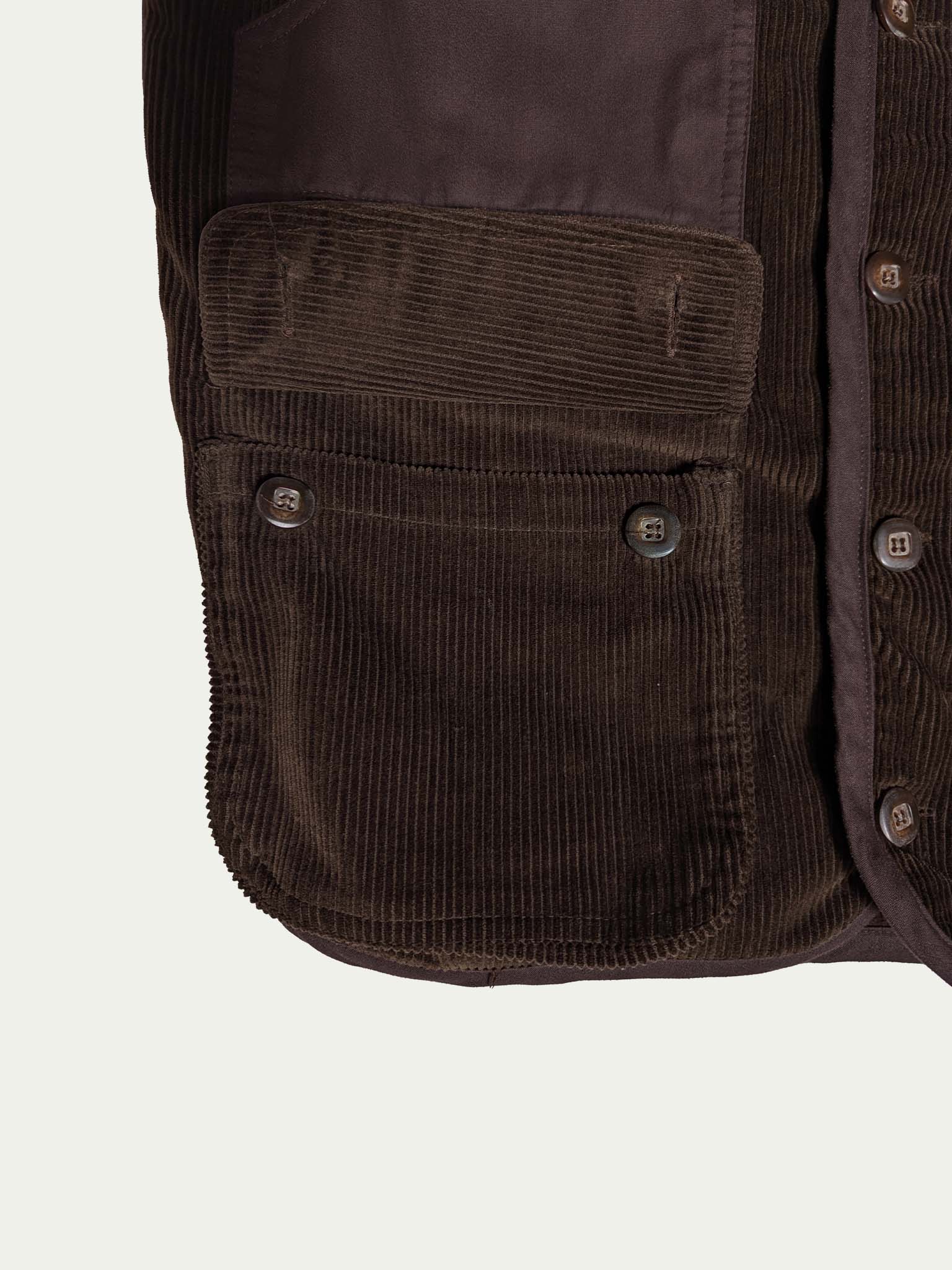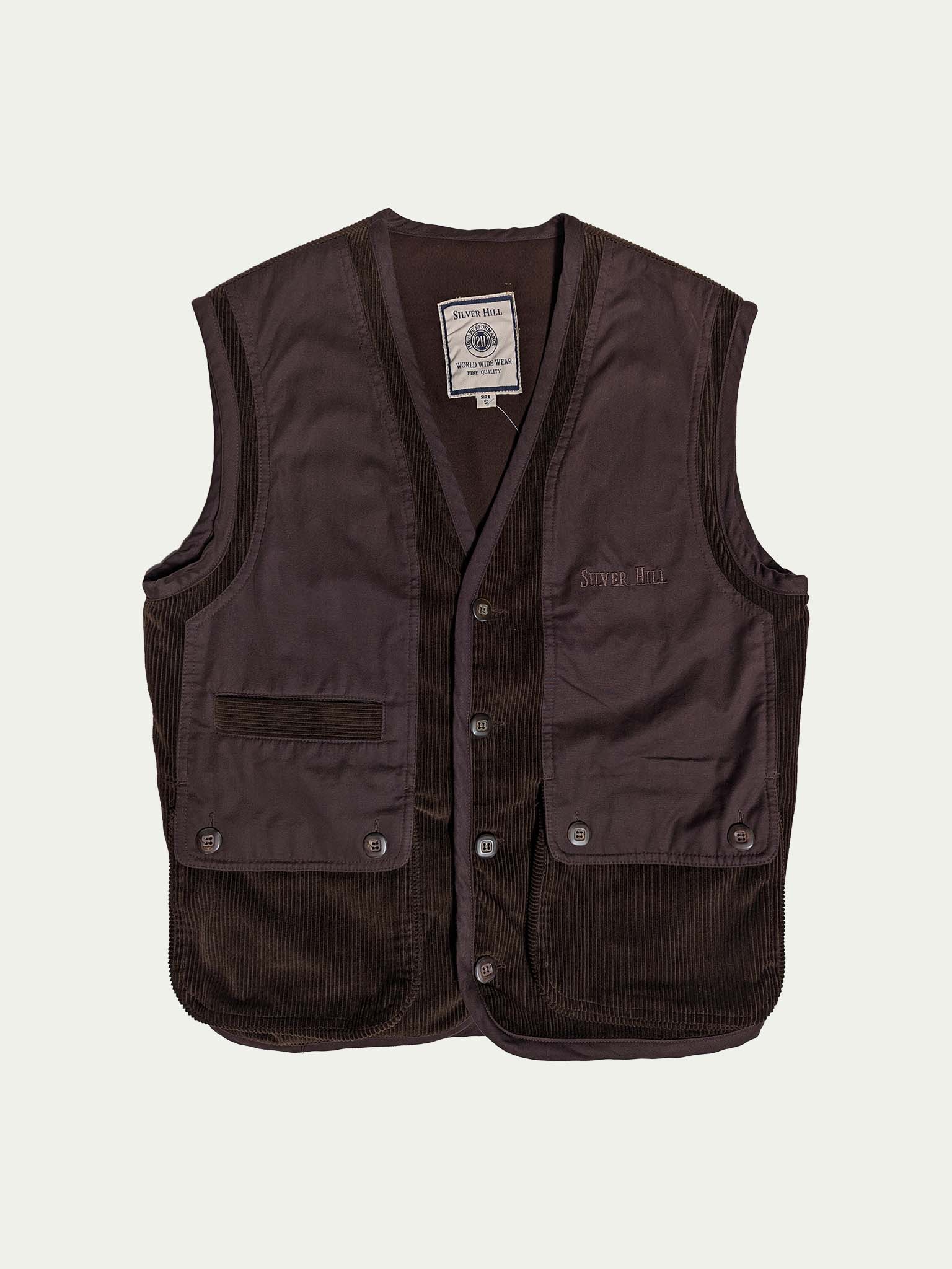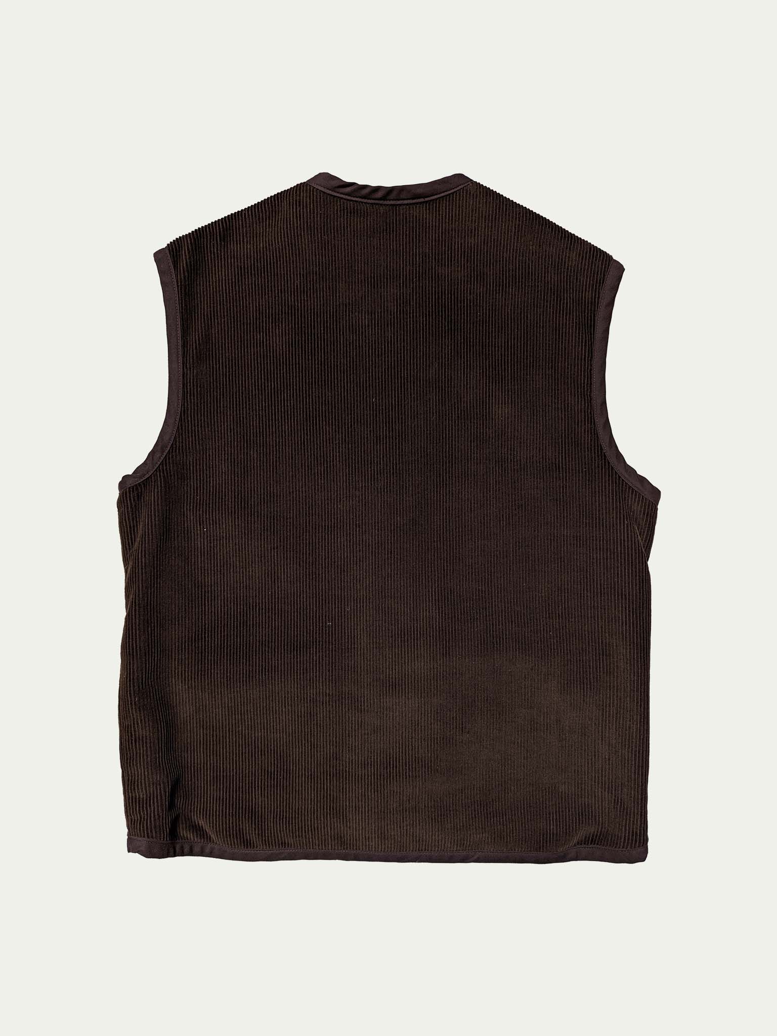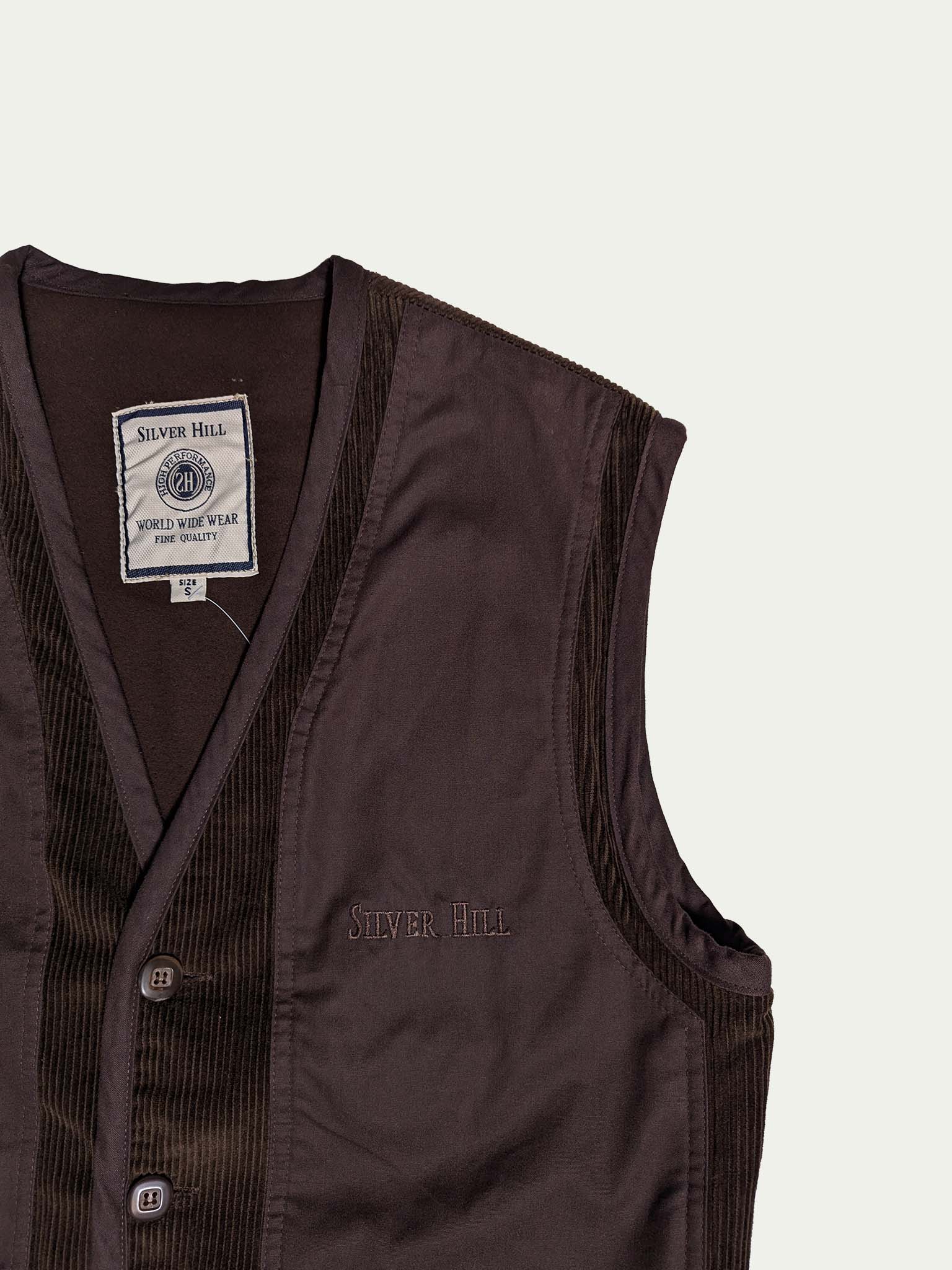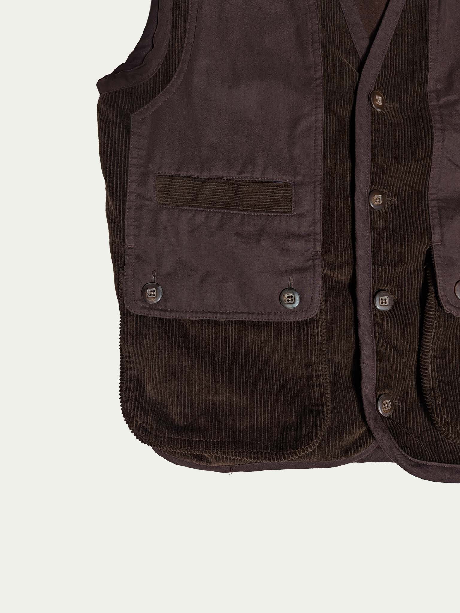 90's Corduroy button-up vest, with 3 detailed front pockets, and cotton fabric patches.