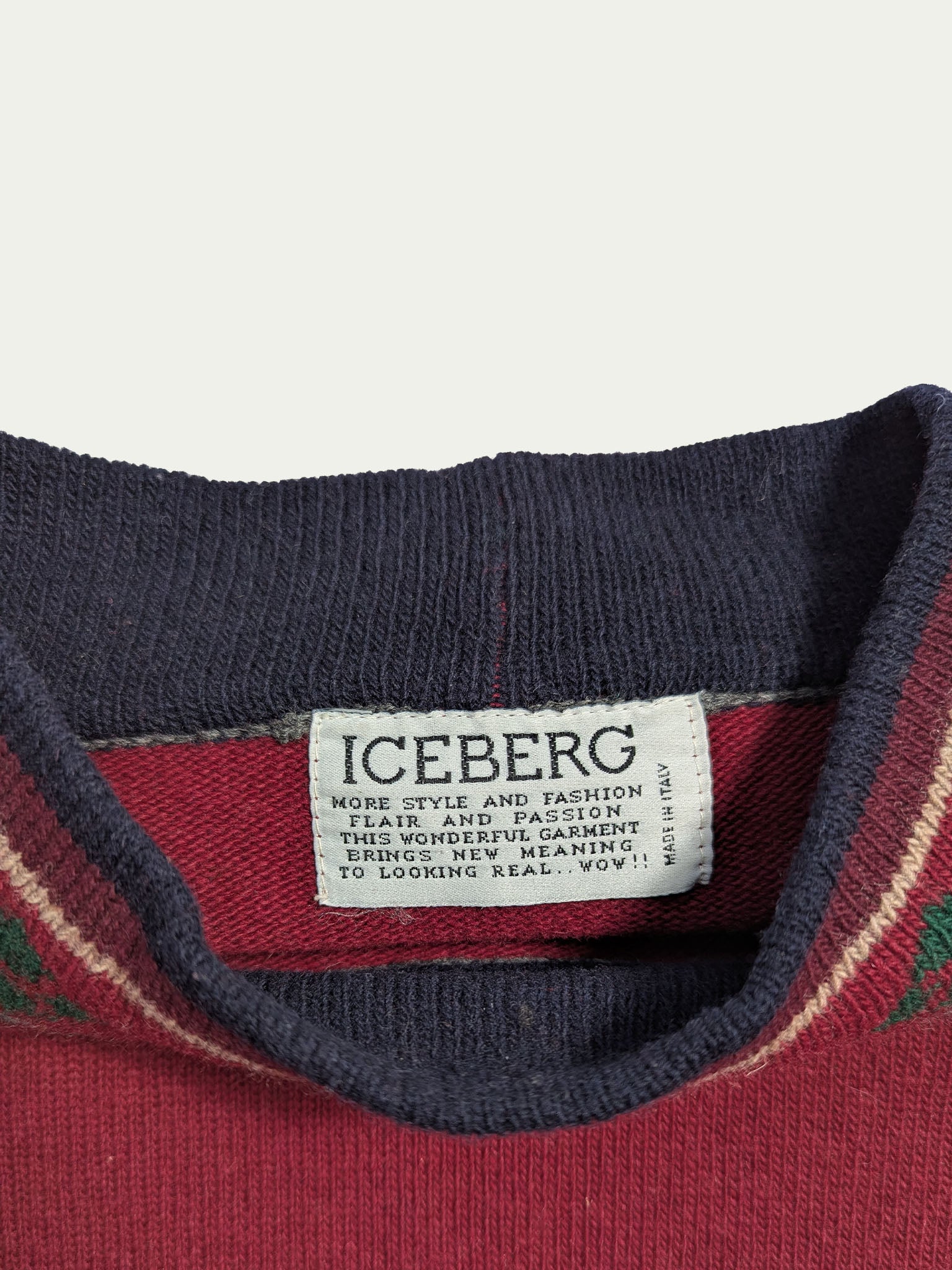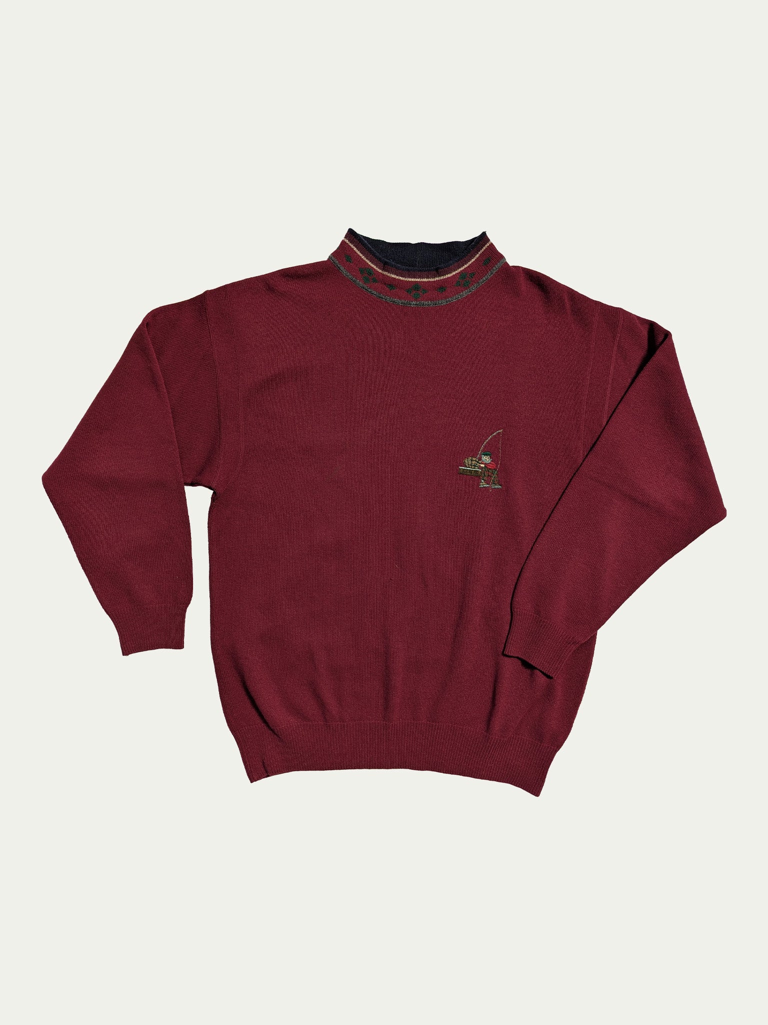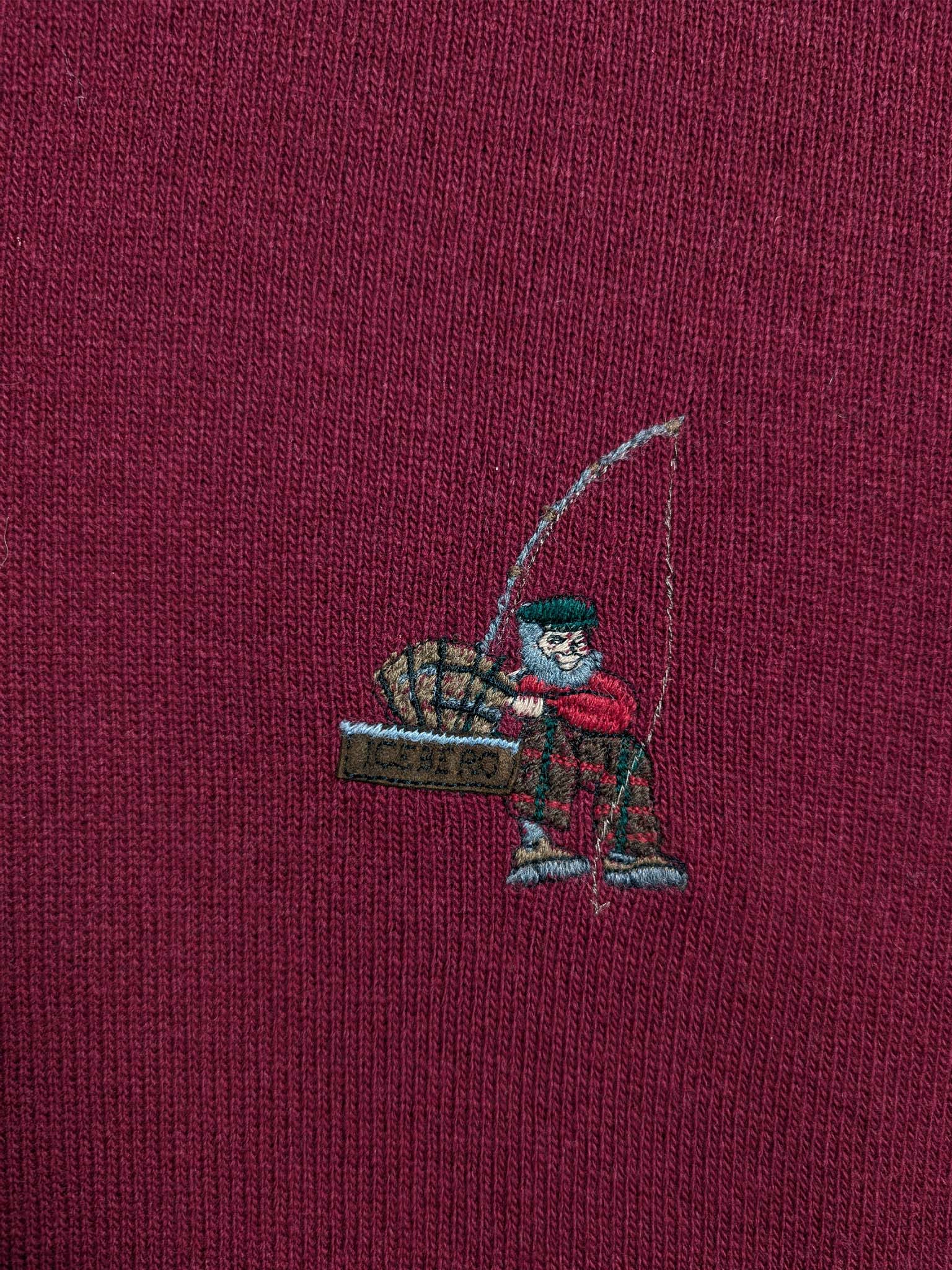 90's Iceberg burgundy sweater, with a christmas collar and an embroidered fisherman cartoon.