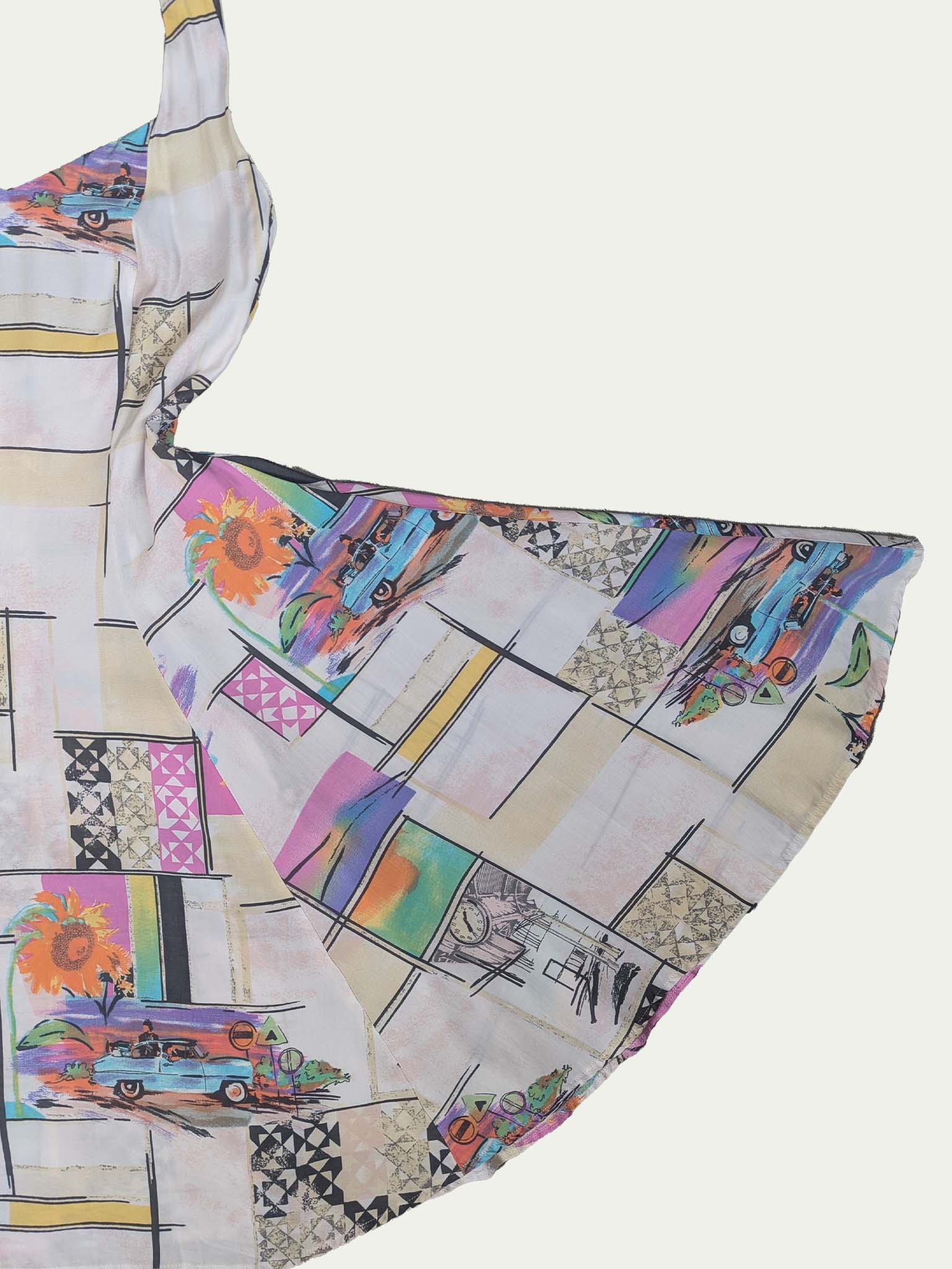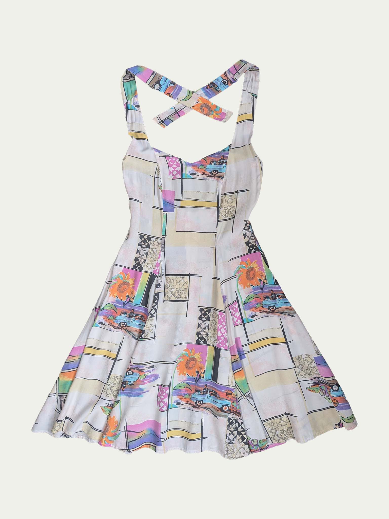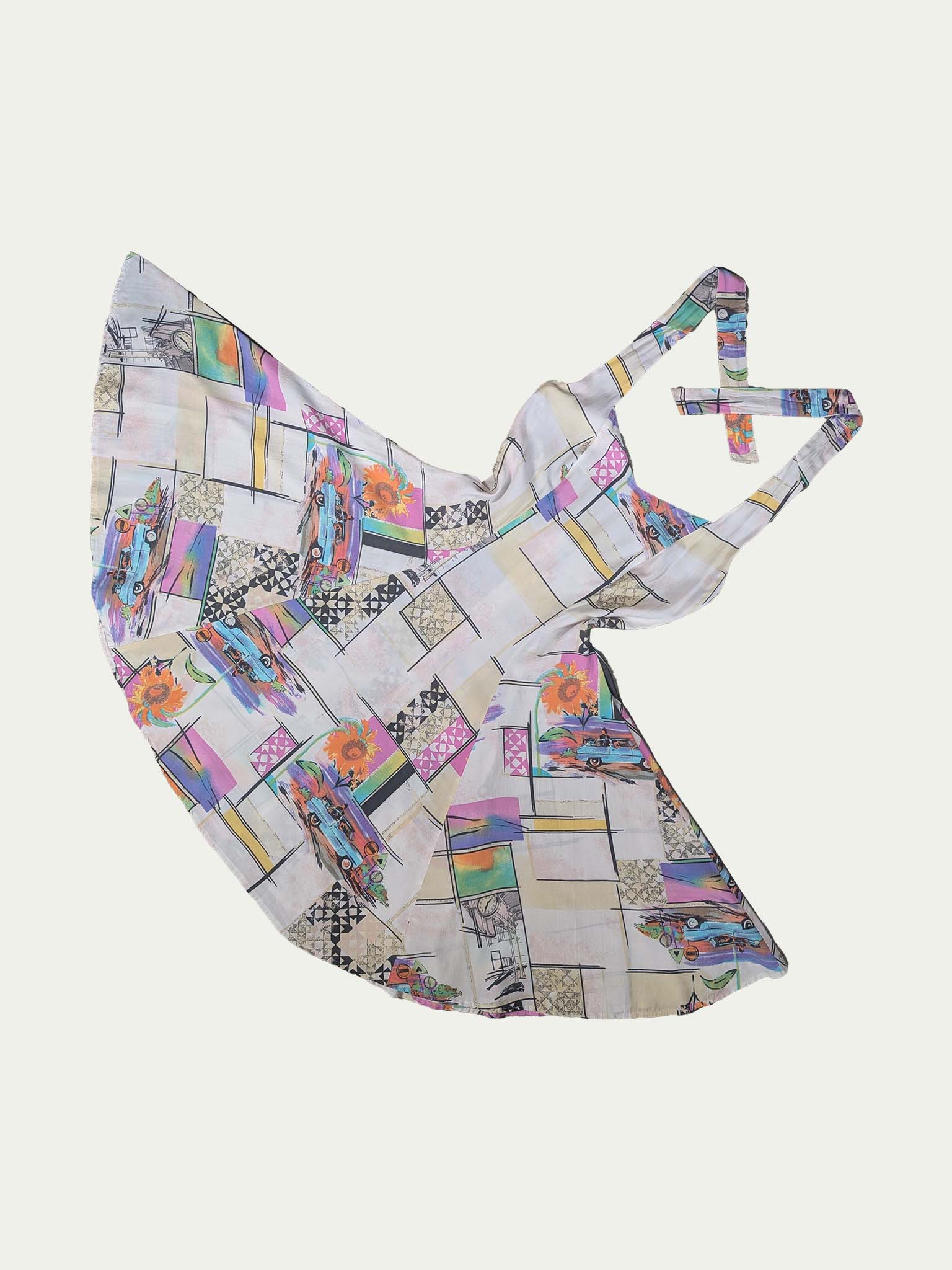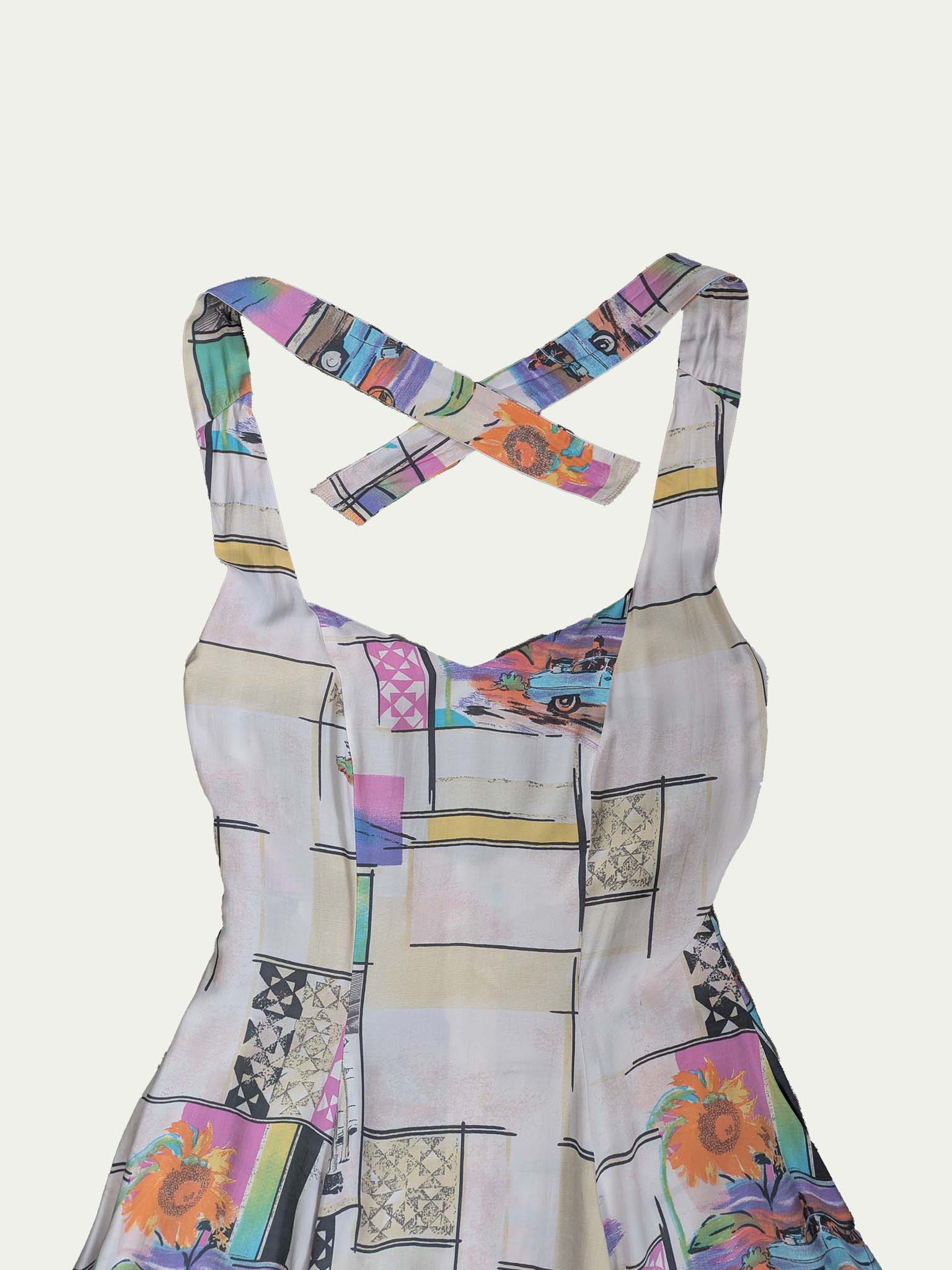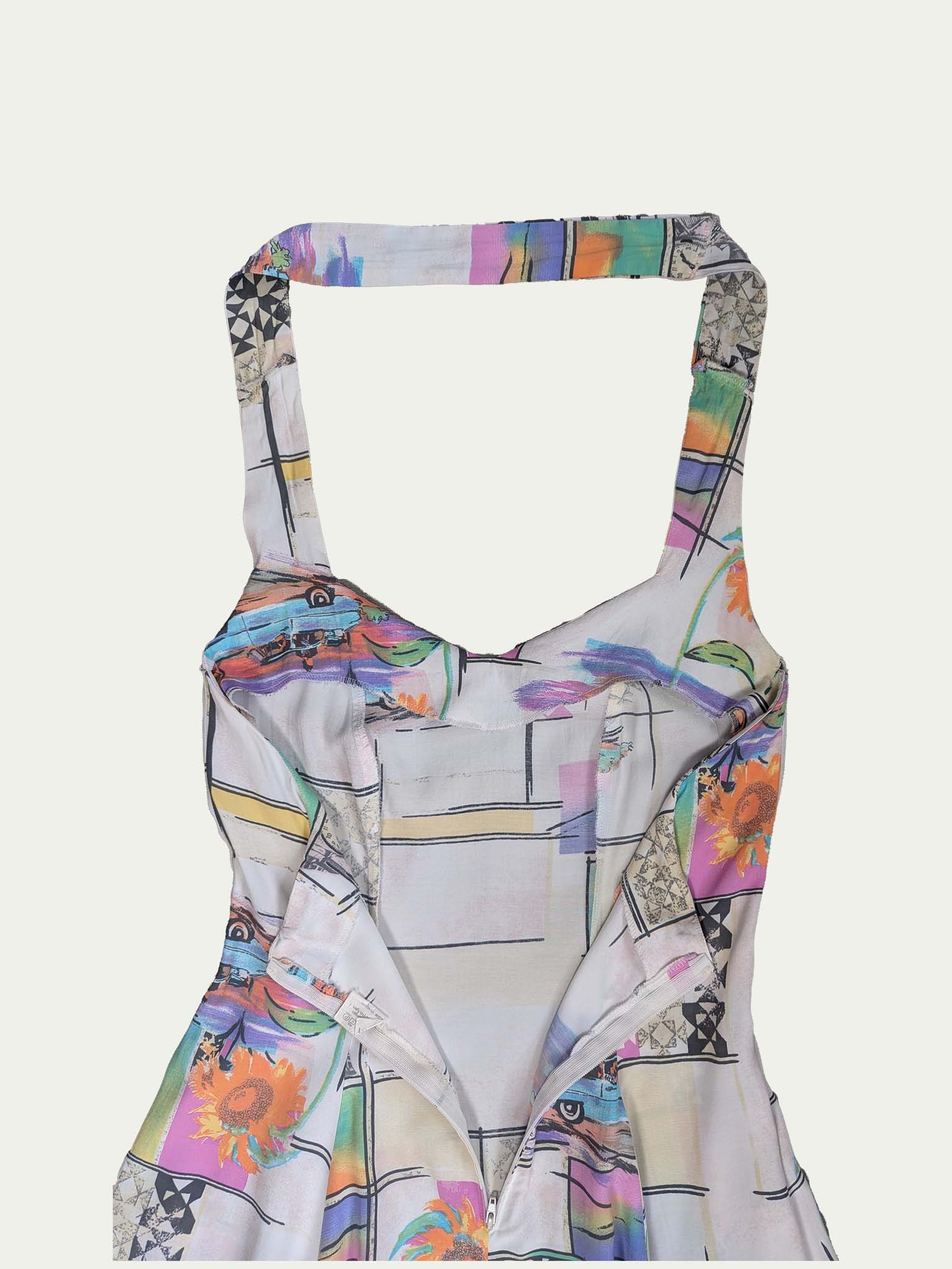 80's halter dress in viscose with a rare, unique print, midi length with a full circle skirt, and flattering cuts.