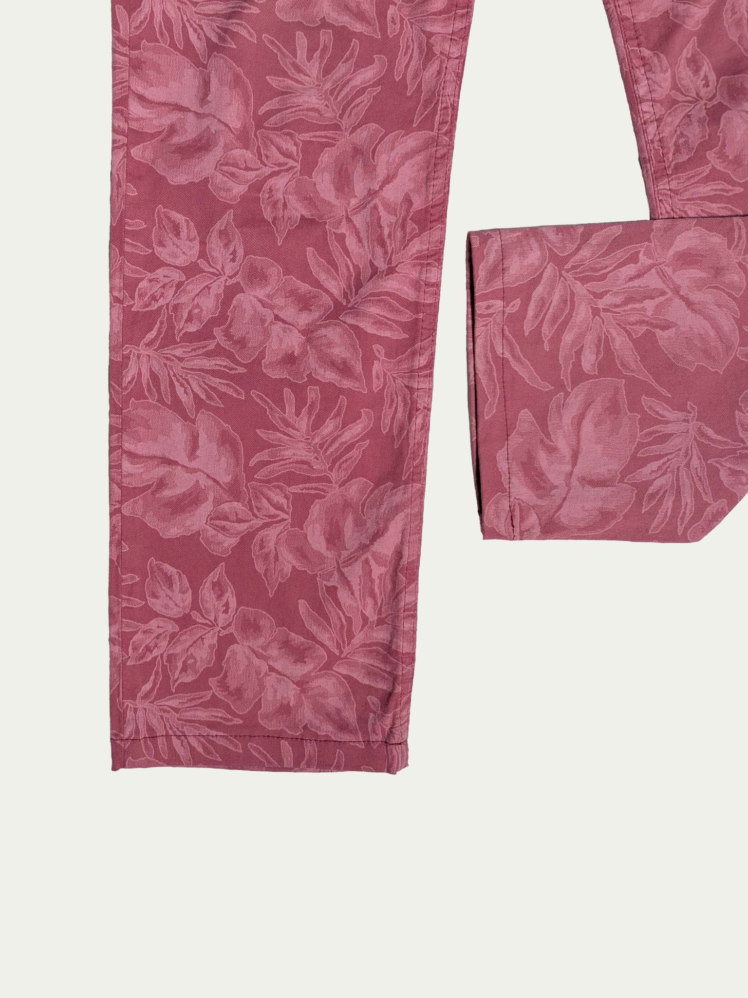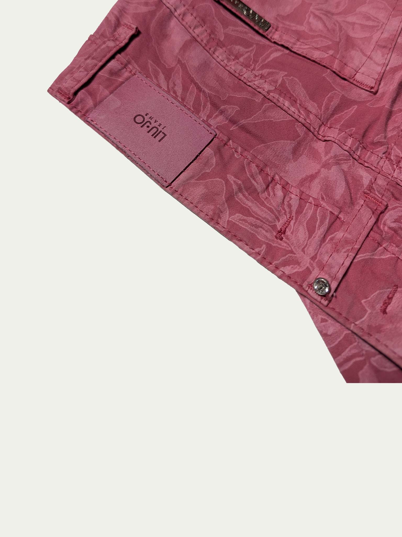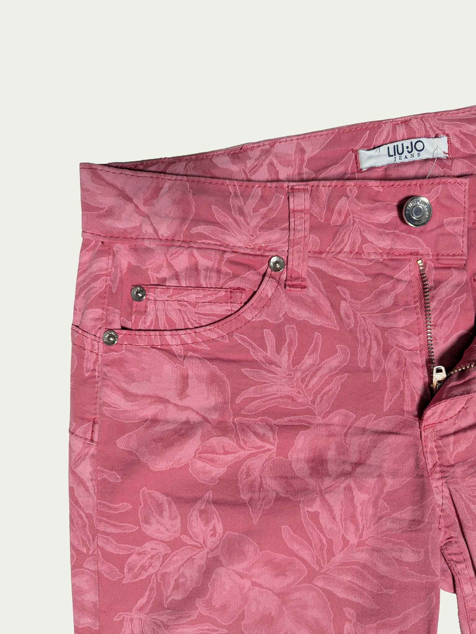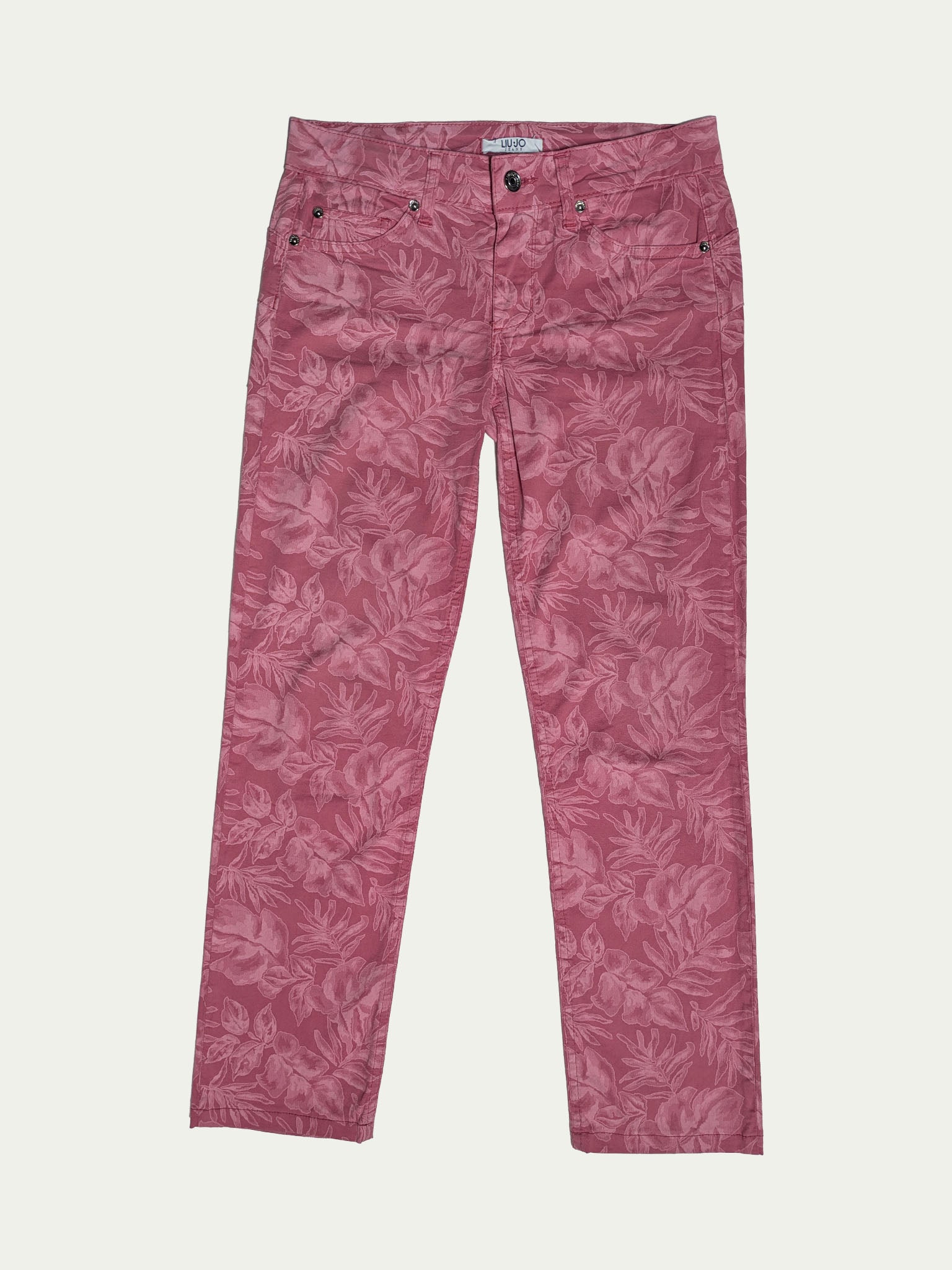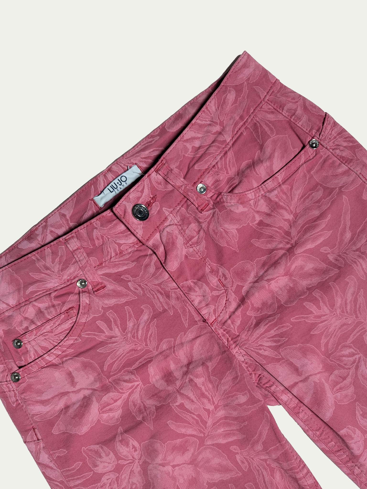 Y2K Liu-Jo pink low/mid-waisted pants, in a 7/8 capri cut, with a monochromatic leaves pattern.